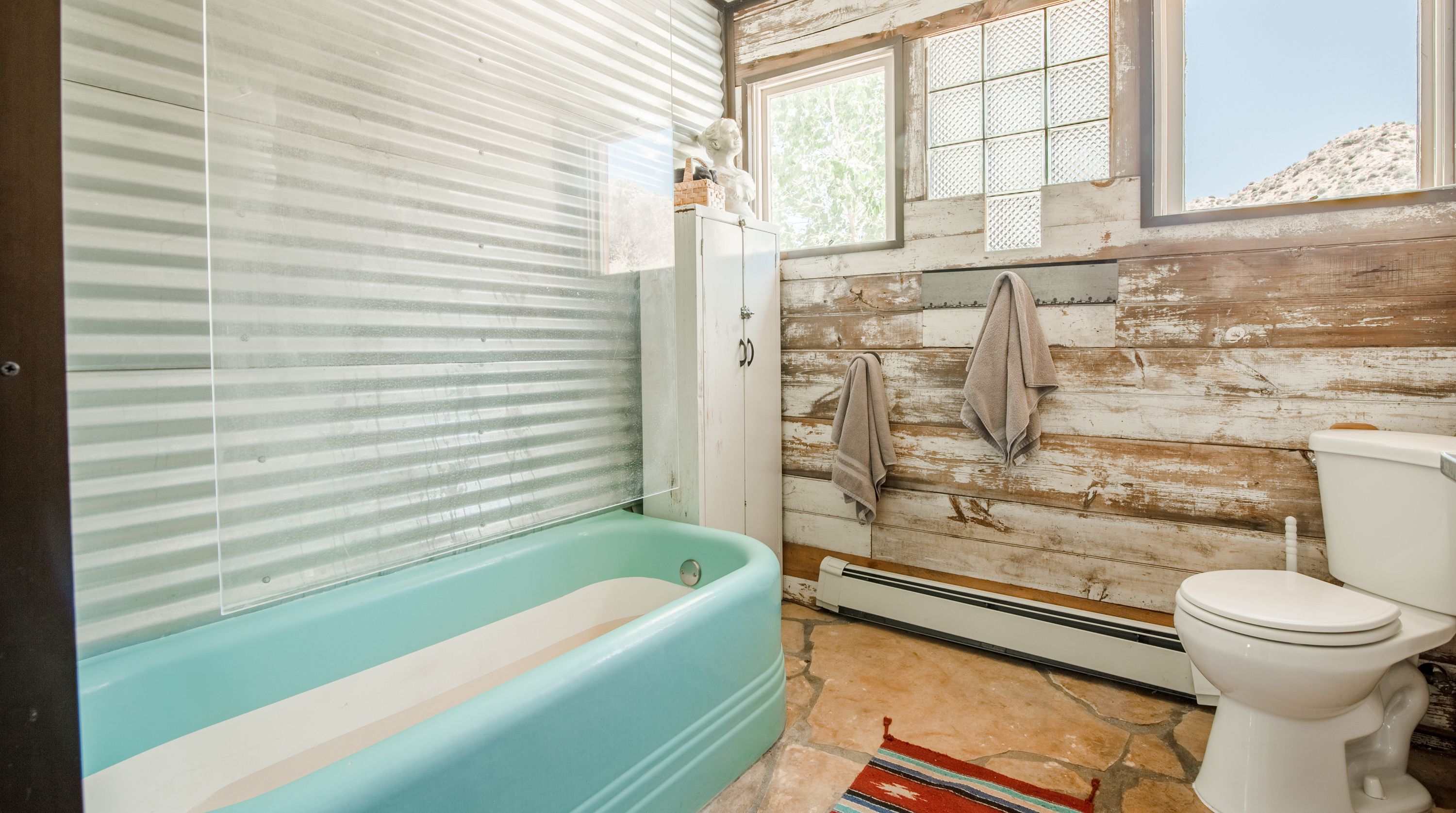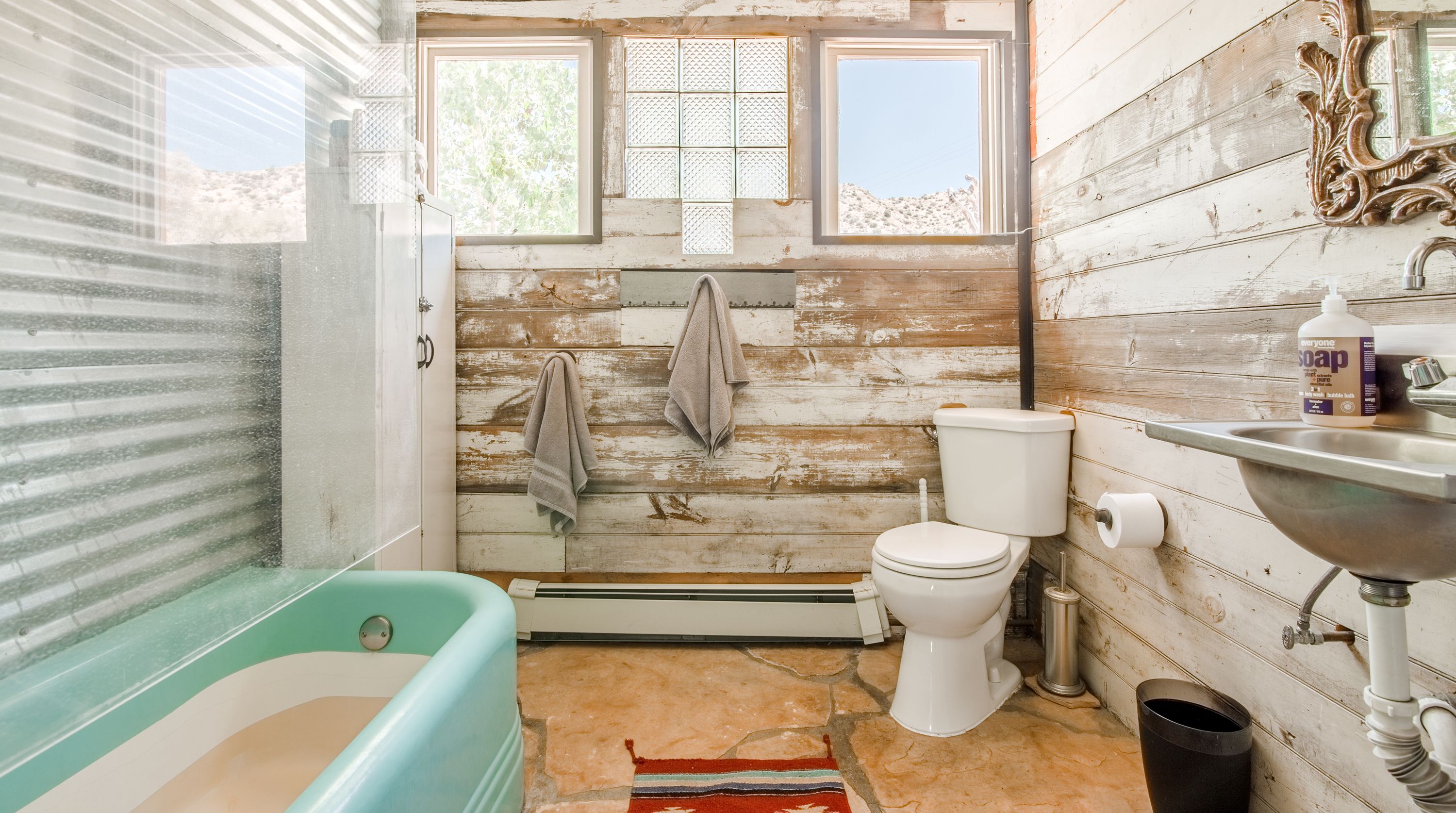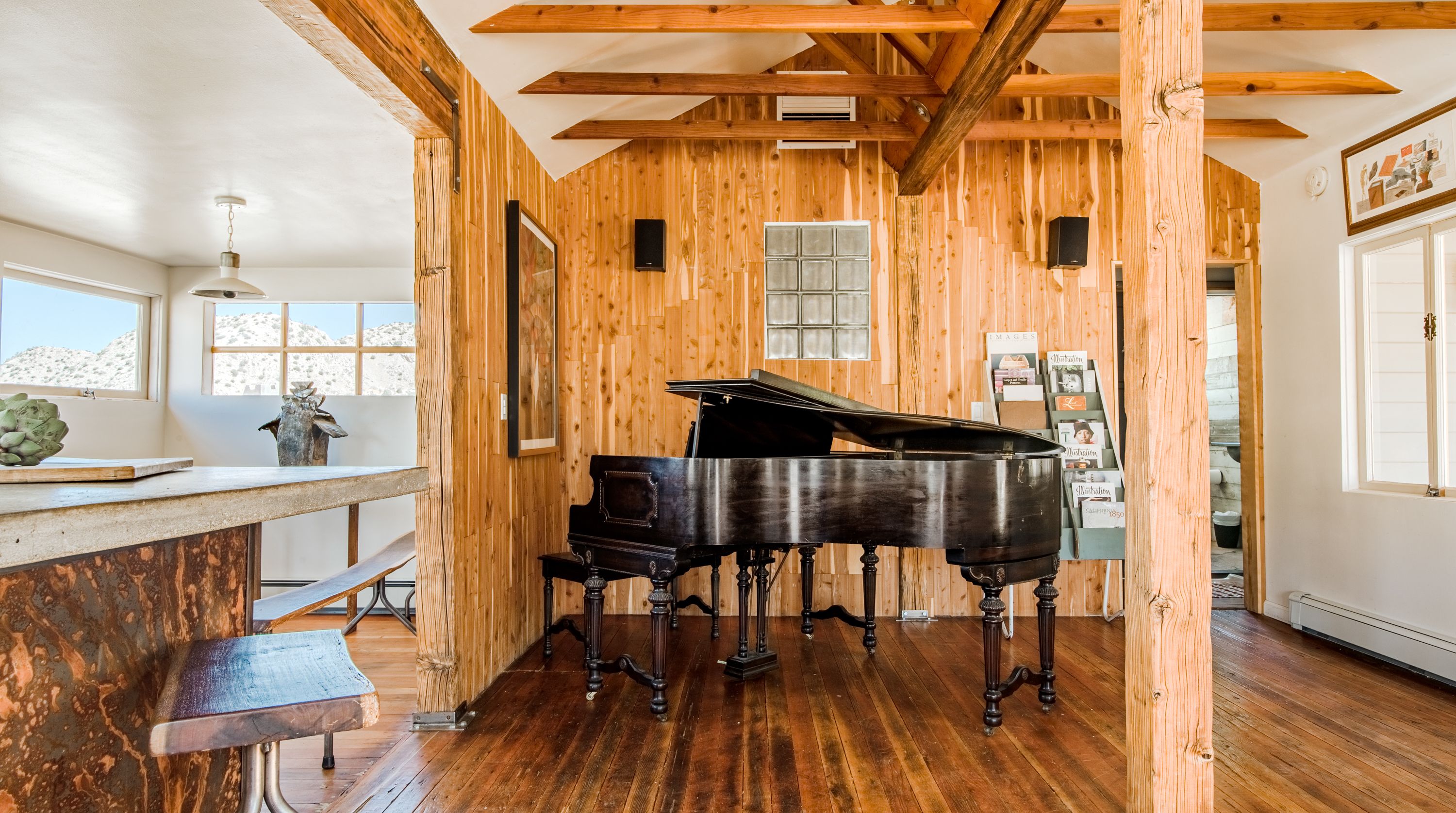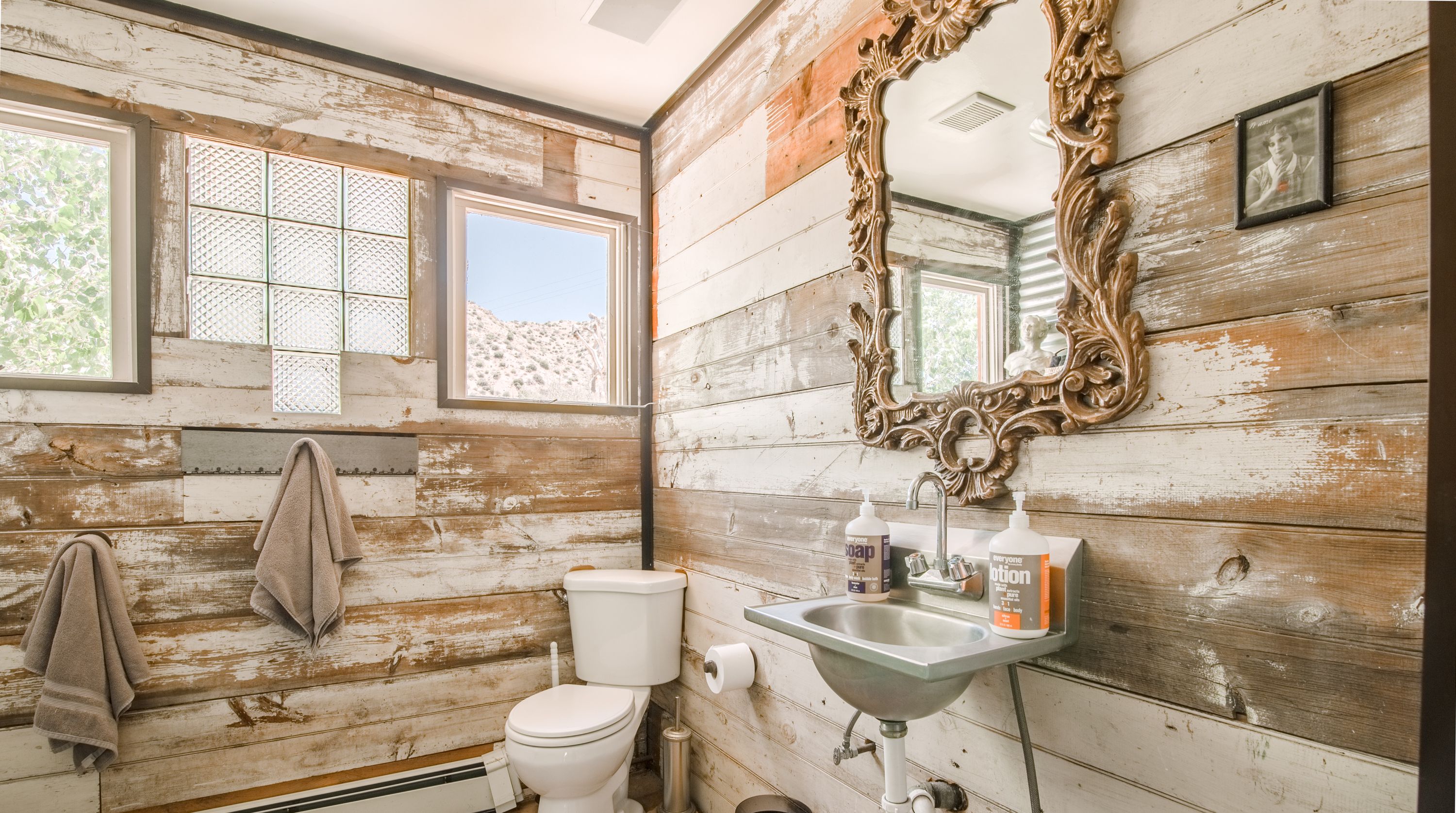 There’s a wood-burning stove to keep you warm on those chill nights, while one of your musically talented friends can play a tune on the grand piano (though there’s also a Bluetooth sound system, for convenience). On the walls, you’ll find original art by the late Gerald Zeldin, and an interior so impressive it was featured in the NY Times fashion section. You can feel the history of this old mining cabin in the wood-beamed ceiling and clapboard (yet modern) bathroom. Picture-frame windows let the sunlight stream into this boho-chic interior and let you gaze out over the endless desert before you.