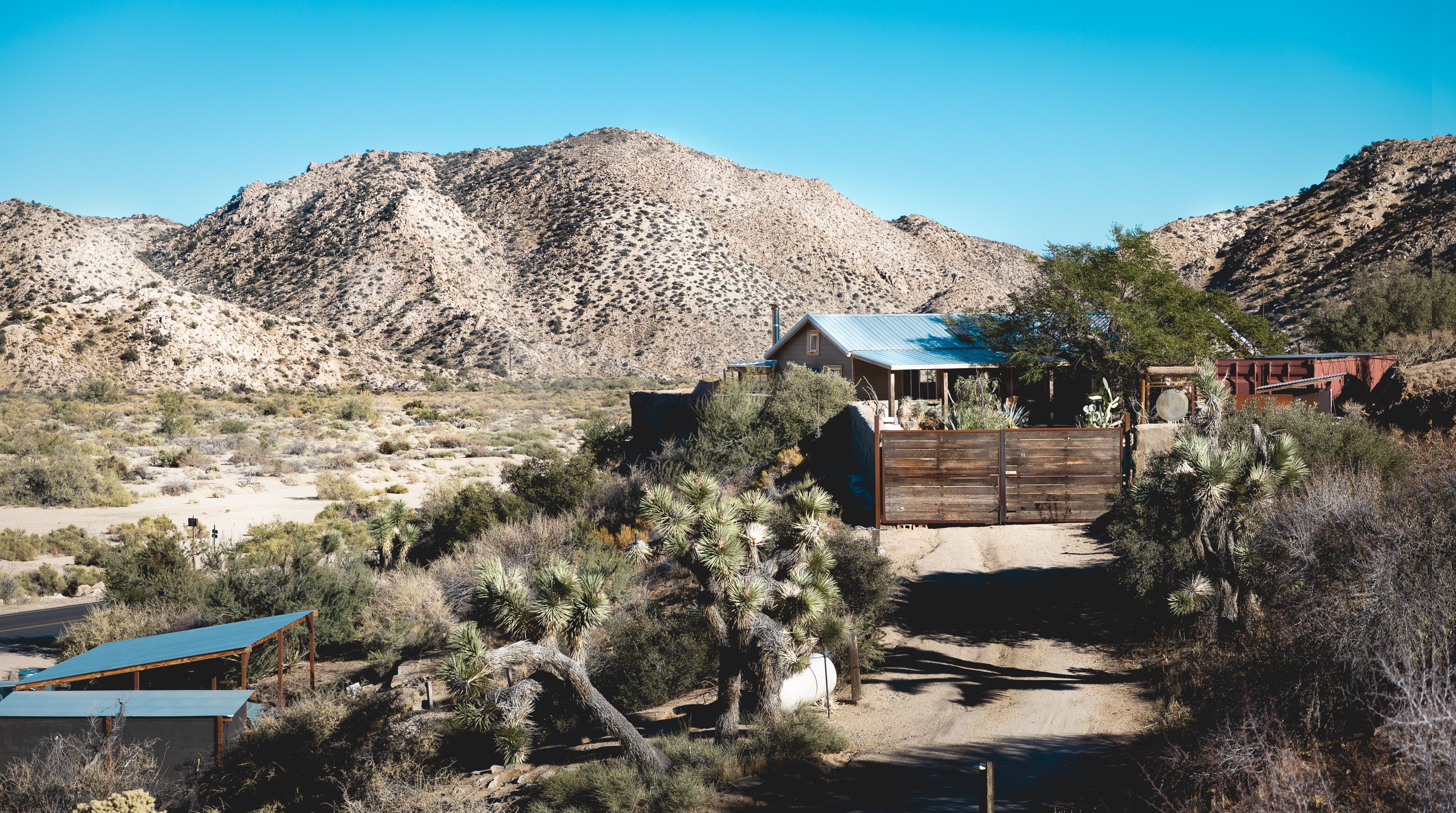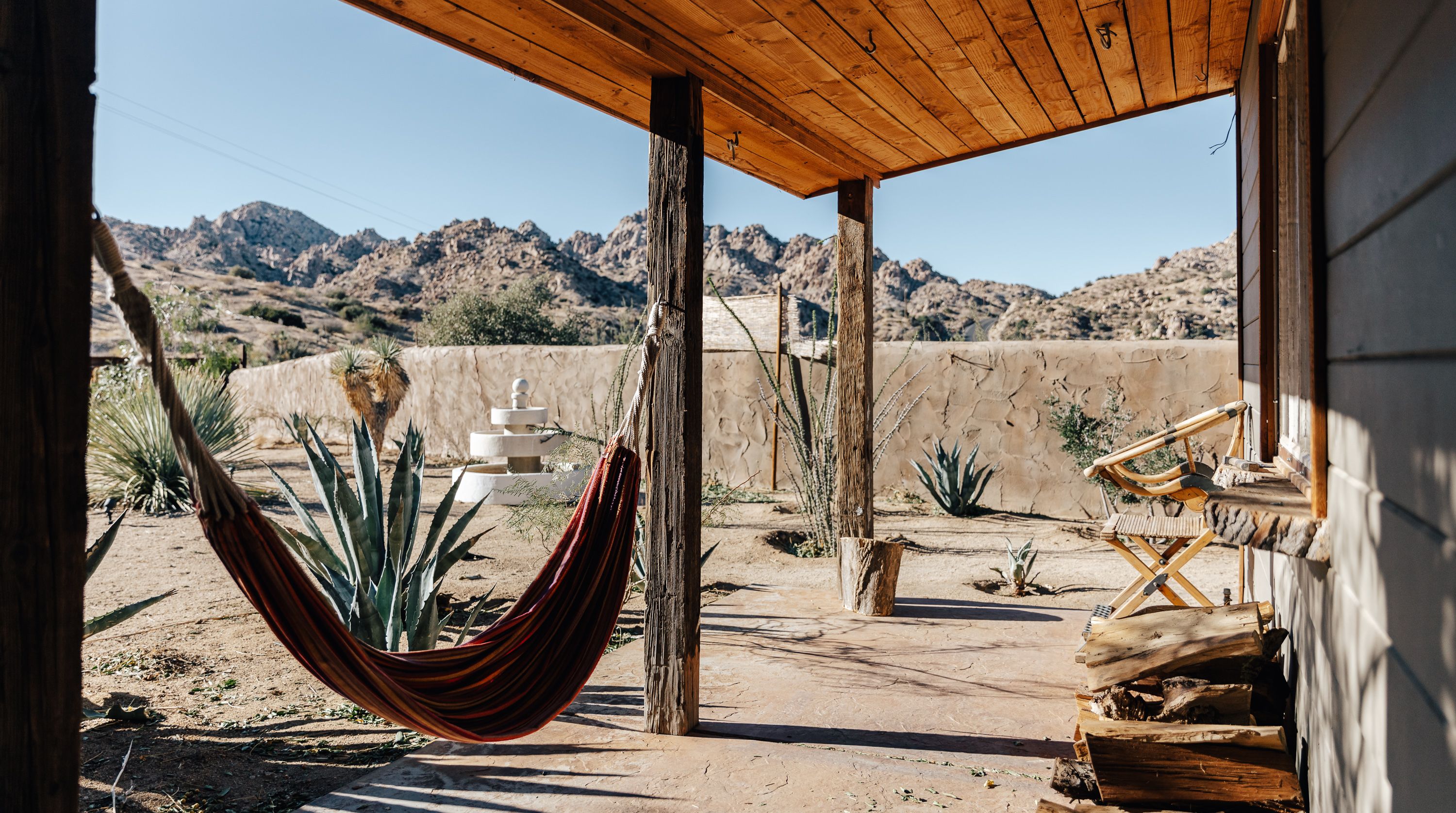 A hilltop cabin in a unique area of the desert, this place is nestled on its own between Pioneertown and Yucca Valley on what feels like the scenic drive through Joshua Tree National Park. The trees, rocks, and landscape just outside the doors are just as breathtaking as anything you would see in the park, except you have them all to yourself.