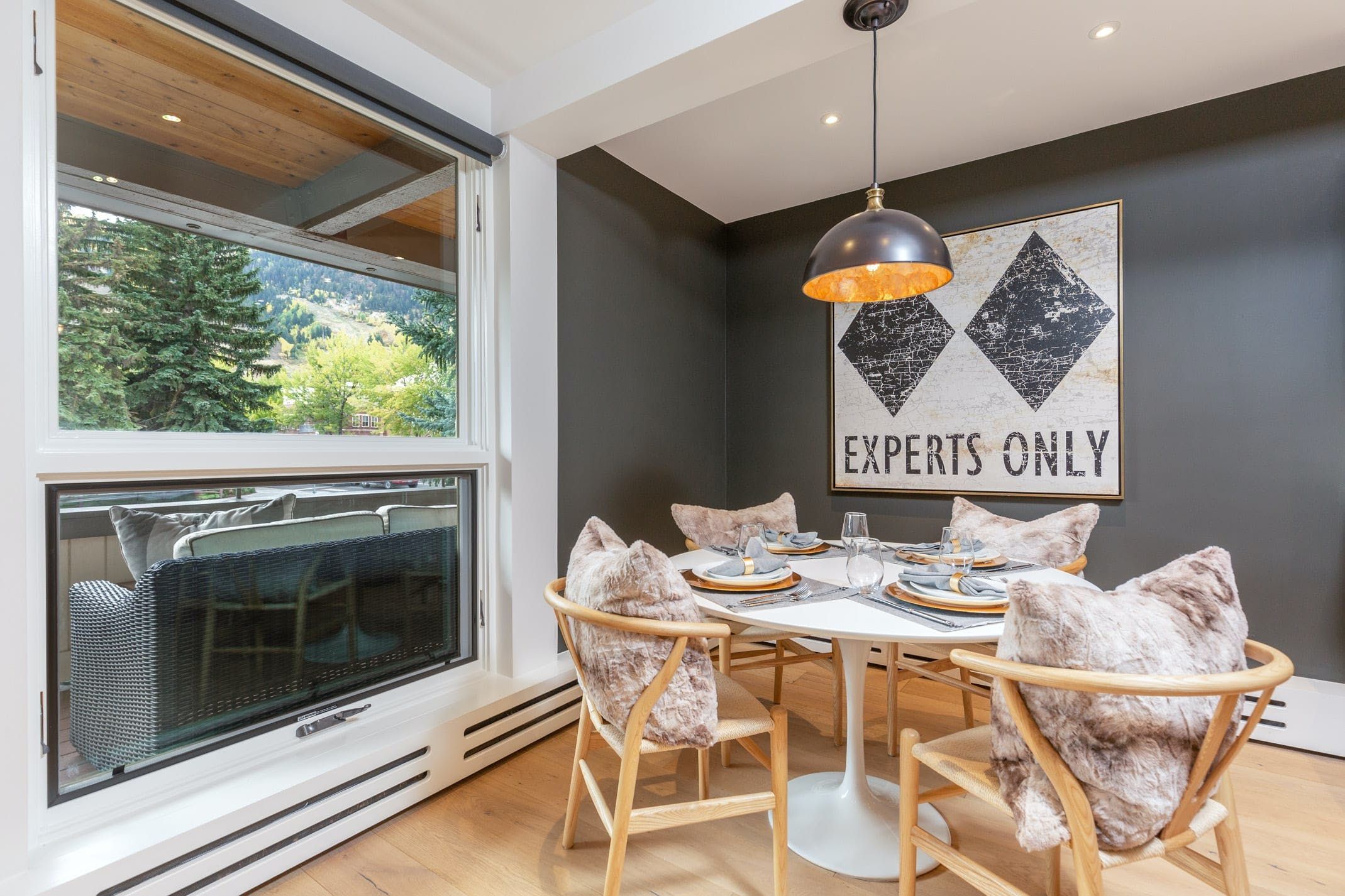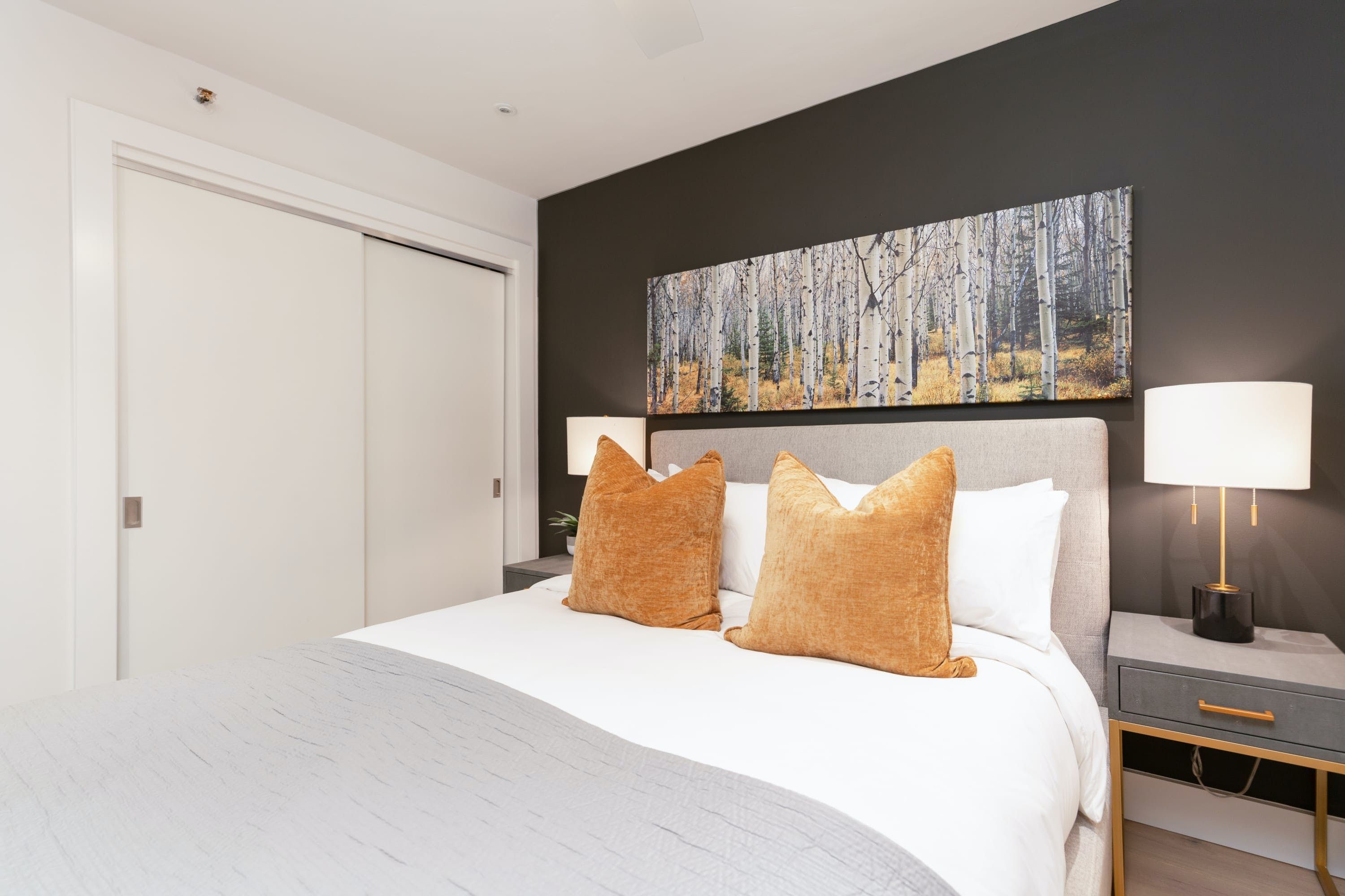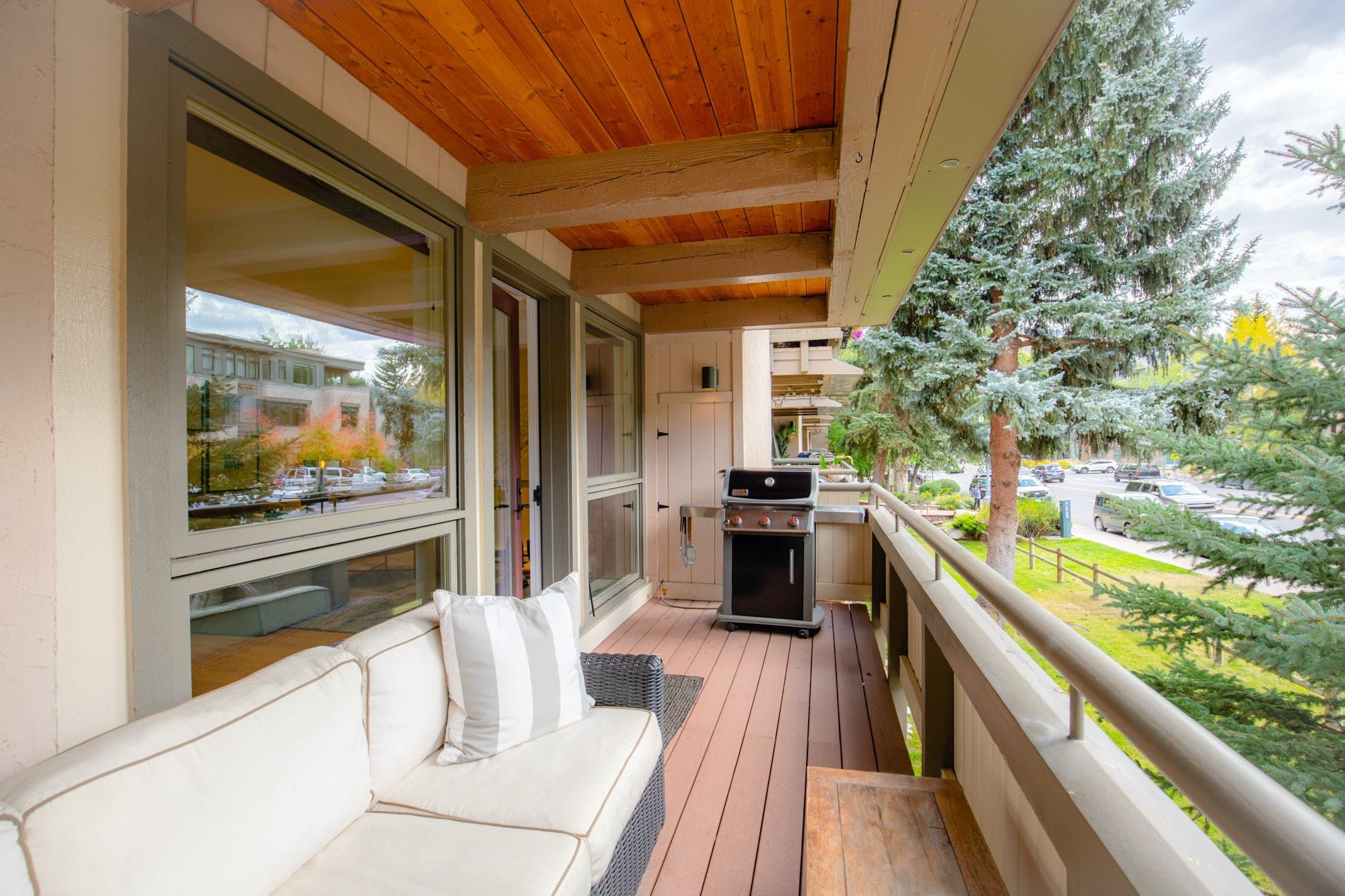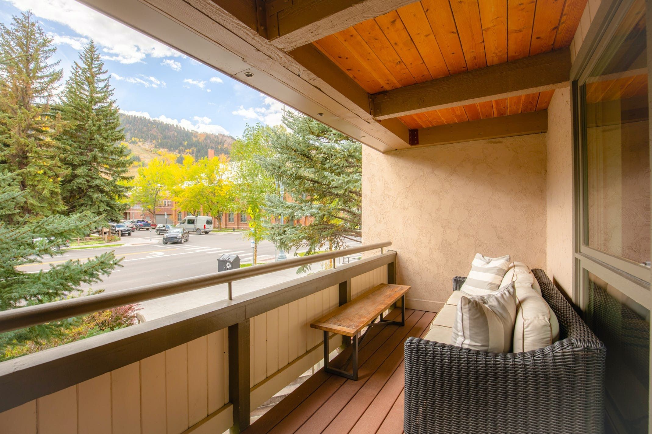 Gorgeous remodeled 2-bedroom, second-floor condo with breathtaking views of Aspen Mountain. Indulge in the beauty and serenity of this mountain retreat, professionally managed by Aspen Vacations. This cozy hideaway offers a unique blend of rustic charm and alpine elegance. Immerse yourself in the coziness of the French oak flooring, complemented by custom walnut built-ins. The newly remodeled bathrooms and kitchen boast premium Viking appliances and exquisite finishes. For your convenience, there is a Bosch washer/dryer discreetly tucked away. Relax on the balcony and savor the mesmerizing peak panorama. Located in the heart of downtown Aspen, this urban sanctuary is just a short distance from vibrant city life, yet still provides a secluded escape in nature's lap. Embrace the essence of luxury living at this elevated Aspen oasis.