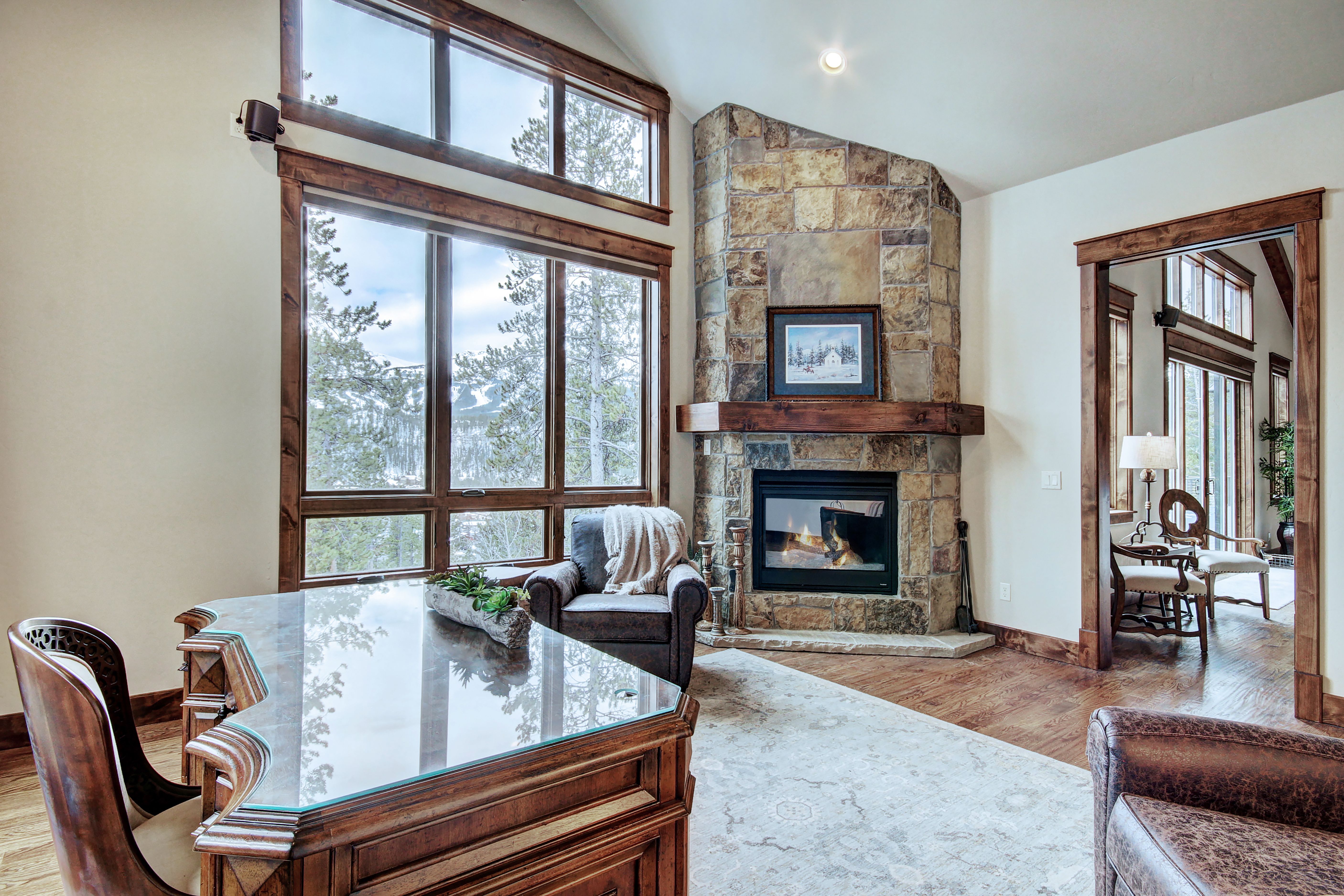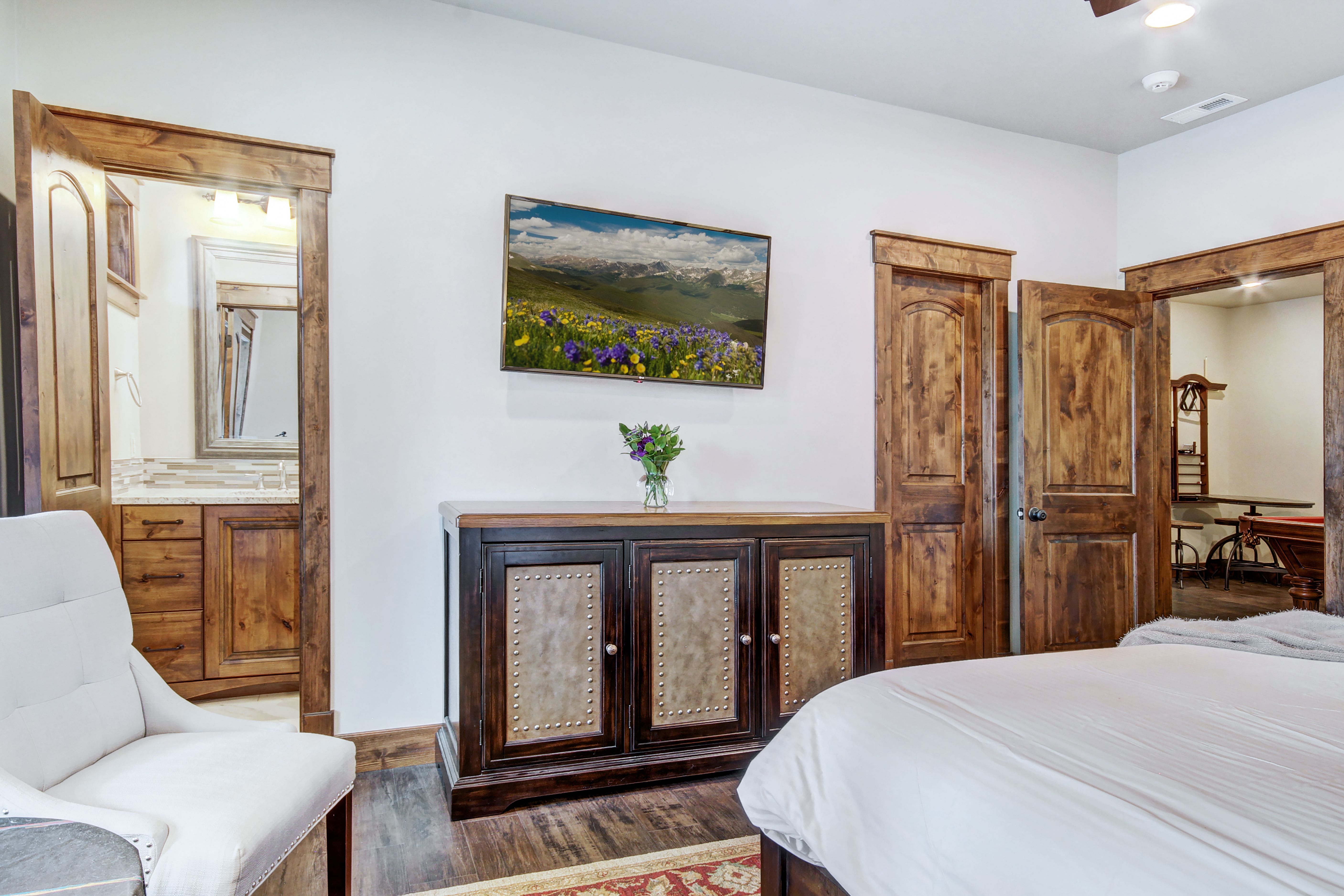 Breathtaking panoramas of the Breckenridge Peaks await at this cabin in the woods. Every corner makes the most of the scenery, whether you're lounging in front of the fire in the living space or waking up in the main suite. On snow days, play pool in the games area or unwind in the steam room. Come summertime, you'll want to spend all your time outdoors – and with views like that, we don't blame you. There's a hot tub, fire pit, and scenic deck ideal for barbecues. Factor in the location – about 2 miles from Main Street and the ski lift – and we think it's a winner.