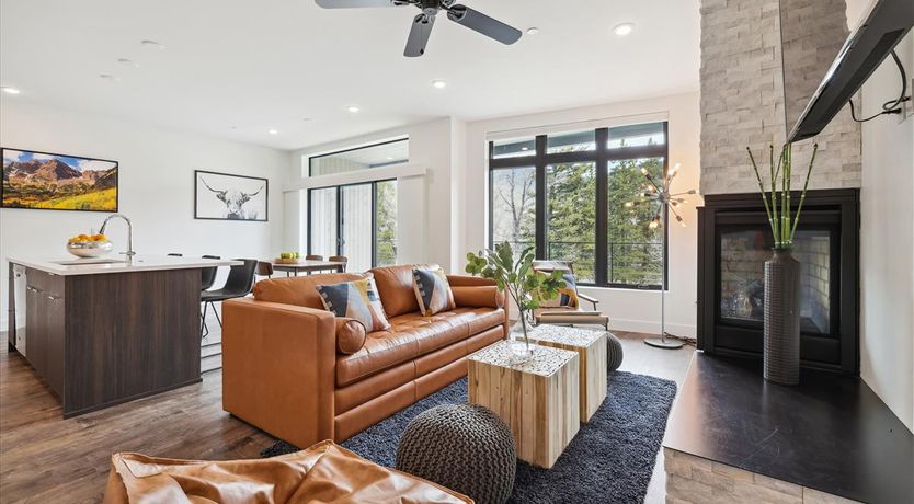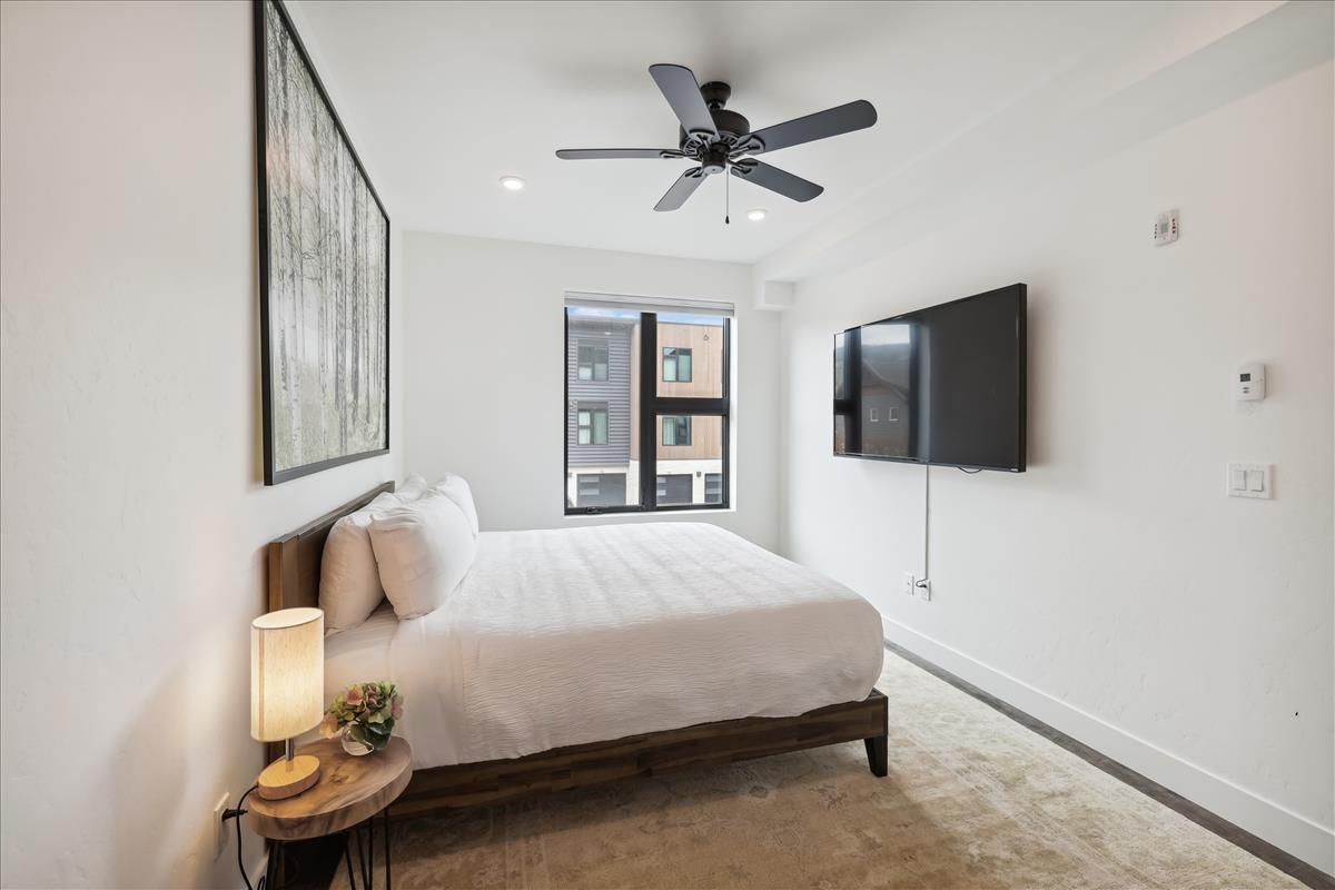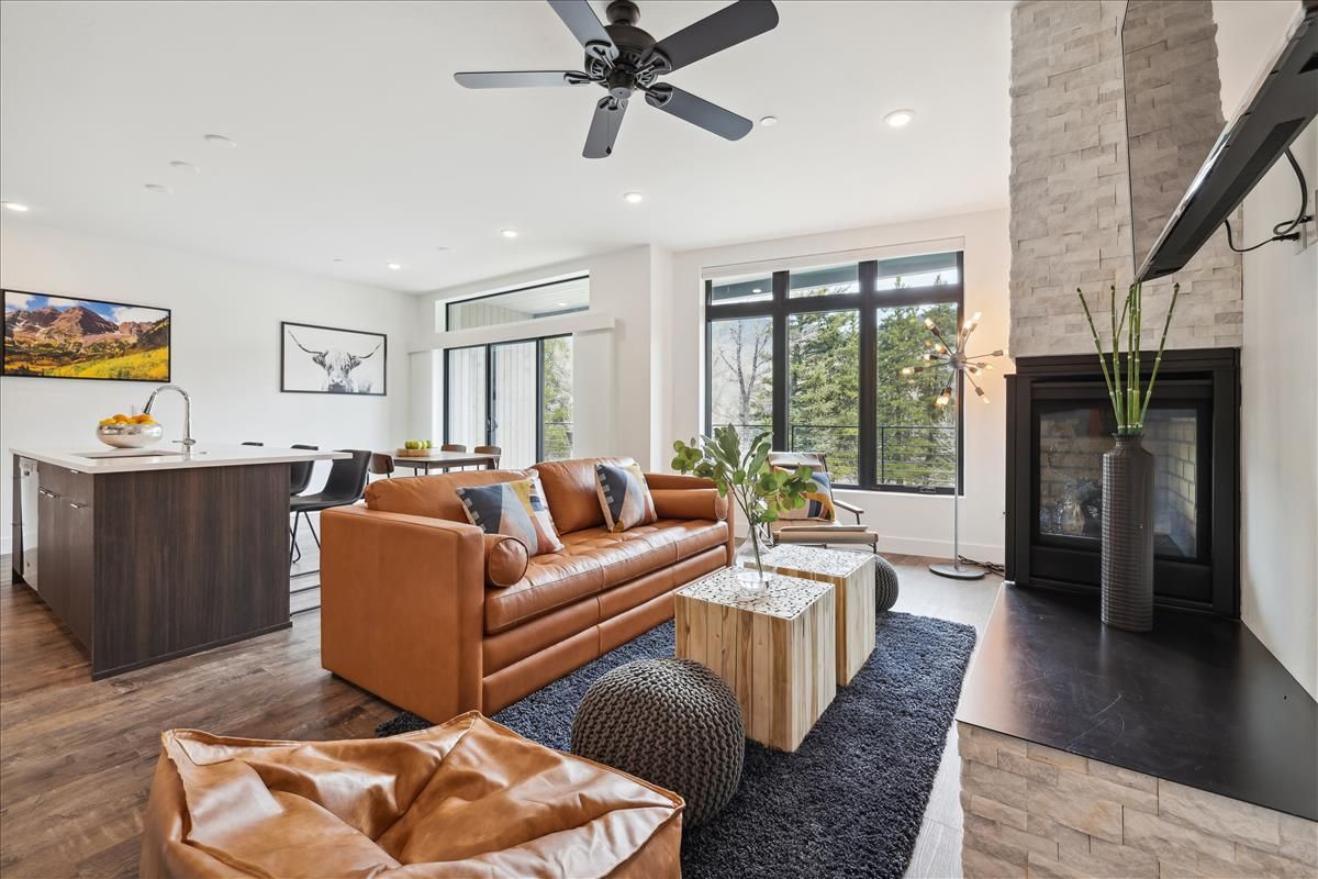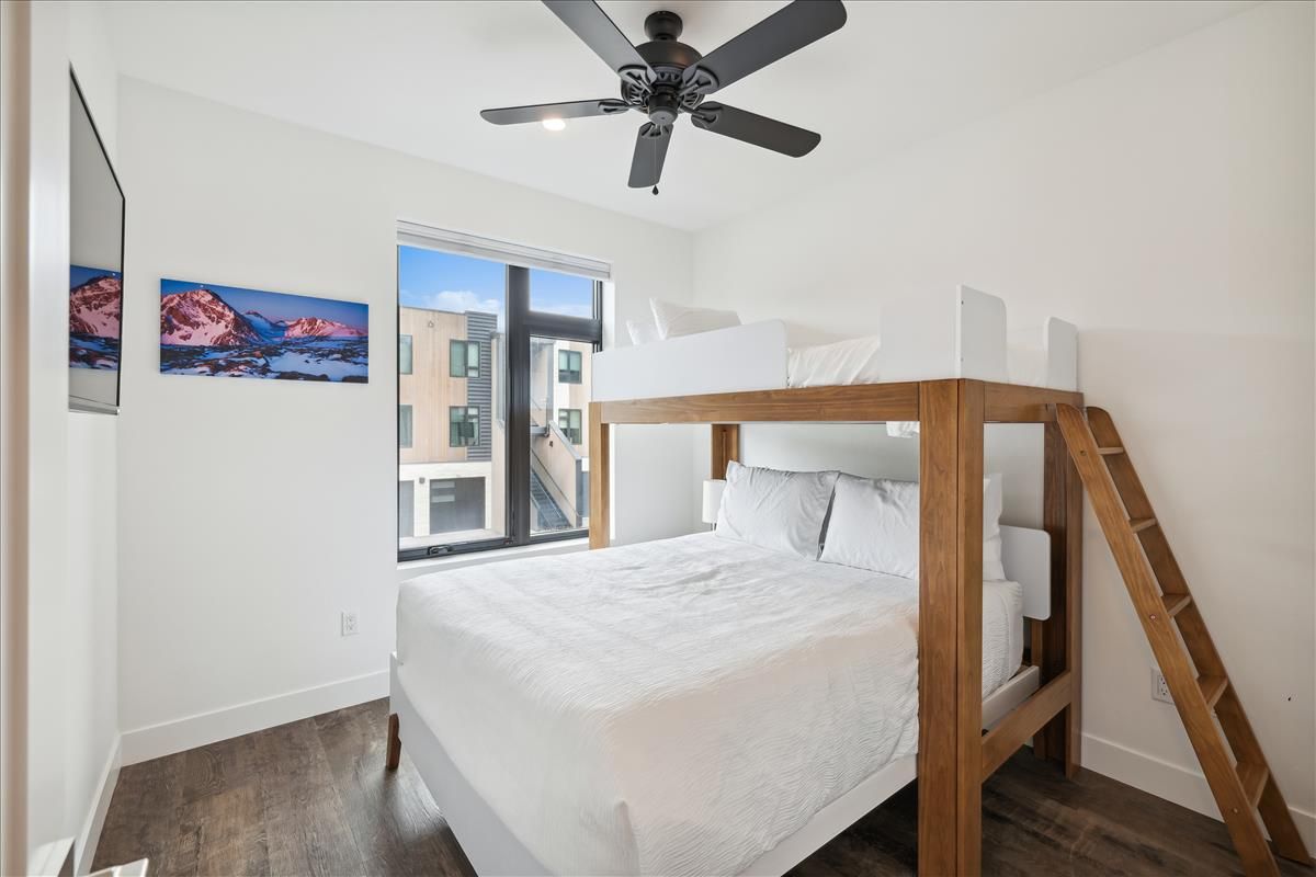 This charming mountain home is situated on the banks of Blue River in Silverthorne, just a short drive from world-class ski resorts. There are scenic walking and biking trails right from the front door, and you’ll have access to a shared riverside hot tub and firepit – perfect for relaxing under the stars. You can also enjoy river views from the private balcony and through the floor-to-ceiling windows in the open-plan living, dining, and kitchen space. This is where one guest will sleep on a sofa bed, with three sharing the bunk bed in bedroom two.