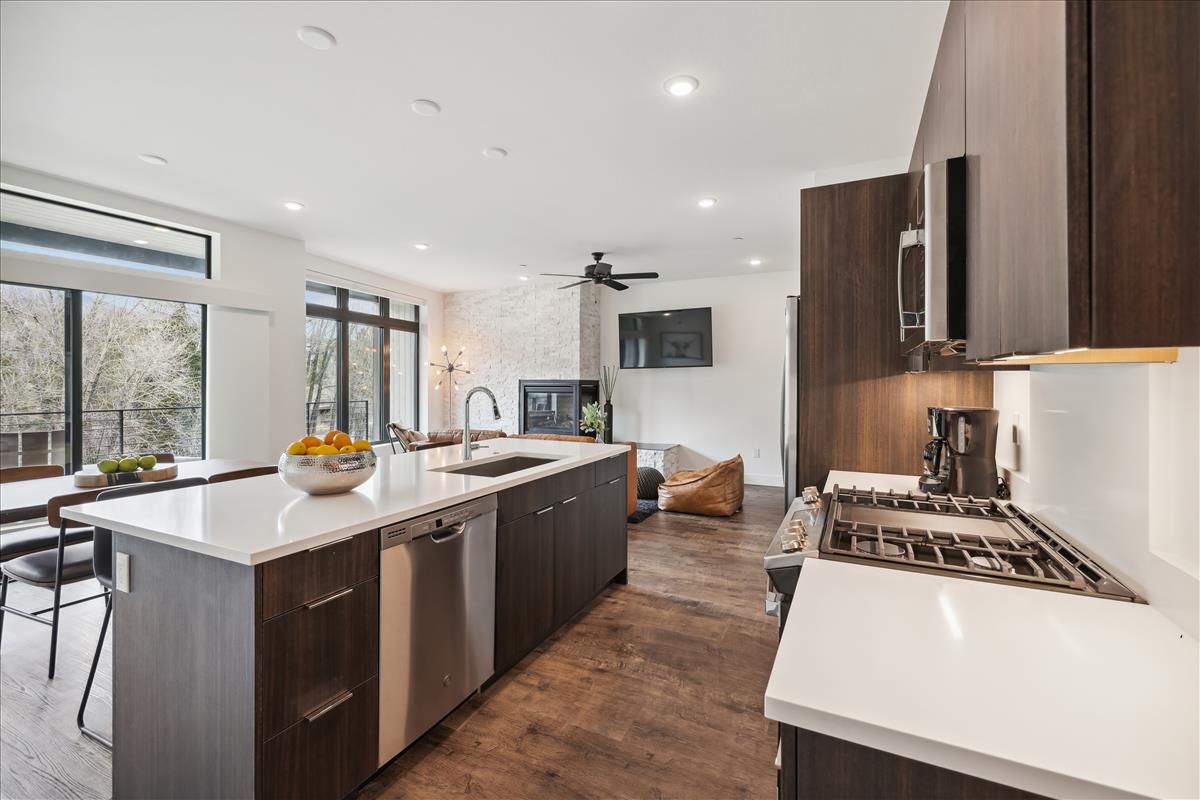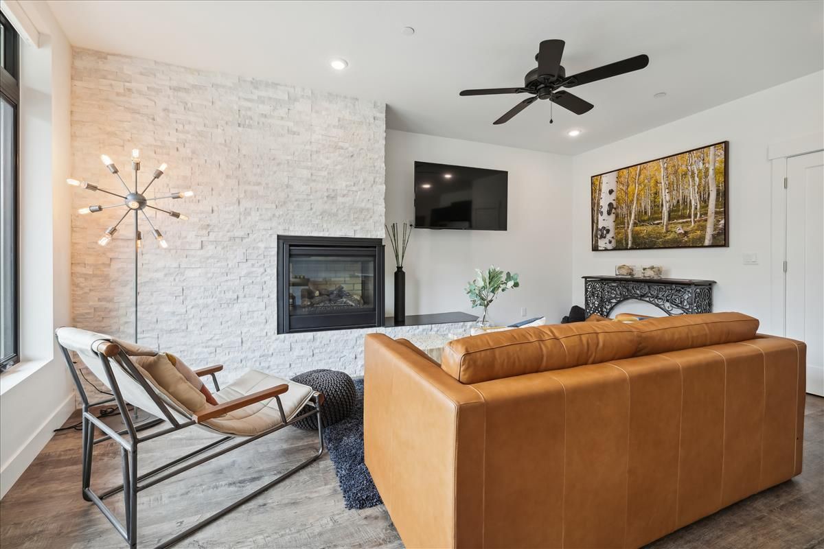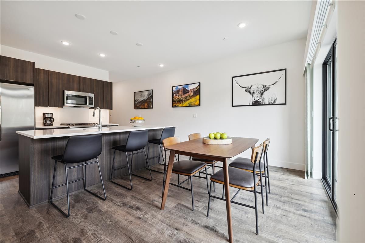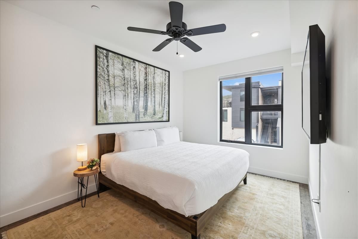 This charming mountain home is situated on the banks of Blue River in Silverthorne, just a short drive from world-class ski resorts. There are scenic walking and biking trails right from the front door, and you’ll have access to a shared riverside hot tub and firepit – perfect for relaxing under the stars. You can also enjoy river views from the private balcony and through the floor-to-ceiling windows in the open-plan living, dining, and kitchen space. This is where one guest will sleep on a sofa bed, with three sharing the bunk bed in bedroom two.