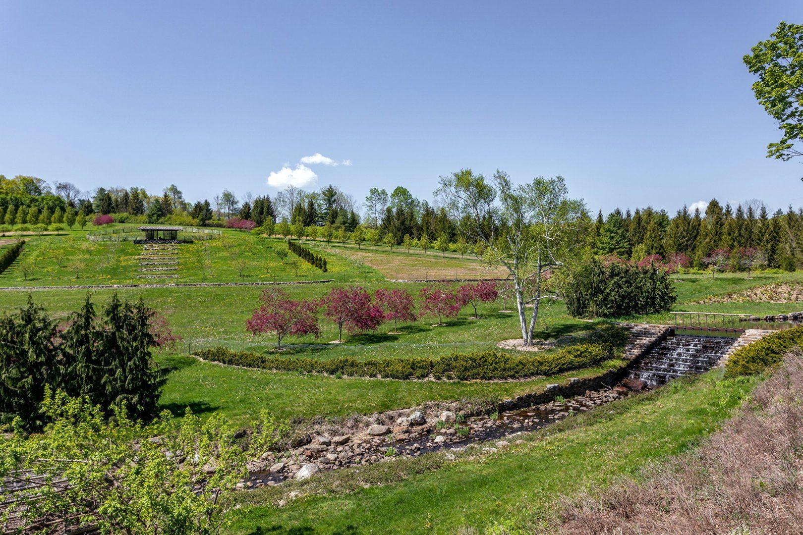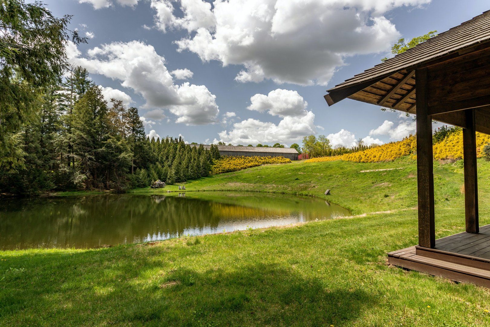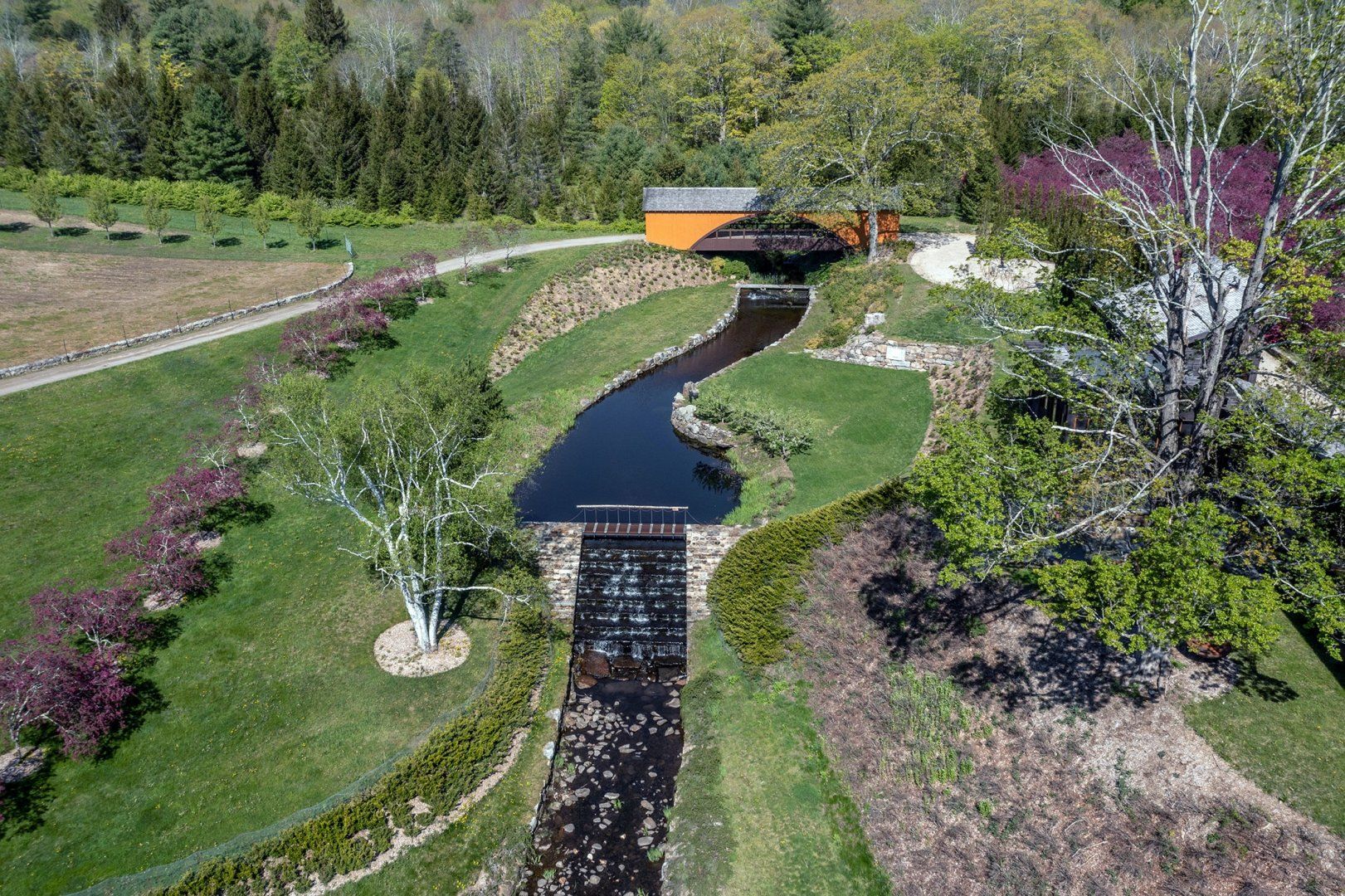 On sunny days, set out and explore your surroundings. Designed by a landscape architect, there is a beautiful sight at every turn. Head down to the circular wooden canopy for a picnic, or walk along the stream until you reach the lovely covered bridge. There is a private pond for swimming and kayaking, which is the perfect place to cool off after a walk through woodland and meadows. When you arrive back home, dine al fresco at the outdoor table, surrounded by picture-perfect scenery. The quaint town of Litchfield is an eleven minute drive away, where you’ll find grocery stores, antiques shops, and galleries.