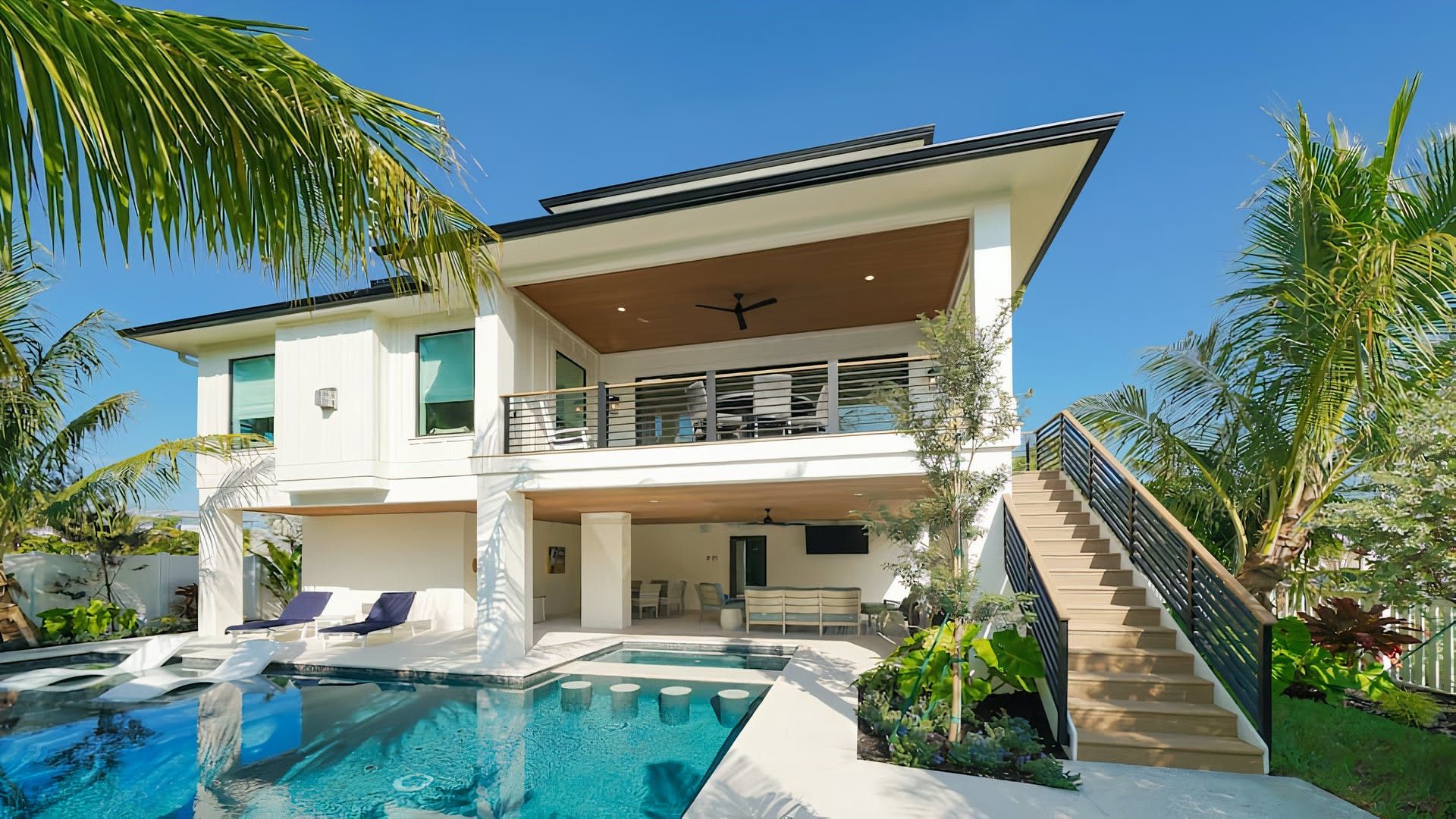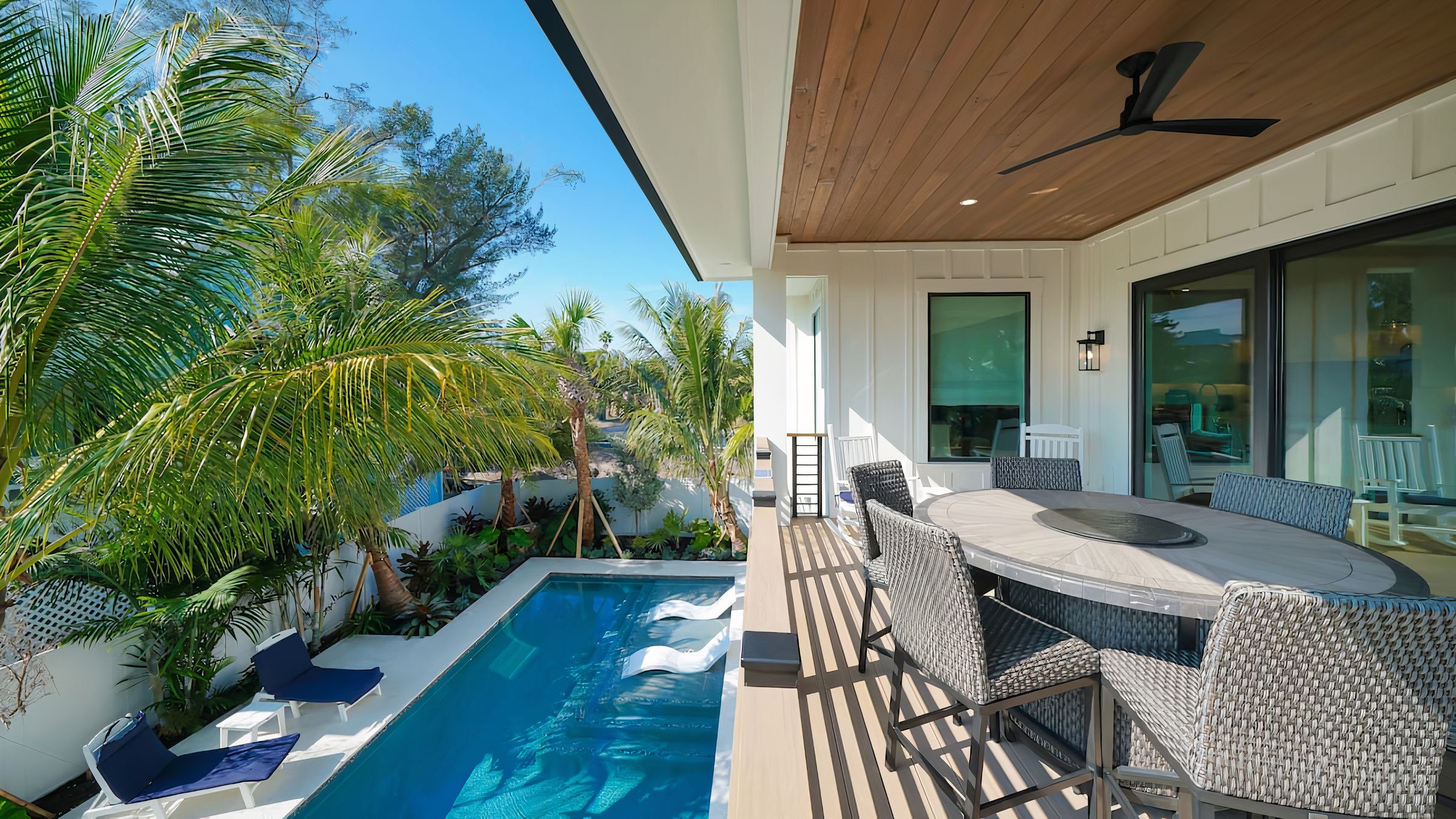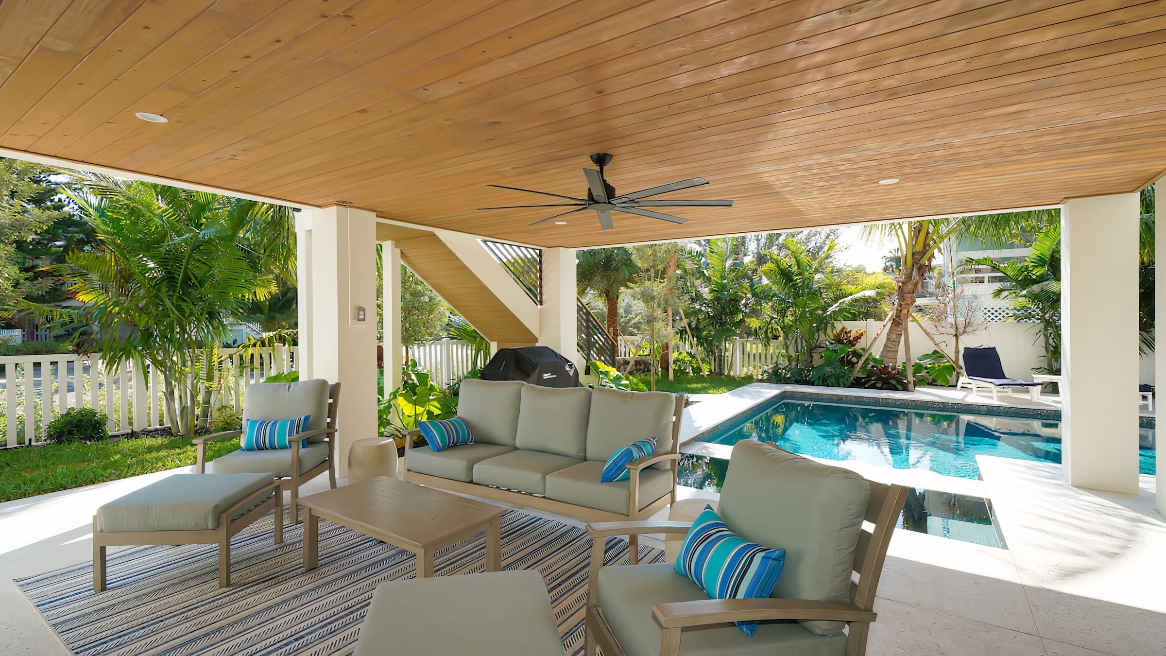 Cook Floribbean cuisine in the impressive chef’s kitchen and dish up in the dining room or serve outside on the shaded terrace. Once the plates are cleared and another ice-cold beverage is poured, find a spot to work on your tan. Pick out a lounger or float in the shimmering pool.
