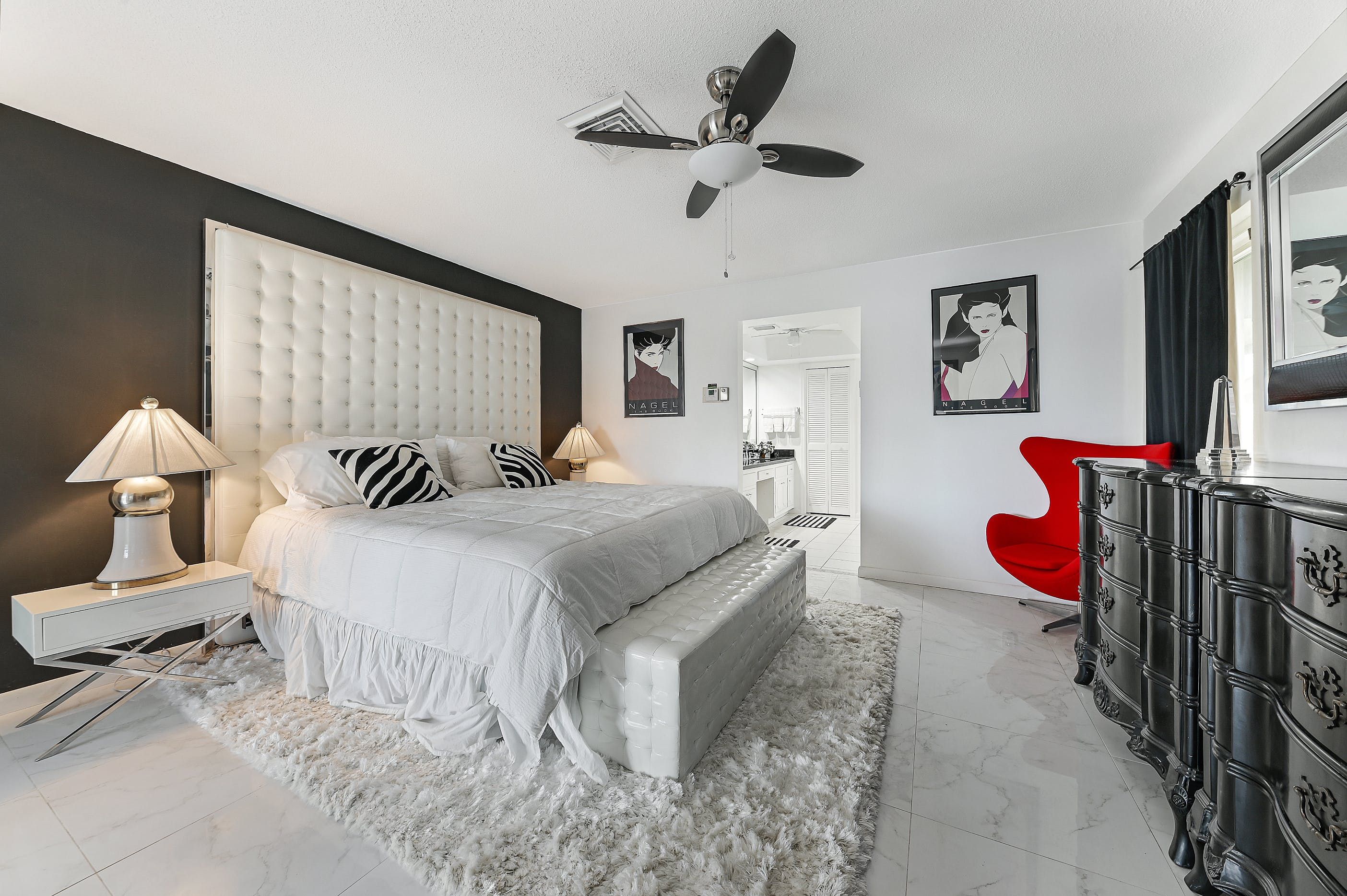 Inside, we love the crisp decor with its monotone and metallic colour palette, and the spacious living area with zones for seating, watching TV and eating. There's a professional office area so working from home will be a breeze and a modern kitchen, equipped with everything you'd expect in your own home. And the master suite, with its black and white theme, topped off with a huge headboard and a marble floor, would be our pick of the bedrooms.