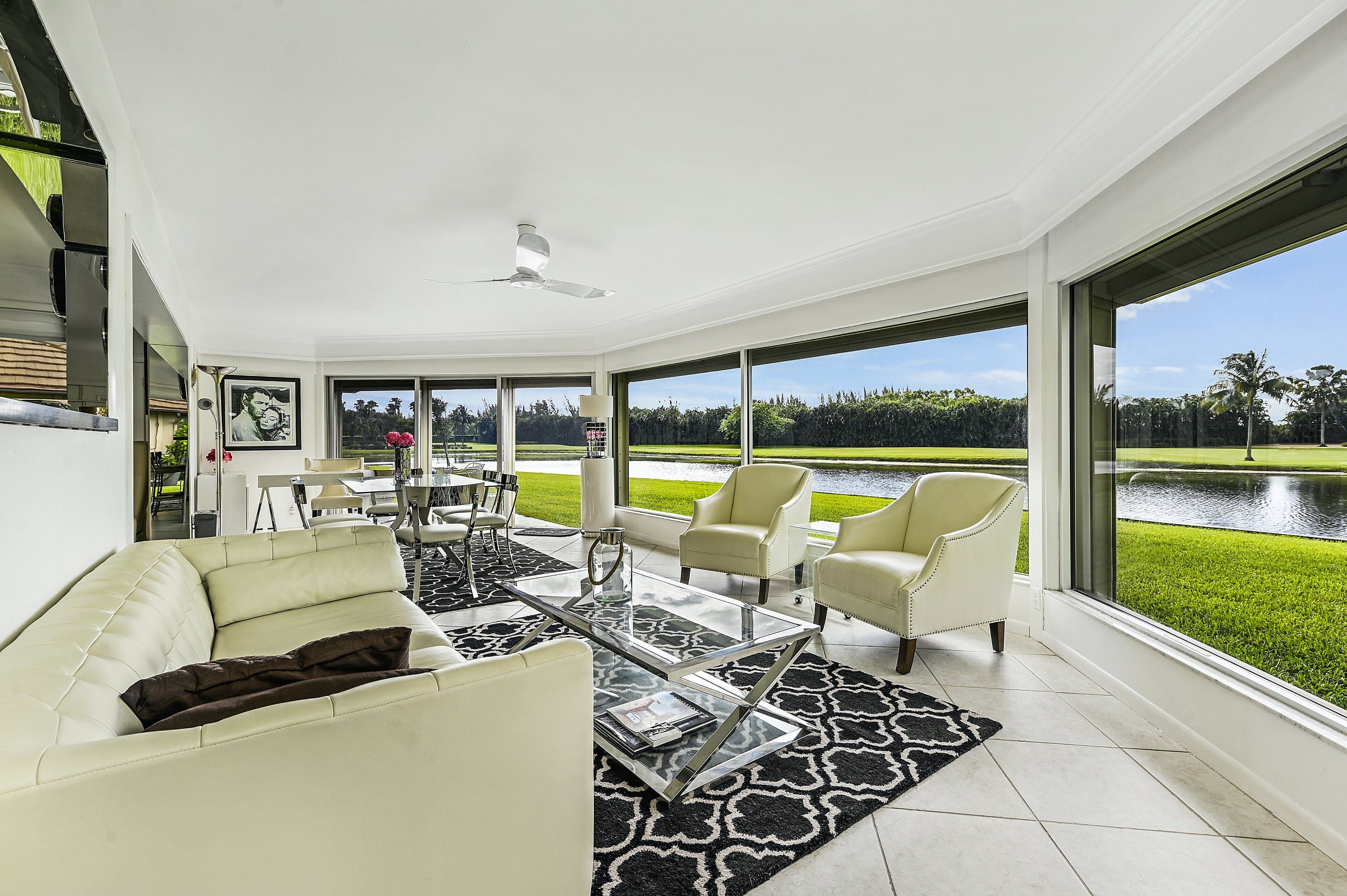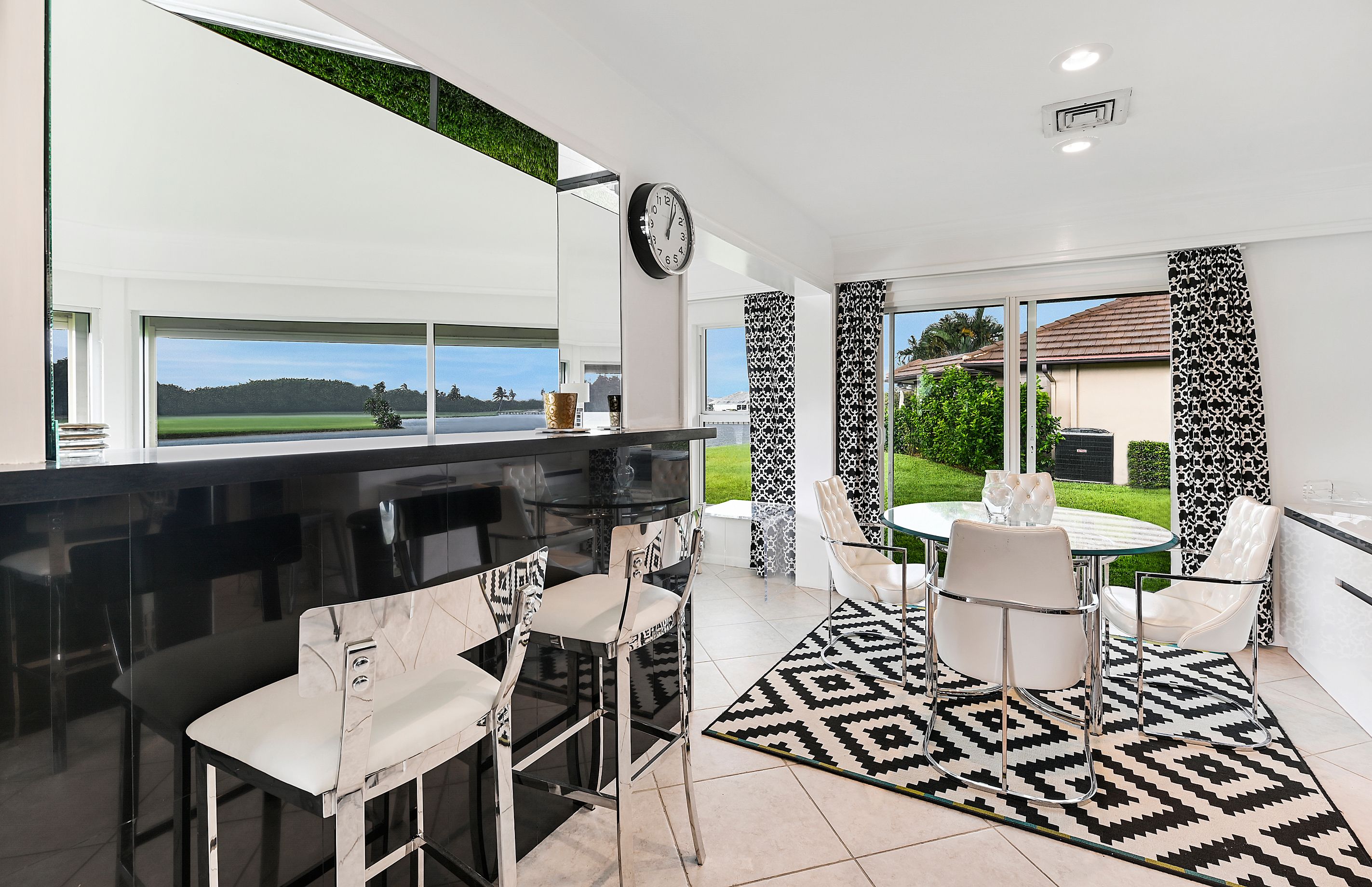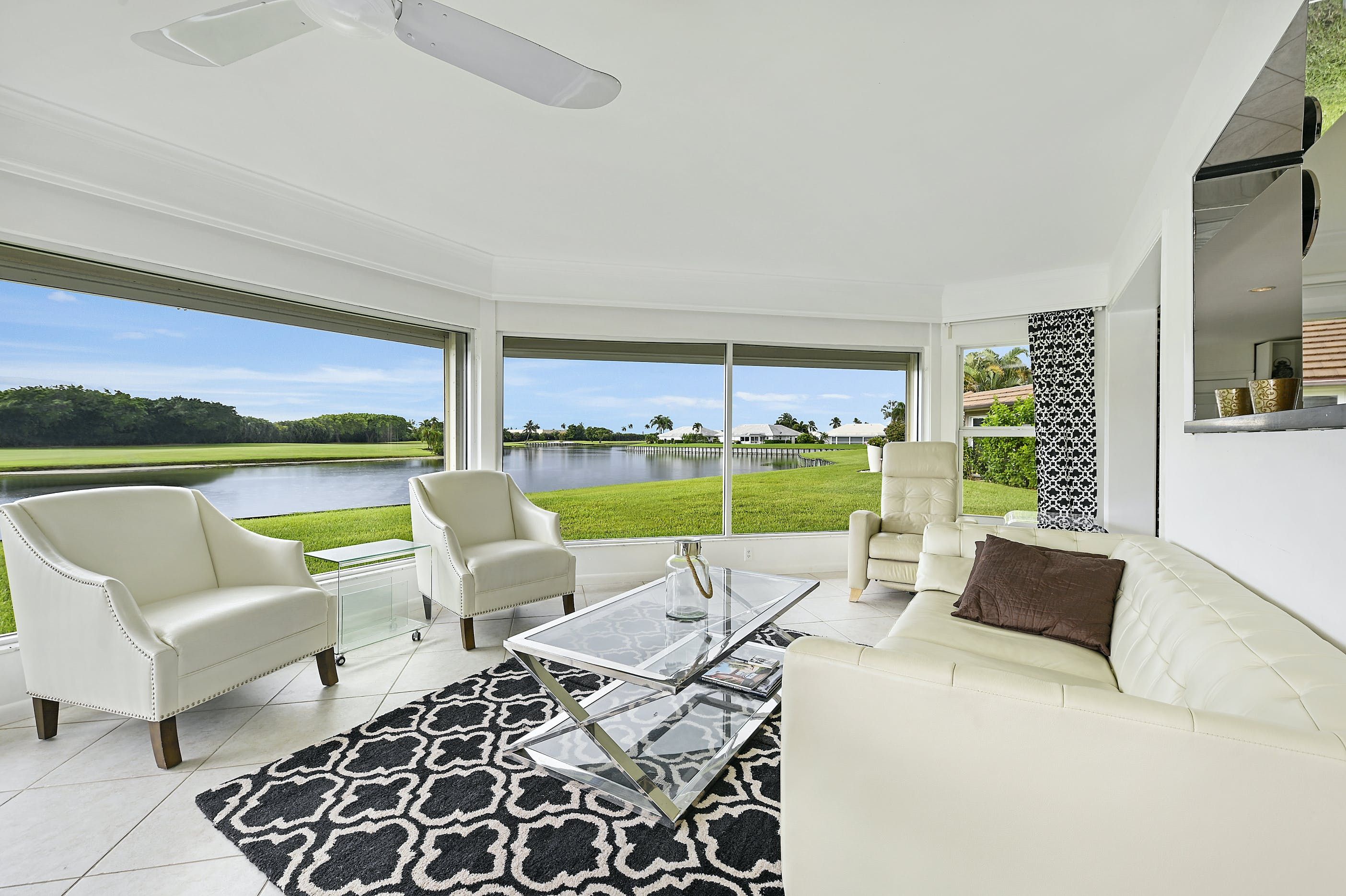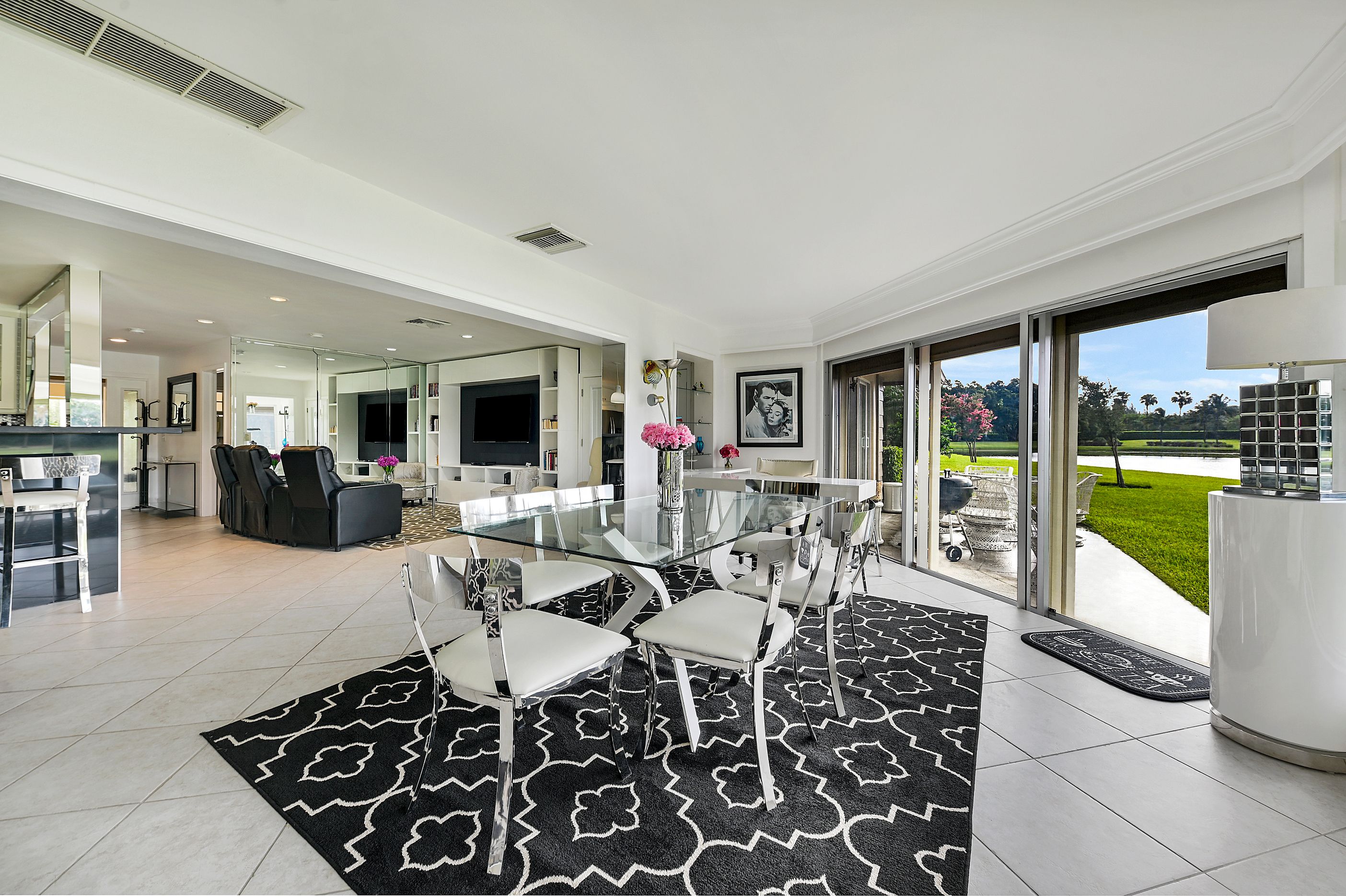 Spend just a few moments admiring the views of the small lake and verdant fairways, and you'll understand why this contemporary bungalow is a relaxing retreat. Situated in the gated Atlantis community, this home oozes sparkle. A sleek, black-and-white colour scheme sets the tone for glossy finishes, like the huge TV (perfect for movie viewings), open-plan layout (ideal for socialising) and a high-end kitchen filled with cookware, appliances and everything else you'll need to rustle up a meal. Tall and wide glass windows overlook the lake and flood the whole living area with Florida sunshine. And although it's small, the patio is the perfect spot to nibble on alfresco snacks and sip cocktails, watching as the evening light slowly fades.