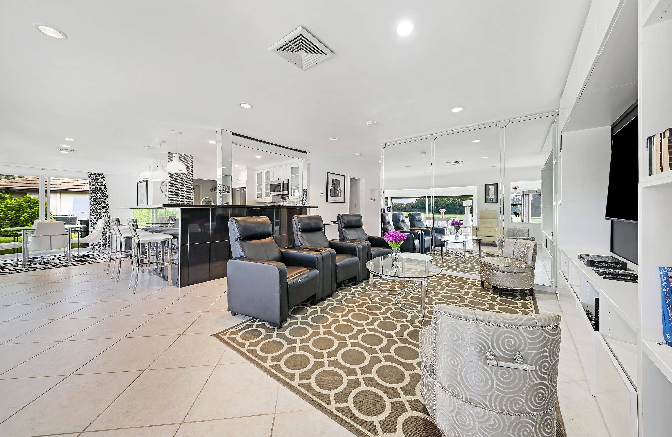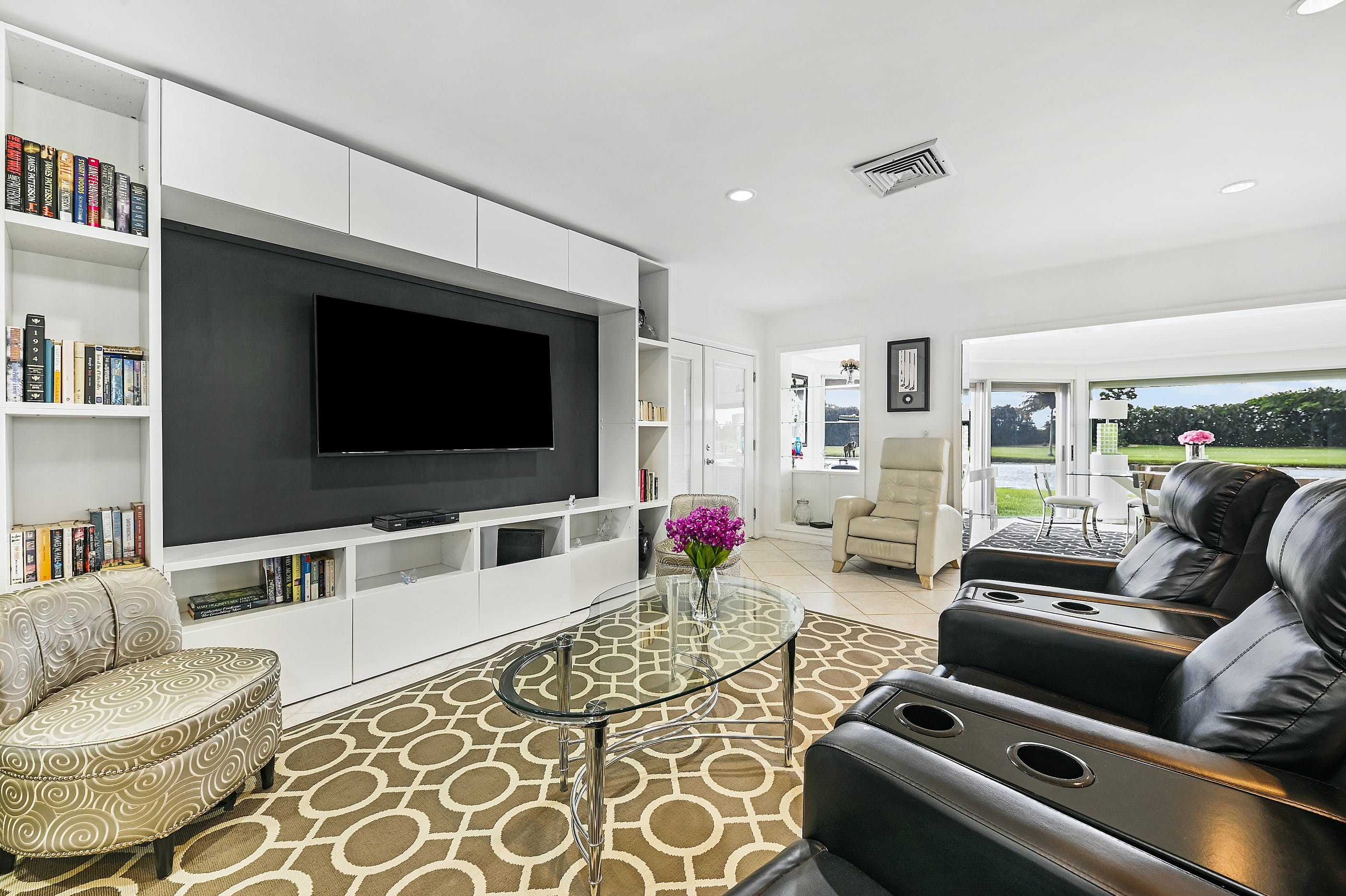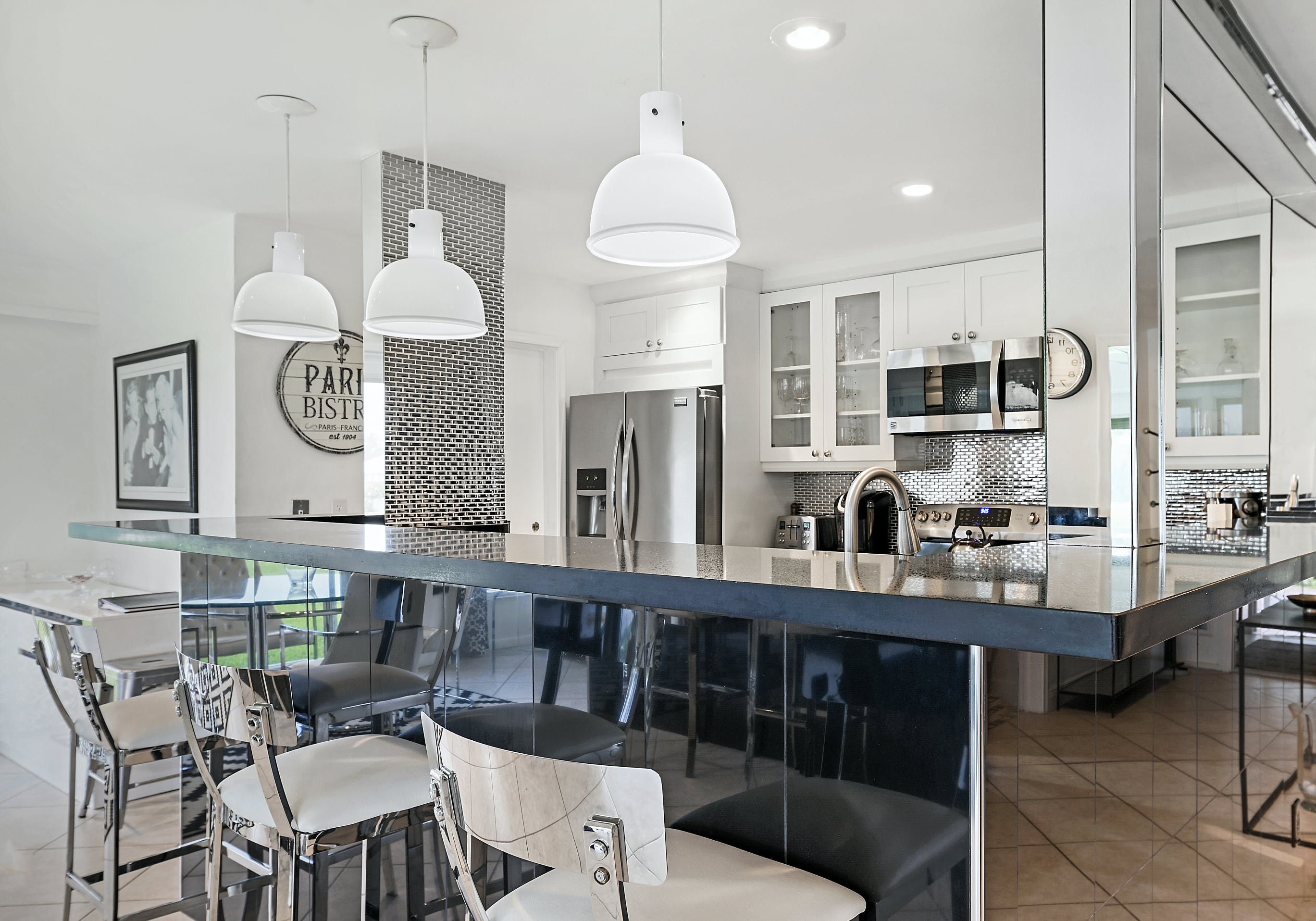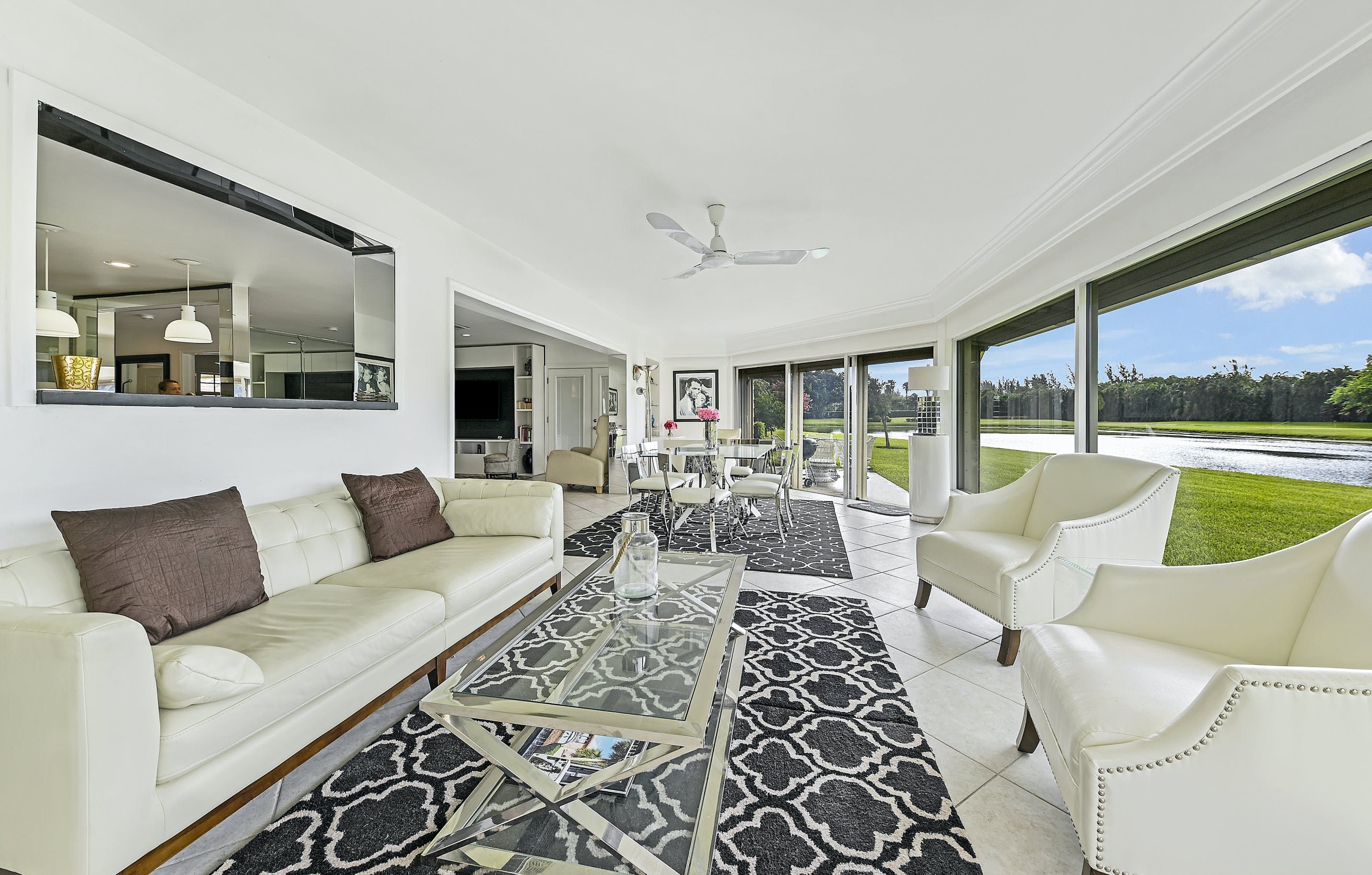 Spend just a few moments admiring the views of the small lake and verdant fairways, and you'll understand why this contemporary bungalow is a relaxing retreat. Situated in the gated Atlantis community, this home oozes sparkle. A sleek, black-and-white colour scheme sets the tone for glossy finishes, like the huge TV (perfect for movie viewings), open-plan layout (ideal for socialising) and a high-end kitchen filled with cookware, appliances and everything else you'll need to rustle up a meal. Tall and wide glass windows overlook the lake and flood the whole living area with Florida sunshine. And although it's small, the patio is the perfect spot to nibble on alfresco snacks and sip cocktails, watching as the evening light slowly fades.