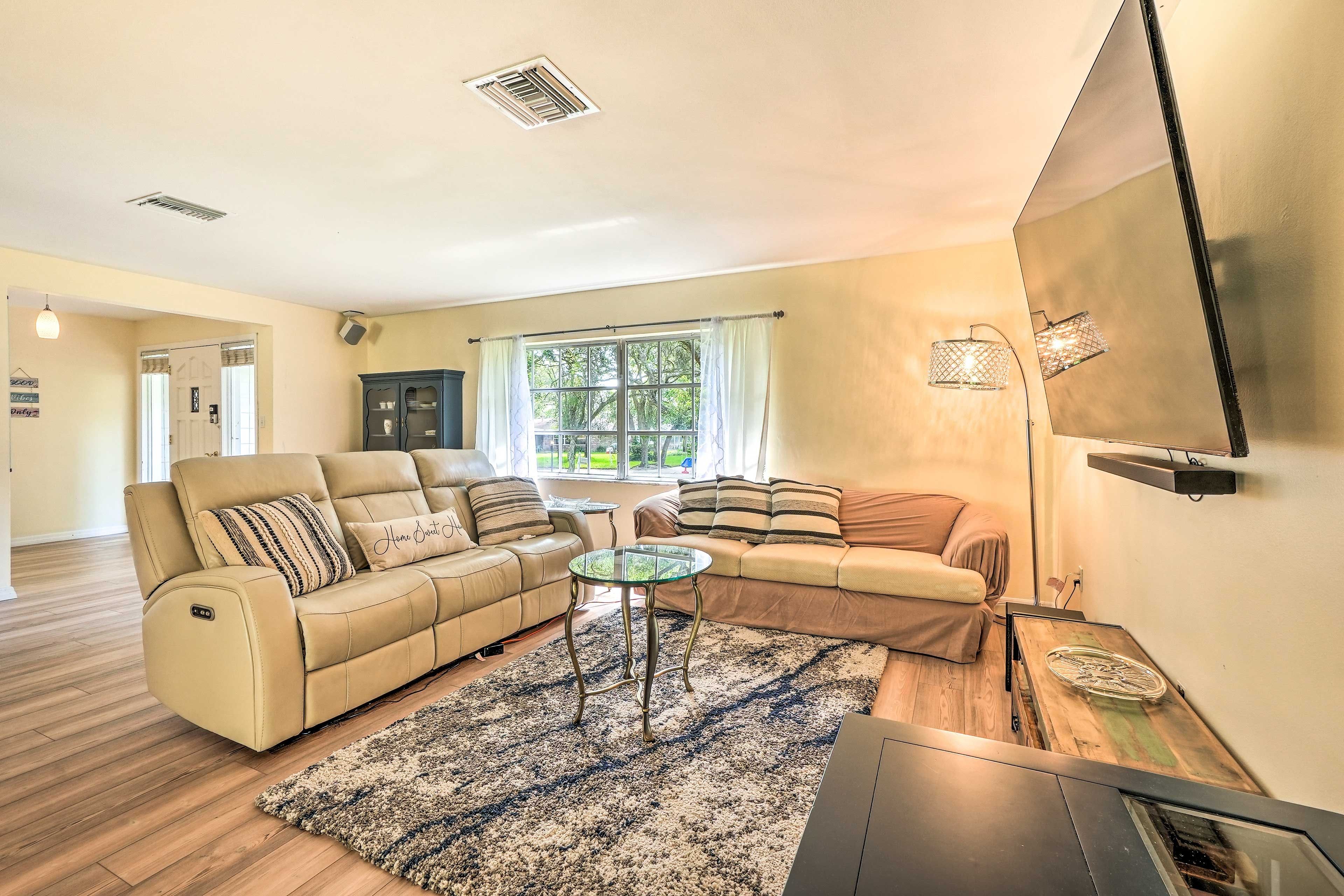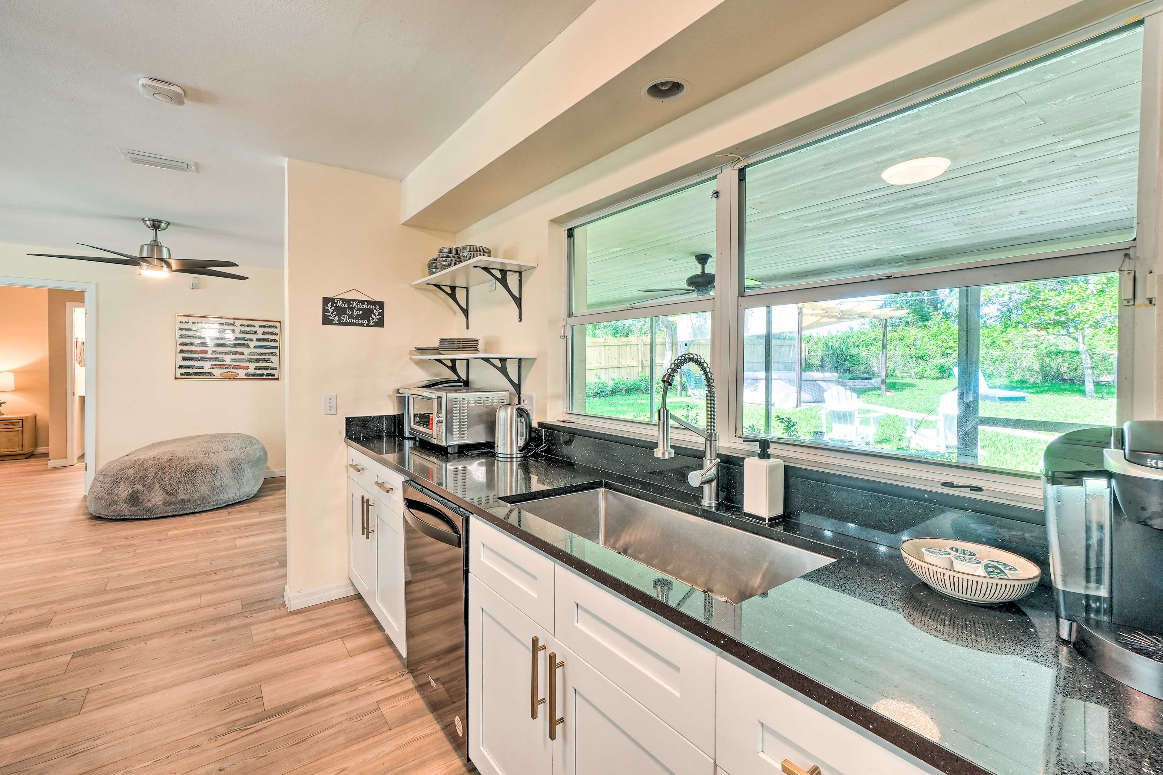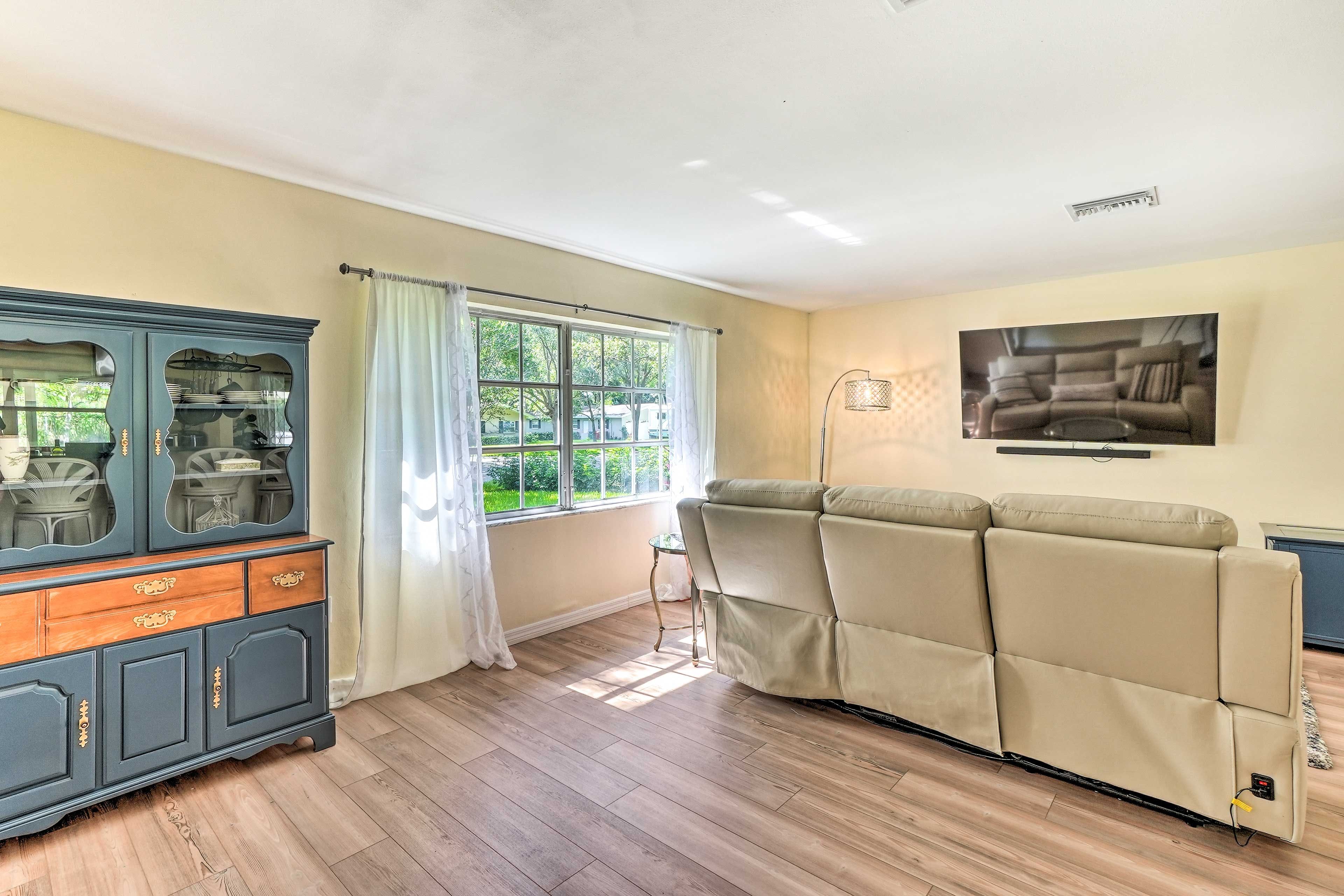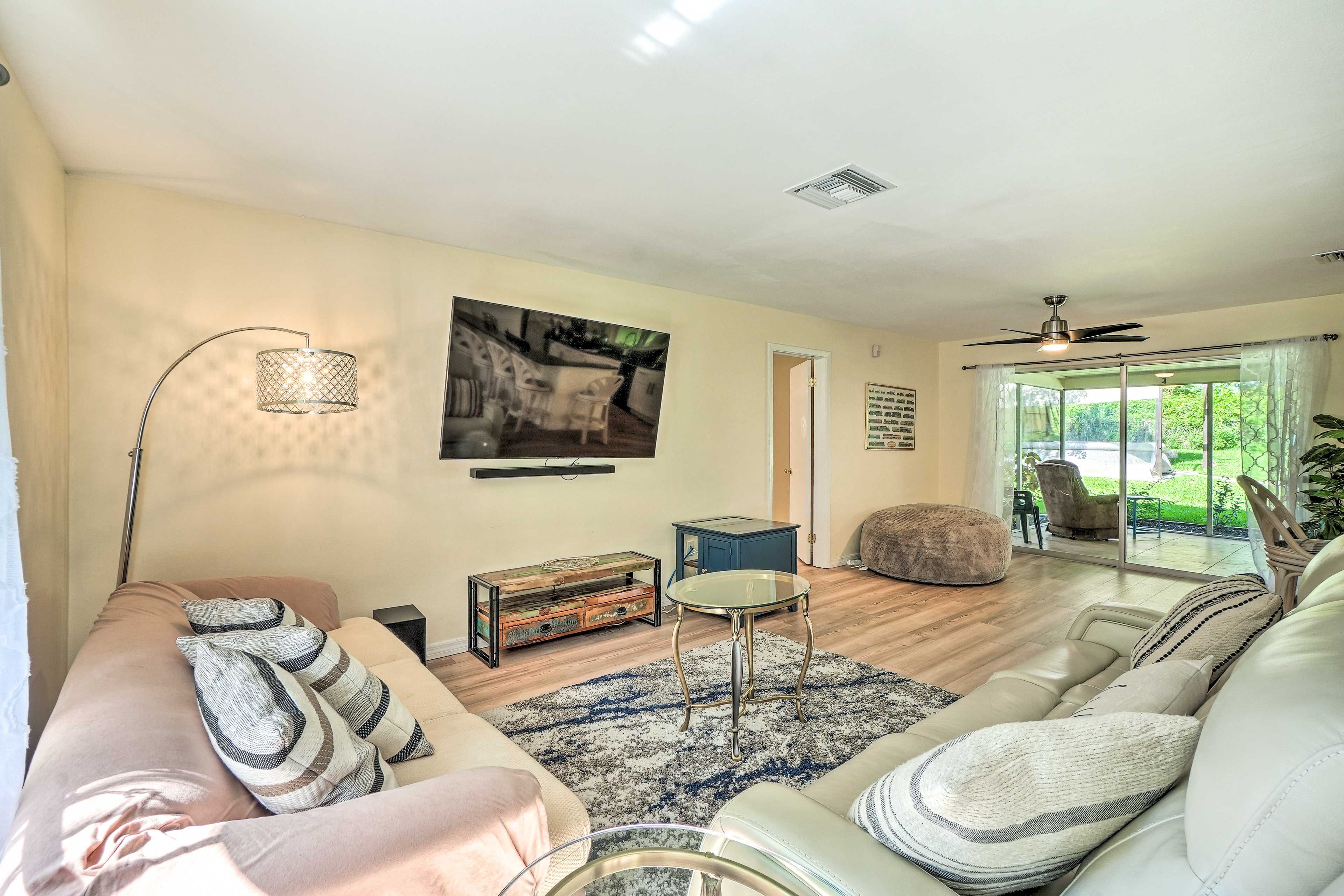 Arrive to be greeted by the cheerful exterior, set against the lush greenery of the garden. Inside, you’ll immediately feel the home’s warm embrace, with the bright living room, contemporary furnishings and plenty of room to lounge about and relax. You’ll be able to kick back and snuggle up for an evening of movies, courtesy of the streaming services available here, and there’s also a modern, well-equipped kitchen for putting together delicious family feasts. You can share these at the indoor dining table or outside in the private garden, where a comfy seating area awaits. Step out here to savour the balmy Florida air in the evening, along with some cool drinks and excellent company. Little ones will love the outdoor play area too.