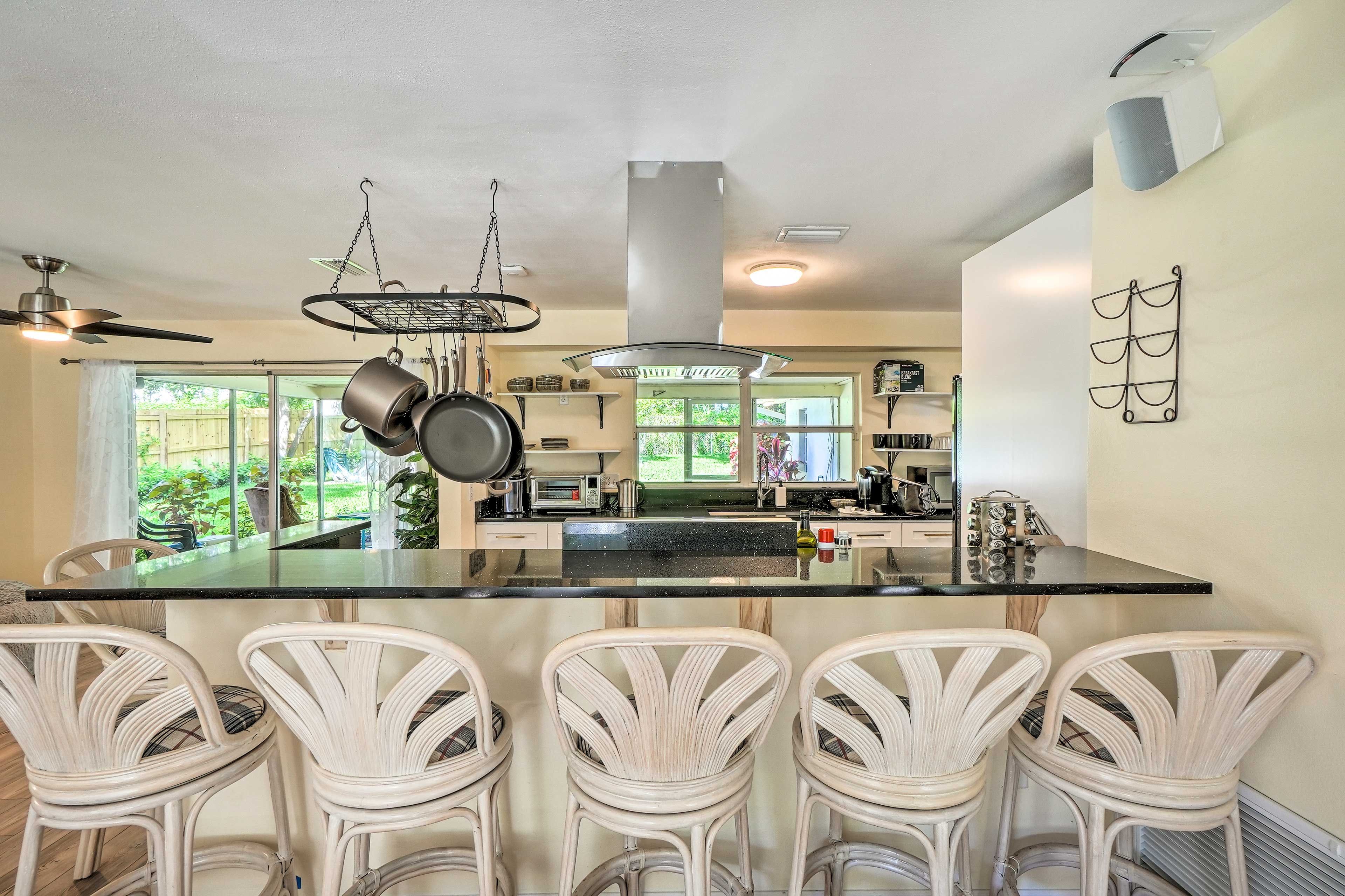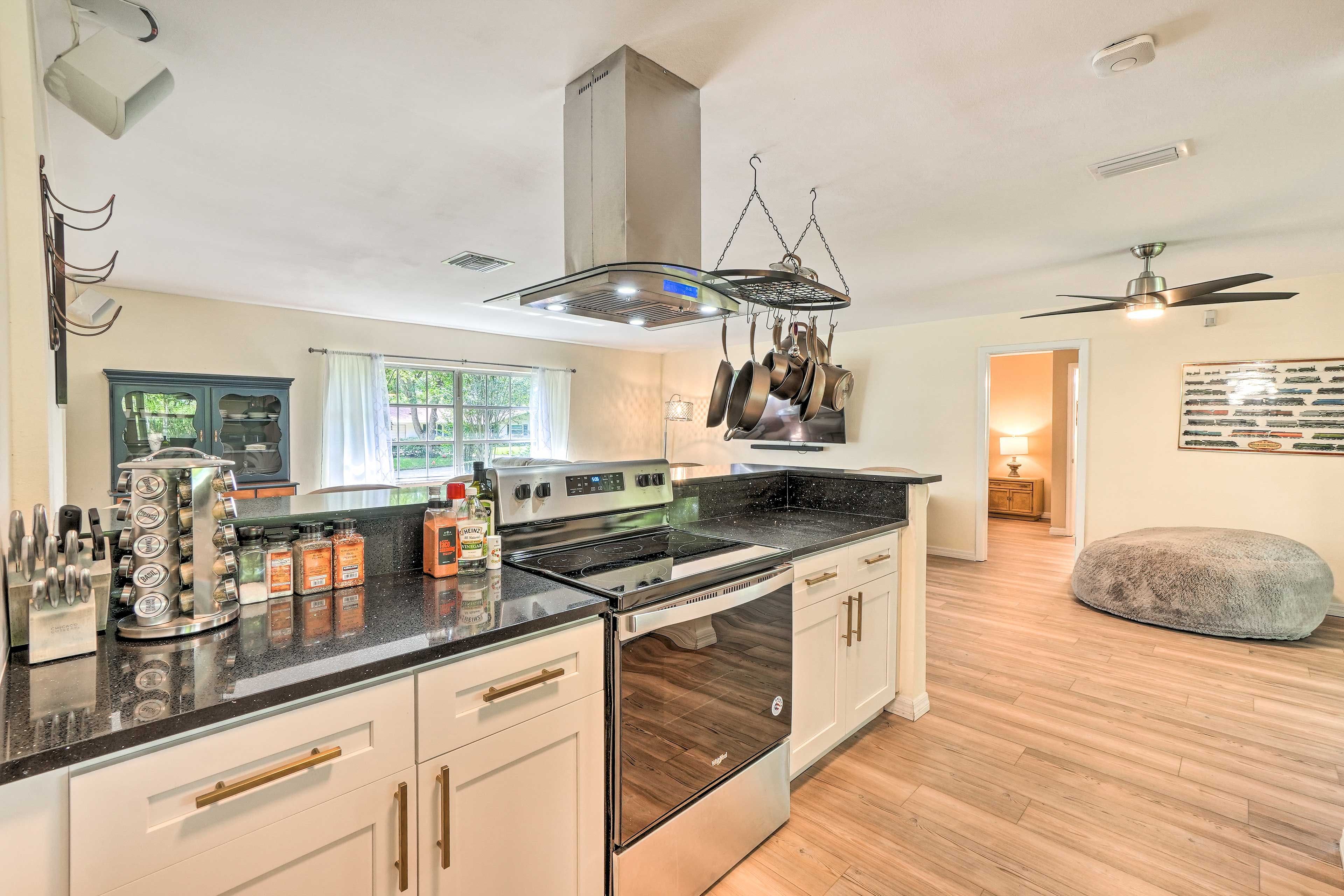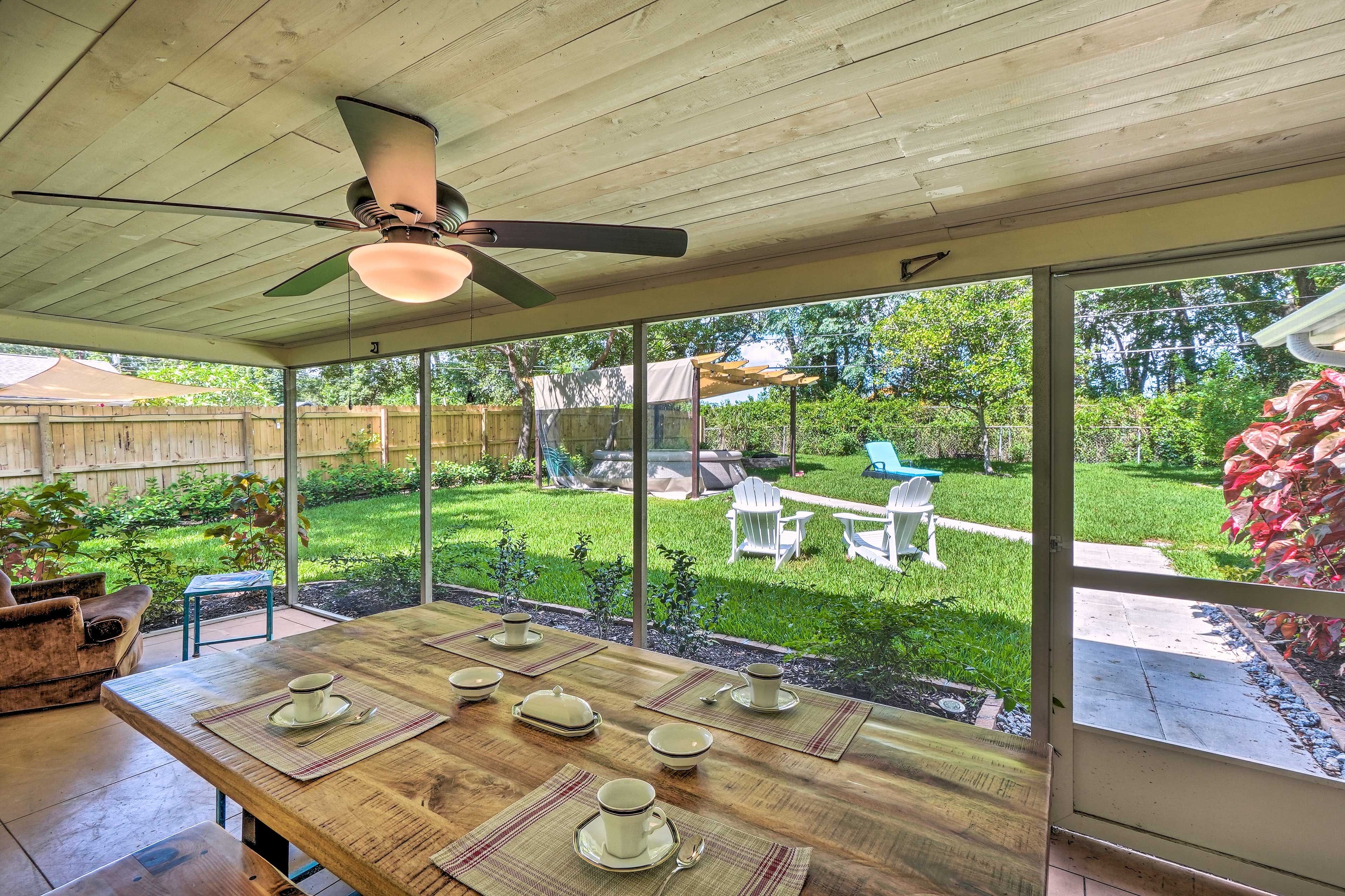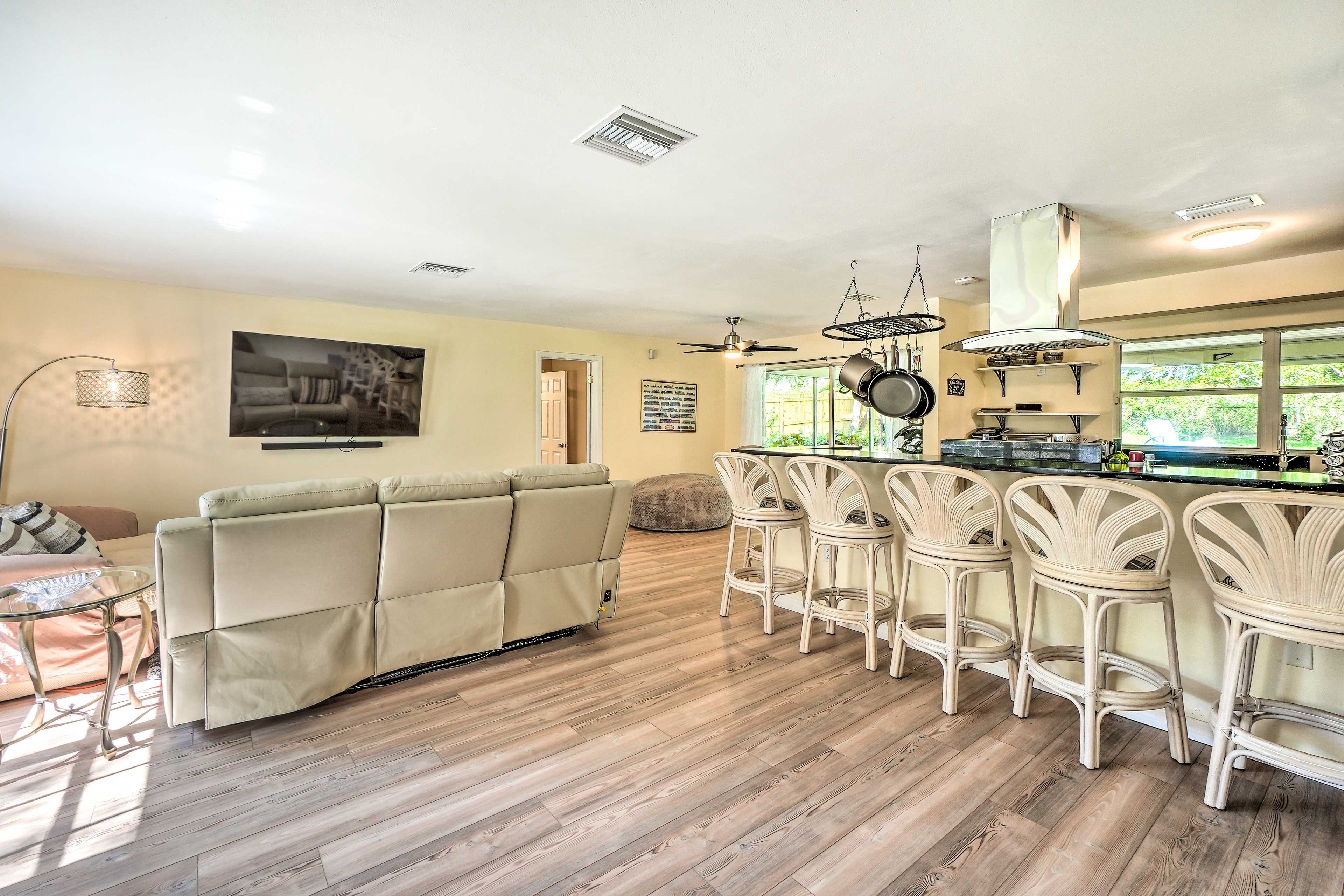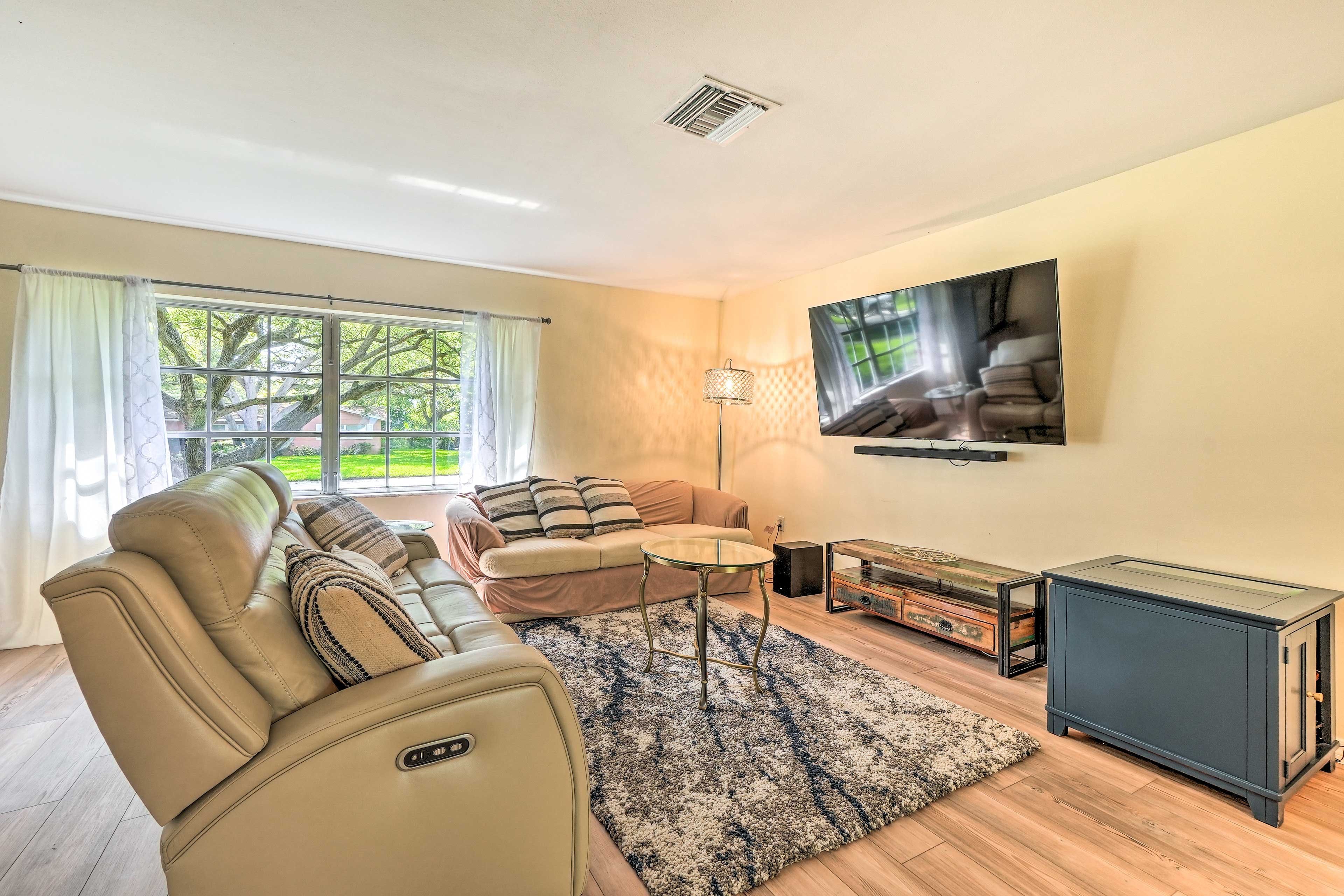 Arrive to be greeted by the cheerful exterior, set against the lush greenery of the garden. Inside, you’ll immediately feel the home’s warm embrace, with the bright living room, contemporary furnishings and plenty of room to lounge about and relax. You’ll be able to kick back and snuggle up for an evening of movies, courtesy of the streaming services available here, and there’s also a modern, well-equipped kitchen for putting together delicious family feasts. You can share these at the indoor dining table or outside in the private garden, where a comfy seating area awaits. Step out here to savour the balmy Florida air in the evening, along with some cool drinks and excellent company. Little ones will love the outdoor play area too.
