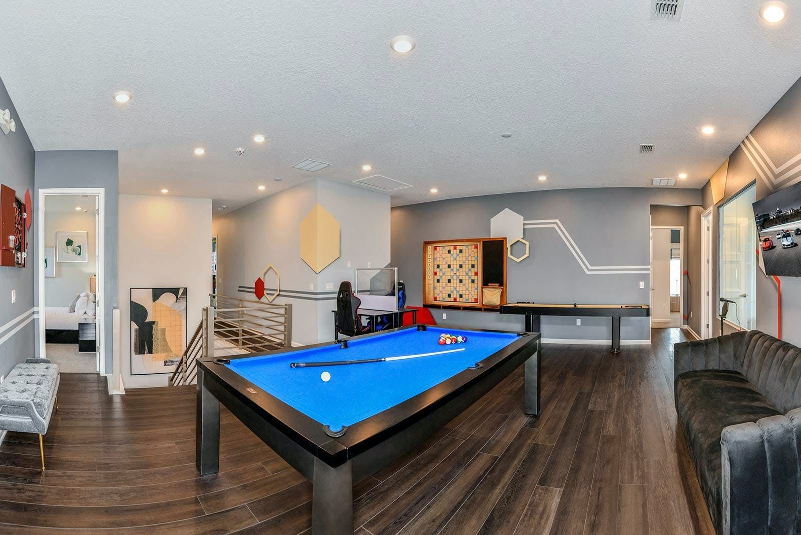 Just a short drive from Disney, this home places you in a magical part of Florida. Days can be spent exploring the local attraction parks or Downtown Orlando and Kissimmee. There’s plenty to keep the whole group entertained back at home with a private pool, Jacuzzi, sports simulator room, a cinema and a games room. Exercise enthusiasts will appreciate the fitness room, while everyone can enjoy access to the resort pool, tennis court and restaurant.