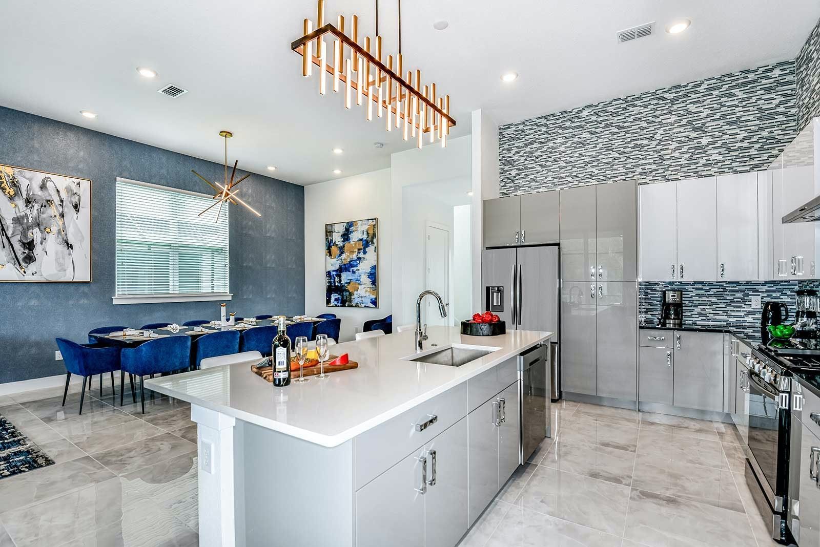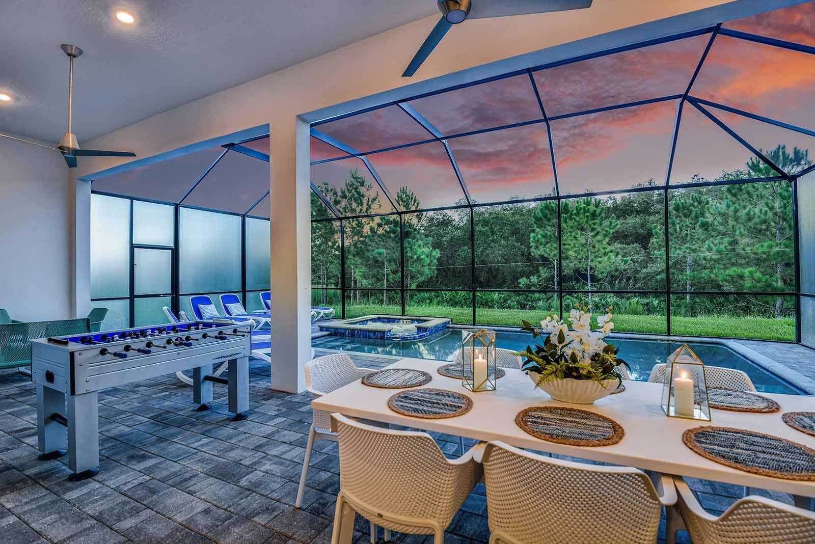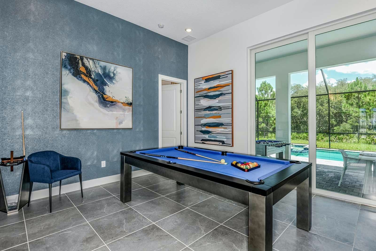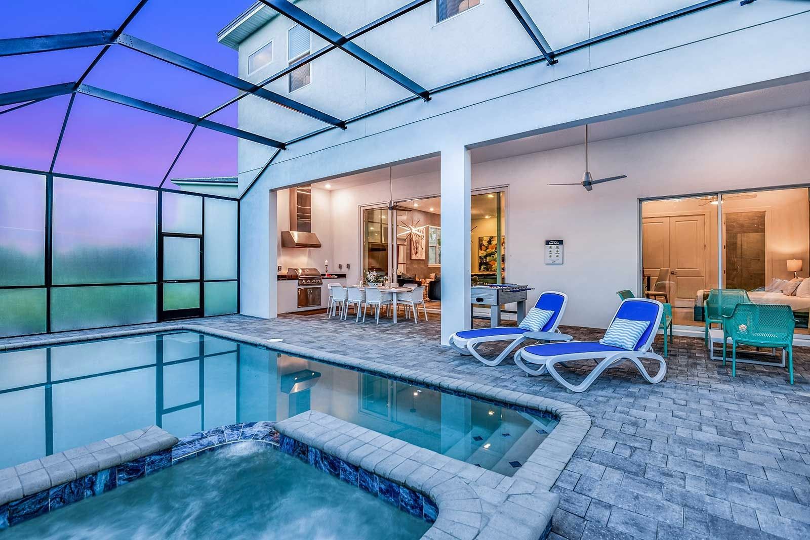 This villa is a luxurious 4,000-square-foot mansion that offers a five-star resort feel and is located in a resort. The villa features high-end amenities such as a private screened swimming pool, outdoor kitchen, foosball table, and a spillover spa. The great room has comfy couches and an adjacent pool table, while the light and airy kitchen has a sleek gray custom cabinetry and chrome fixtures. The villa also boasts a fabulous private theater complete with ultra-comfortable seating and surround-sound, as well as an entertainment loft with darts and poker. The Pirate's Hideaway bedroom is perfect for kids with three nautical bunk beds that sleep up to six kids and an escape slide leading to a secret game room. There are five additional gorgeous bedrooms with en suite baths that are super relaxing yet modern. The villa is conveniently located near Orlando's famous attractions and dining destinations such as Disney Parks, Universal Parks, SeaWorld, World-Class Shopping & Dining, Groceries & Convenience Shops. Guests will also have access to the resort's amenities such as tennis courts, a lazy river, fitness center, and more.
