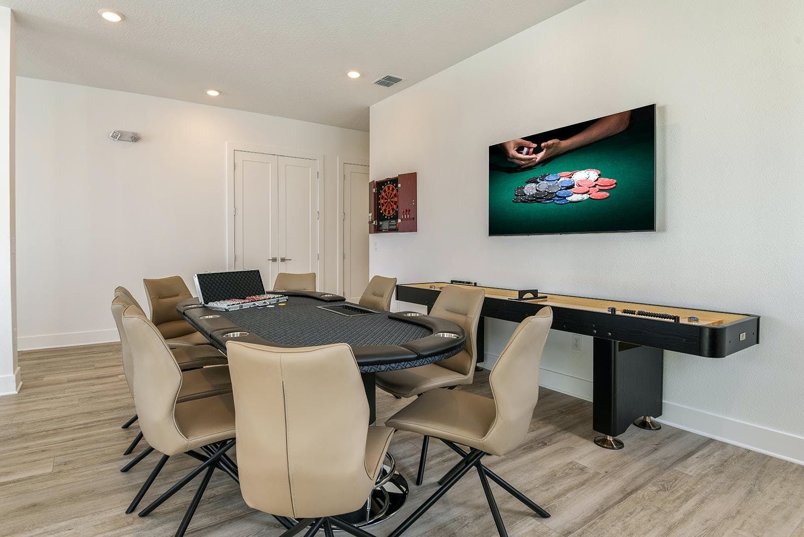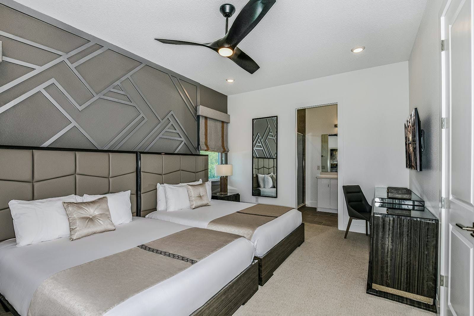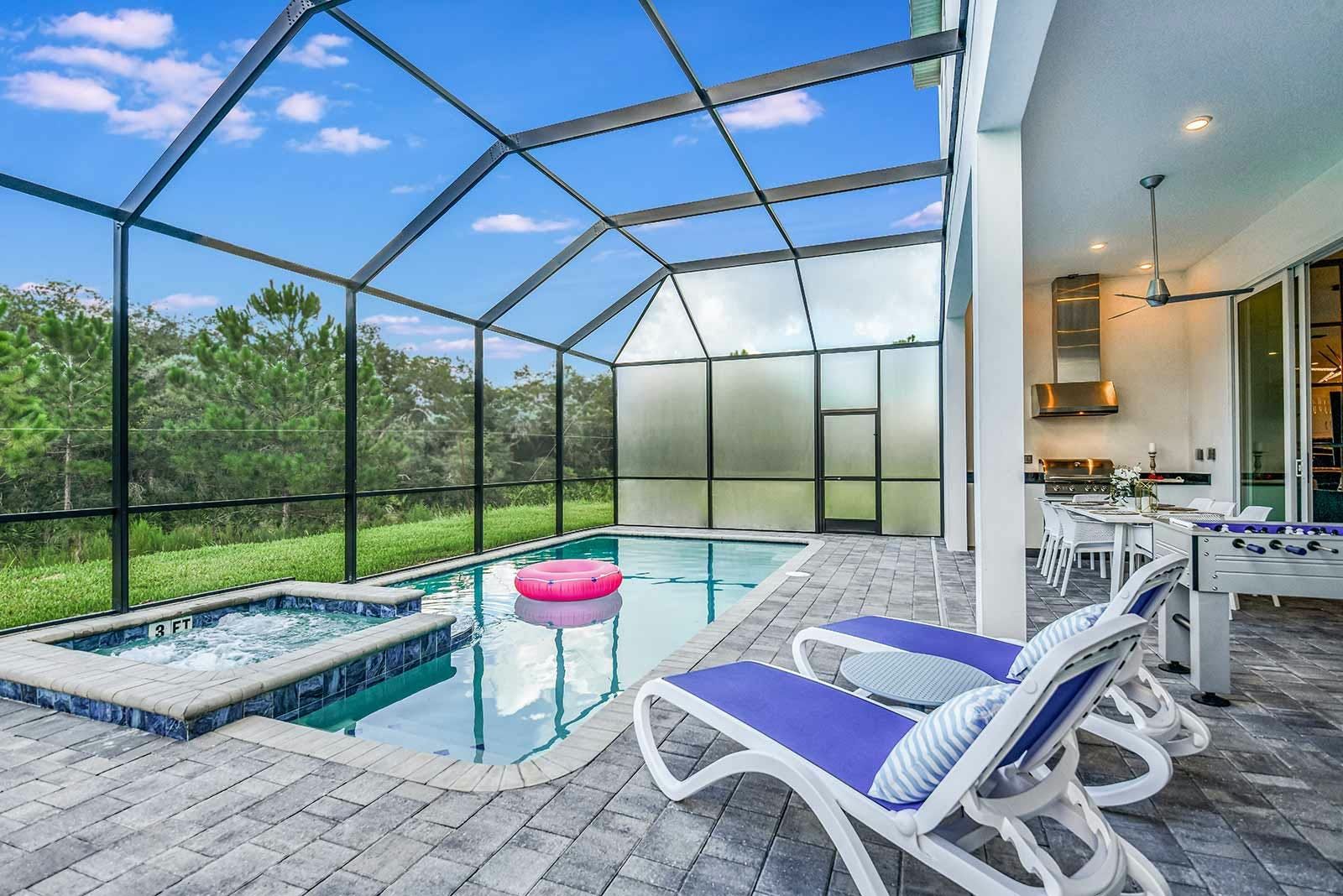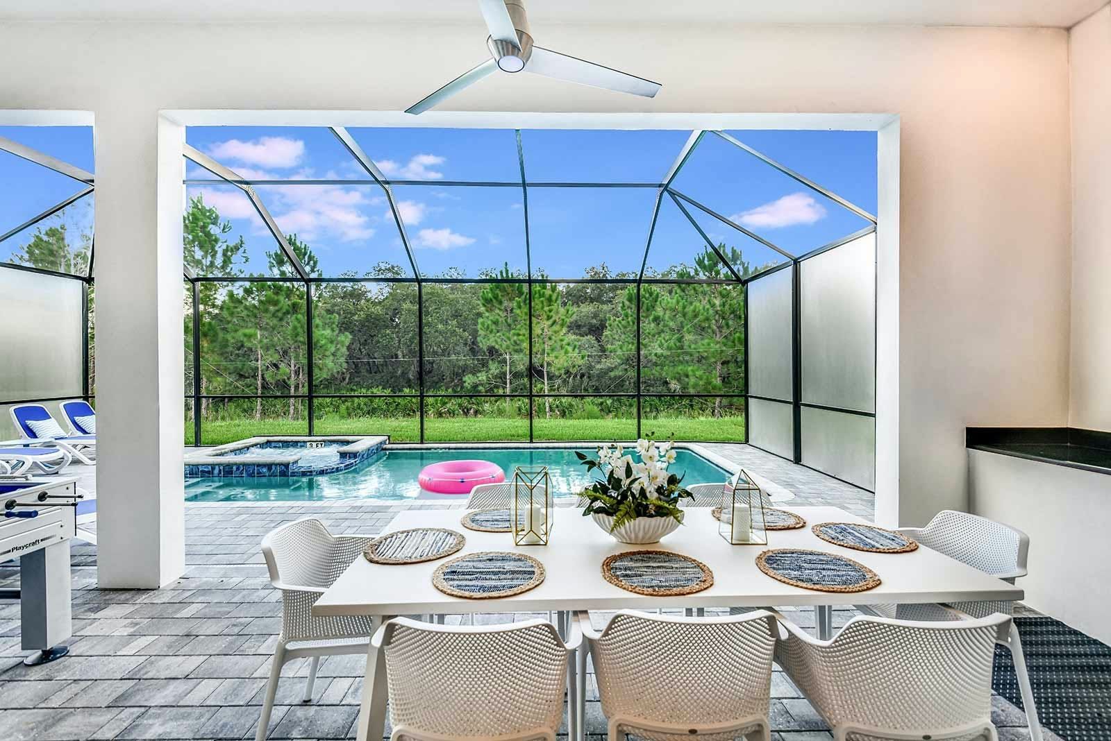 This villa is a luxurious 4,000-square-foot mansion that offers a five-star resort feel and is located in a resort. The villa features high-end amenities such as a private screened swimming pool, outdoor kitchen, foosball table, and a spillover spa. The great room has comfy couches and an adjacent pool table, while the light and airy kitchen has a sleek gray custom cabinetry and chrome fixtures. The villa also boasts a fabulous private theater complete with ultra-comfortable seating and surround-sound, as well as an entertainment loft with darts and poker. The Pirate's Hideaway bedroom is perfect for kids with three nautical bunk beds that sleep up to six kids and an escape slide leading to a secret game room. There are five additional gorgeous bedrooms with en suite baths that are super relaxing yet modern. The villa is conveniently located near Orlando's famous attractions and dining destinations such as Disney Parks, Universal Parks, SeaWorld, World-Class Shopping & Dining, Groceries & Convenience Shops. Guests will also have access to the resort's amenities such as tennis courts, a lazy river, fitness center, and more.