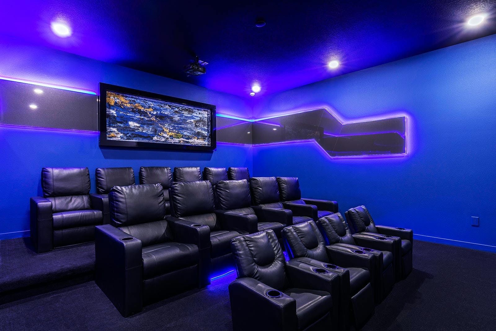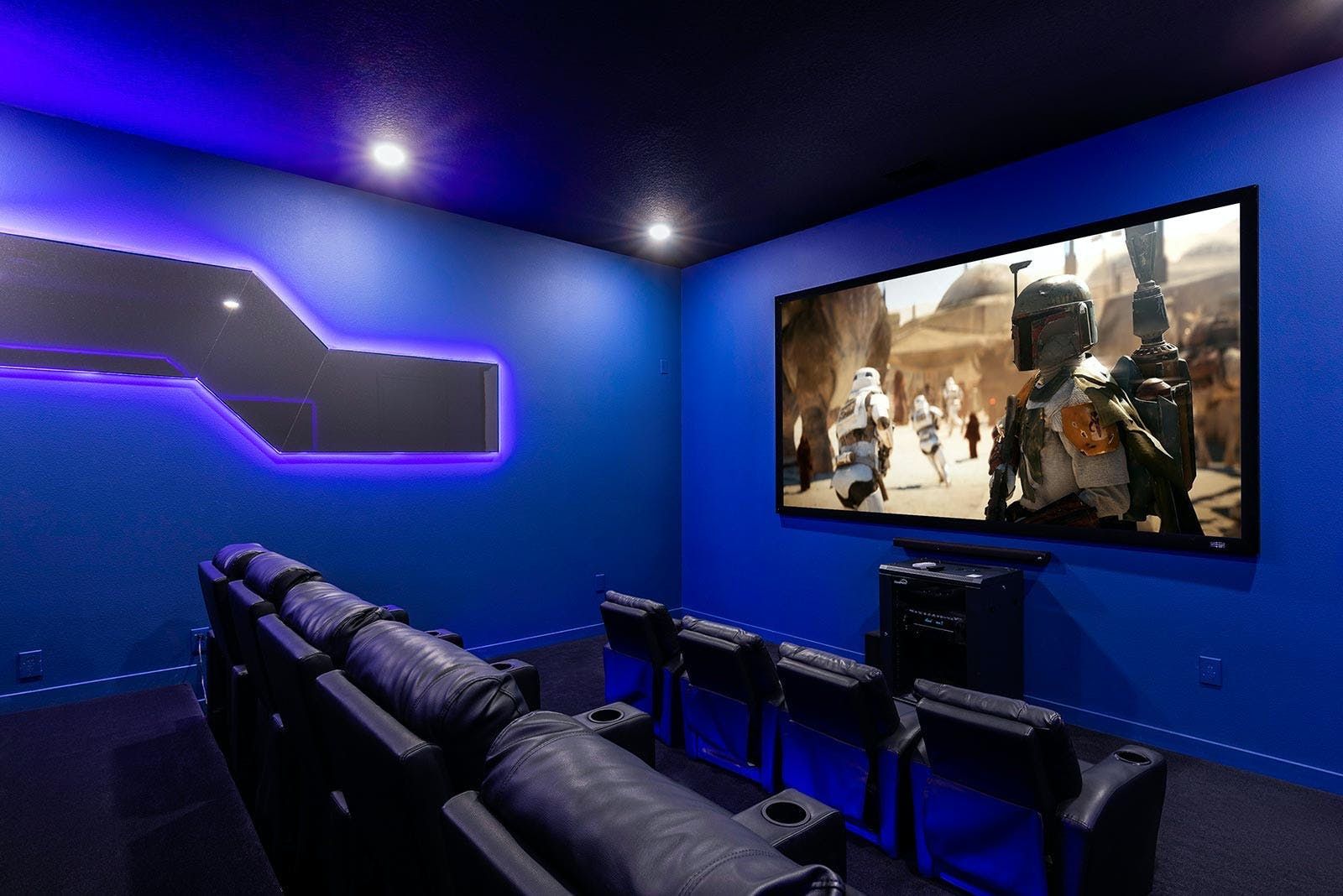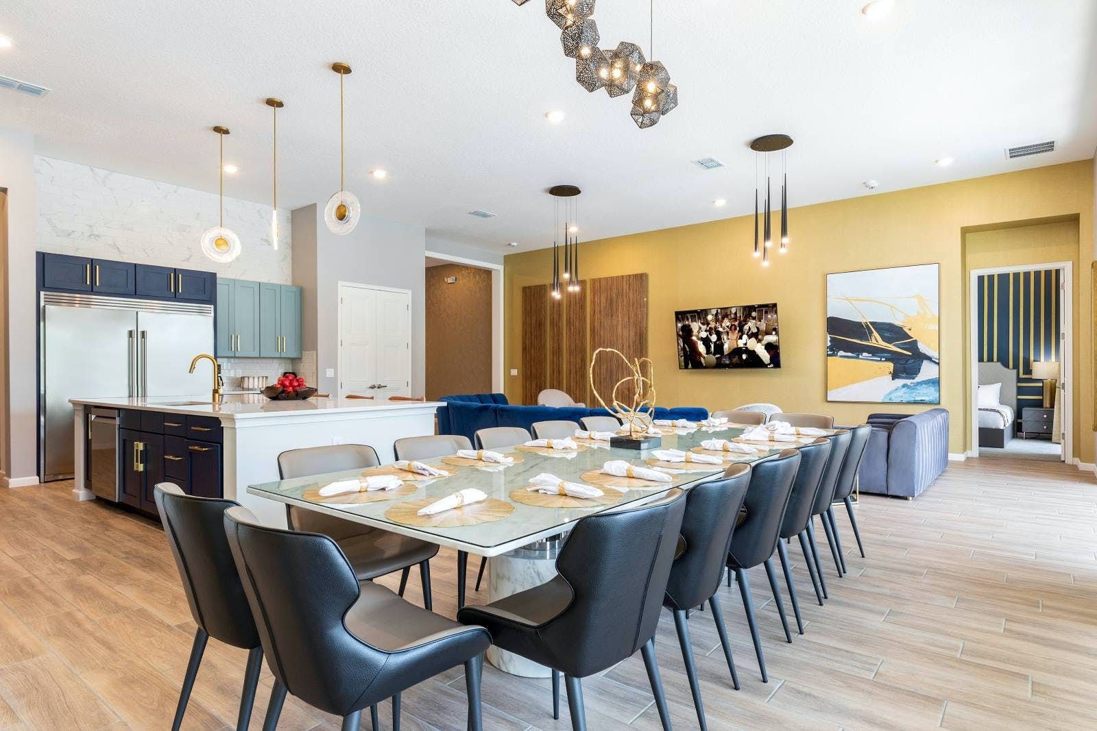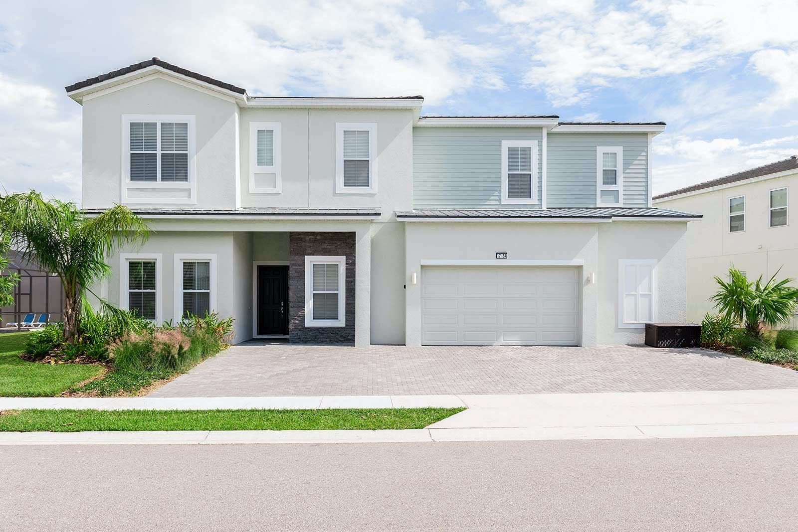 This luxurious 7,200-square-foot mansion features sleek modern décor and a fully equipped chef's kitchen with stone countertops, stainless steel appliances, custom deep-blue cabinetry, and oak floors. The mansion also boasts a built-in bowling alley, a VR room with three epic machines, a private movie theater with 15 reclining seats, and a game loft with pool table and other games. Outdoors, guests can enjoy the fabulous pool and spa, outdoor kitchen, ping-pong, foosball, pool basketball, and mini pool slide. The mansion has nine beautiful bedrooms with en suite baths including two master king-size bedrooms on the first floor and six more gorgeously appointed bedrooms on the second floor. Two themed kids' bedrooms are designed as playrooms filled with wonder and special surprises. Guests will have access to all of the resort's amenities: tennis courts, lazy river, fitness center, etc., as well as nearby attractions like Disney Parks and World-Class Shopping & Dining.