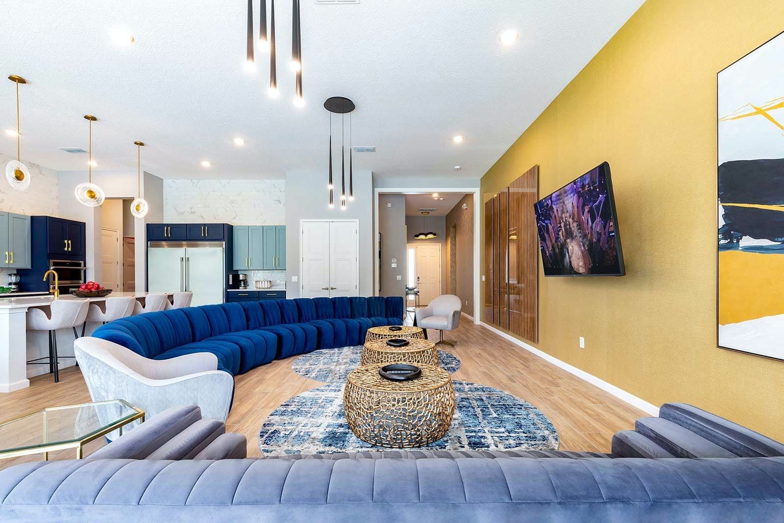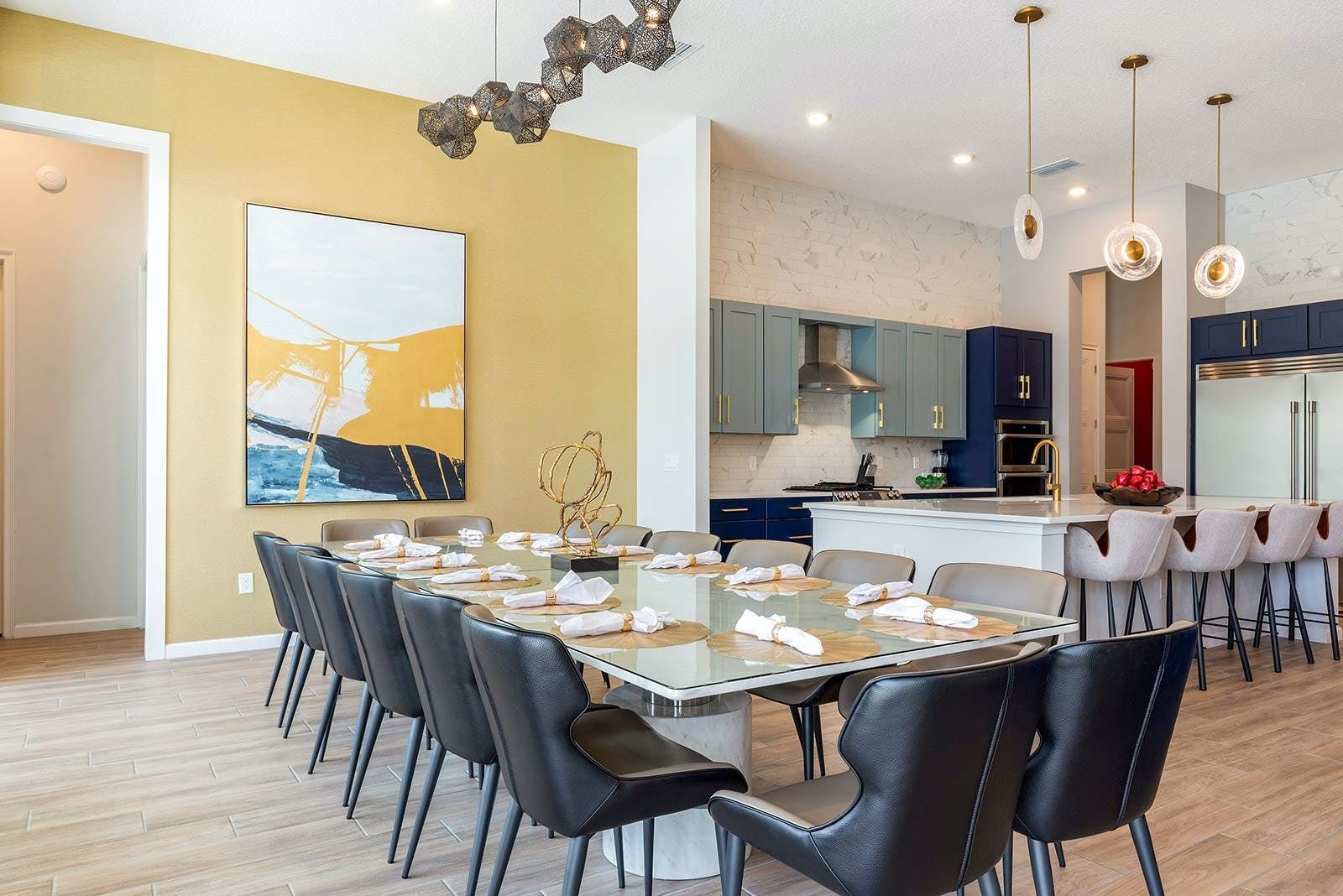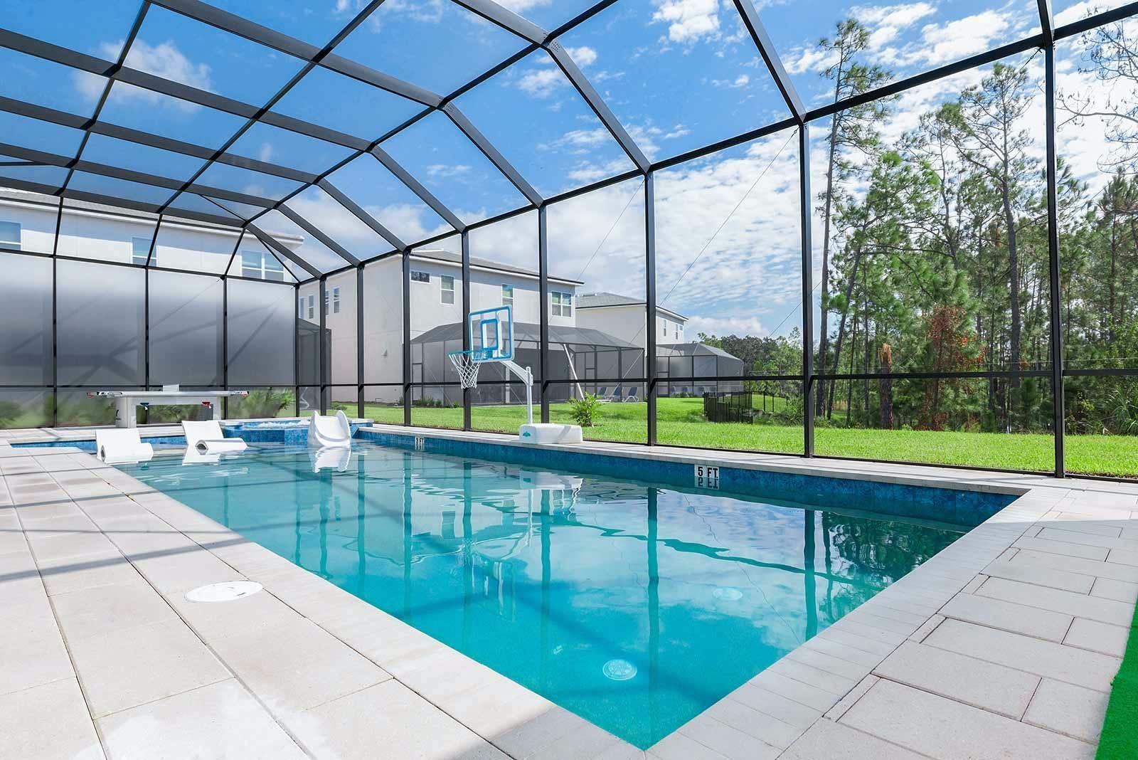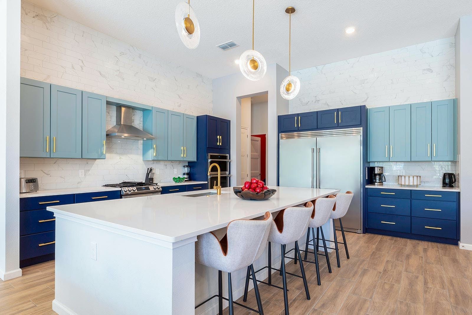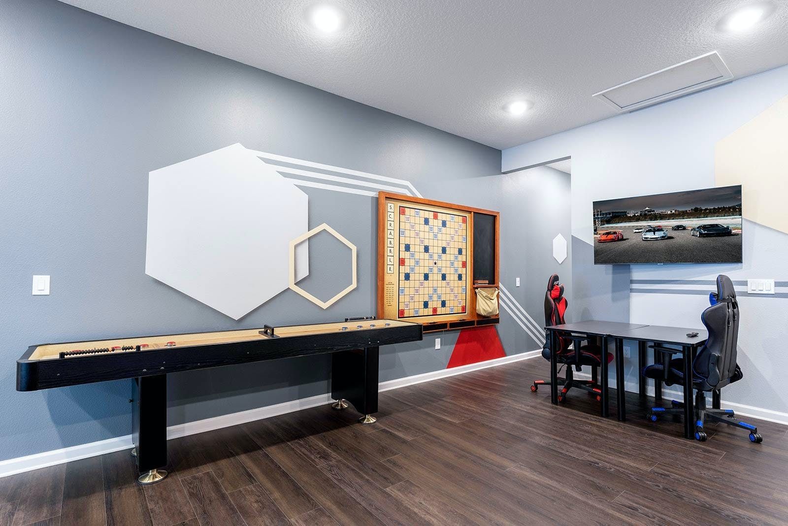This luxurious 7,200-square-foot mansion features sleek modern décor and a fully equipped chef's kitchen with stone countertops, stainless steel appliances, custom deep-blue cabinetry, and oak floors. The mansion also boasts a built-in bowling alley, a VR room with three epic machines, a private movie theater with 15 reclining seats, and a game loft with pool table and other games. Outdoors, guests can enjoy the fabulous pool and spa, outdoor kitchen, ping-pong, foosball, pool basketball, and mini pool slide. The mansion has nine beautiful bedrooms with en suite baths including two master king-size bedrooms on the first floor and six more gorgeously appointed bedrooms on the second floor. Two themed kids' bedrooms are designed as playrooms filled with wonder and special surprises. Guests will have access to all of the resort's amenities: tennis courts, lazy river, fitness center, etc., as well as nearby attractions like Disney Parks and World-Class Shopping & Dining.