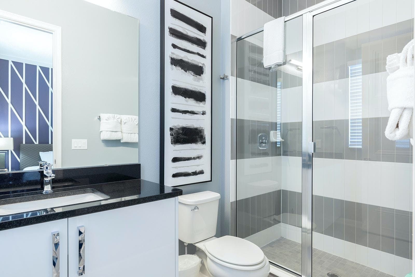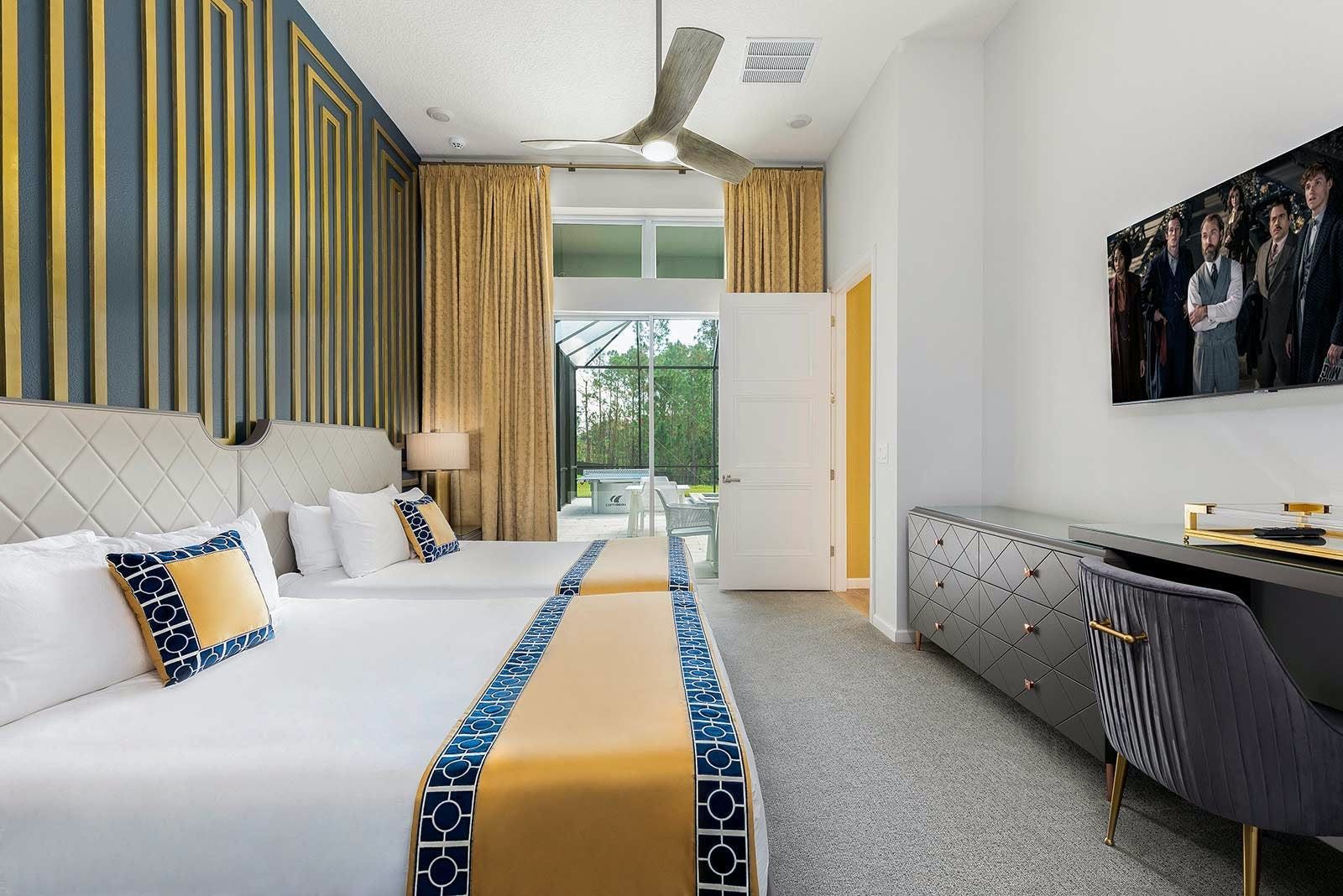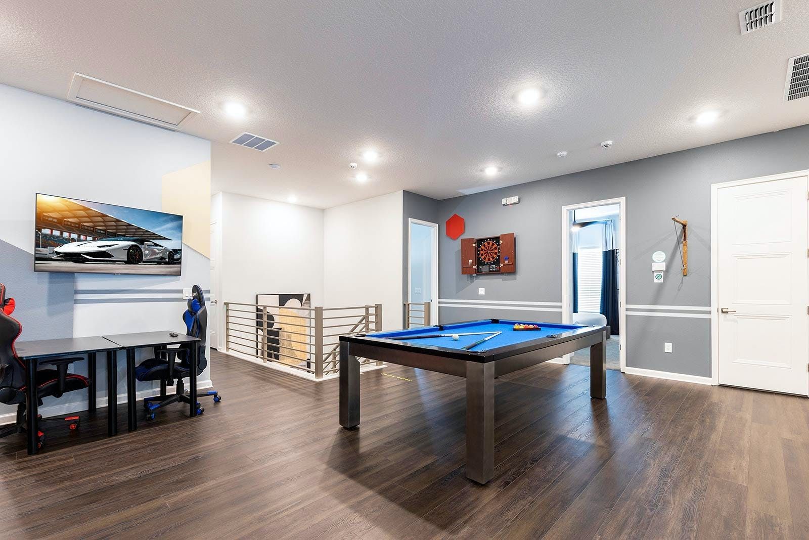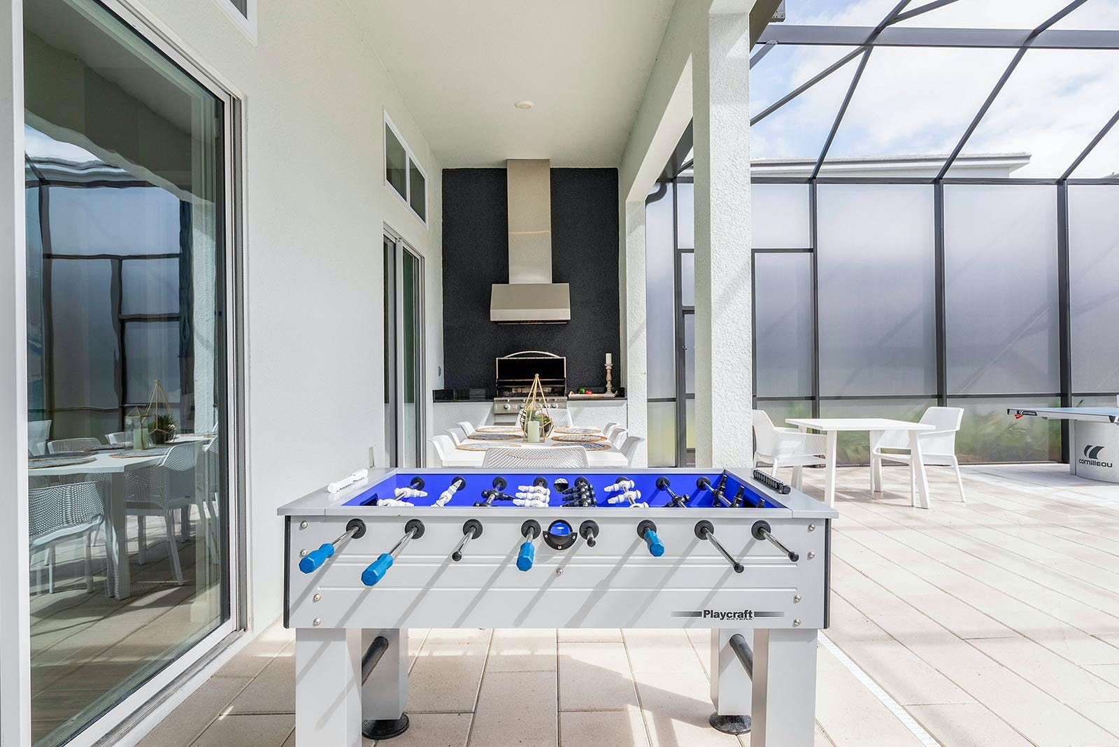 This luxurious 7,200-square-foot mansion features sleek modern décor and a fully equipped chef's kitchen with stone countertops, stainless steel appliances, custom deep-blue cabinetry, and oak floors. The mansion also boasts a built-in bowling alley, a VR room with three epic machines, a private movie theater with 15 reclining seats, and a game loft with pool table and other games. Outdoors, guests can enjoy the fabulous pool and spa, outdoor kitchen, ping-pong, foosball, pool basketball, and mini pool slide. The mansion has nine beautiful bedrooms with en suite baths including two master king-size bedrooms on the first floor and six more gorgeously appointed bedrooms on the second floor. Two themed kids' bedrooms are designed as playrooms filled with wonder and special surprises. Guests will have access to all of the resort's amenities: tennis courts, lazy river, fitness center, etc., as well as nearby attractions like Disney Parks and World-Class Shopping & Dining.