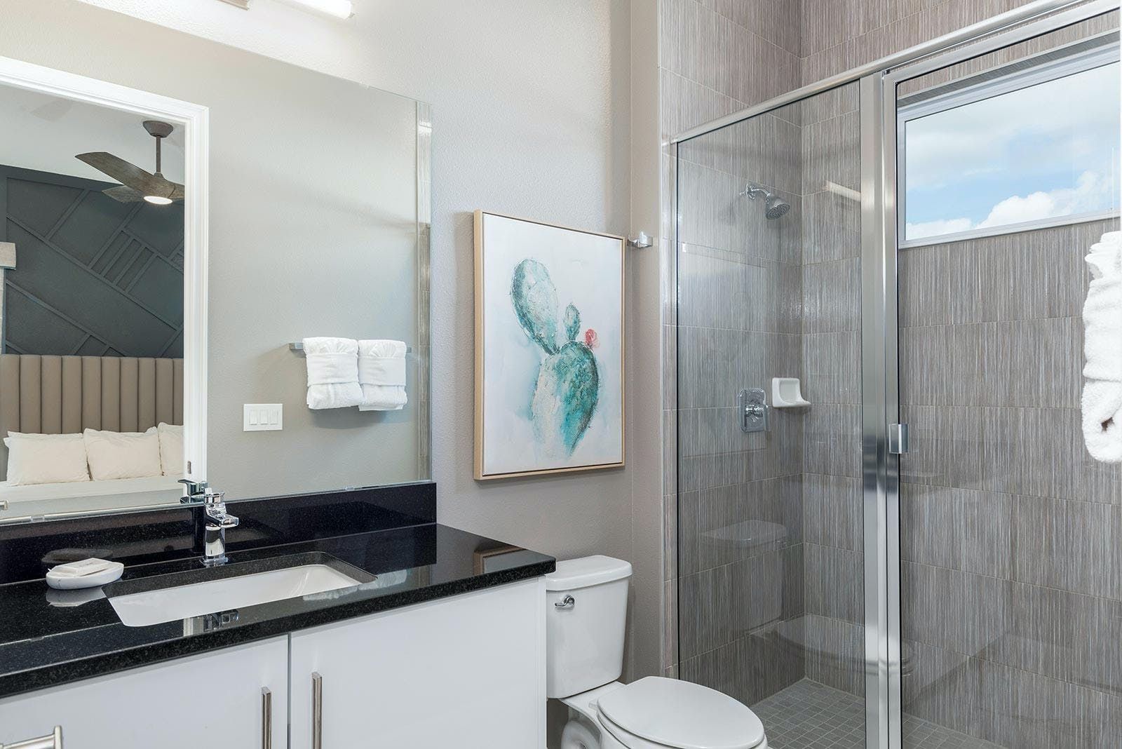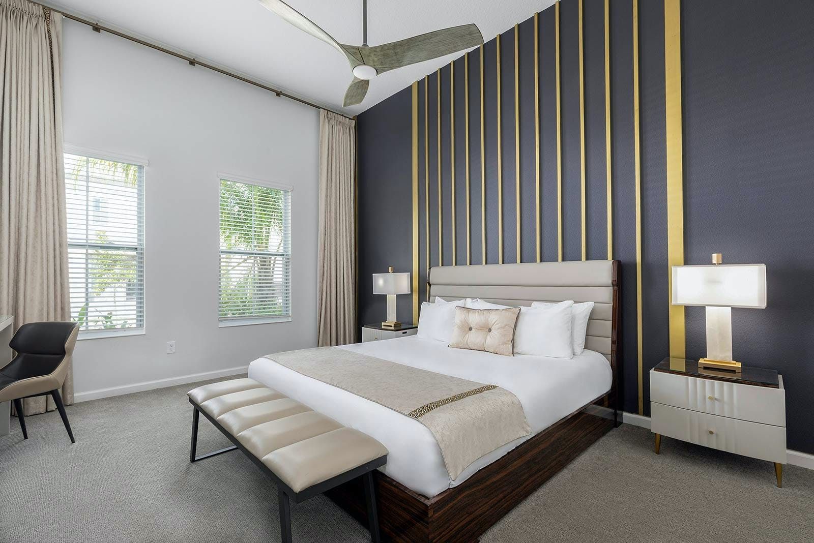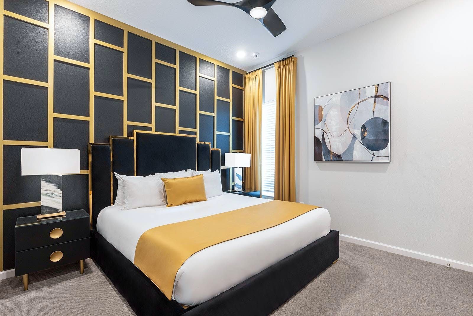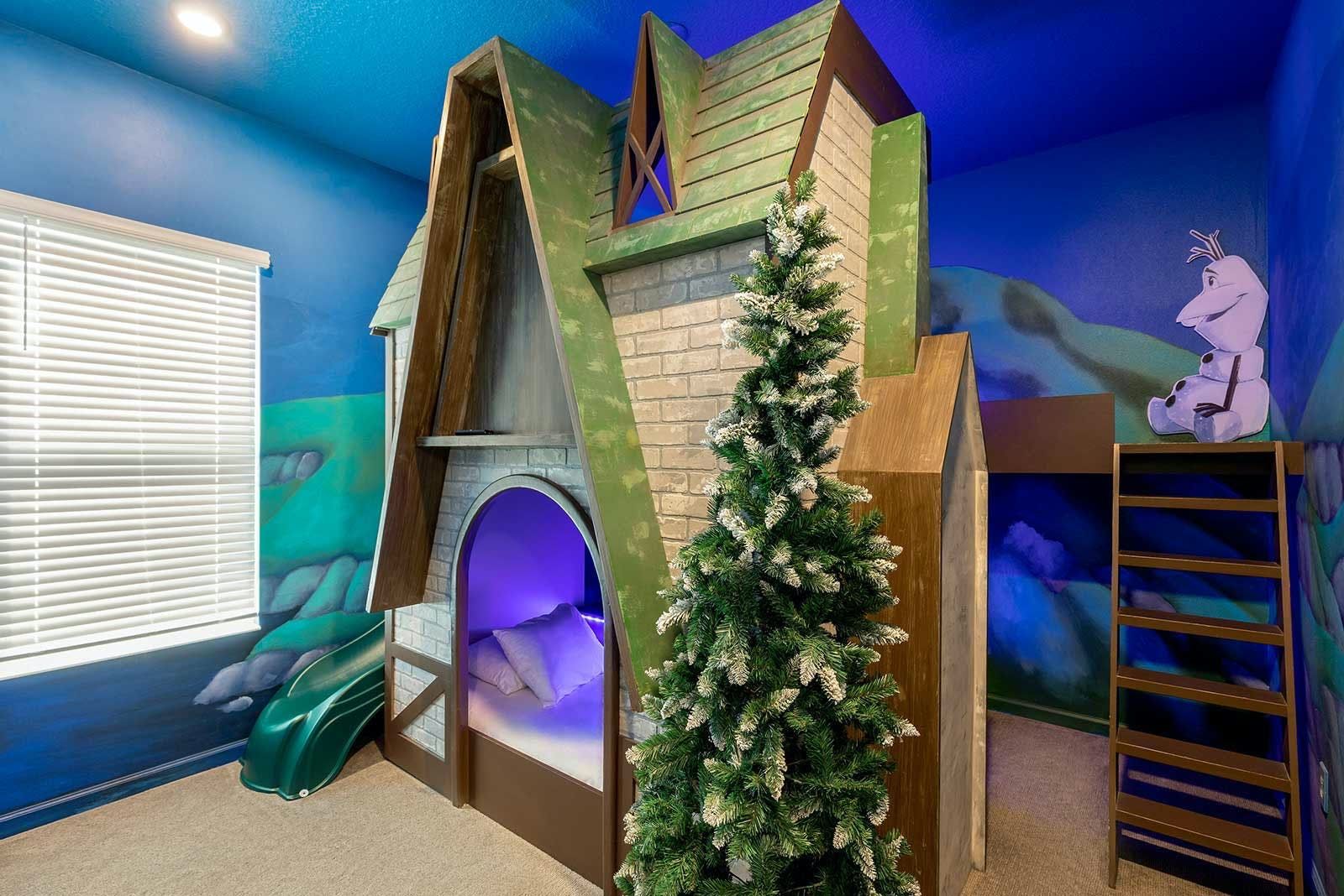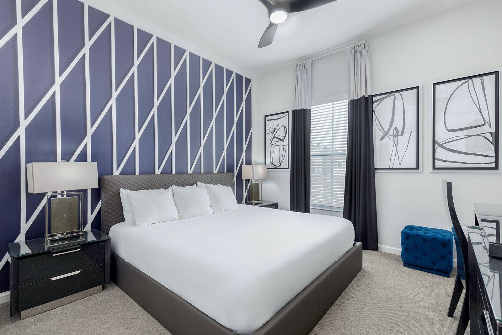 This luxurious 7,200-square-foot mansion features sleek modern décor and a fully equipped chef's kitchen with stone countertops, stainless steel appliances, custom deep-blue cabinetry, and oak floors. The mansion also boasts a built-in bowling alley, a VR room with three epic machines, a private movie theater with 15 reclining seats, and a game loft with pool table and other games. Outdoors, guests can enjoy the fabulous pool and spa, outdoor kitchen, ping-pong, foosball, pool basketball, and mini pool slide. The mansion has nine beautiful bedrooms with en suite baths including two master king-size bedrooms on the first floor and six more gorgeously appointed bedrooms on the second floor. Two themed kids' bedrooms are designed as playrooms filled with wonder and special surprises. Guests will have access to all of the resort's amenities: tennis courts, lazy river, fitness center, etc., as well as nearby attractions like Disney Parks and World-Class Shopping & Dining.