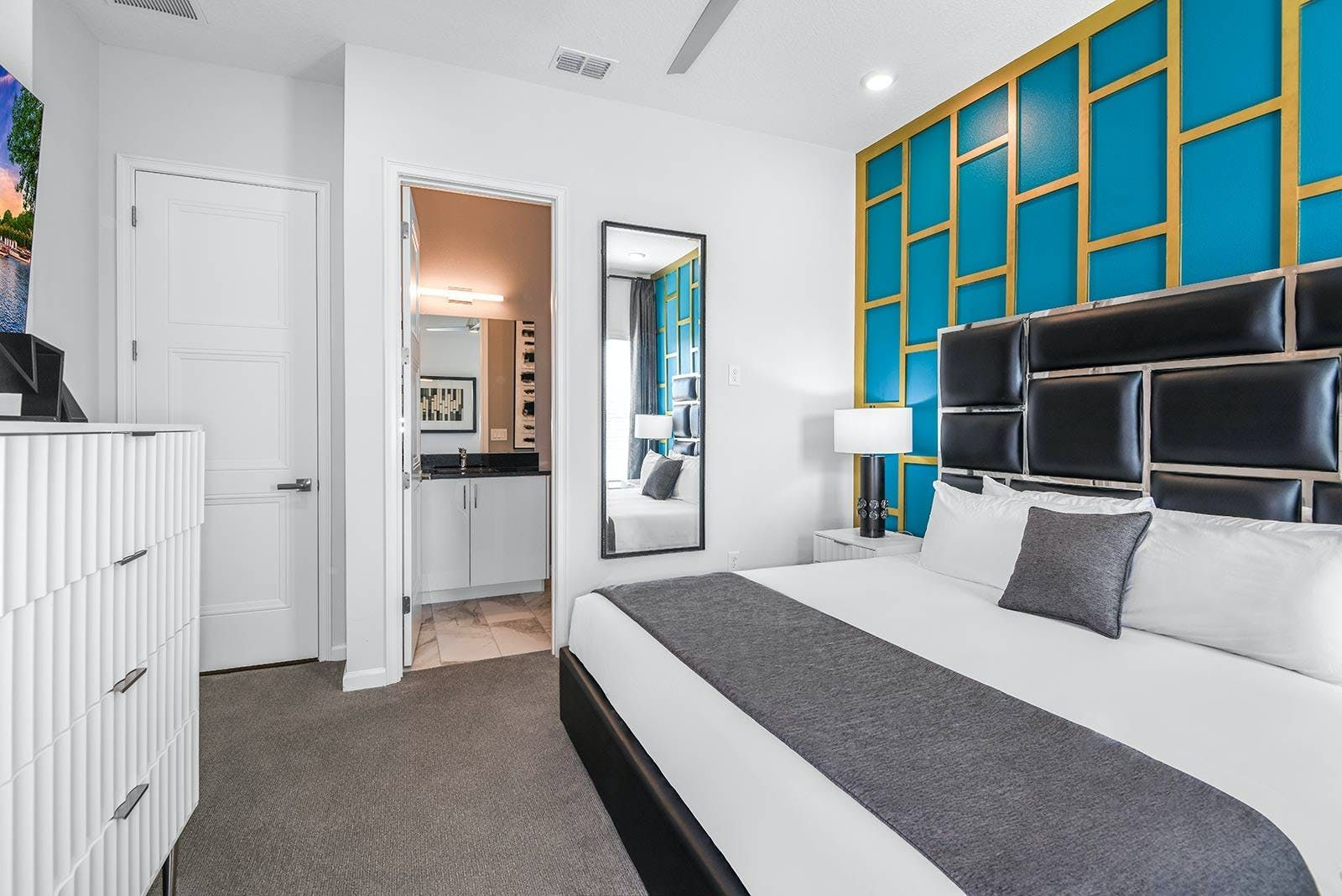 This expansive home is all about family fun. From the games room with a bowling alley to the treehouse playroom and movie theatre, every detail has been considered to bring you a magical stay. There’s also a private pool and a spa for long relaxing soaks, while the fitness room is a welcome addition for exercise enthusiasts. Plus, you’ll have access to the resort amenities throughout your stay – including the heated pool, tennis courts and restaurants. And when it comes to adventures further afield, it’s just a short drive to the Disney Parks and Universal Studios.