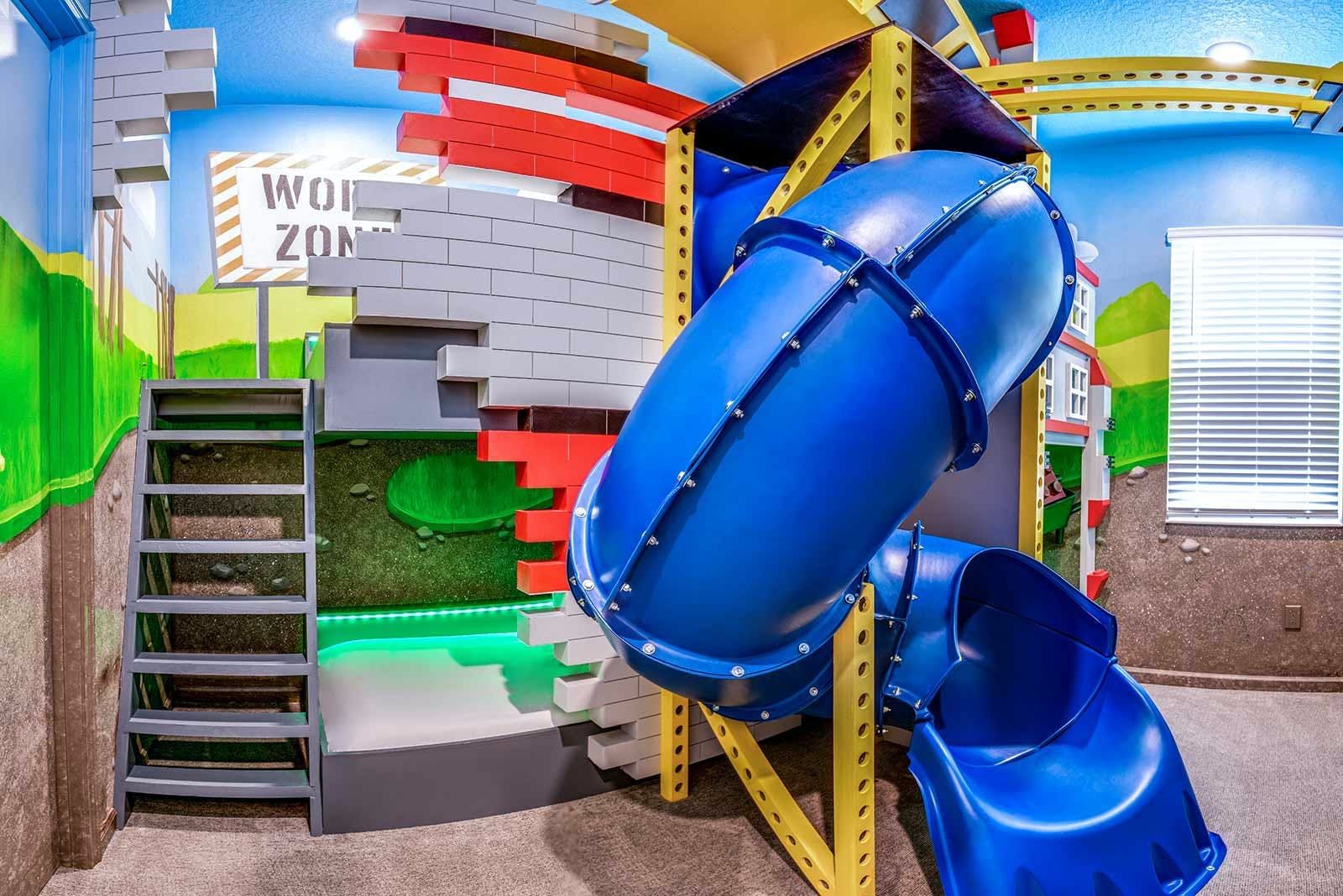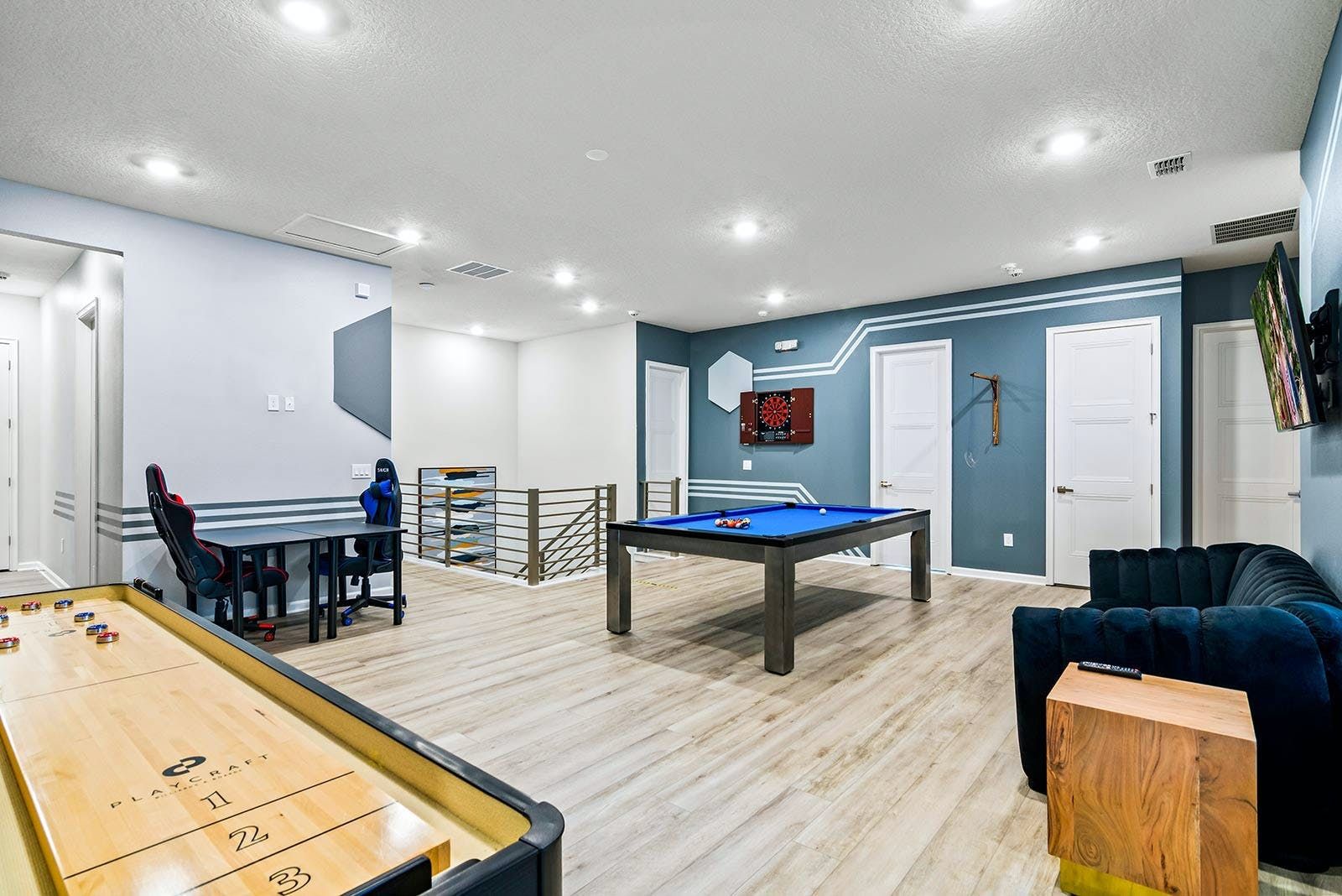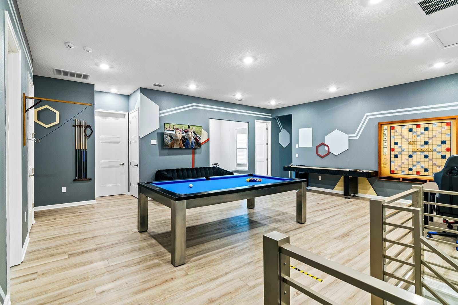 Step inside this home and you’ll be welcomed by a private pool, a spa and all the entertainment options you could need for a fun-filled stay. From ping pong and basketball to arcade games and a private movie theatre, this home is all about switching off and enjoying quality time together. There’s also a custom speakeasy with a wooden bar for evening cocktails or a nightcap. Further afield, the resort has a swimming pool, a fitness centre and restaurant. Plus, it’s just a short drive to Universal Studios and Disney.