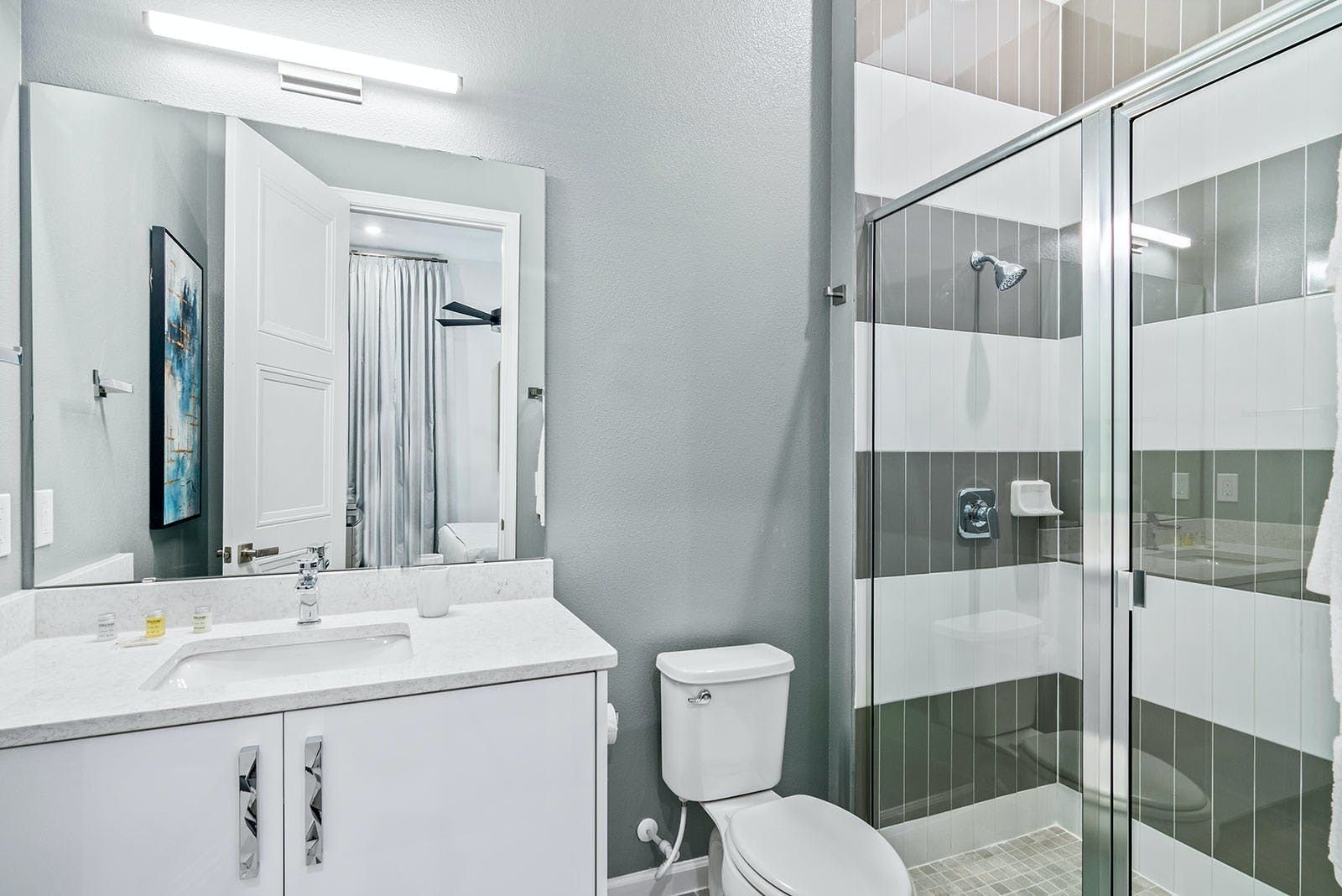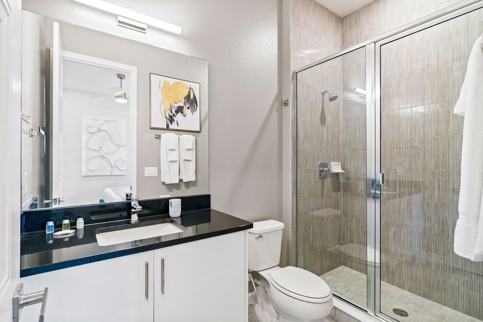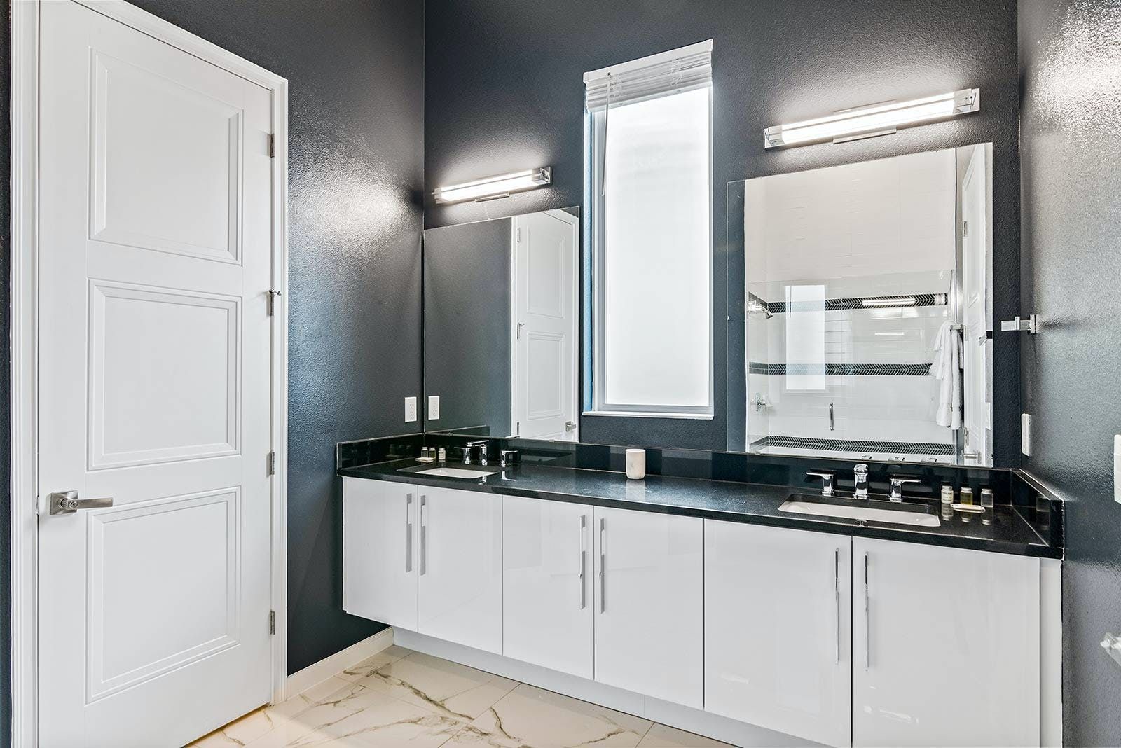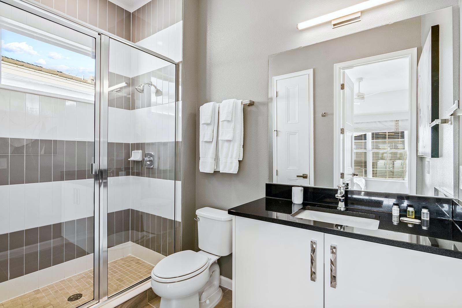 Step inside this home and you’ll be welcomed by a private pool, a spa and all the entertainment options you could need for a fun-filled stay. From ping pong and basketball to arcade games and a private movie theatre, this home is all about switching off and enjoying quality time together. There’s also a custom speakeasy with a wooden bar for evening cocktails or a nightcap. Further afield, the resort has a swimming pool, a fitness centre and restaurant. Plus, it’s just a short drive to Universal Studios and Disney.