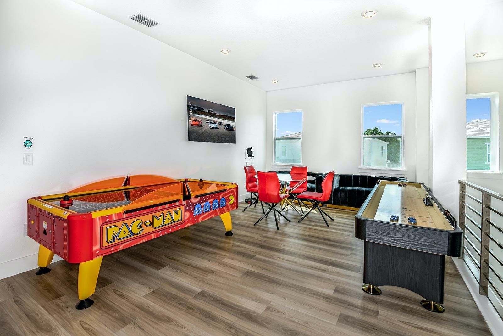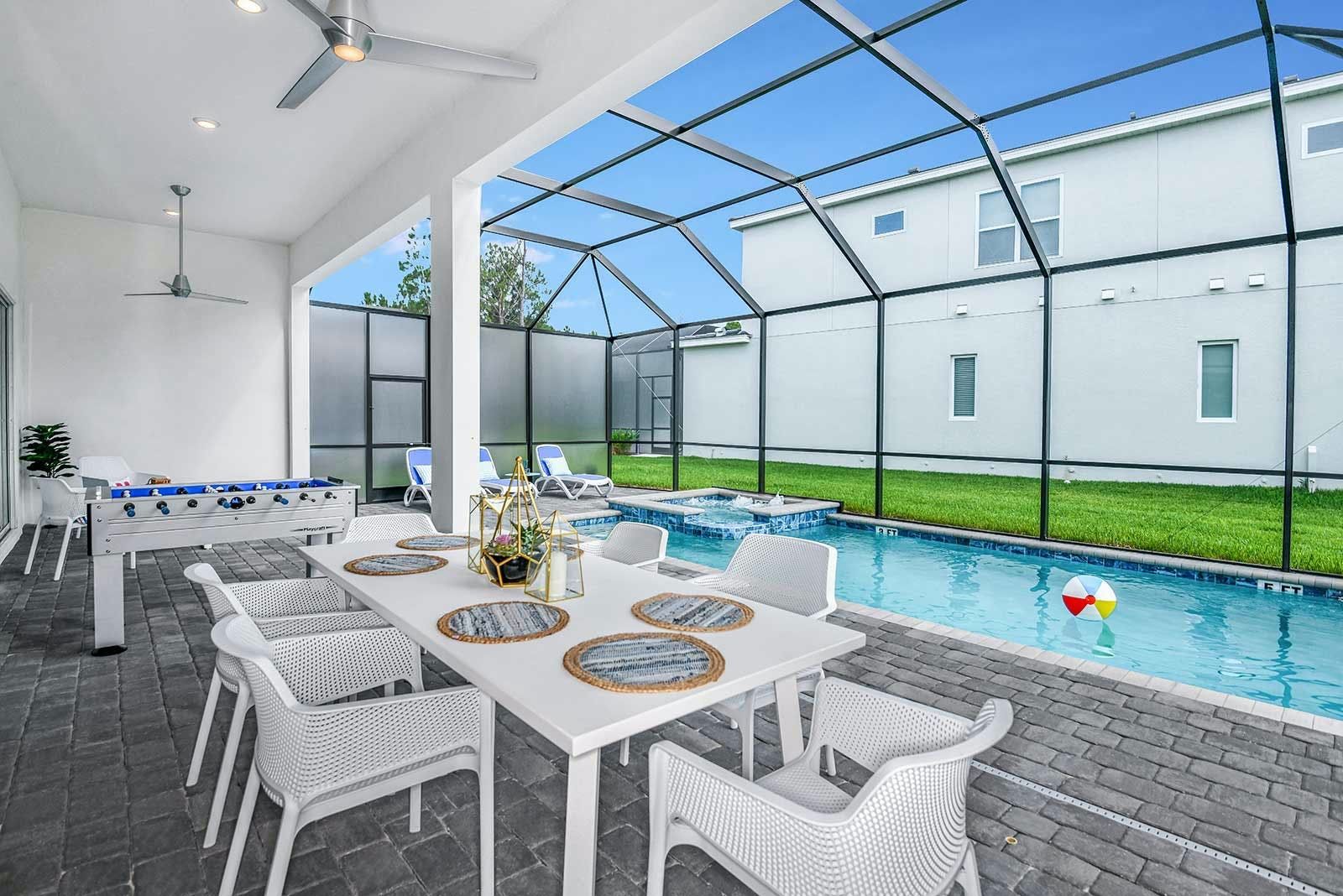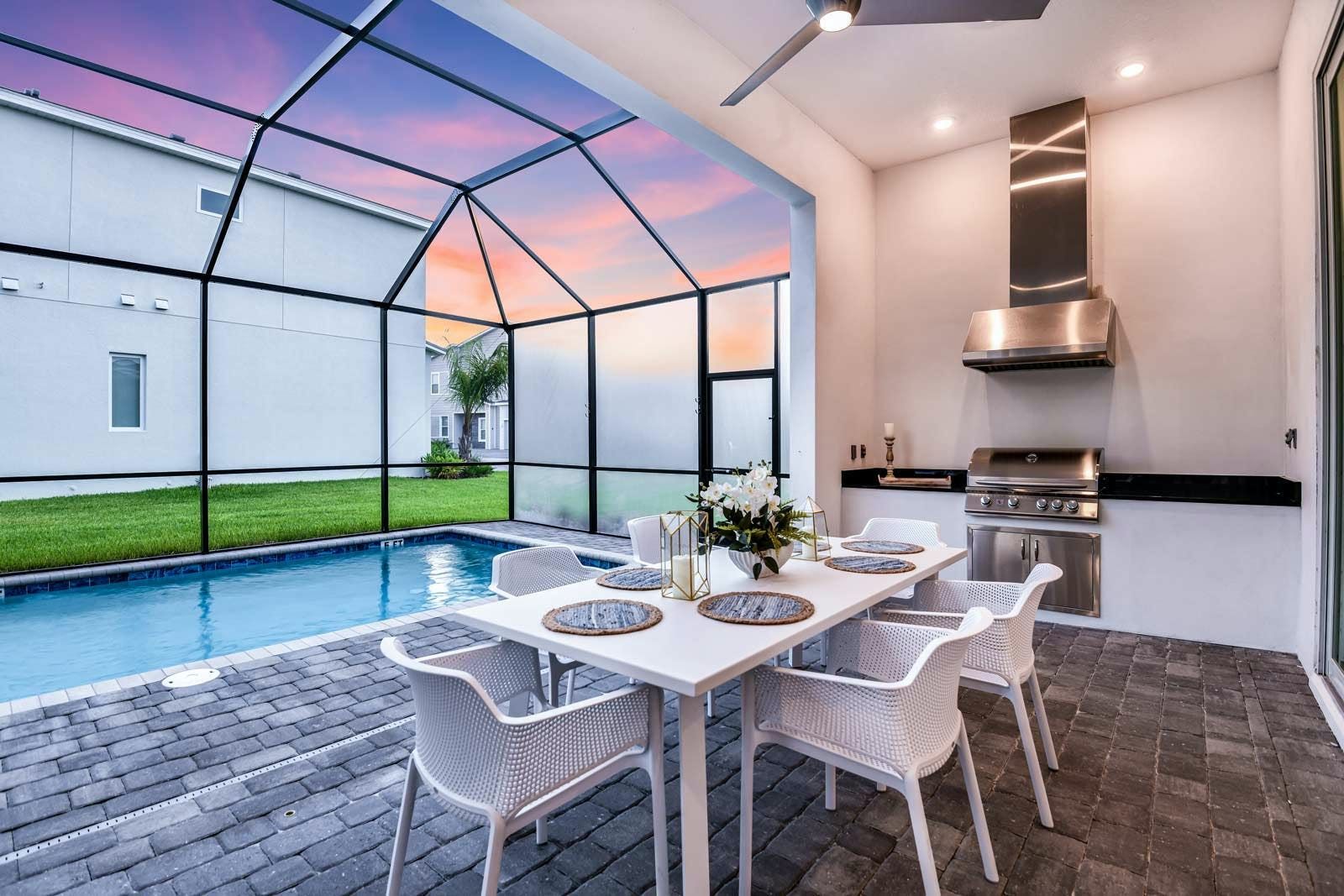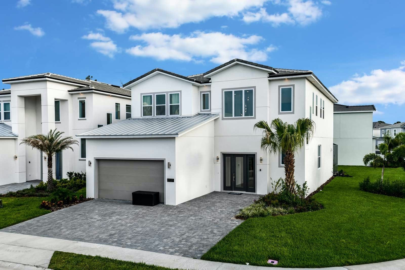 This home is located in a brand new resort area. This luxury home boasts 7 bedrooms, 7.5 bathrooms, and exclusive amenities such as a private entrance, scenic views, and a covered playground. The grand foyer leads to a spacious great room with polished yet inviting Transitional-style design featuring chic and comfy furnishings perfect for lounging and socializing as well as a pool table for games. The fully equipped chef's kitchen with modern stainless appliances, crisp white cabinetry, and sleek black accents opens up to the elegant dining area. The outdoor area has a sparkling private swimming pool with spillover spa, foosball table on the patio, covered outdoor kitchen with built-in BBQ and dining area. The villa also includes a game loft/office space with shuffleboard, air hockey, and desk-and-chair office setup, as well as a private cinema complete with plush seating and surround sound. Five additional bedrooms cater to grownup tastes with high-end furnishings and en suite bathrooms while the ultimate "ta-da" moment will come from the themed bedroom that sleeps up to six lucky kids in an intergalactic forest home featuring wall art of grasslands and savannahs, cozy treehouse dwellings (aka bunk beds), walk-in closet that doubles as a secret game room! The villa is located just minutes away from Orlando's famous attractions and dining destinations such as Disney Parks, Universal Parks, SeaWorld, World-Class Shopping & Dining.