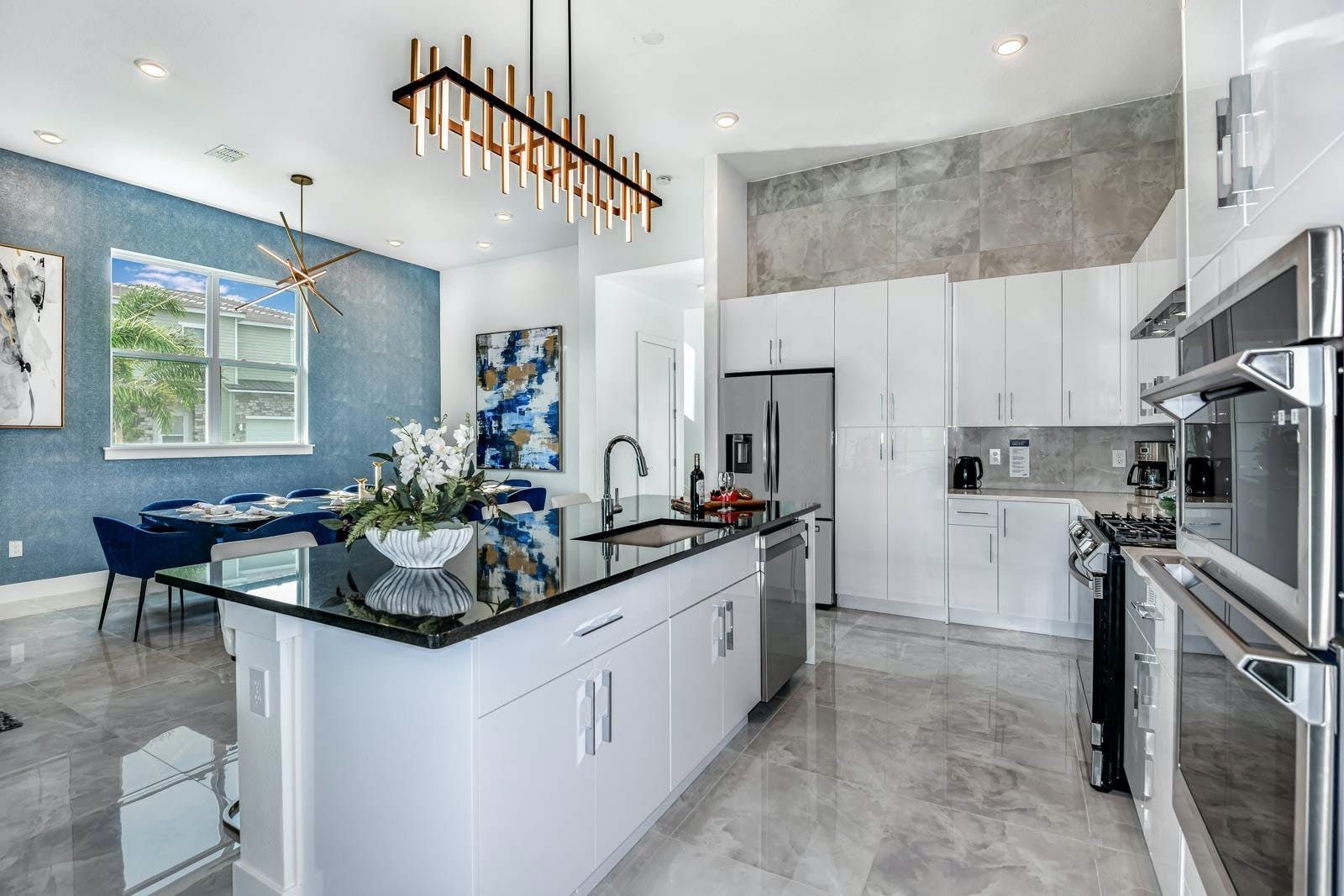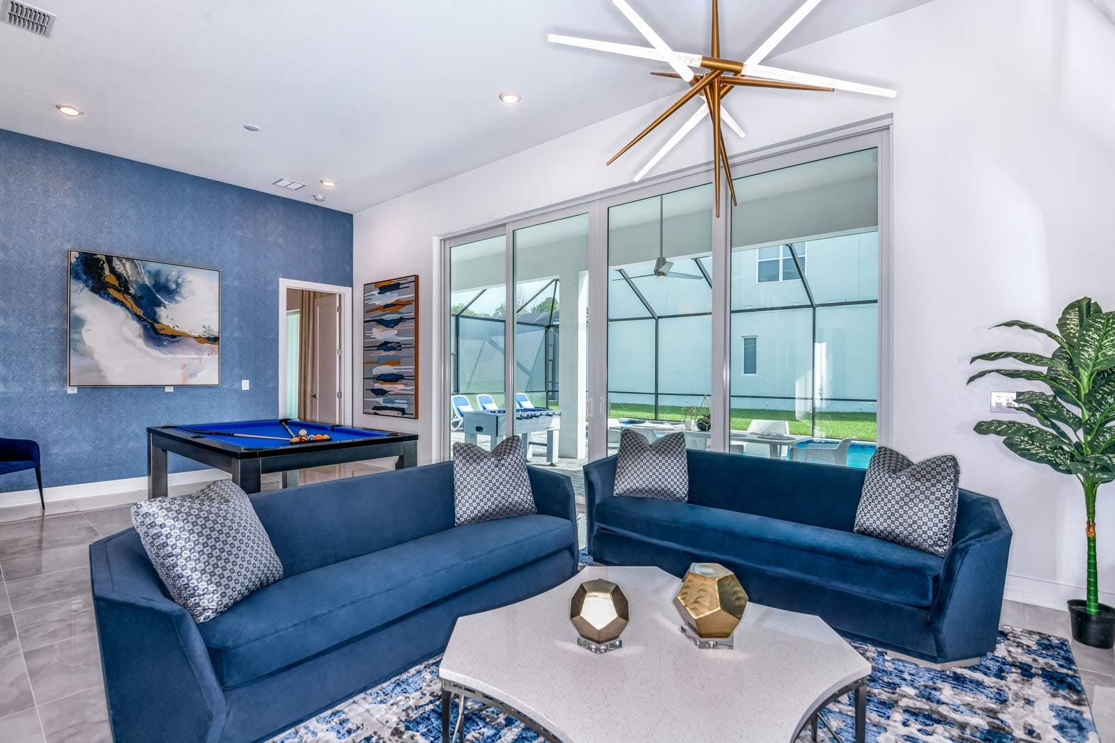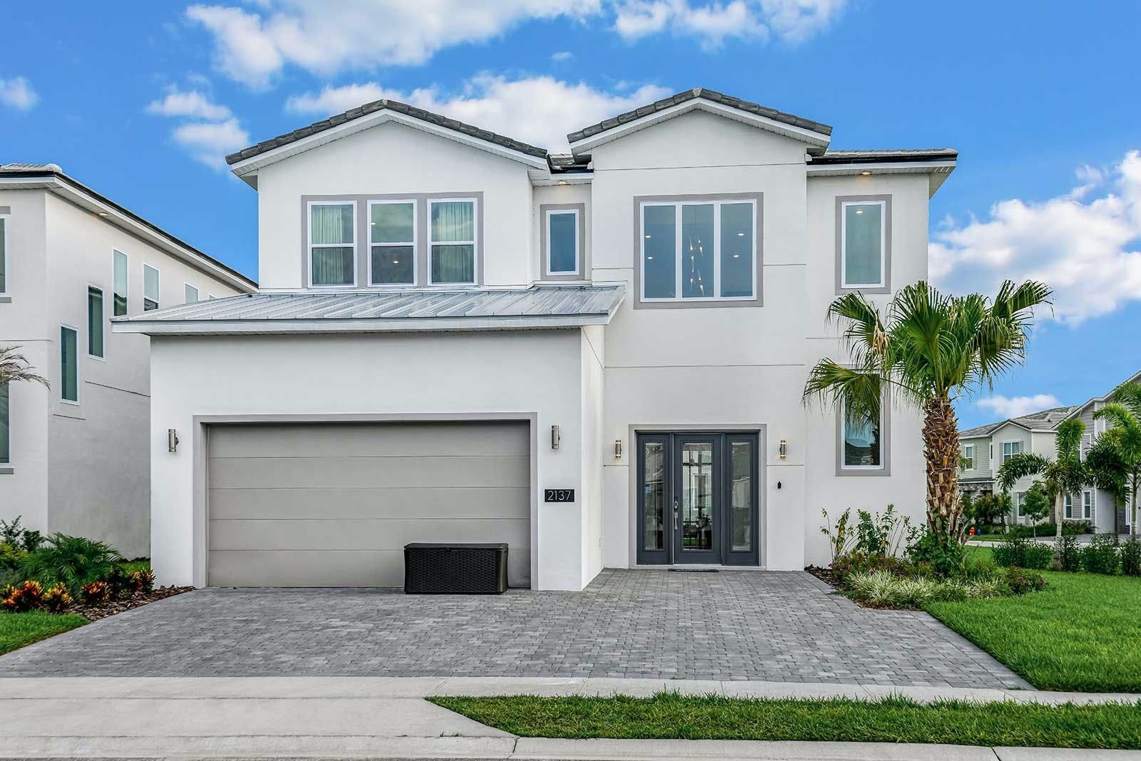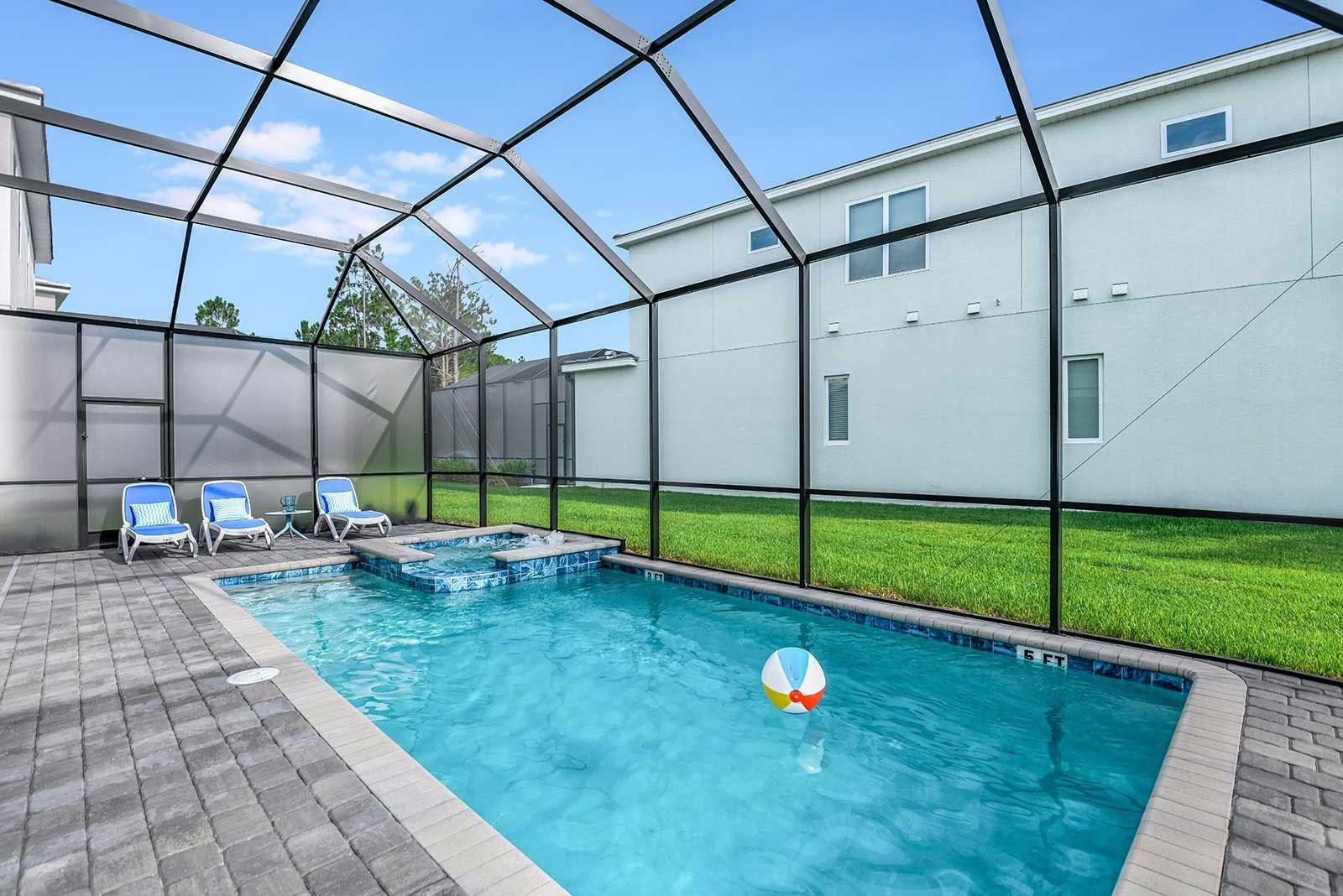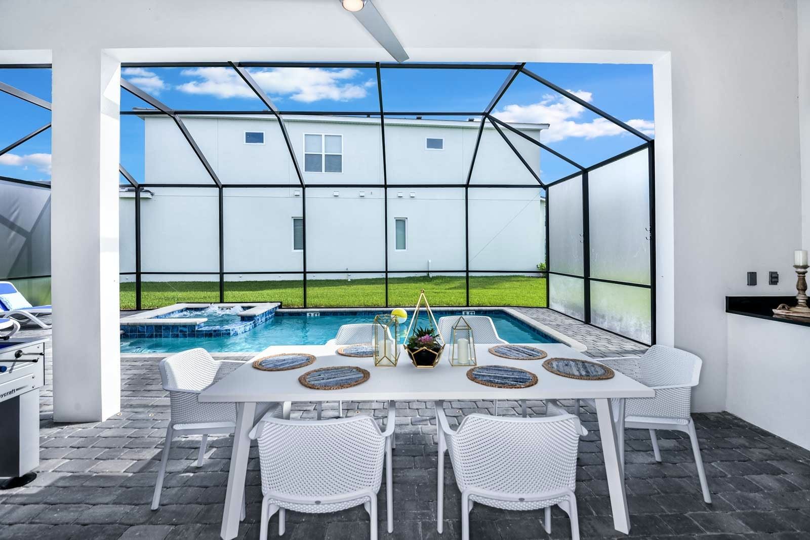 This home is located in a brand new resort area. This luxury home boasts 7 bedrooms, 7.5 bathrooms, and exclusive amenities such as a private entrance, scenic views, and a covered playground. The grand foyer leads to a spacious great room with polished yet inviting Transitional-style design featuring chic and comfy furnishings perfect for lounging and socializing as well as a pool table for games. The fully equipped chef's kitchen with modern stainless appliances, crisp white cabinetry, and sleek black accents opens up to the elegant dining area. The outdoor area has a sparkling private swimming pool with spillover spa, foosball table on the patio, covered outdoor kitchen with built-in BBQ and dining area. The villa also includes a game loft/office space with shuffleboard, air hockey, and desk-and-chair office setup, as well as a private cinema complete with plush seating and surround sound. Five additional bedrooms cater to grownup tastes with high-end furnishings and en suite bathrooms while the ultimate "ta-da" moment will come from the themed bedroom that sleeps up to six lucky kids in an intergalactic forest home featuring wall art of grasslands and savannahs, cozy treehouse dwellings (aka bunk beds), walk-in closet that doubles as a secret game room! The villa is located just minutes away from Orlando's famous attractions and dining destinations such as Disney Parks, Universal Parks, SeaWorld, World-Class Shopping & Dining.