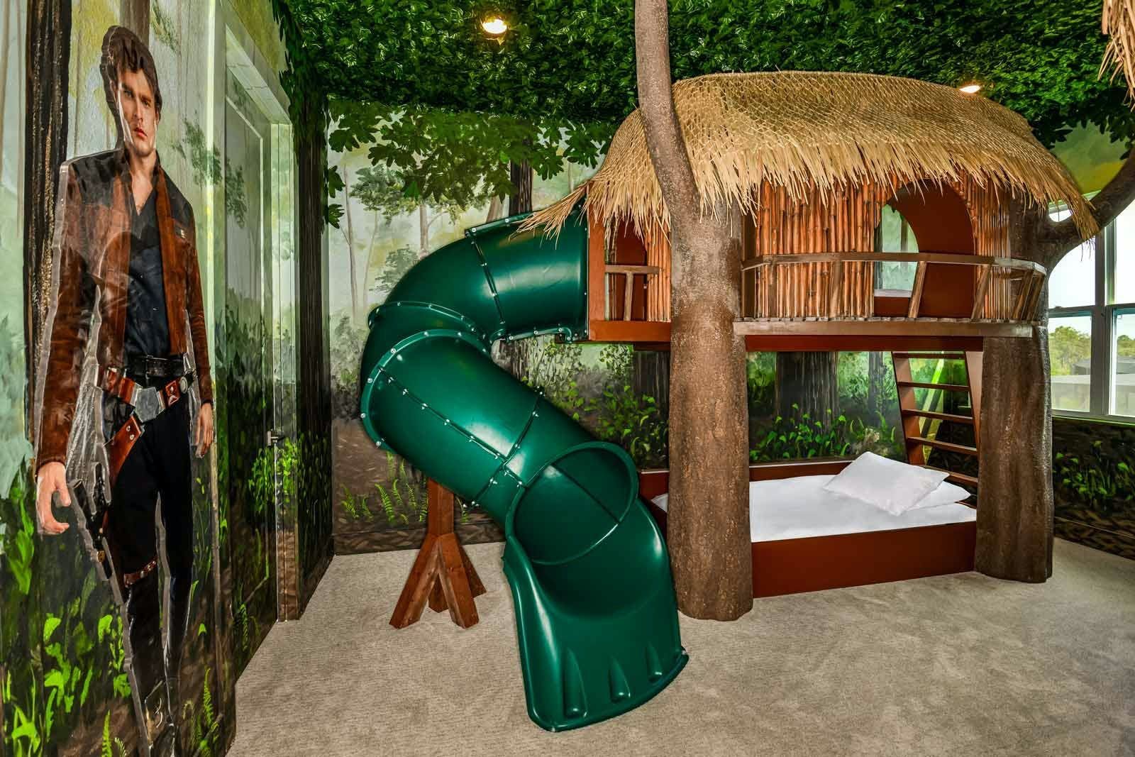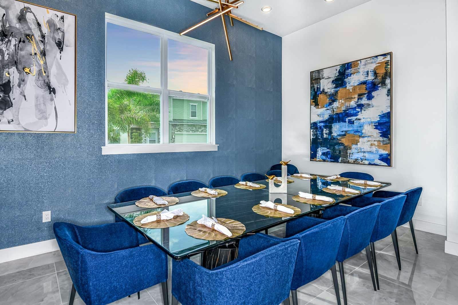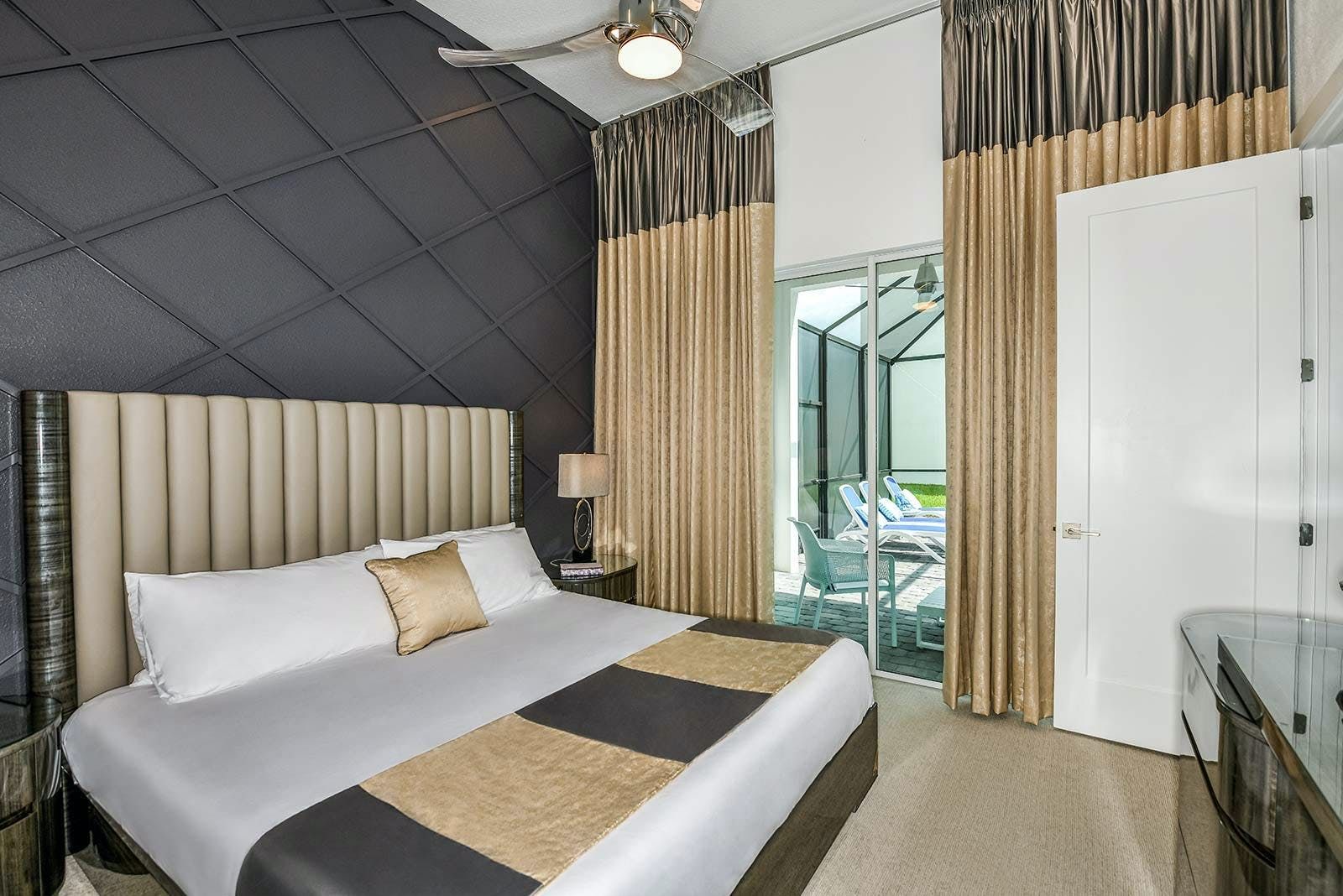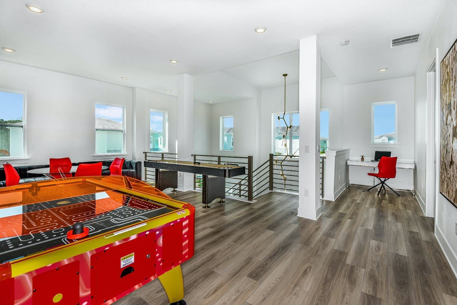 This home is located in a brand new resort area. This luxury home boasts 7 bedrooms, 7.5 bathrooms, and exclusive amenities such as a private entrance, scenic views, and a covered playground. The grand foyer leads to a spacious great room with polished yet inviting Transitional-style design featuring chic and comfy furnishings perfect for lounging and socializing as well as a pool table for games. The fully equipped chef's kitchen with modern stainless appliances, crisp white cabinetry, and sleek black accents opens up to the elegant dining area. The outdoor area has a sparkling private swimming pool with spillover spa, foosball table on the patio, covered outdoor kitchen with built-in BBQ and dining area. The villa also includes a game loft/office space with shuffleboard, air hockey, and desk-and-chair office setup, as well as a private cinema complete with plush seating and surround sound. Five additional bedrooms cater to grownup tastes with high-end furnishings and en suite bathrooms while the ultimate "ta-da" moment will come from the themed bedroom that sleeps up to six lucky kids in an intergalactic forest home featuring wall art of grasslands and savannahs, cozy treehouse dwellings (aka bunk beds), walk-in closet that doubles as a secret game room! The villa is located just minutes away from Orlando's famous attractions and dining destinations such as Disney Parks, Universal Parks, SeaWorld, World-Class Shopping & Dining.