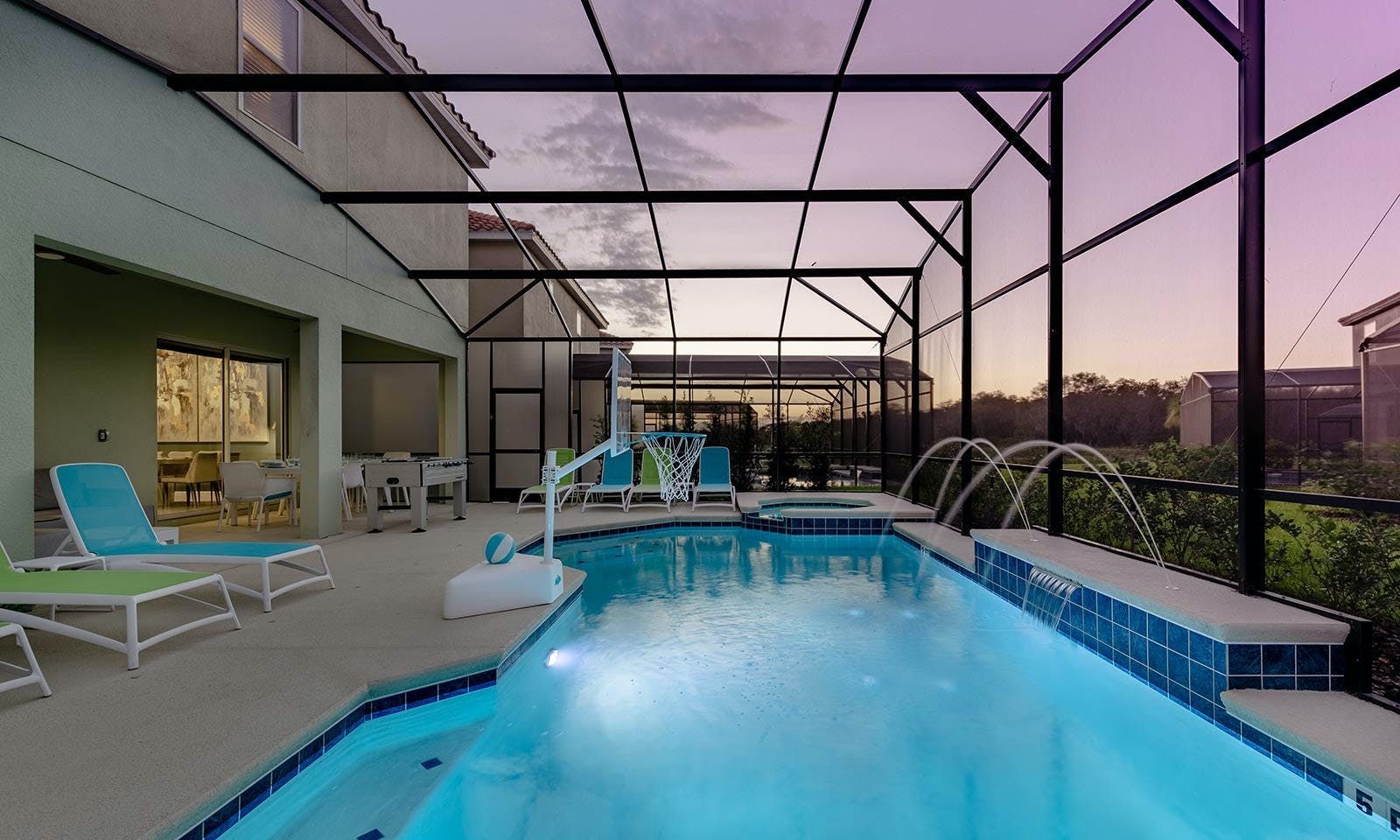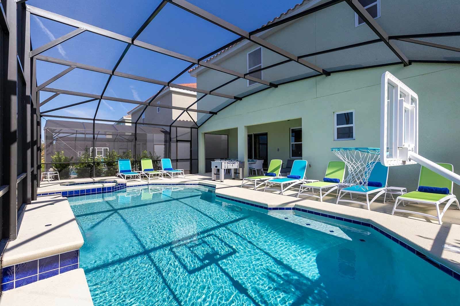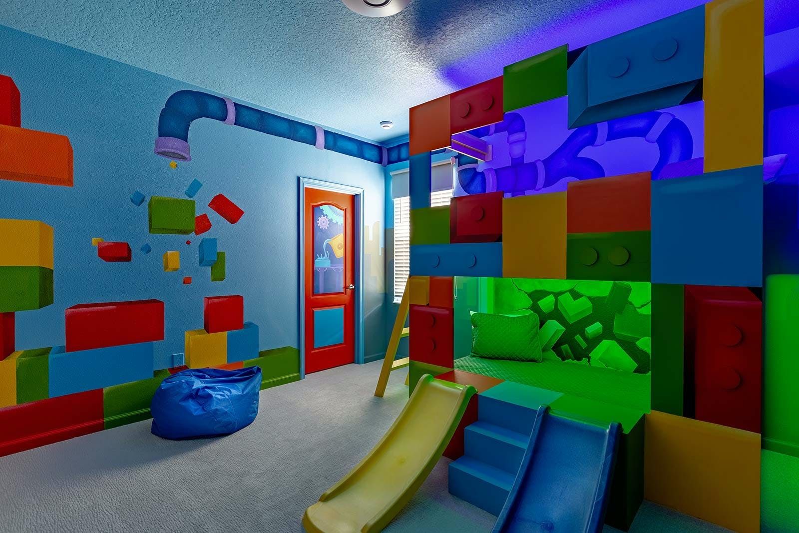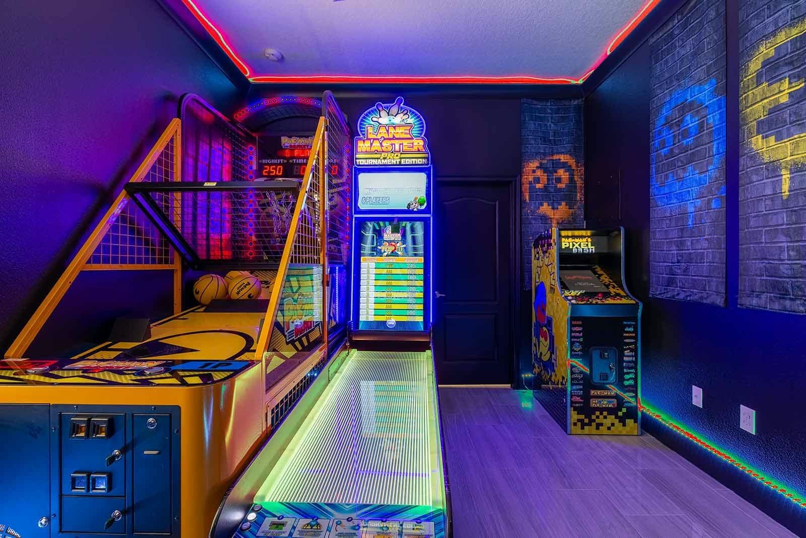 This enchanting a resort villa in Orlando features an array of amenities to keep the entire family entertained. Children will love the themed bedrooms—the Lego room with its colorful wall art and over-the-top bunk beds, and the Galactica room with outer space décor. The arcade is fully decked out with games like Pac-man Basketball and Batman, while the upstairs loft offers more options like air hockey and pool. A private home theater boasts 10 leather recliners and a giant projector. Outside, guests can enjoy a screened-in pool and spillover spa surrounded by outdoor games, loungers, and a 12-seat patio table for al fresco dining. The villa also features high-end dining tables, a sleek kitchen with a breakfast bar, and plush living room seating. The upscale king and full-sized bedrooms all feature private en-suite bathrooms with deluxe mattresses and hotel-quality linens. a resort community offers additional amenities such as an oversized pool, lazy river, tennis courts, fitness center, and more. Just miles from Disney and other popular attractions, this villa promises convenience, comfort, and memories that will last a lifetime!