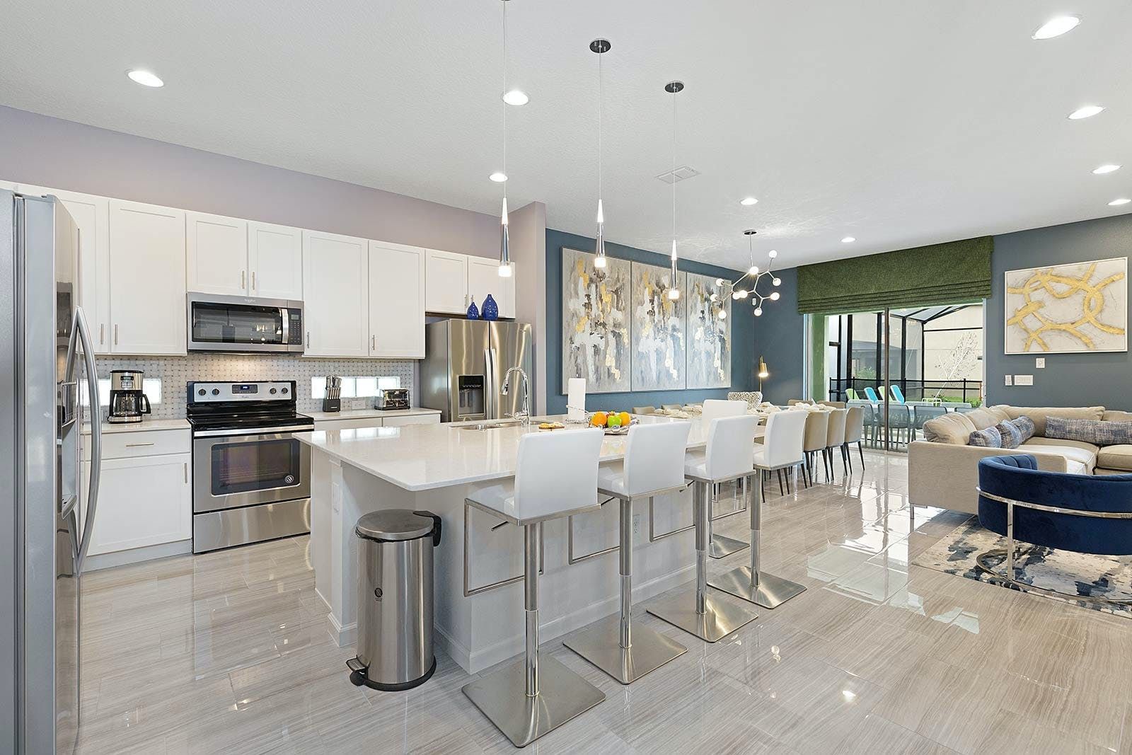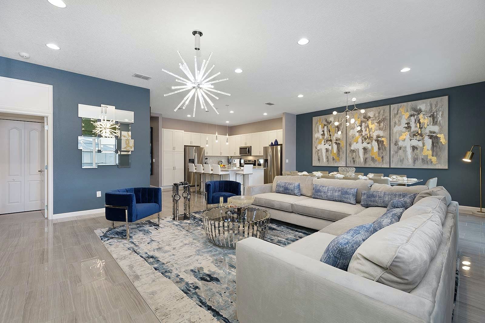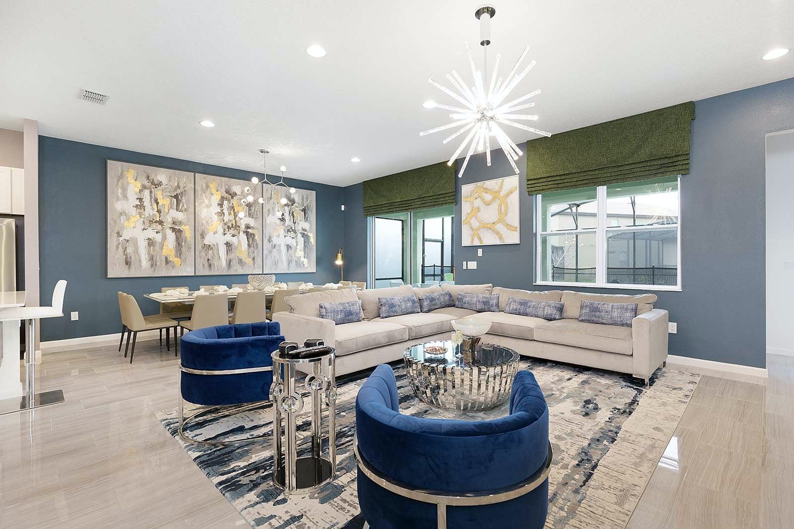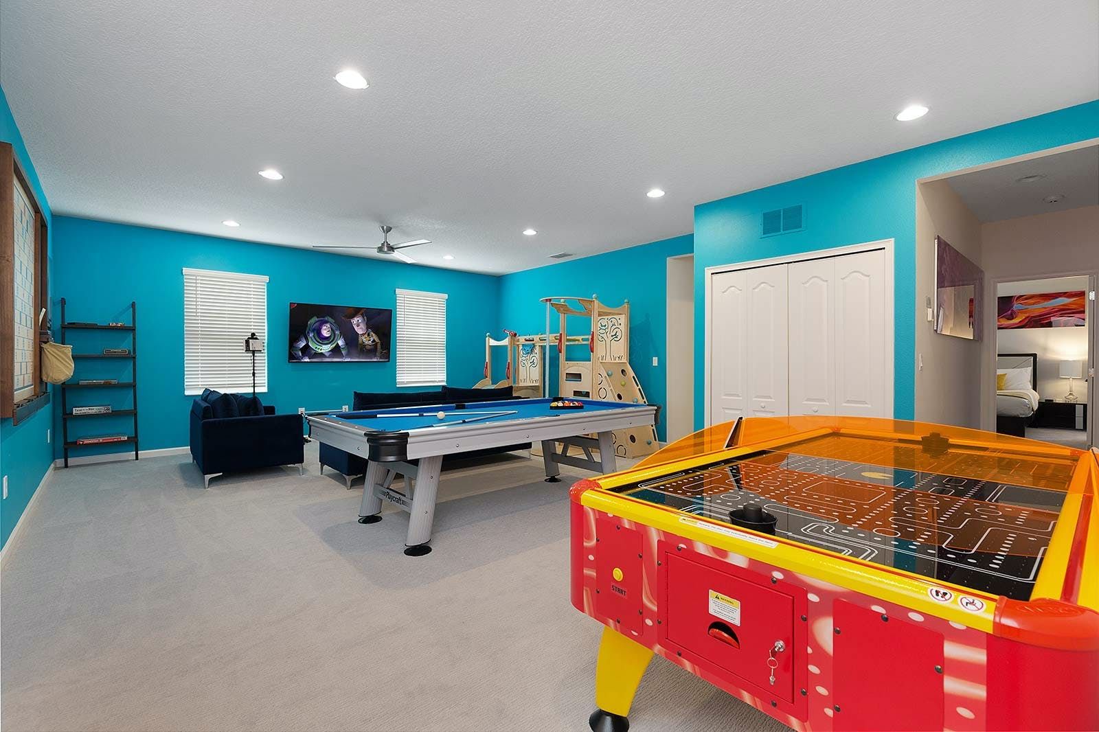 This enchanting a resort villa in Orlando features an array of amenities to keep the entire family entertained. Children will love the themed bedrooms—the Lego room with its colorful wall art and over-the-top bunk beds, and the Galactica room with outer space décor. The arcade is fully decked out with games like Pac-man Basketball and Batman, while the upstairs loft offers more options like air hockey and pool. A private home theater boasts 10 leather recliners and a giant projector. Outside, guests can enjoy a screened-in pool and spillover spa surrounded by outdoor games, loungers, and a 12-seat patio table for al fresco dining. The villa also features high-end dining tables, a sleek kitchen with a breakfast bar, and plush living room seating. The upscale king and full-sized bedrooms all feature private en-suite bathrooms with deluxe mattresses and hotel-quality linens. a resort community offers additional amenities such as an oversized pool, lazy river, tennis courts, fitness center, and more. Just miles from Disney and other popular attractions, this villa promises convenience, comfort, and memories that will last a lifetime!