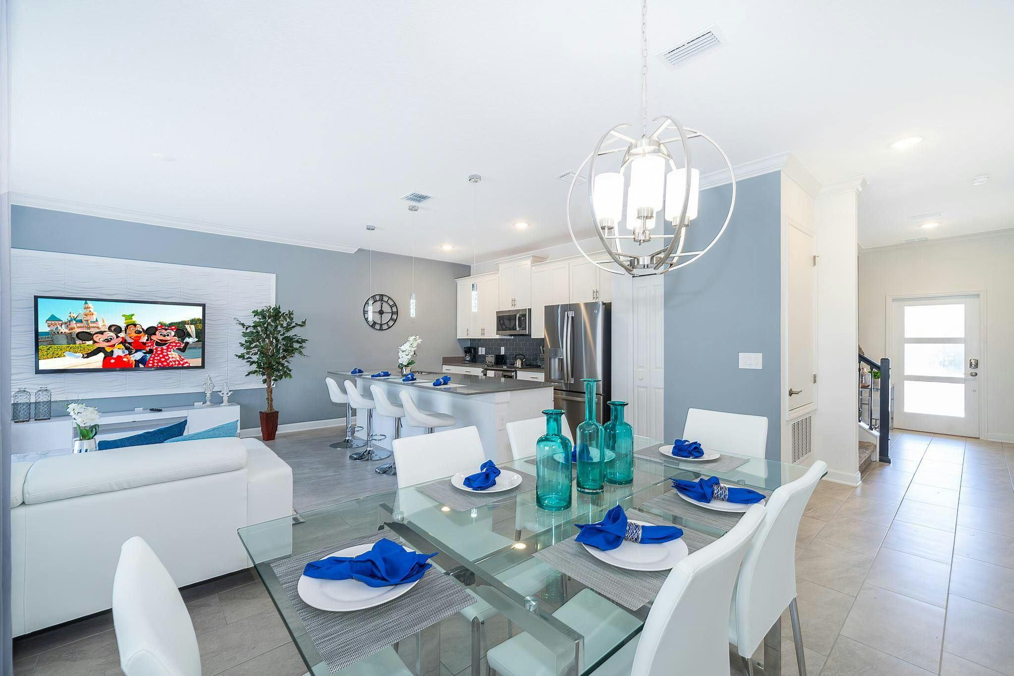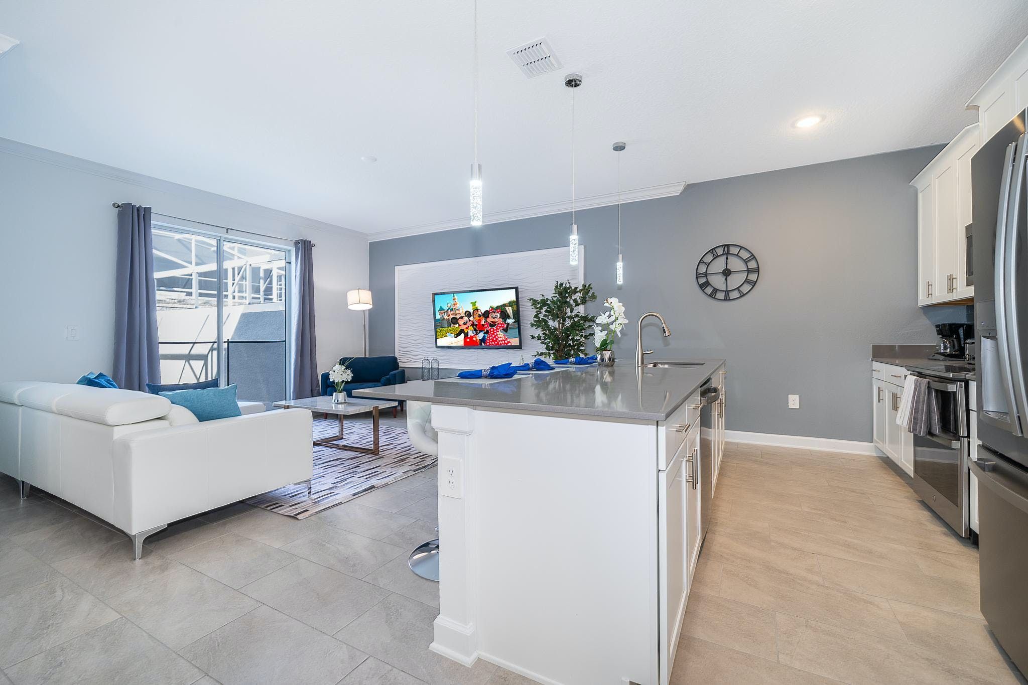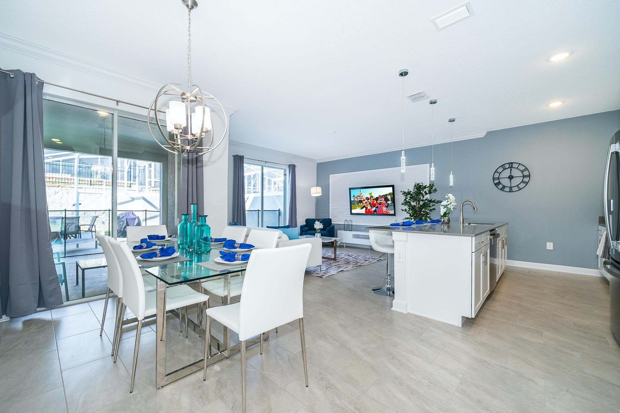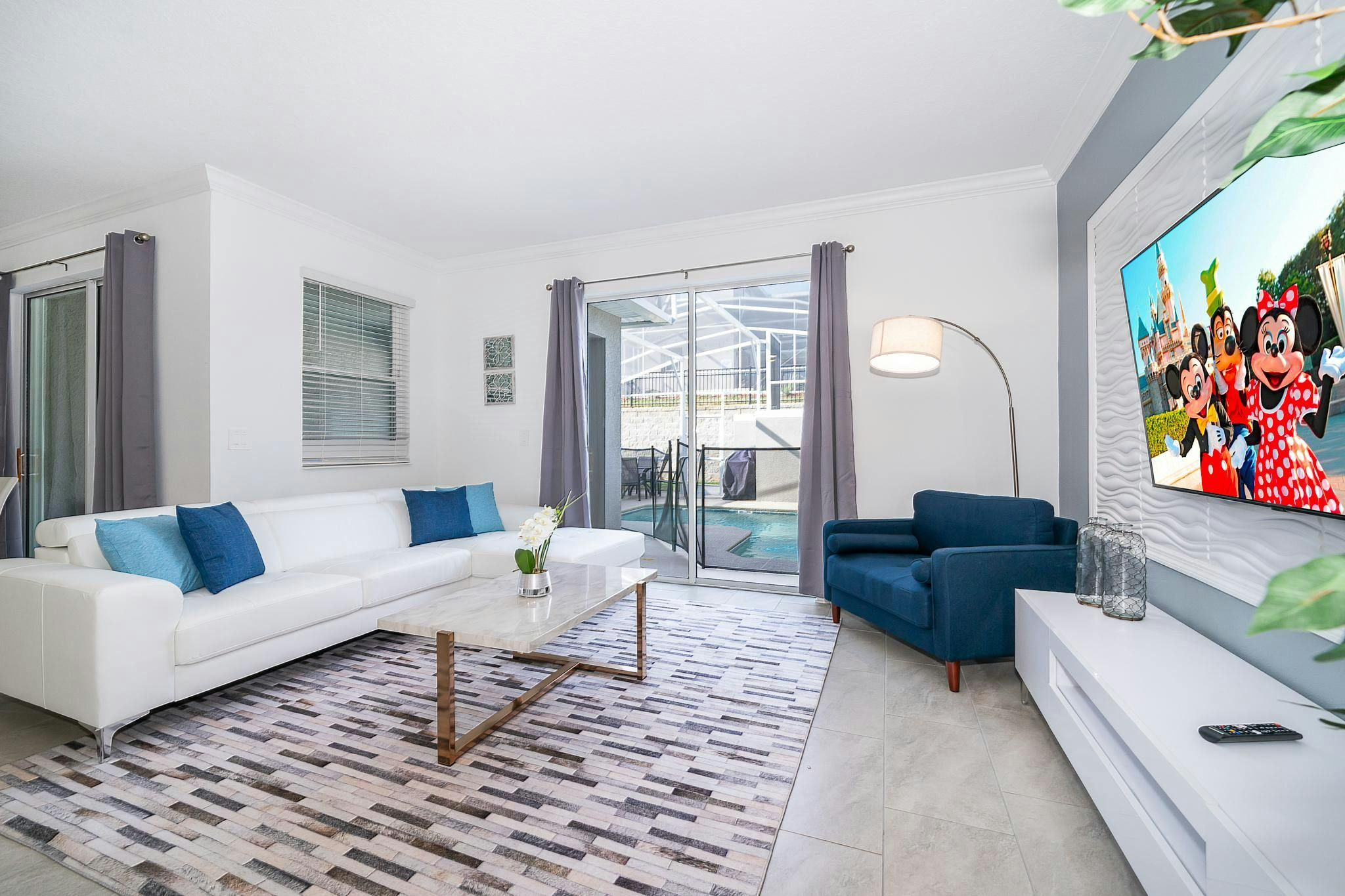 This stunning 4-bedroom, 3-bathroom vacation rental with a pool is located in the new phase of Champions Gate Resort. The bedrooms include a downstairs king bedroom and an upstairs master suite, along with two bedrooms featuring full and twin beds. The community boasts multiple golf courses and tennis courts, as well as a clubhouse resort with incredible amenities such as two pools (including a lazy river), a restaurant, gym, business center, game room, cinema, and more.