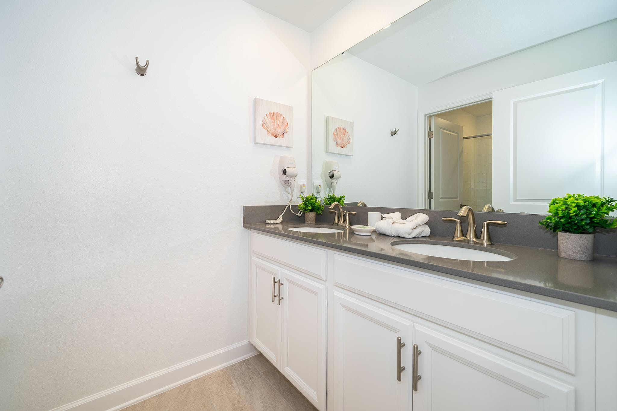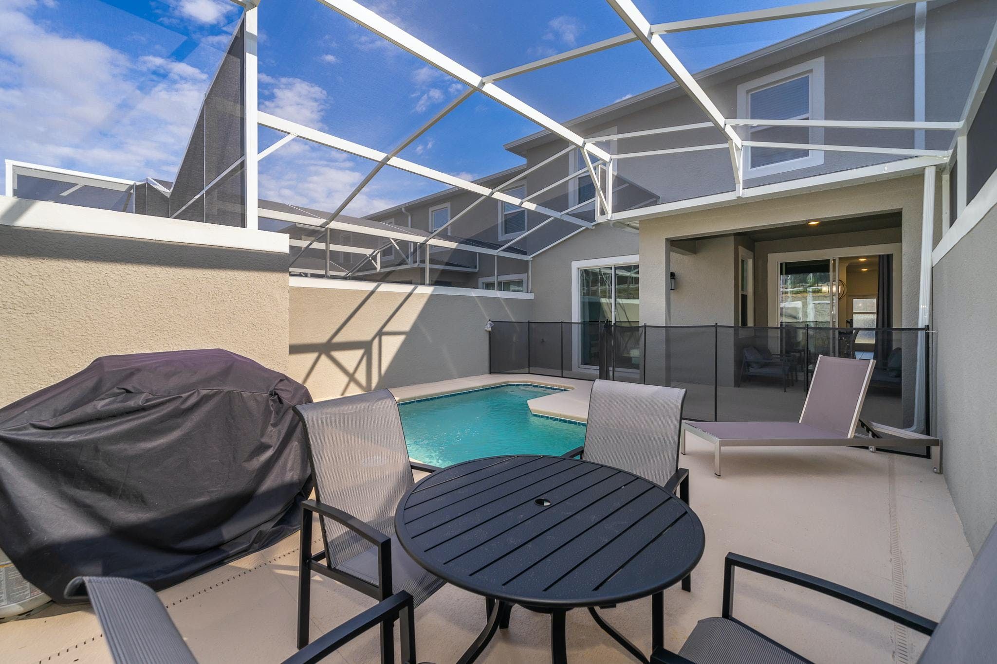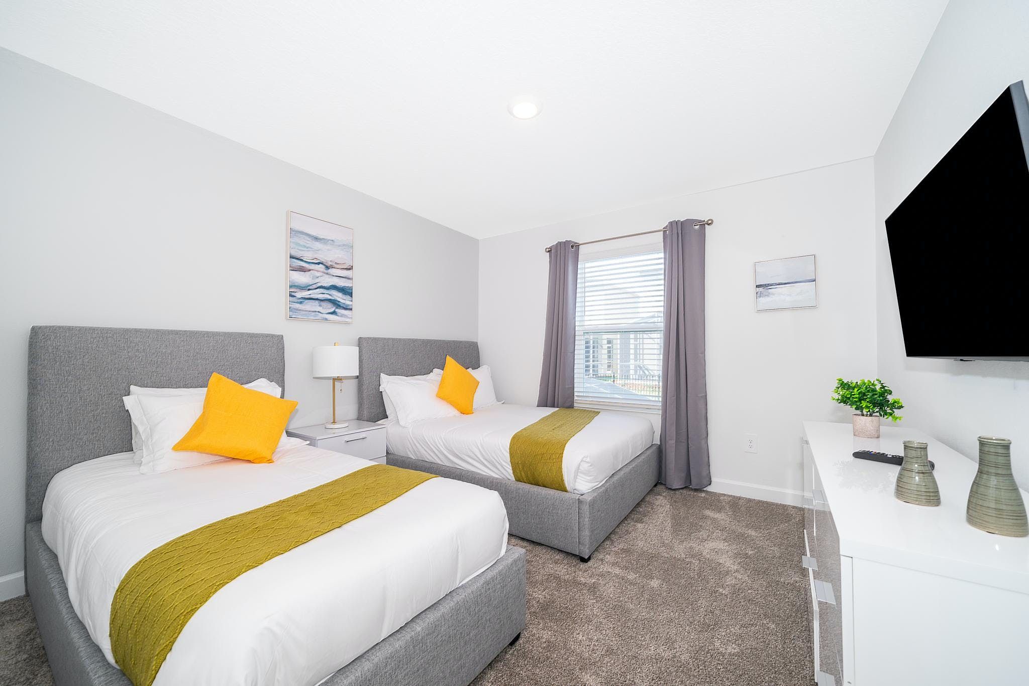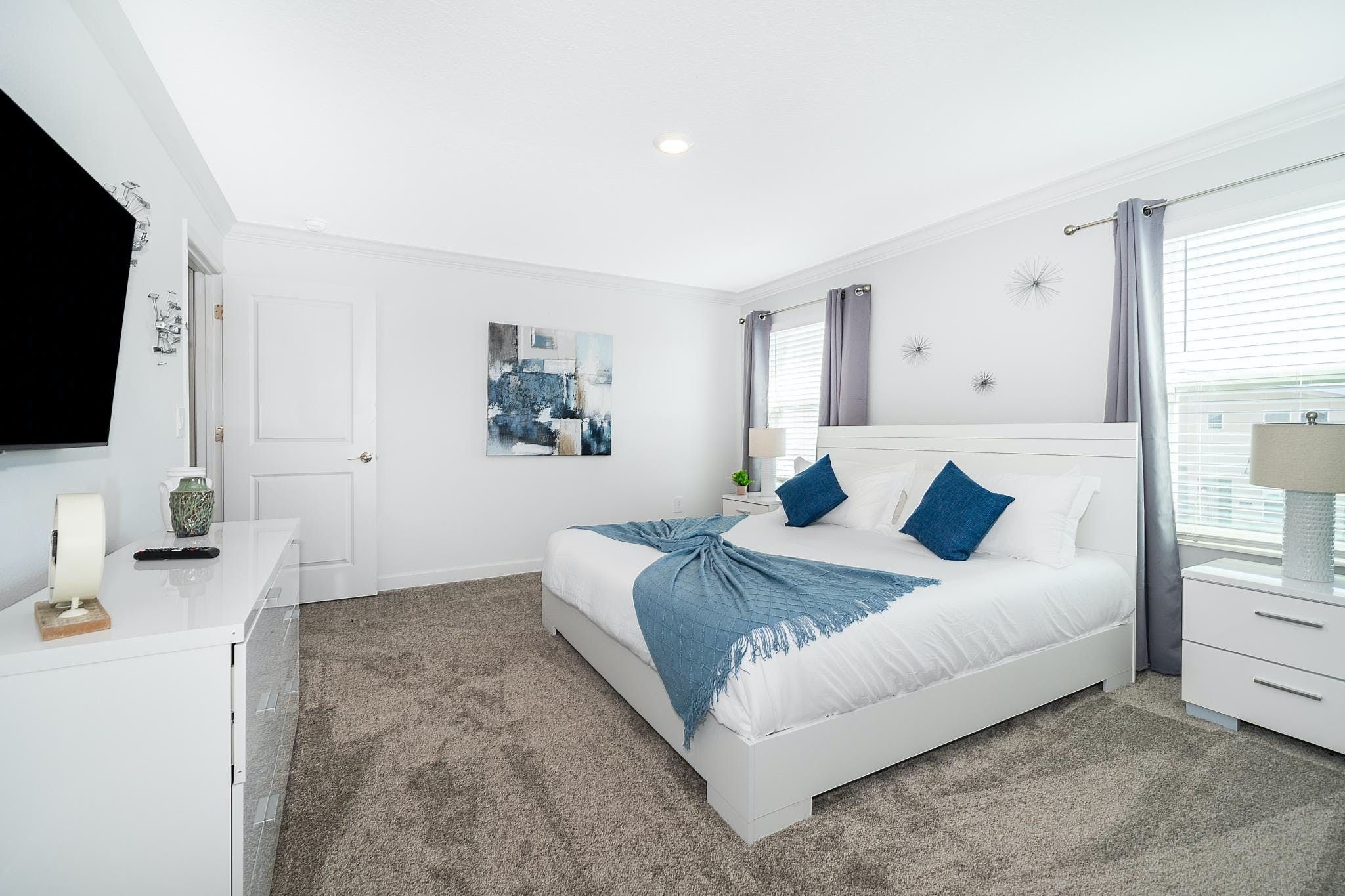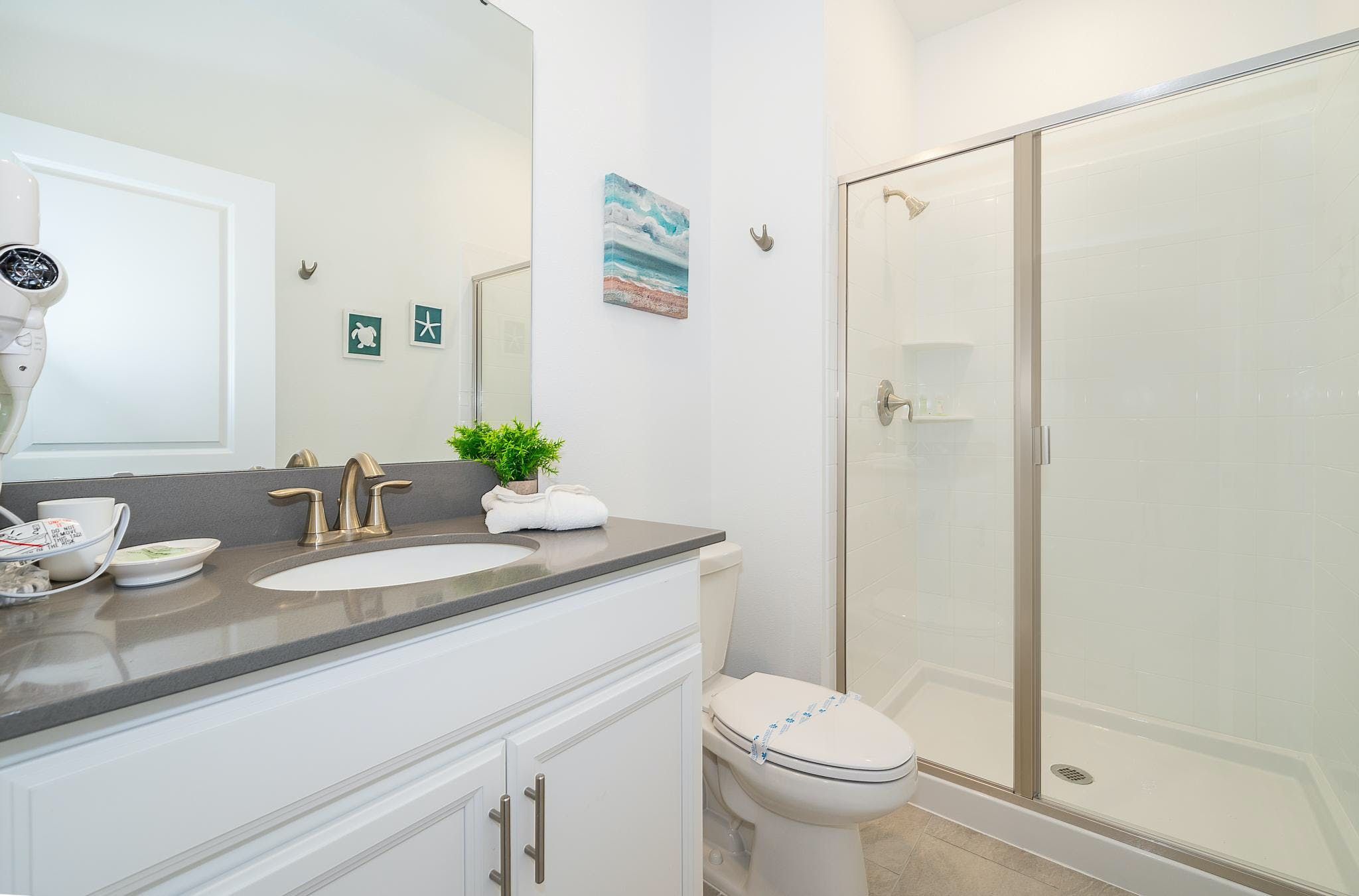 This stunning 4-bedroom, 3-bathroom vacation rental with a pool is located in the new phase of Champions Gate Resort. The bedrooms include a downstairs king bedroom and an upstairs master suite, along with two bedrooms featuring full and twin beds. The community boasts multiple golf courses and tennis courts, as well as a clubhouse resort with incredible amenities such as two pools (including a lazy river), a restaurant, gym, business center, game room, cinema, and more.