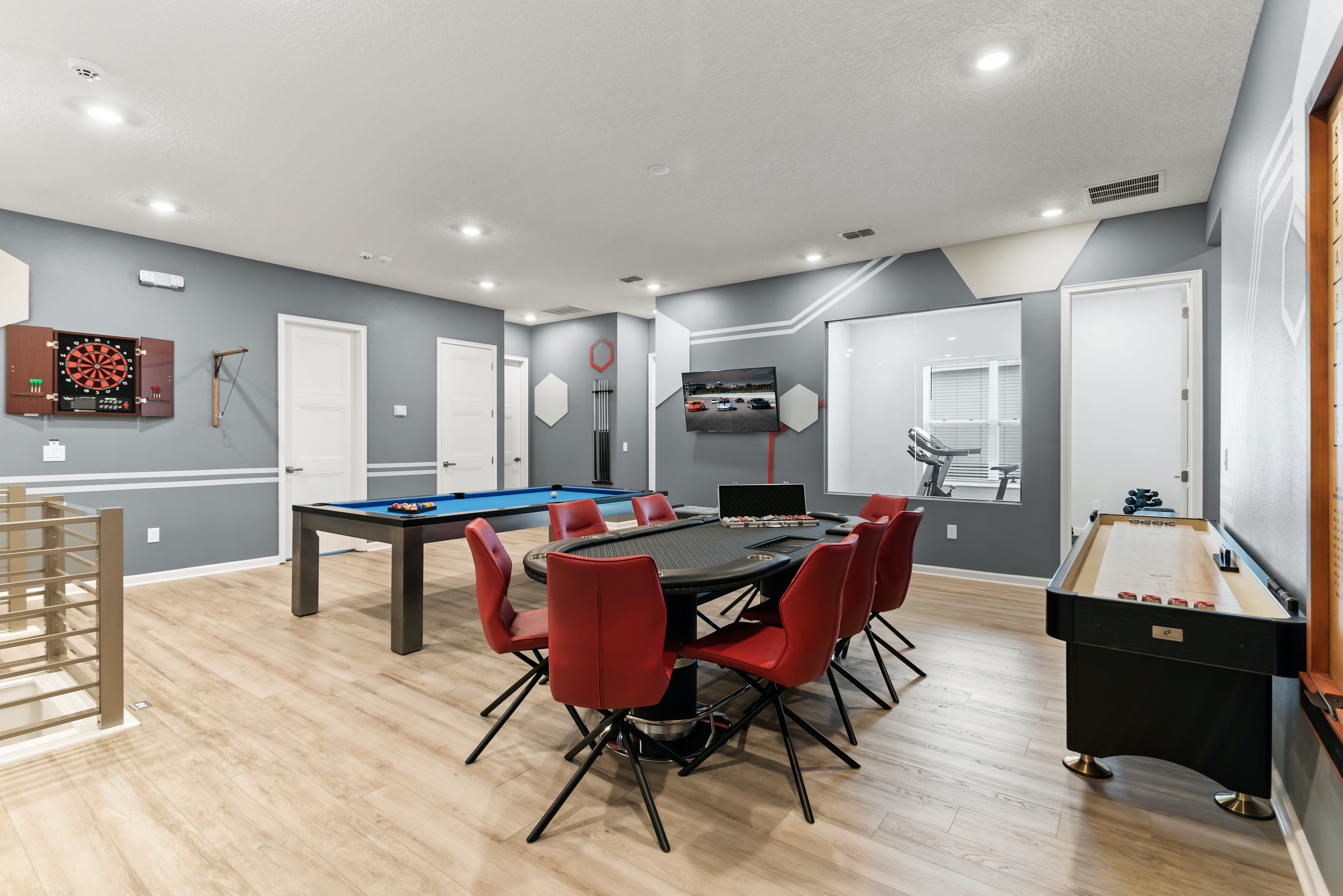 There's fun to be had for both little ones and grown-ups here. Inside, there are two themed bedrooms for the little ones, two arcade rooms – one even features a galaxy-themed Tiki bar – and a home cinema for chilled evenings in. Outside, you'll find a covered swimming pool with games and an outdoor kitchen and seating area. The fun continues with access to the resort's shared amenities like restaurants, a lazy river, and tennis courts. When you can tear yourself away from the in-house and on-site fun, Orlando's top attractions like Disney World and Universal Studios are a thirty-minute drive away.
