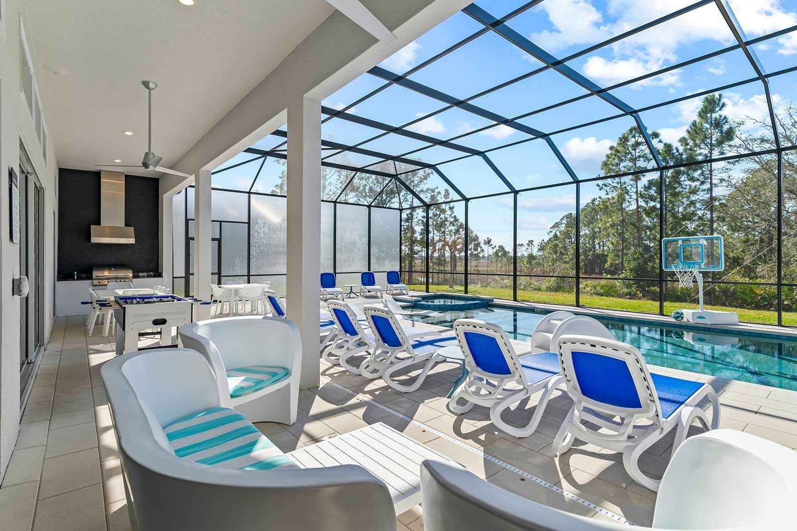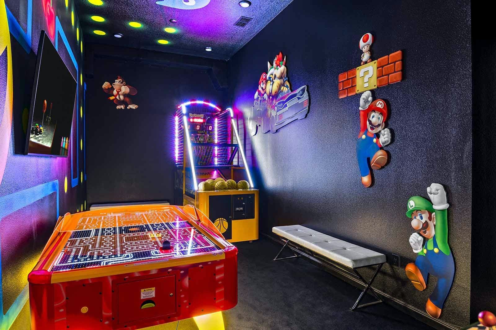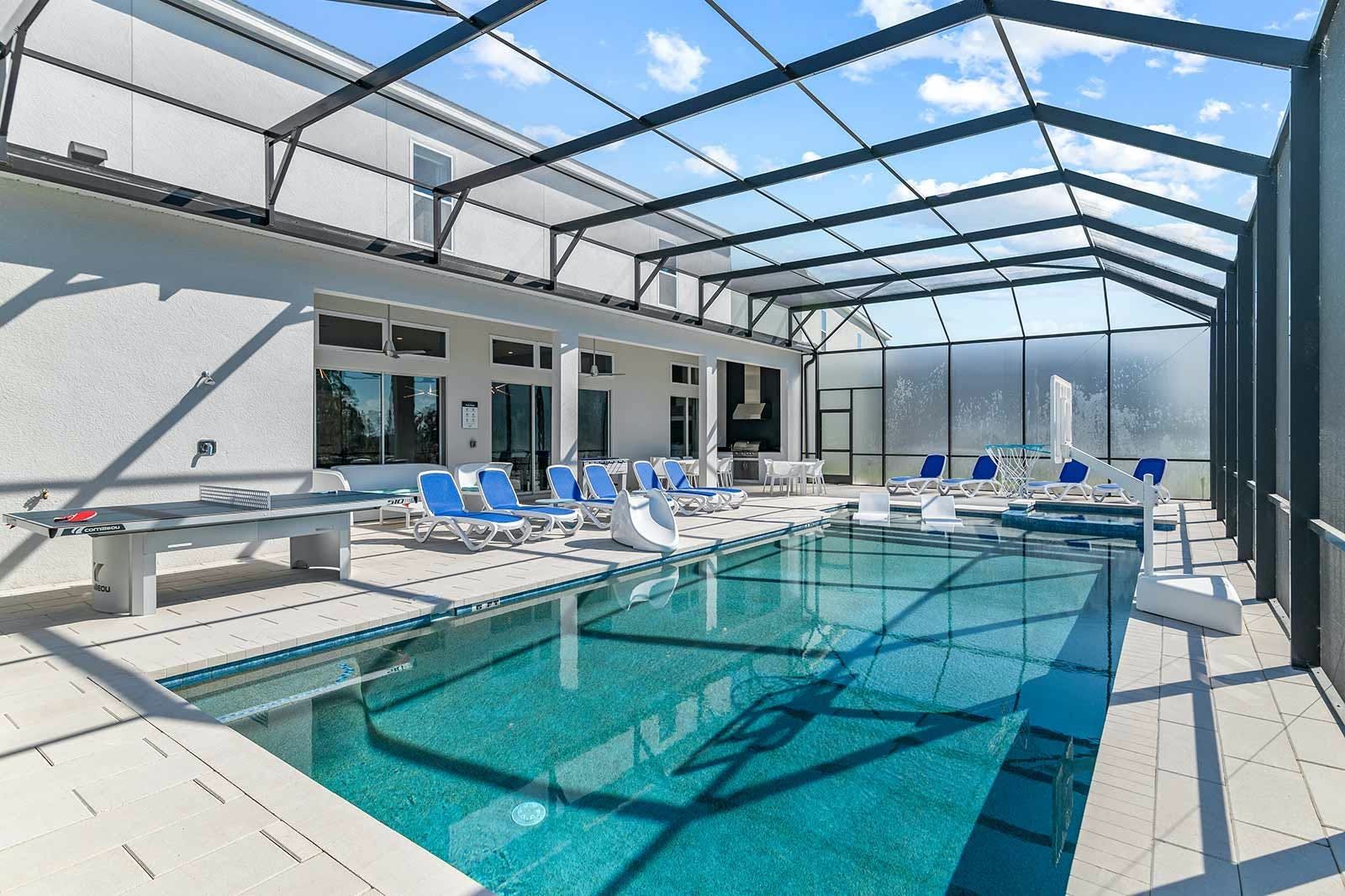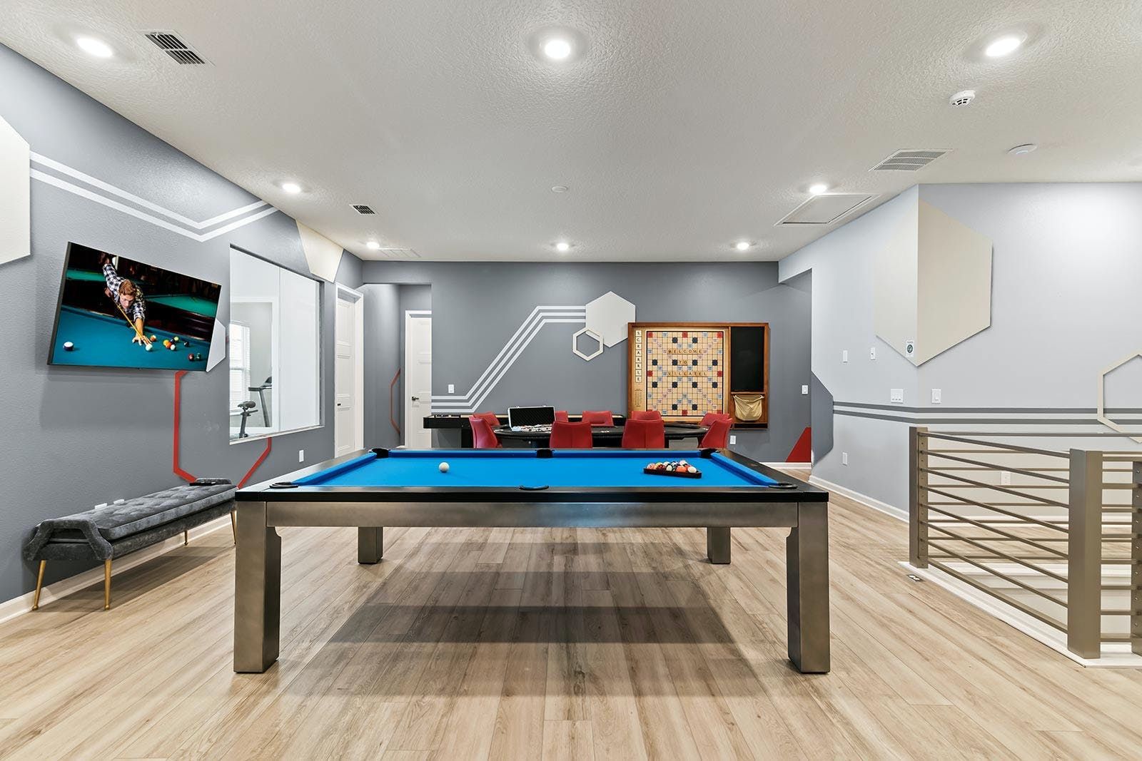 This is a luxurious vacation home located in a resort area. With 71 luxury homes and exclusive amenities, this brand new one-of-a-kind vacation community offers a private entrance, scenic views, and a covered playground. The grand foyer of this Transitional-style mansion opens into a chic-yet-functional lounge and social space featuring comfy furniture, an oversized TV, and plenty of space to move about. Guests can enjoy their own private screened pool and spa with outdoor games like pool basketball and foosball. The designer chef's kitchen is fully stocked with top-of-the-line equipment and finishes, including stainless steel appliances, elegant blue and cream custom cabinetry, stone countertops, and bright light flooring. The villa also features two indoor recreation rooms with arcade games, shuffleboard, pool, air hockey, and more. With themed bedrooms for kids featuring colorful wall art and custom bunk beds, the villa also has deluxe ground-floor bedrooms with en suite bathrooms. Guests can enjoy all of Orlando's famous attractions such as Disney Parks, Universal Parks, SeaWorld, world-class shopping & dining within a 23-40 minute drive.