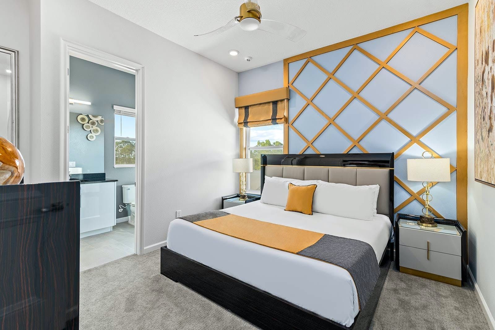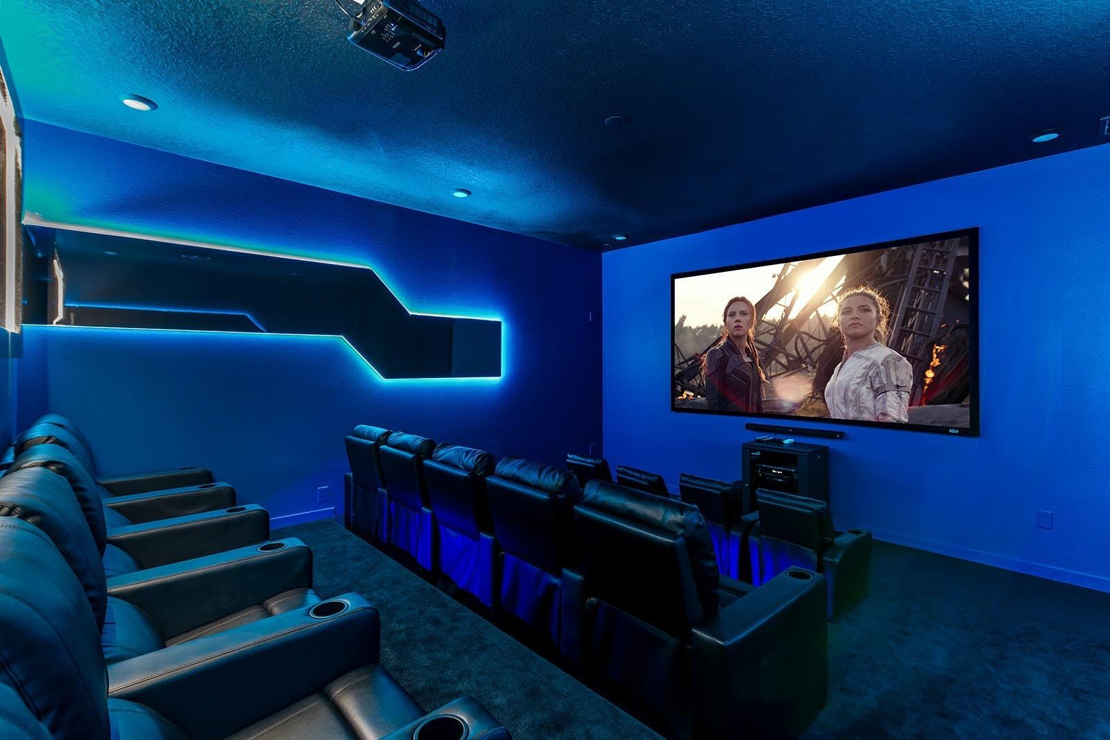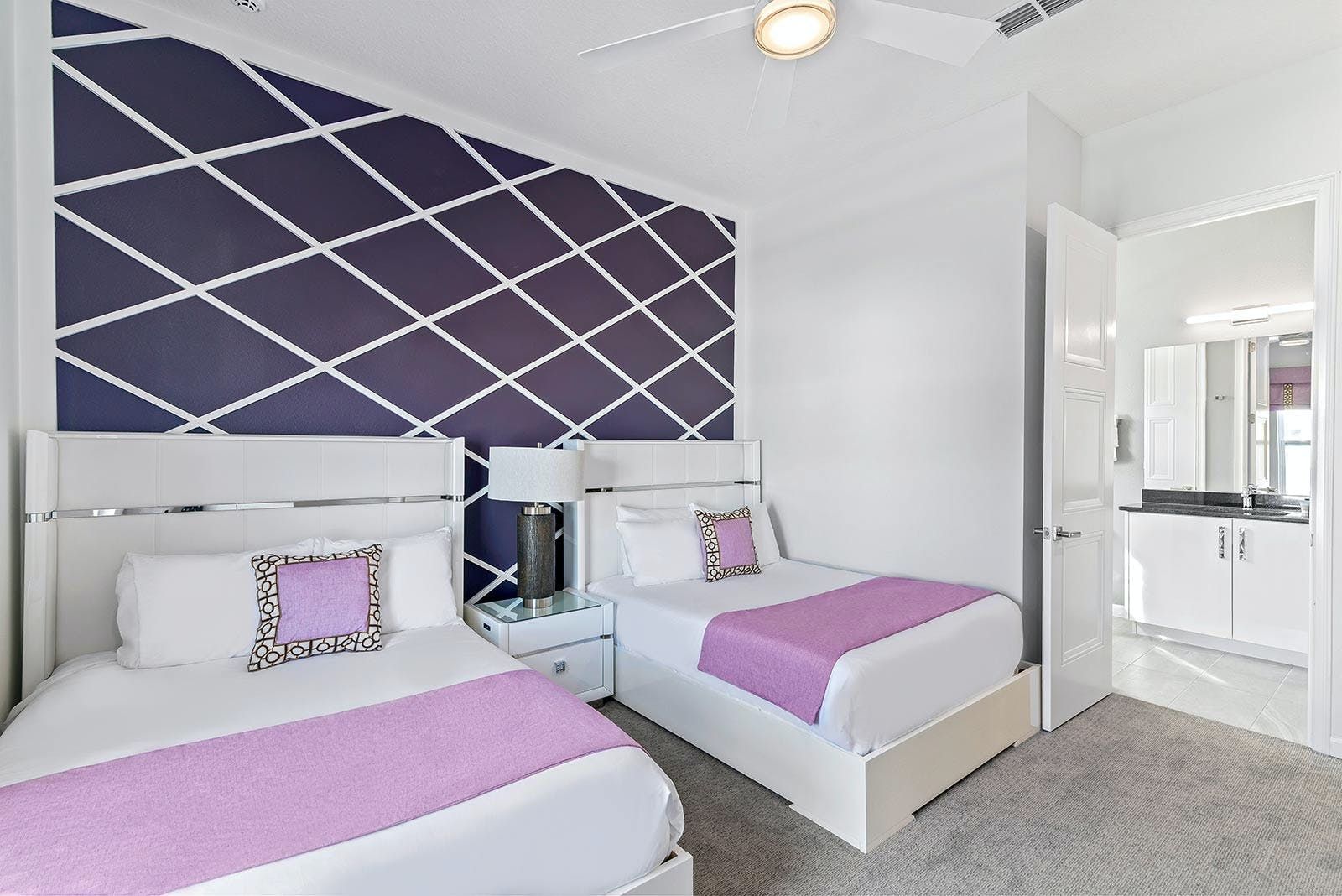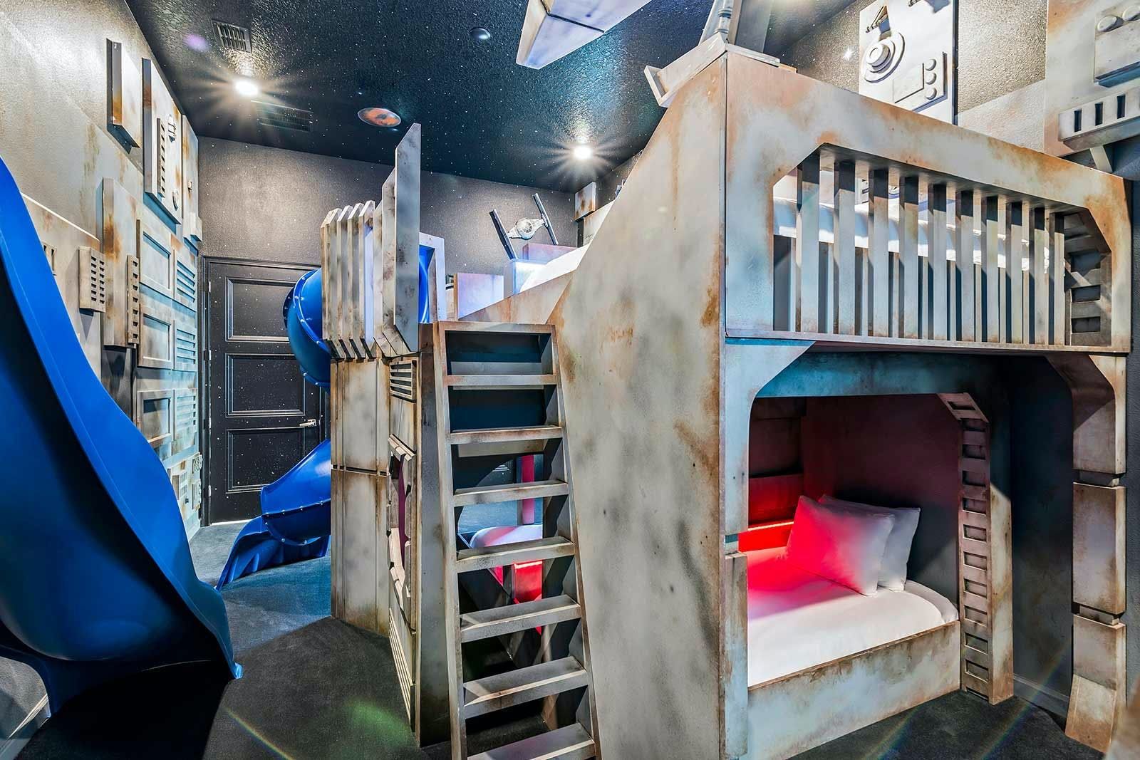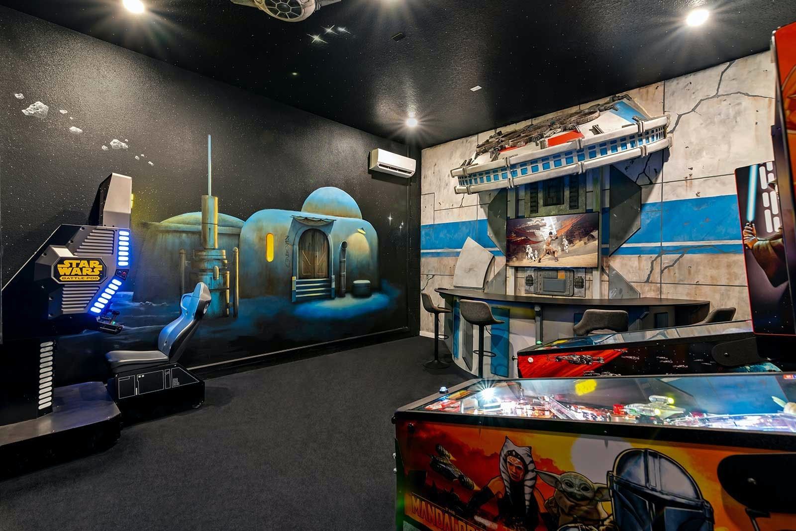 This is a luxurious vacation home located in a resort area. With 71 luxury homes and exclusive amenities, this brand new one-of-a-kind vacation community offers a private entrance, scenic views, and a covered playground. The grand foyer of this Transitional-style mansion opens into a chic-yet-functional lounge and social space featuring comfy furniture, an oversized TV, and plenty of space to move about. Guests can enjoy their own private screened pool and spa with outdoor games like pool basketball and foosball. The designer chef's kitchen is fully stocked with top-of-the-line equipment and finishes, including stainless steel appliances, elegant blue and cream custom cabinetry, stone countertops, and bright light flooring. The villa also features two indoor recreation rooms with arcade games, shuffleboard, pool, air hockey, and more. With themed bedrooms for kids featuring colorful wall art and custom bunk beds, the villa also has deluxe ground-floor bedrooms with en suite bathrooms. Guests can enjoy all of Orlando's famous attractions such as Disney Parks, Universal Parks, SeaWorld, world-class shopping & dining within a 23-40 minute drive.