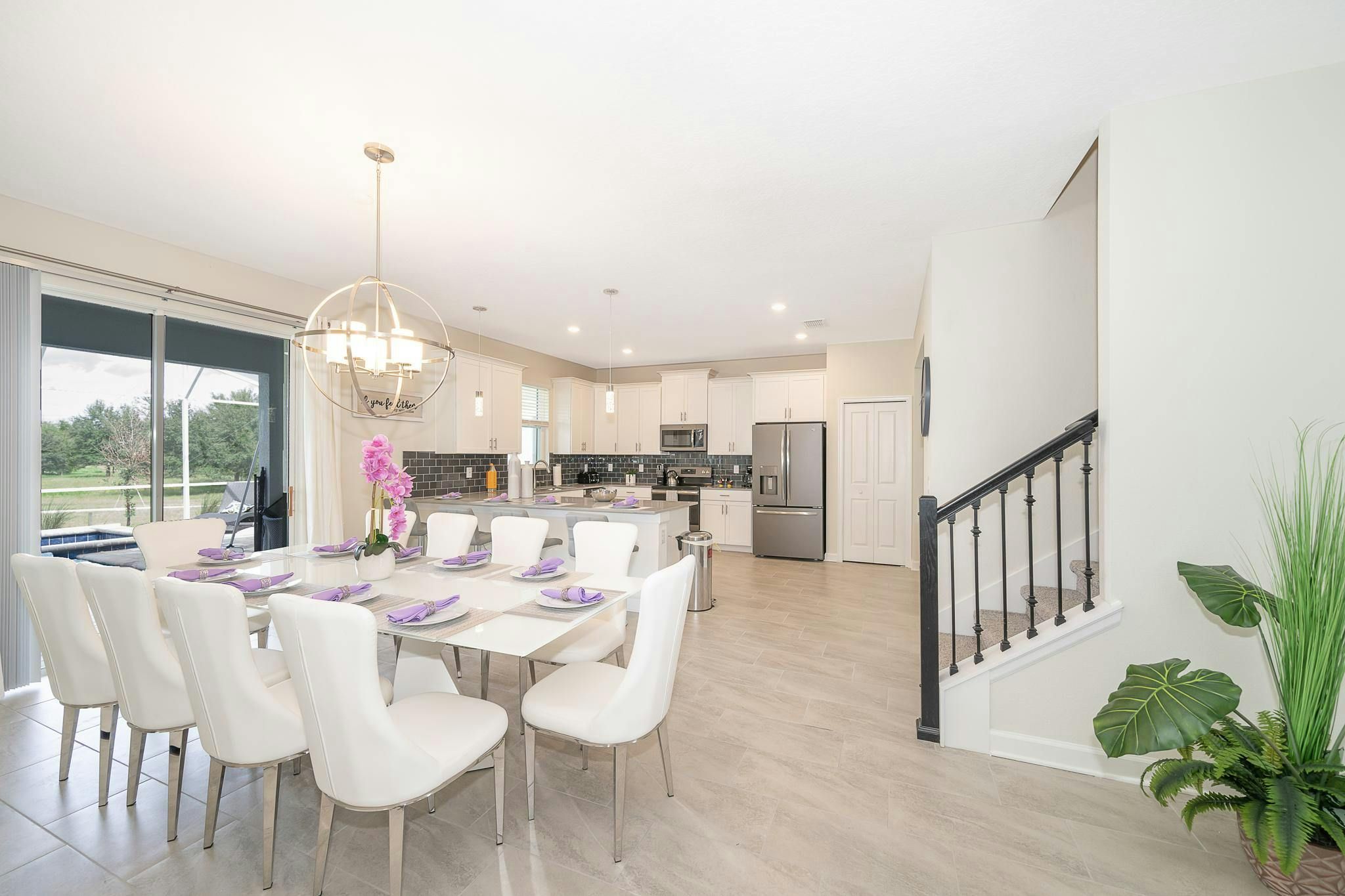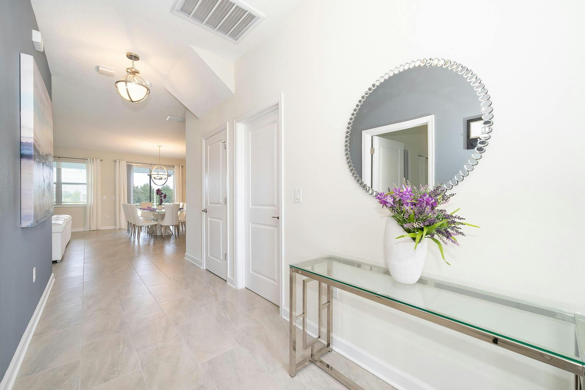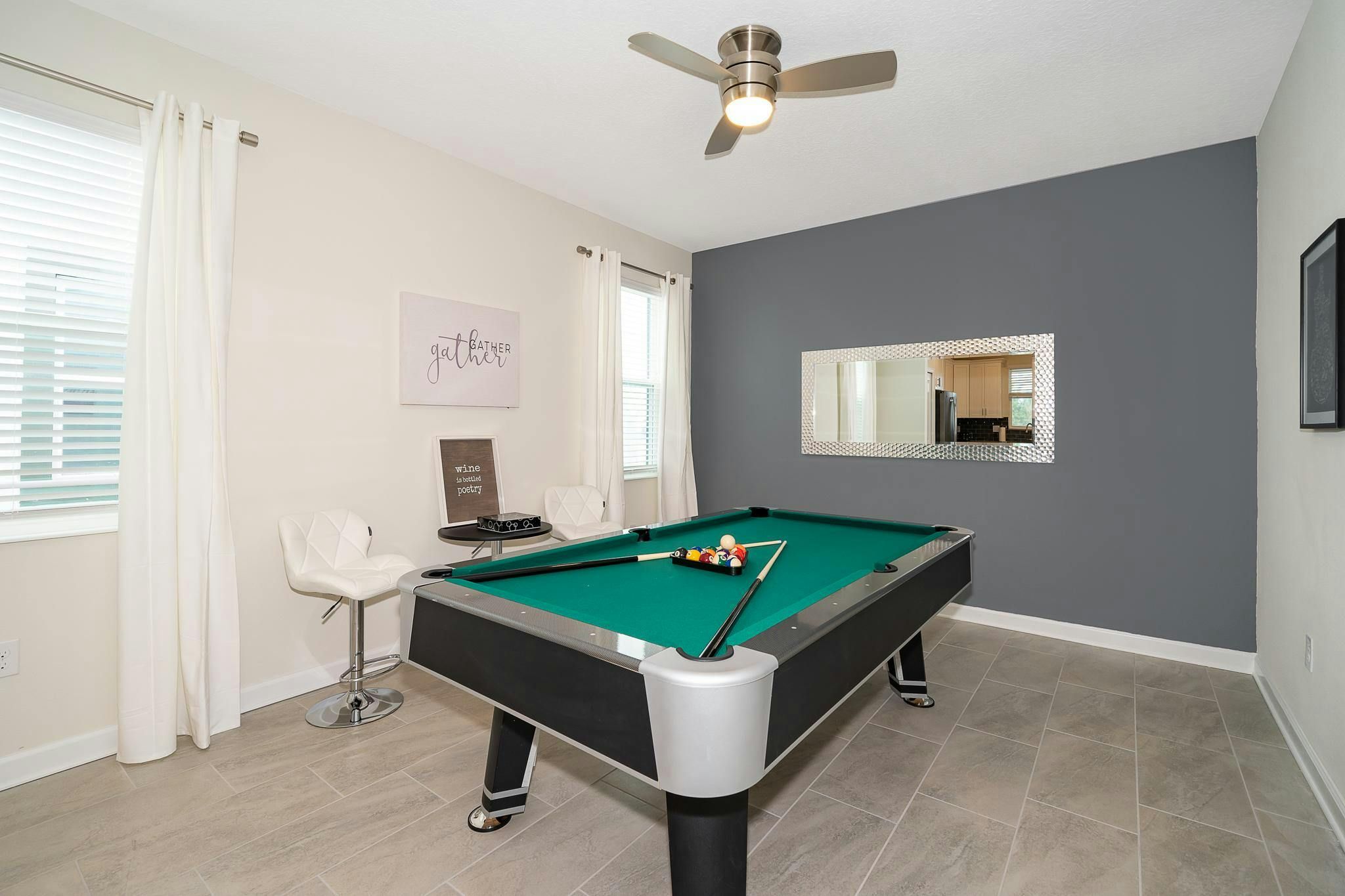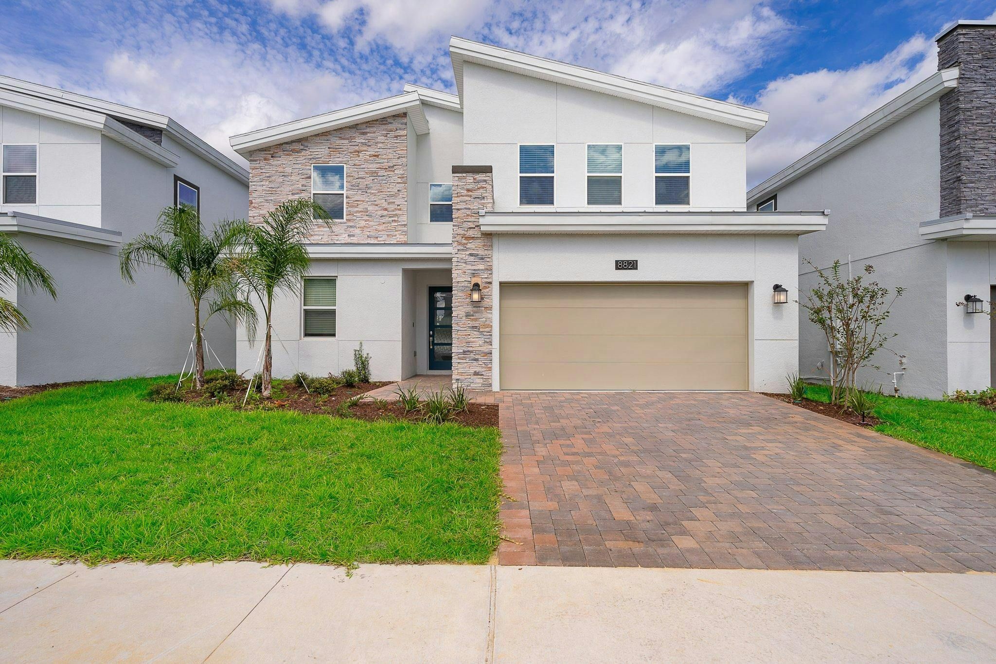 This luxurious new single-family home boasts six bedrooms, six bathrooms, and a game room complete with air hockey, pool table, and ping pong. The first floor features one suite while the second floor has two suites and a spacious loft. Guests can enjoy a fully-equipped kitchen, screened private pool and spa, and private parking. The home is newly furnished and decorated with internet and cable included. Located near Disney, restaurants, and shopping centers, guests will find plenty of activities to keep them entertained. A recently opened clubhouse resort offers additional amenities such as two pools (including a lazy river), restaurant, gym, and business center.