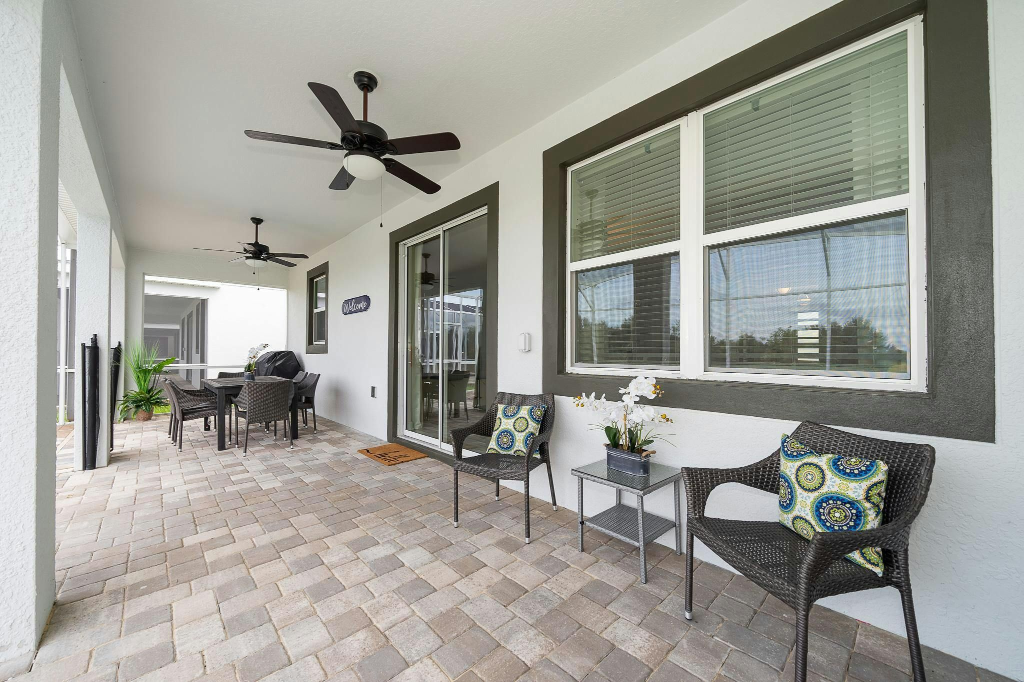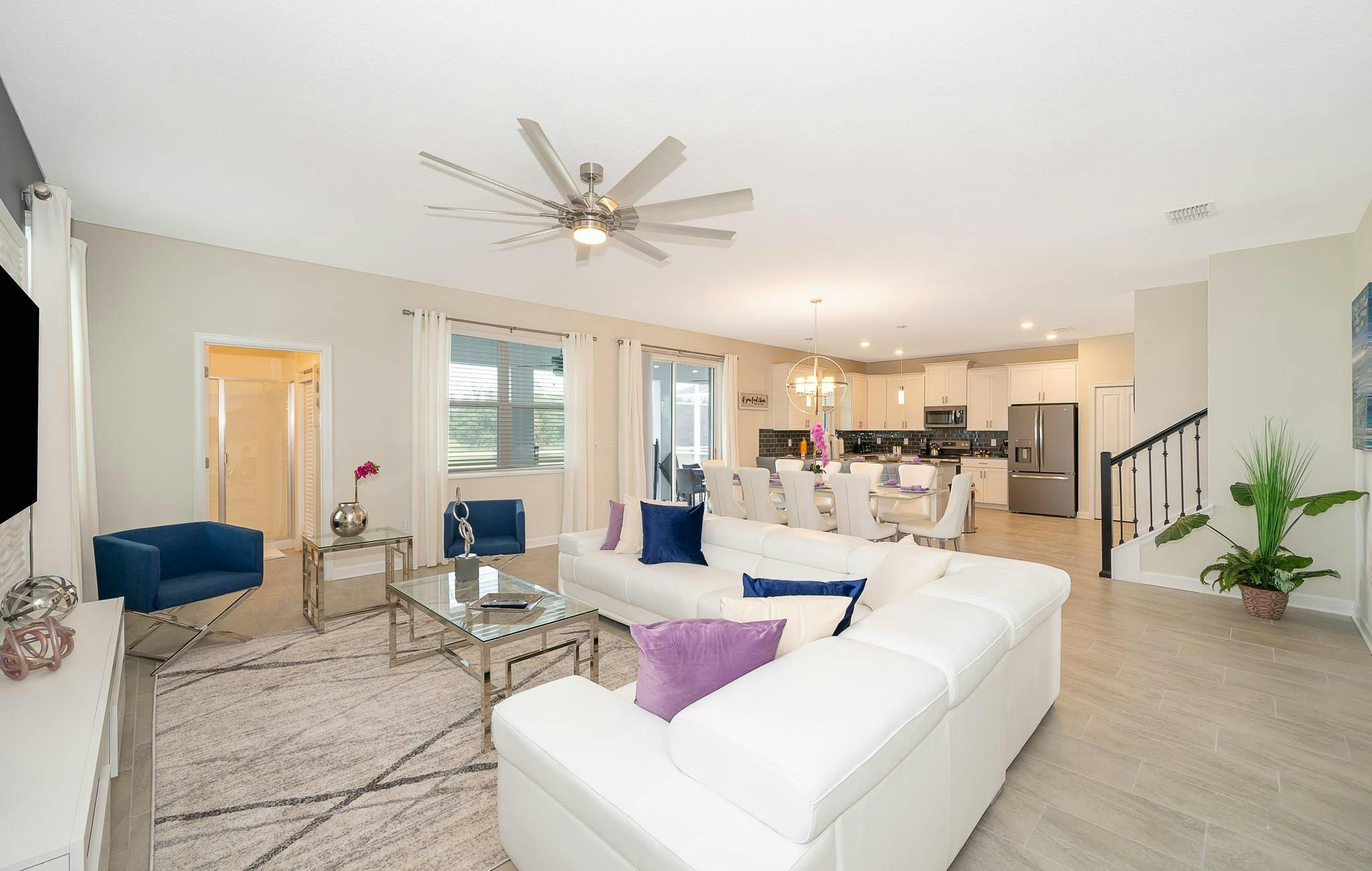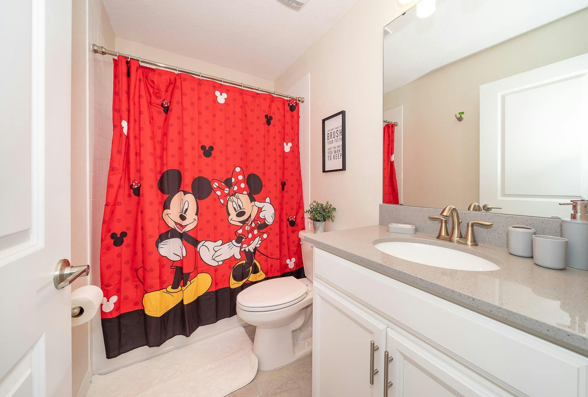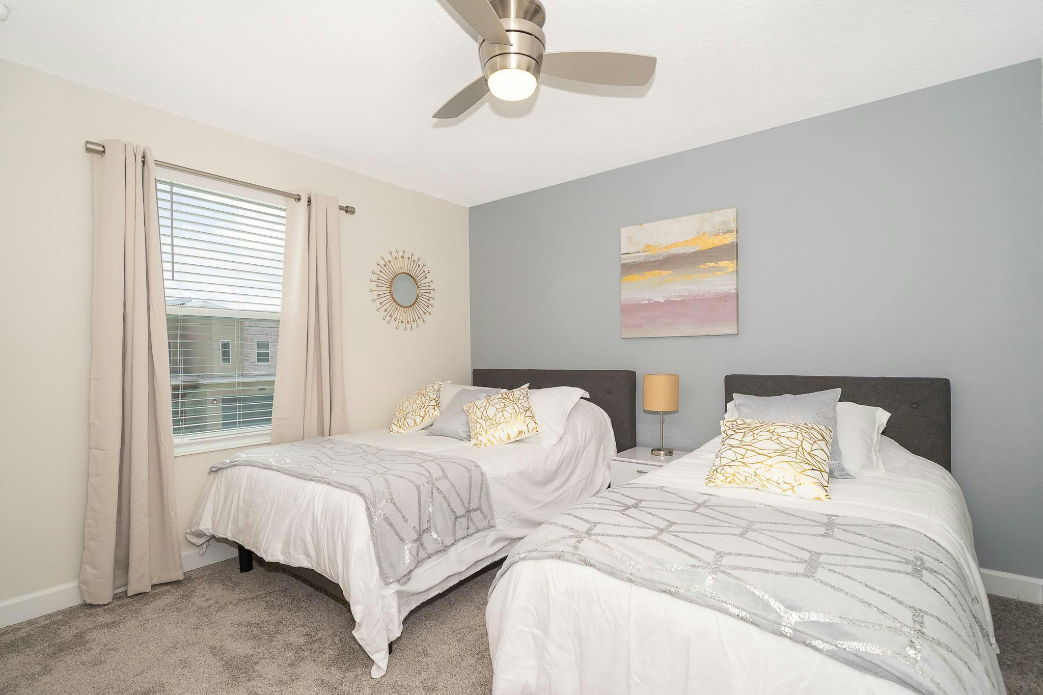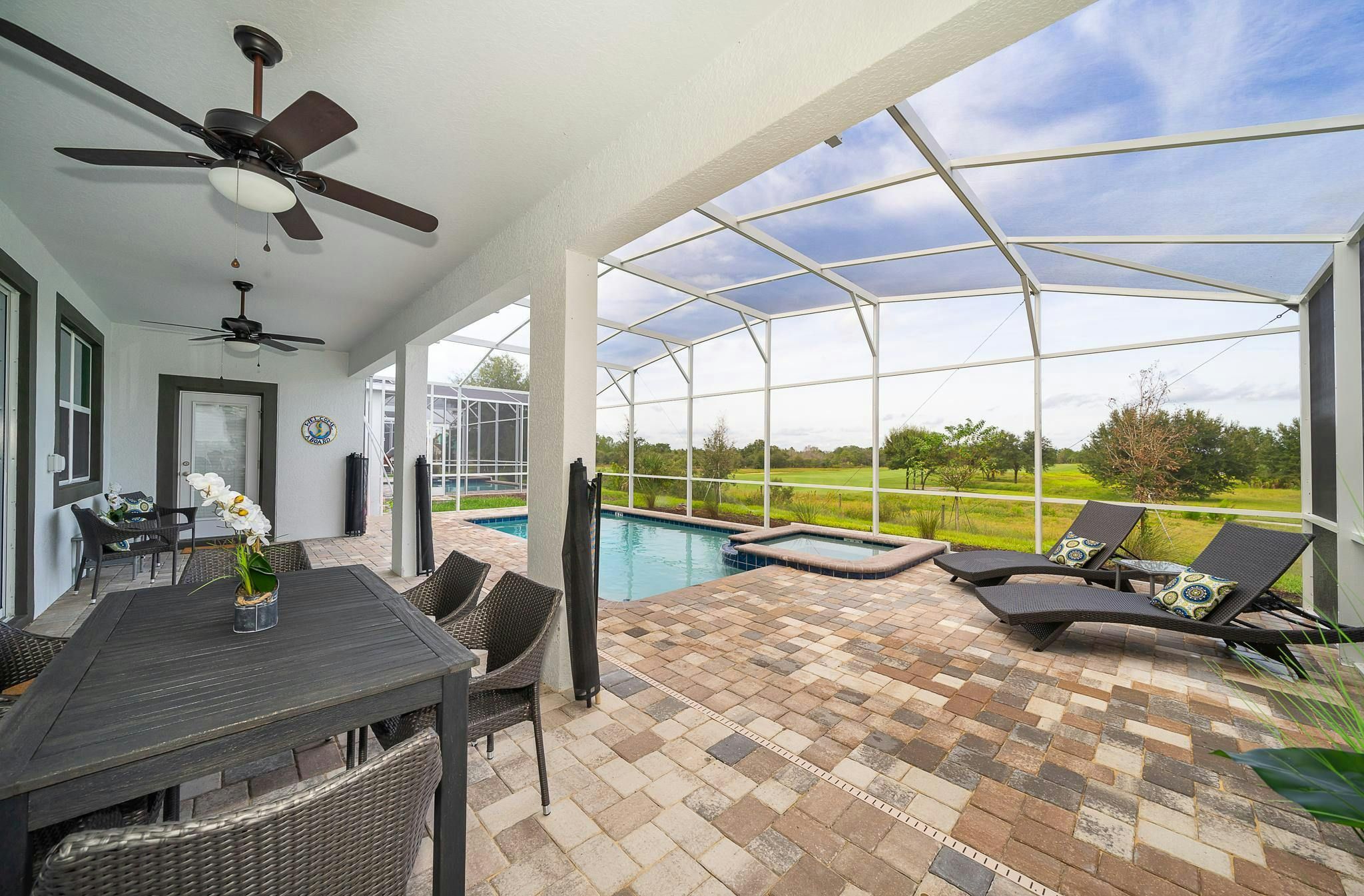This luxurious new single-family home boasts six bedrooms, six bathrooms, and a game room complete with air hockey, pool table, and ping pong. The first floor features one suite while the second floor has two suites and a spacious loft. Guests can enjoy a fully-equipped kitchen, screened private pool and spa, and private parking. The home is newly furnished and decorated with internet and cable included. Located near Disney, restaurants, and shopping centers, guests will find plenty of activities to keep them entertained. A recently opened clubhouse resort offers additional amenities such as two pools (including a lazy river), restaurant, gym, and business center.