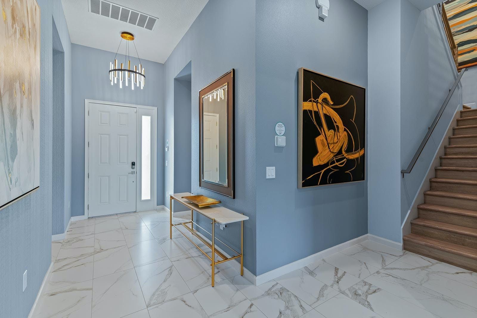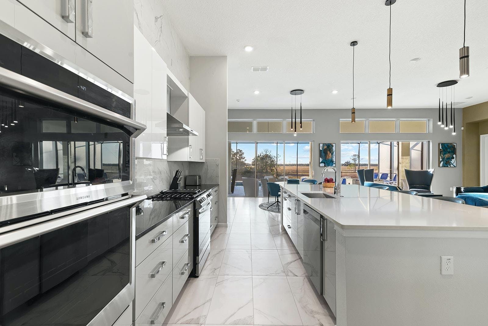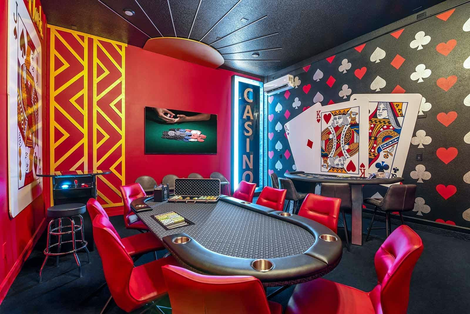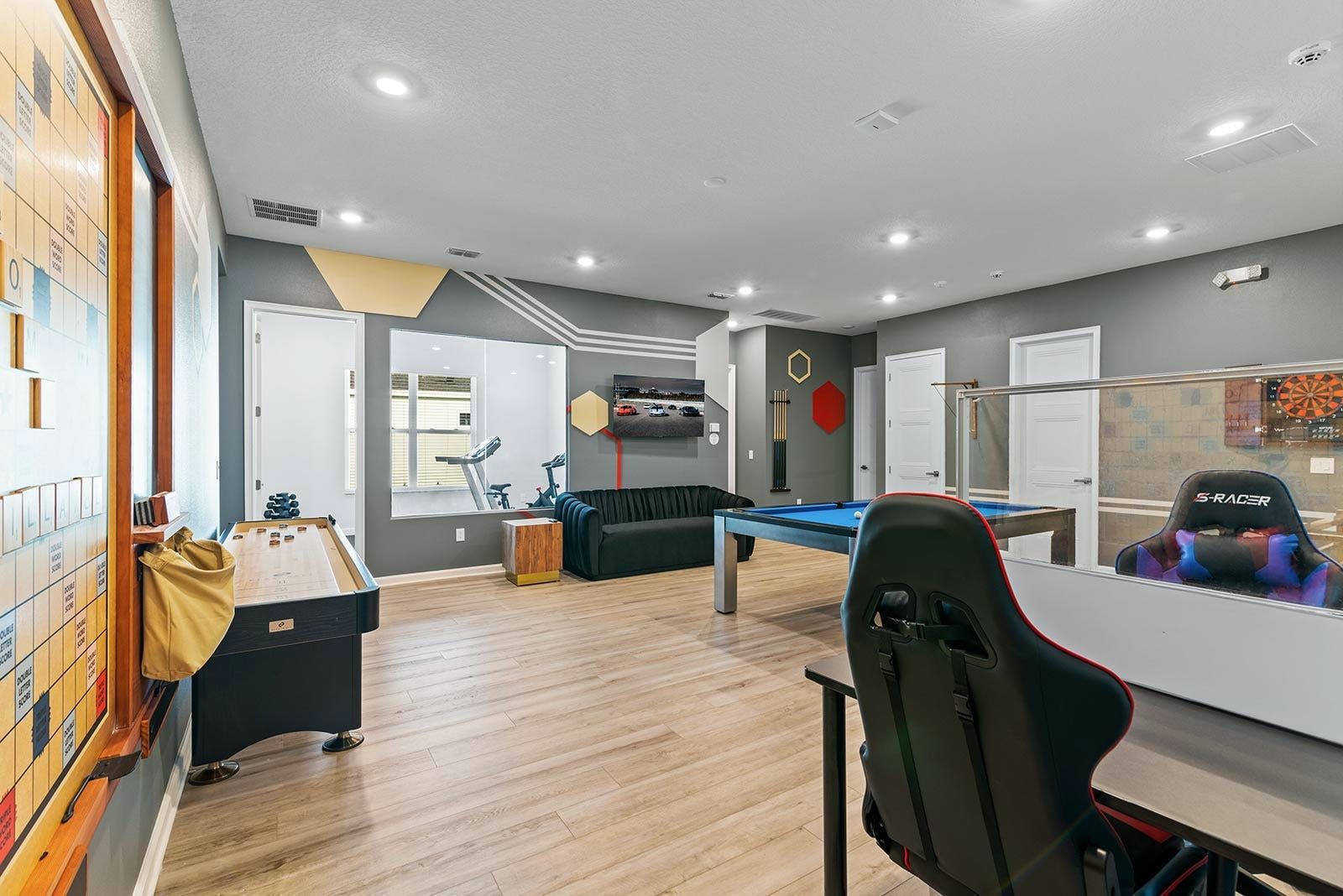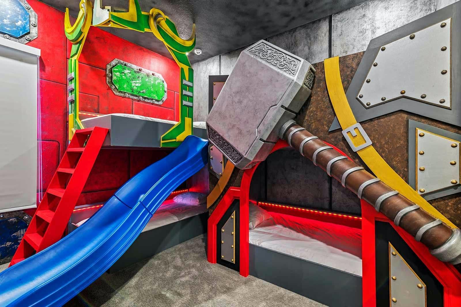 Just a short drive from Orlando’s iconic attraction parks, this home couldn’t be better placed for a fun-filled stay in Florida. You can spend your days exploring Disney, Universal Studios and nearby Kissimmee. There’s plenty to keep everyone entertained in the resort with a communal pool, tennis courts, soccer field and a fitness centre. Plus, the house promises equal amounts of joy and relaxation with a private pool, a spa, a home cinema and a private casino and sports bar. There are plenty of games to choose from and the themed bedrooms are a magical treat for children.