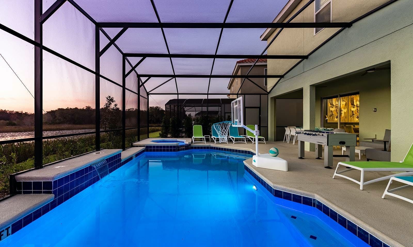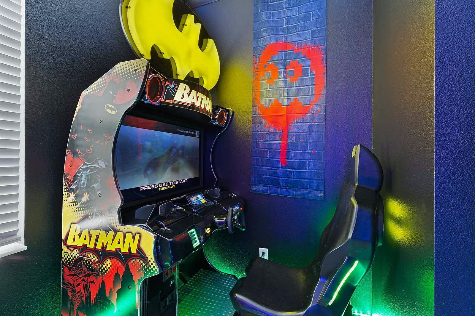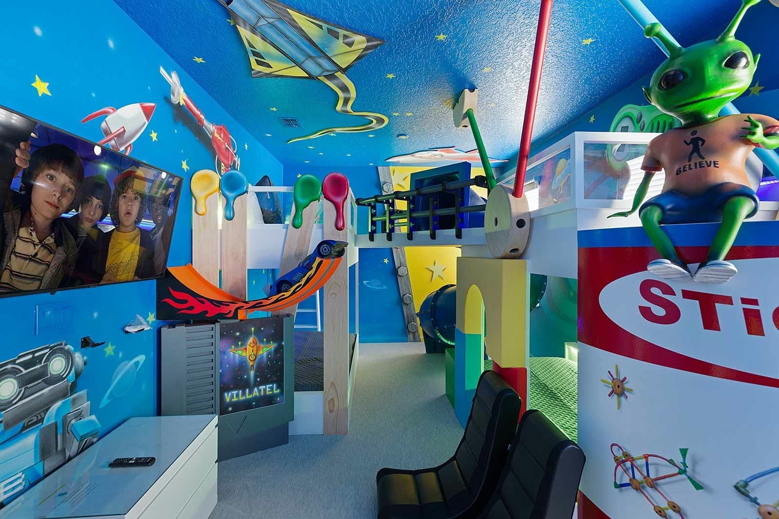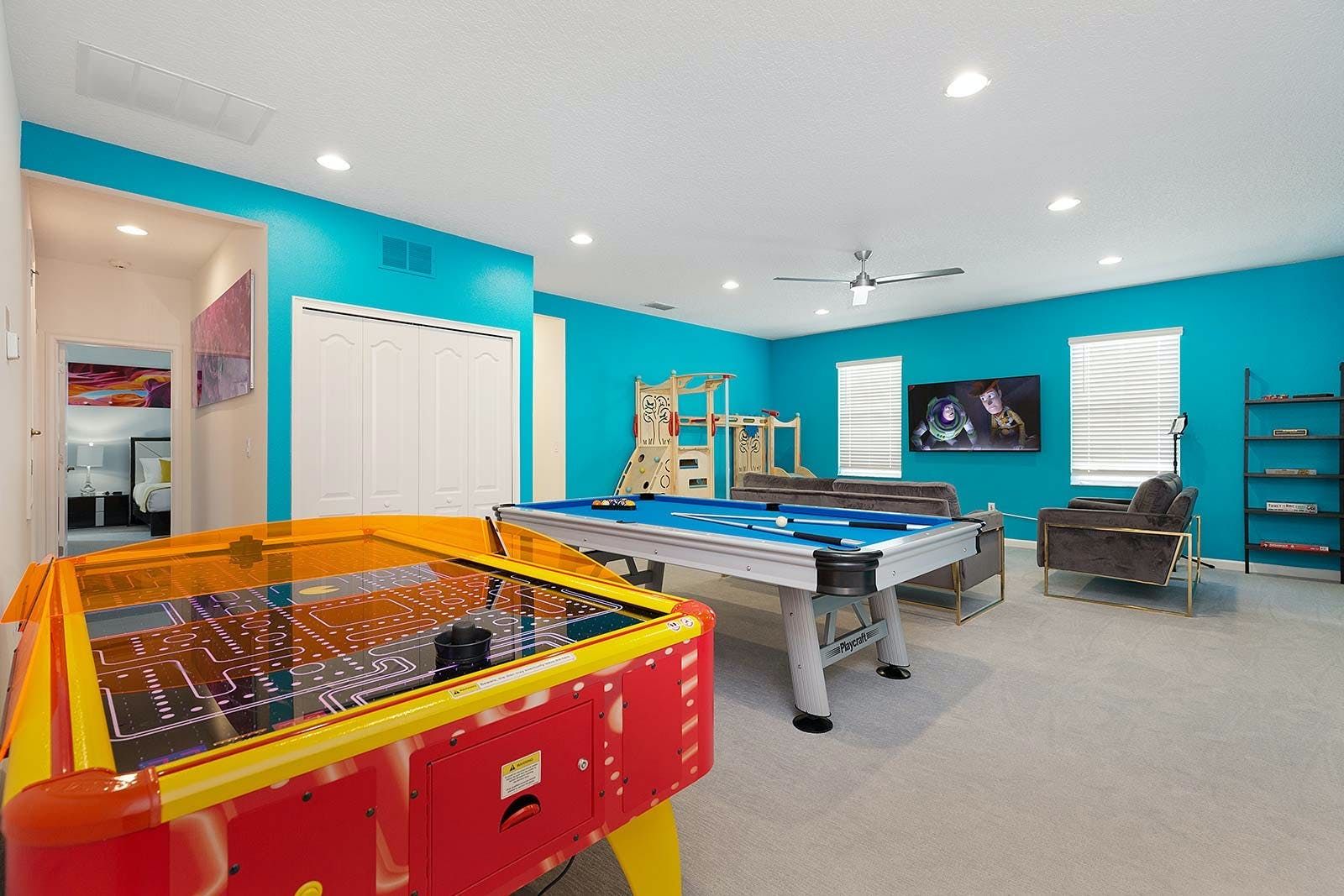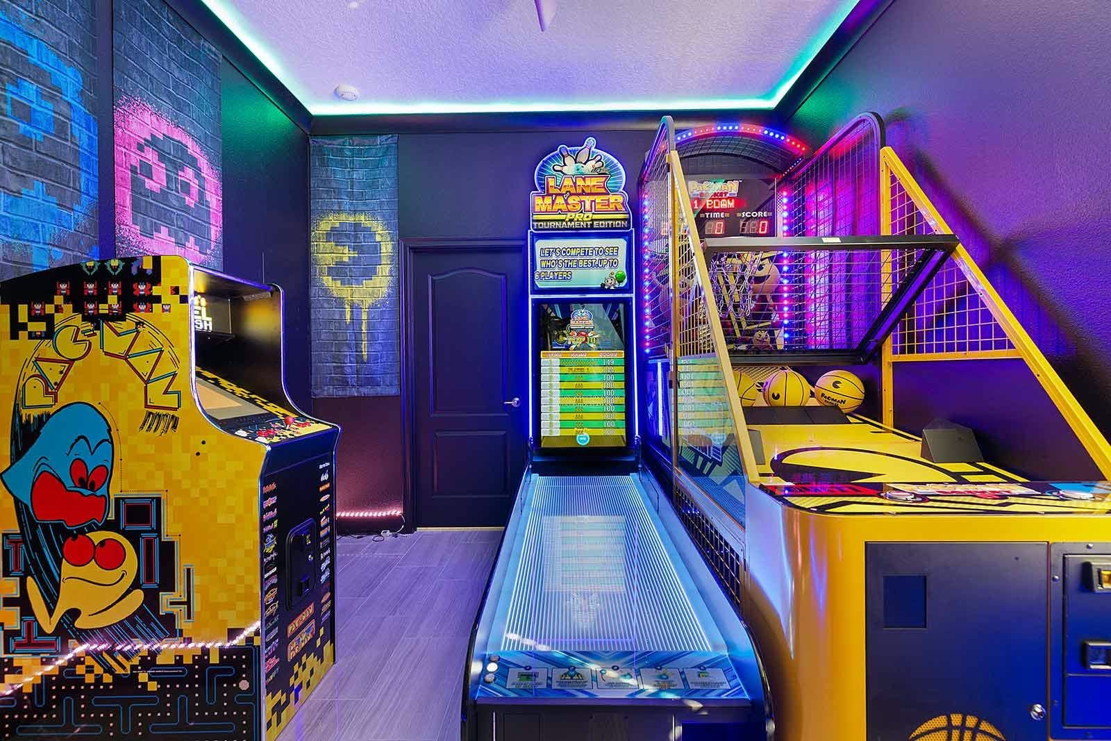 This Orlando villa is the perfect family vacation home, with plenty of entertainment options for kids and adults alike. The themed bedrooms are a hit with the little ones, including a toy room and basketball-themed bedroom complete with over-the-top bunk beds. The arcade is fully decked out with classic games like Pac-Man, and the home theater offers a cozy space for movie nights. Outside, the private screened-in pool and hot tub are surrounded by loungers and outdoor games like foosball and in-pool basketball. Inside, the kitchen is fully stocked with all necessary appliances and cookware, while the spacious dining area offers seating for 12. Bedrooms feature deluxe mattresses and hotel-quality linens, ensuring a restful night's sleep. a resort community offers additional amenities such as an oversized pool, lazy river, water slide, tennis courts, fitness center, and clubhouse. Conveniently located just miles from Disney and other popular attractions, this villa promises comfort and convenience for an unforgettable vacation experience.