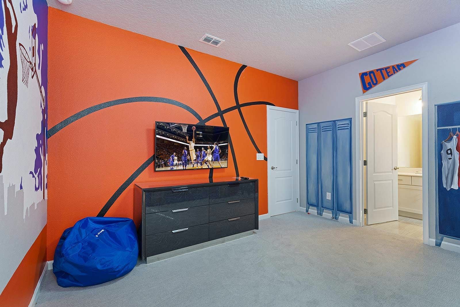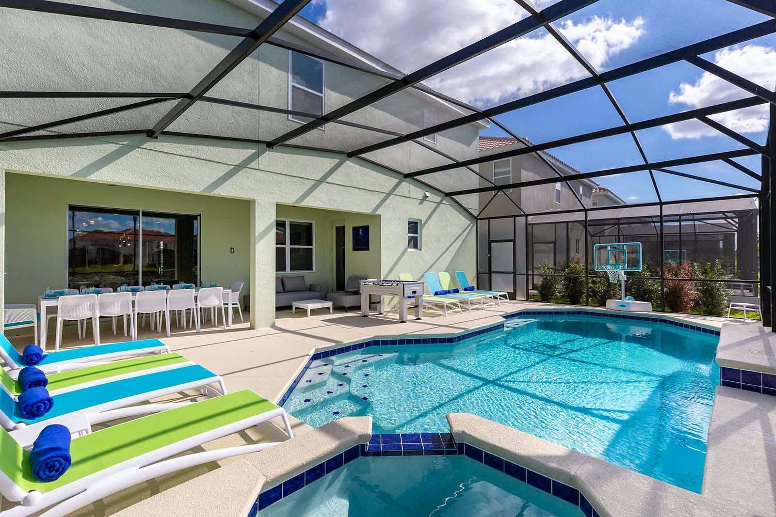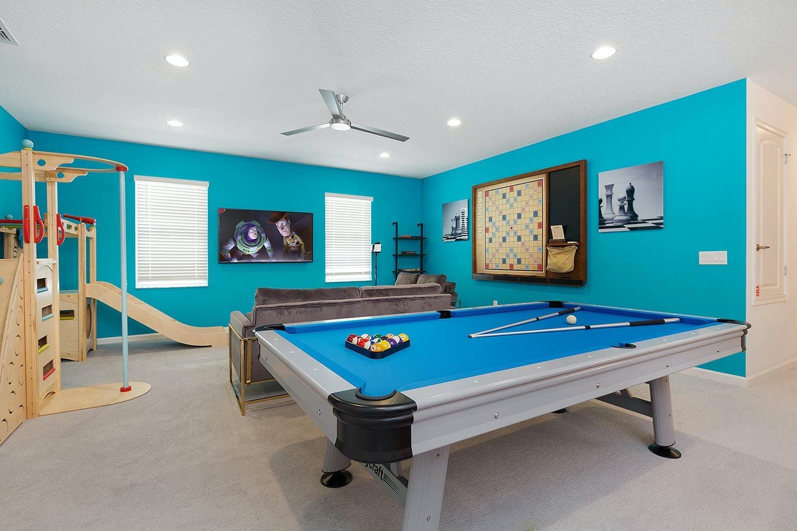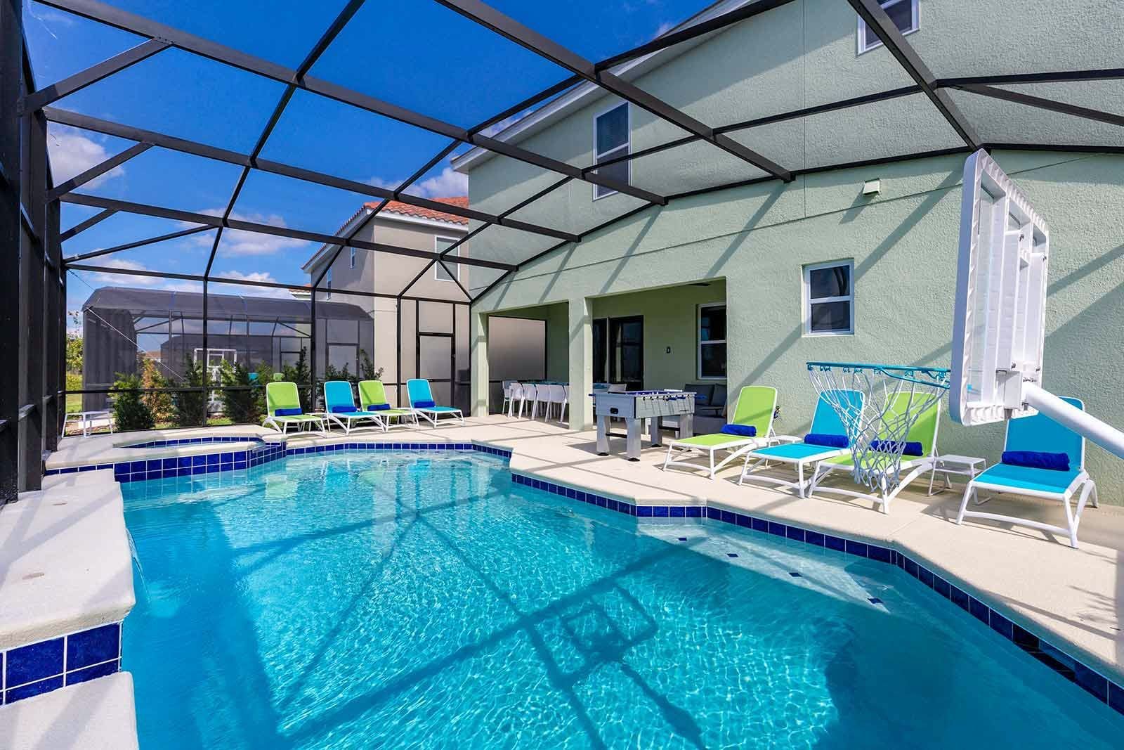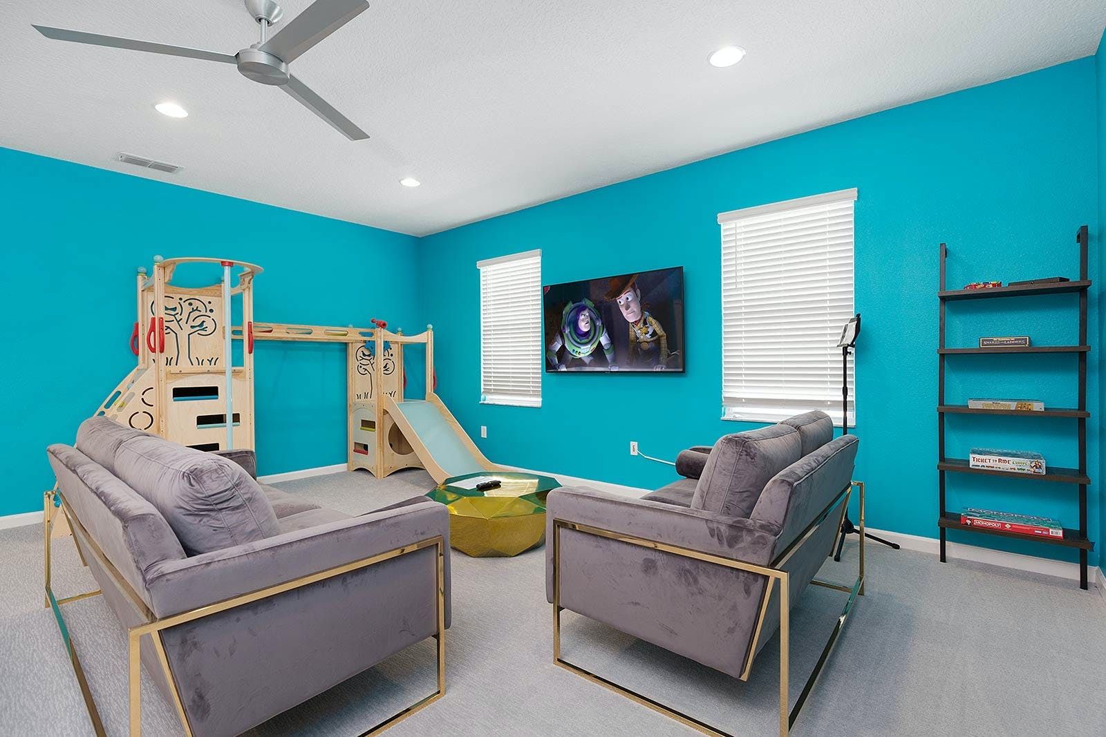 This Orlando villa is the perfect family vacation home, with plenty of entertainment options for kids and adults alike. The themed bedrooms are a hit with the little ones, including a toy room and basketball-themed bedroom complete with over-the-top bunk beds. The arcade is fully decked out with classic games like Pac-Man, and the home theater offers a cozy space for movie nights. Outside, the private screened-in pool and hot tub are surrounded by loungers and outdoor games like foosball and in-pool basketball. Inside, the kitchen is fully stocked with all necessary appliances and cookware, while the spacious dining area offers seating for 12. Bedrooms feature deluxe mattresses and hotel-quality linens, ensuring a restful night's sleep. a resort community offers additional amenities such as an oversized pool, lazy river, water slide, tennis courts, fitness center, and clubhouse. Conveniently located just miles from Disney and other popular attractions, this villa promises comfort and convenience for an unforgettable vacation experience.