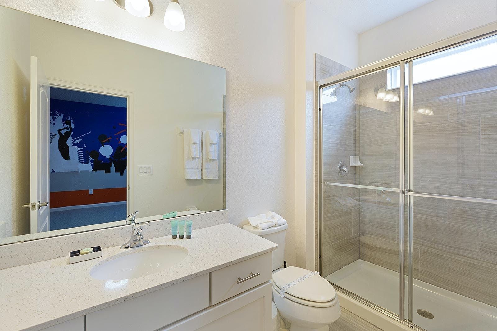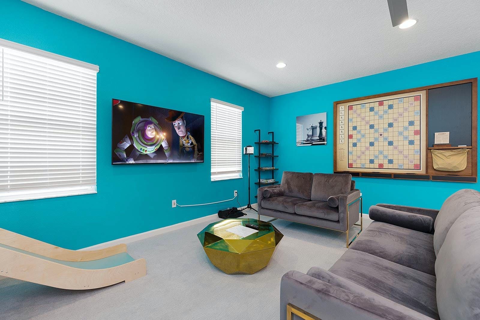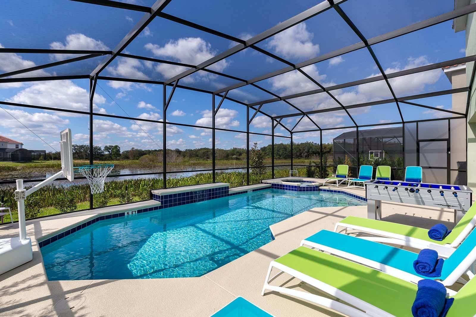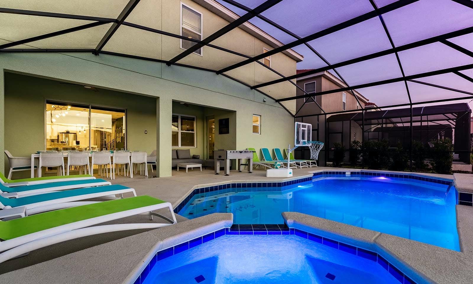 This Orlando villa is the perfect family vacation home, with plenty of entertainment options for kids and adults alike. The themed bedrooms are a hit with the little ones, including a toy room and basketball-themed bedroom complete with over-the-top bunk beds. The arcade is fully decked out with classic games like Pac-Man, and the home theater offers a cozy space for movie nights. Outside, the private screened-in pool and hot tub are surrounded by loungers and outdoor games like foosball and in-pool basketball. Inside, the kitchen is fully stocked with all necessary appliances and cookware, while the spacious dining area offers seating for 12. Bedrooms feature deluxe mattresses and hotel-quality linens, ensuring a restful night's sleep. a resort community offers additional amenities such as an oversized pool, lazy river, water slide, tennis courts, fitness center, and clubhouse. Conveniently located just miles from Disney and other popular attractions, this villa promises comfort and convenience for an unforgettable vacation experience.