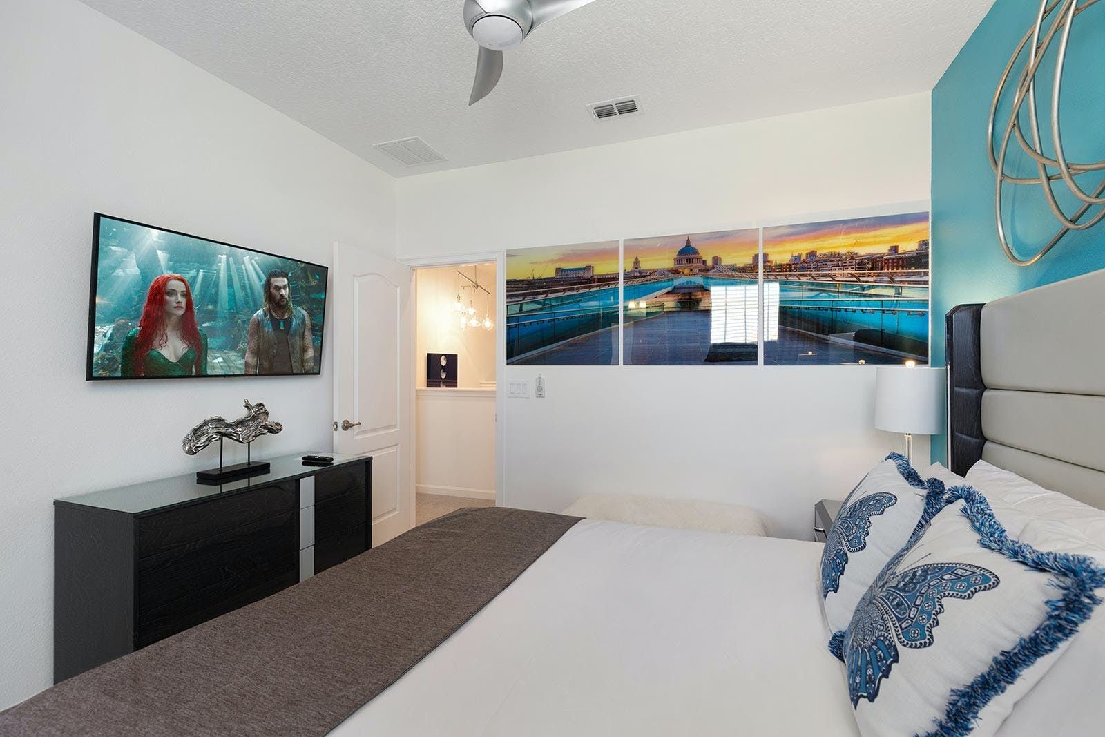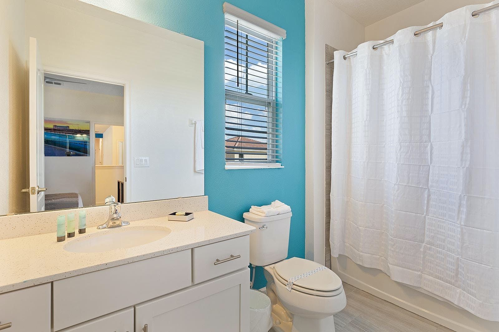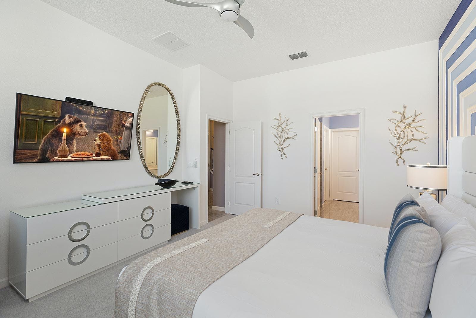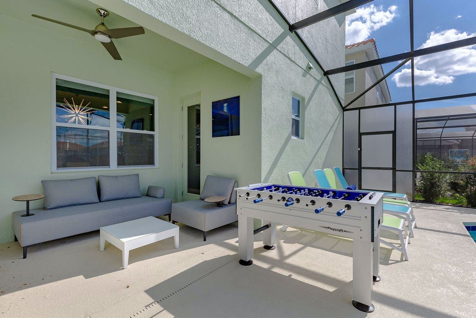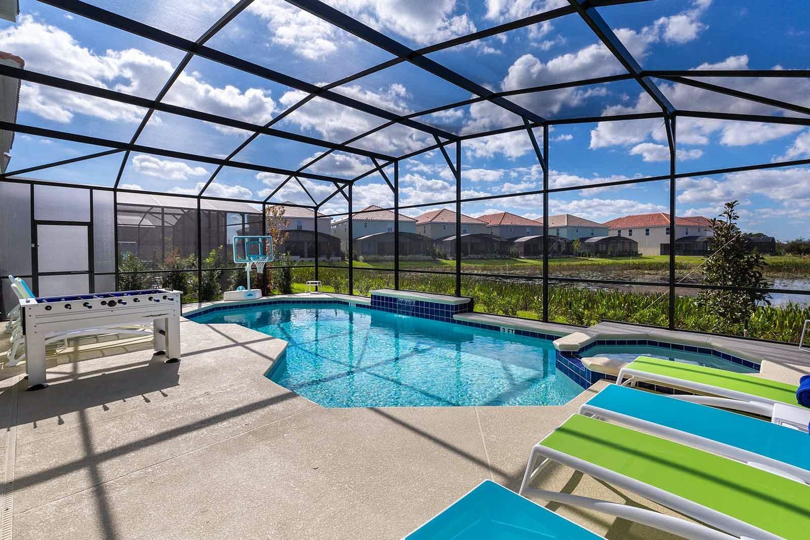 This Orlando villa is the perfect family vacation home, with plenty of entertainment options for kids and adults alike. The themed bedrooms are a hit with the little ones, including a toy room and basketball-themed bedroom complete with over-the-top bunk beds. The arcade is fully decked out with classic games like Pac-Man, and the home theater offers a cozy space for movie nights. Outside, the private screened-in pool and hot tub are surrounded by loungers and outdoor games like foosball and in-pool basketball. Inside, the kitchen is fully stocked with all necessary appliances and cookware, while the spacious dining area offers seating for 12. Bedrooms feature deluxe mattresses and hotel-quality linens, ensuring a restful night's sleep. a resort community offers additional amenities such as an oversized pool, lazy river, water slide, tennis courts, fitness center, and clubhouse. Conveniently located just miles from Disney and other popular attractions, this villa promises comfort and convenience for an unforgettable vacation experience.