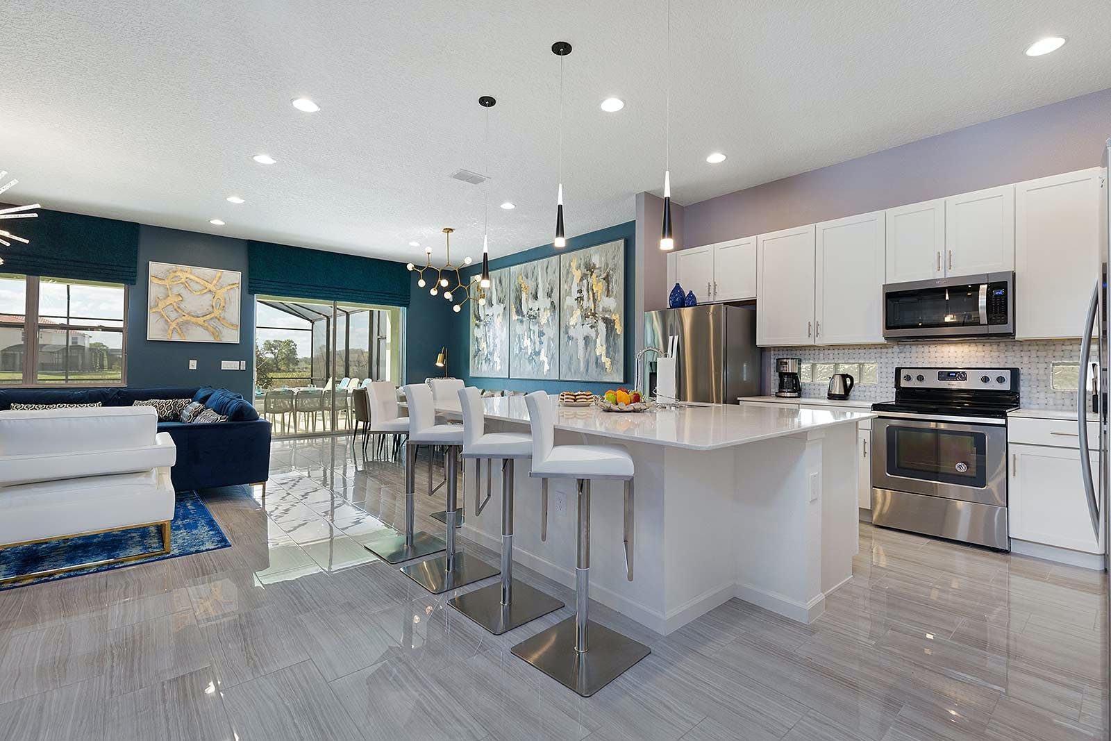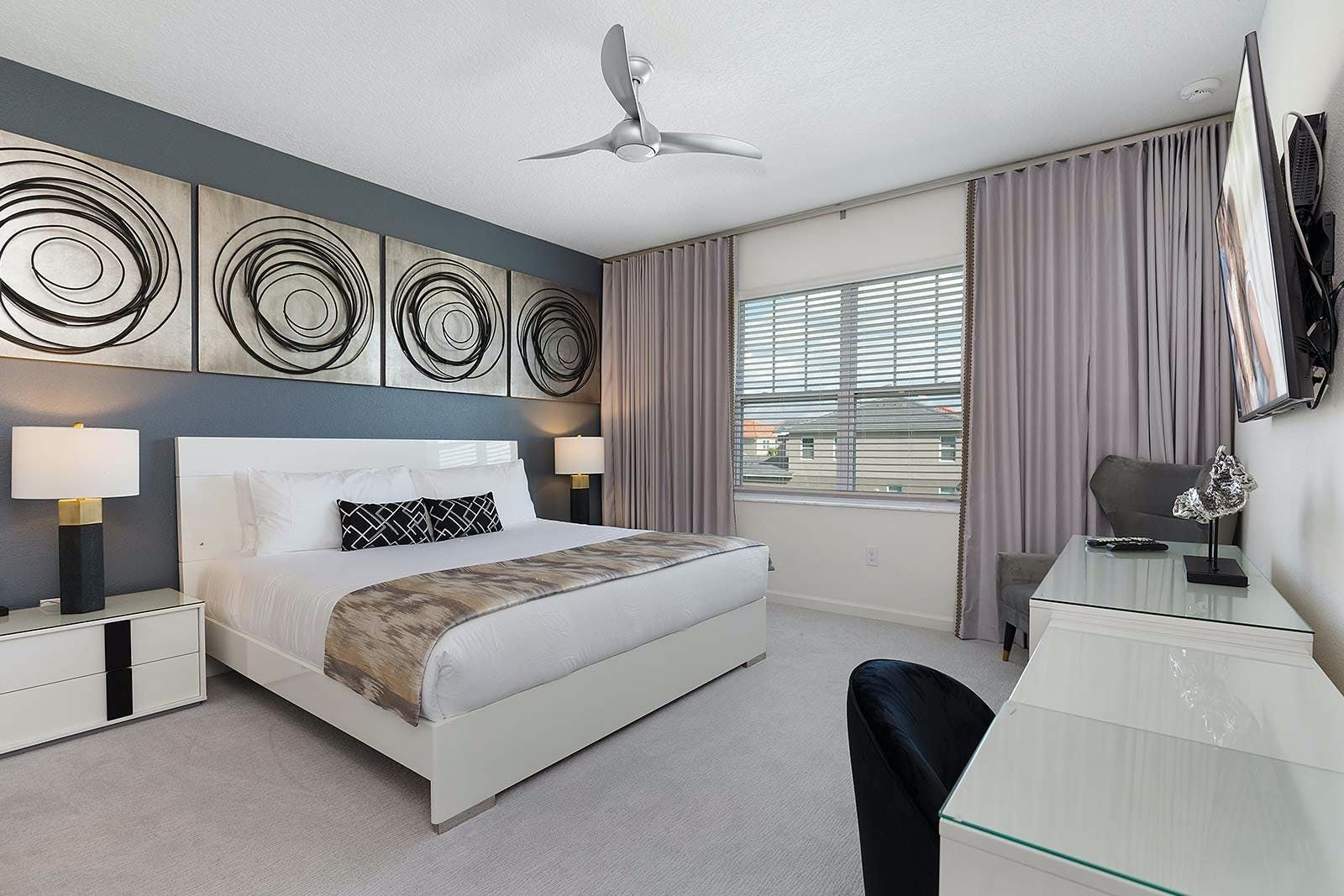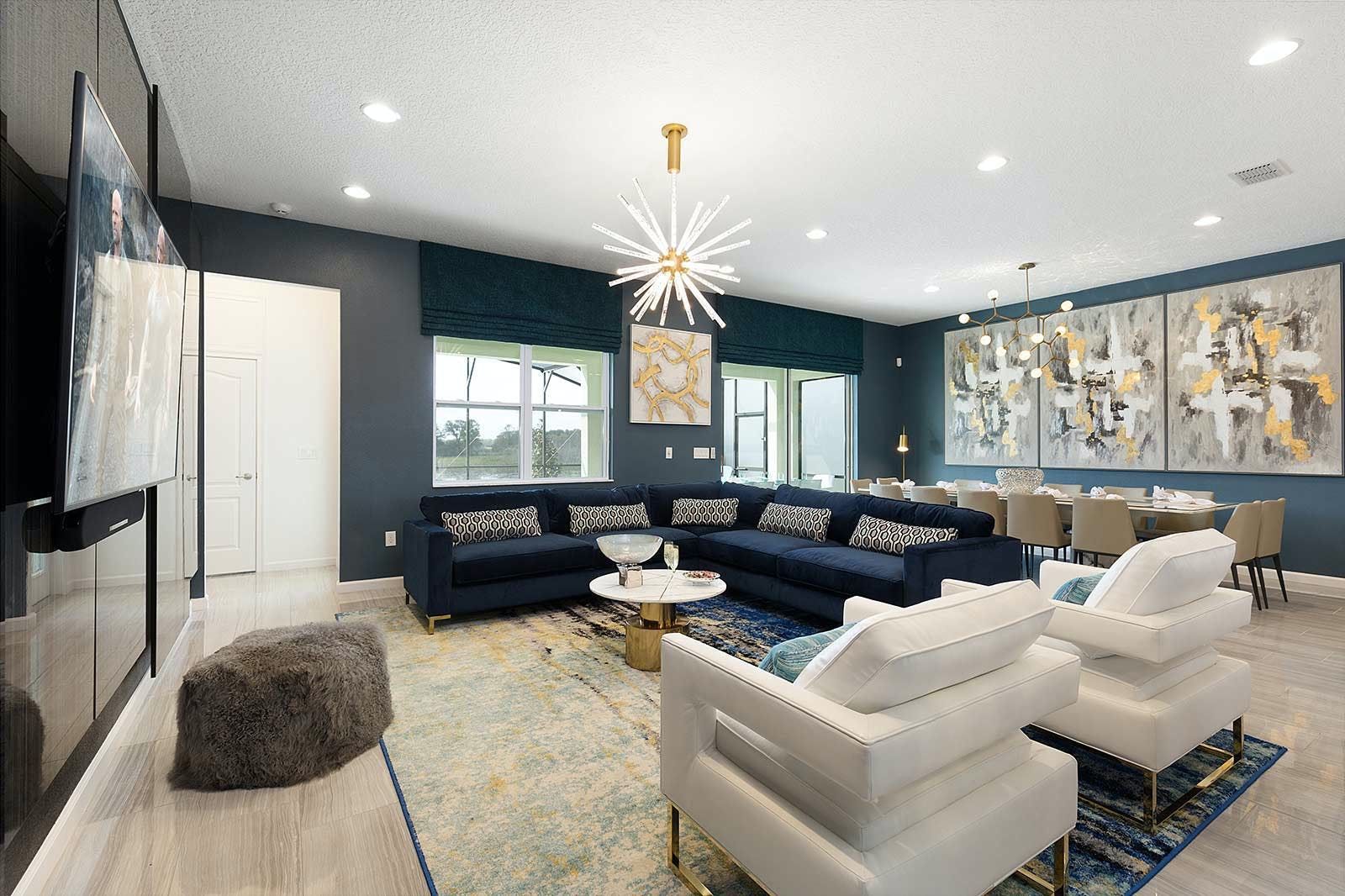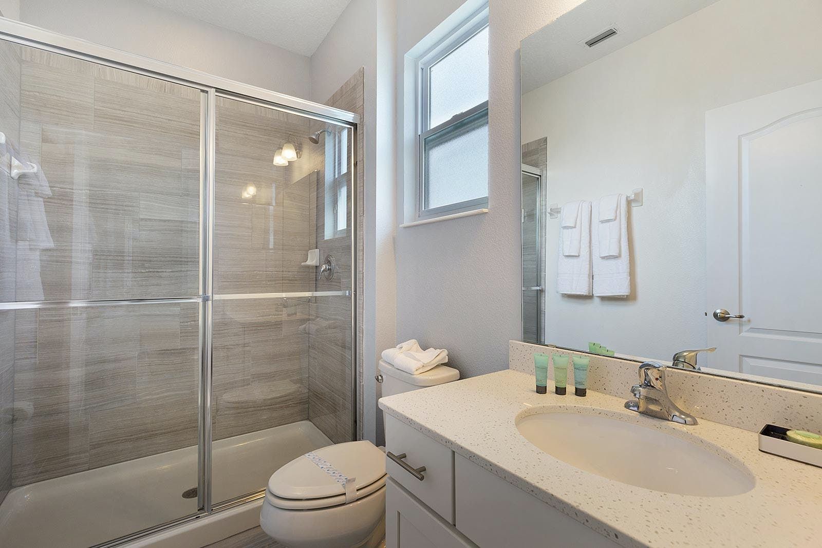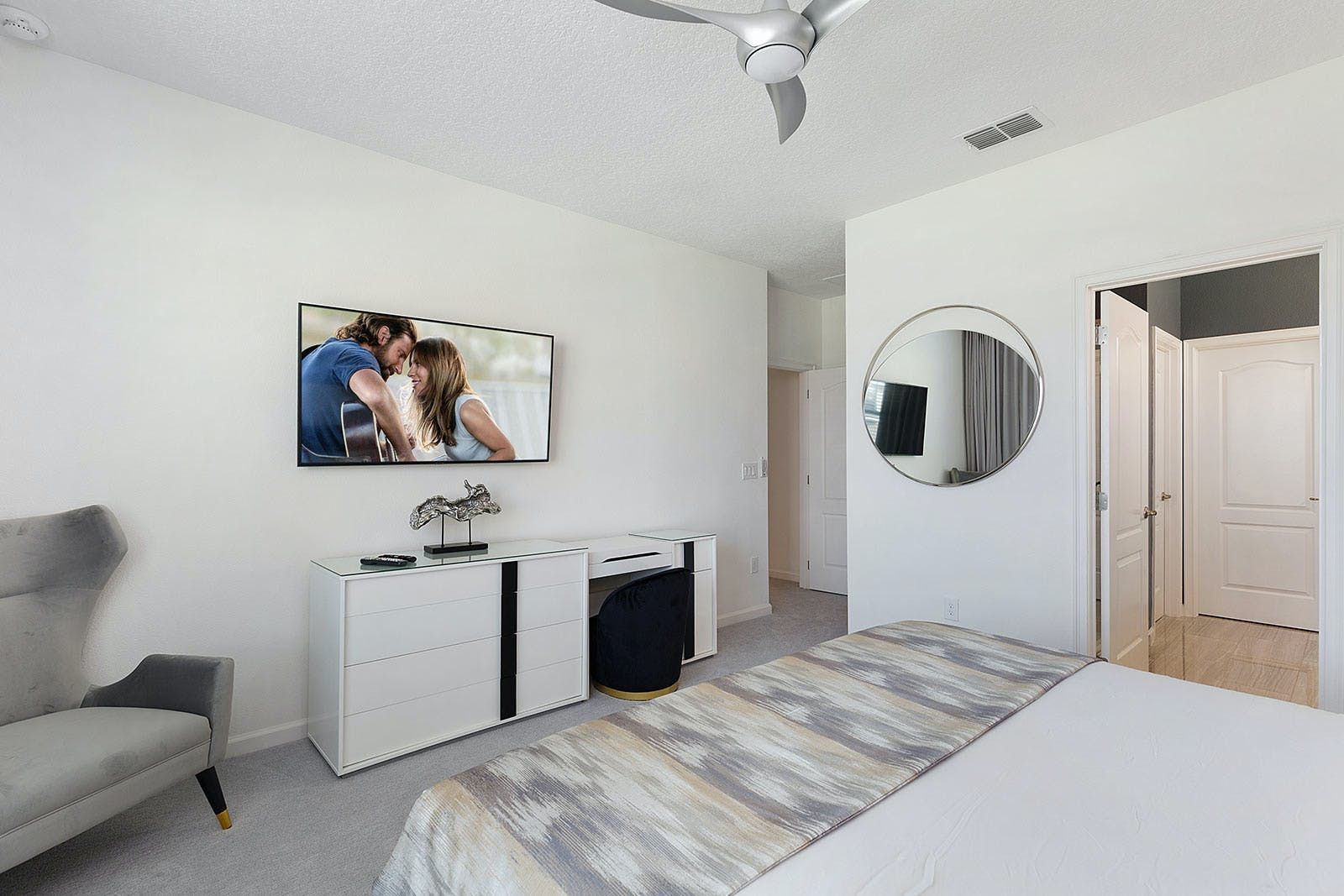 This Orlando villa is the perfect family vacation home, with plenty of entertainment options for kids and adults alike. The themed bedrooms are a hit with the little ones, including a toy room and basketball-themed bedroom complete with over-the-top bunk beds. The arcade is fully decked out with classic games like Pac-Man, and the home theater offers a cozy space for movie nights. Outside, the private screened-in pool and hot tub are surrounded by loungers and outdoor games like foosball and in-pool basketball. Inside, the kitchen is fully stocked with all necessary appliances and cookware, while the spacious dining area offers seating for 12. Bedrooms feature deluxe mattresses and hotel-quality linens, ensuring a restful night's sleep. a resort community offers additional amenities such as an oversized pool, lazy river, water slide, tennis courts, fitness center, and clubhouse. Conveniently located just miles from Disney and other popular attractions, this villa promises comfort and convenience for an unforgettable vacation experience.