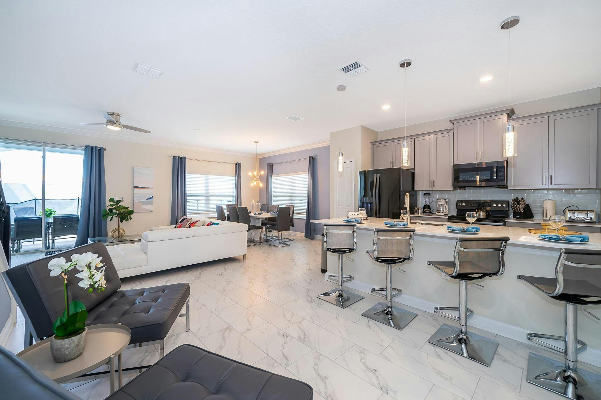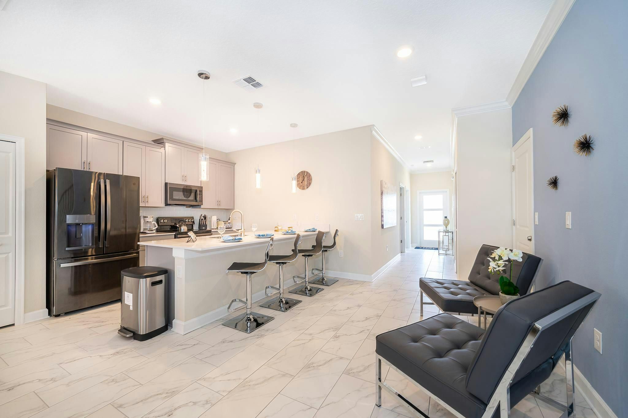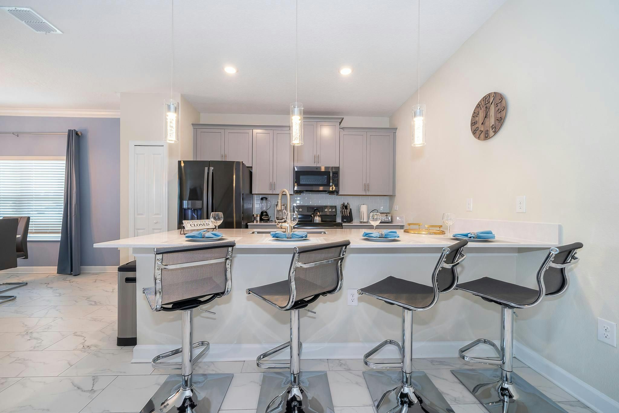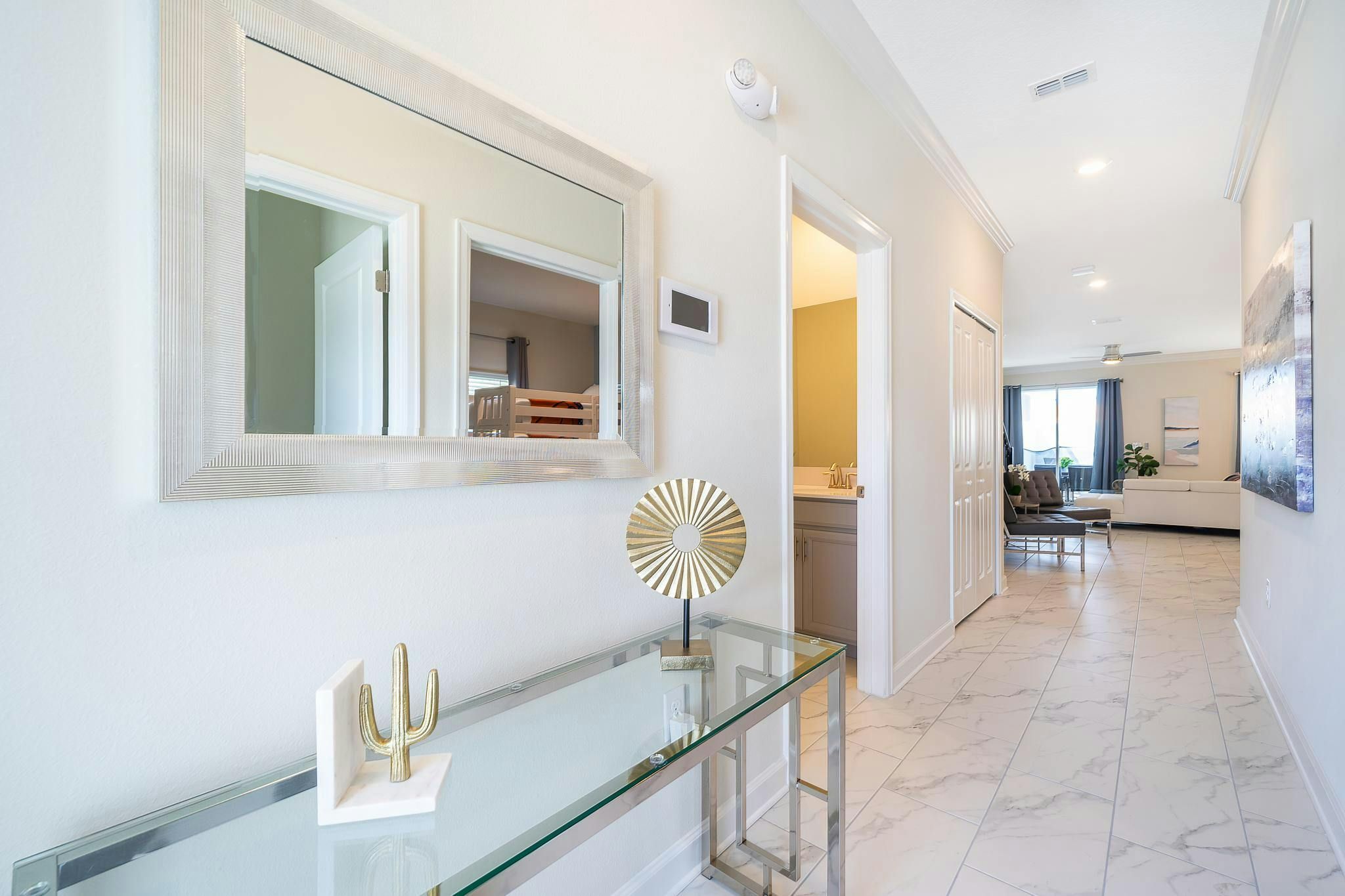 This brand new 5 bedroom, 4 bathroom vacation rental with a private pool is located in the beautiful Champions Gate Resort. The bedrooms offer comfortable sleeping arrangements with 2 located downstairs, including a queen bedroom and a bedroom with bunk beds and a twin trundle. Upstairs there are 2 king bedrooms and 1 bedroom with one full and 1 twin bed. Guests will have access to great amenities at the Clubhouse Resort including two pools, one of which features a lazy river, as well as tennis courts, a gym, business center, game room, cinema and more. The community is surrounded by golf courses making it an ideal destination for golf enthusiasts.