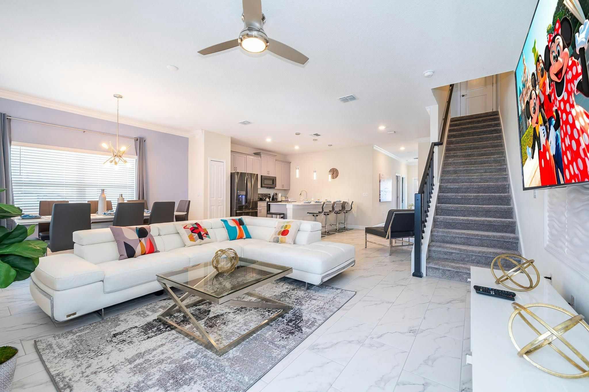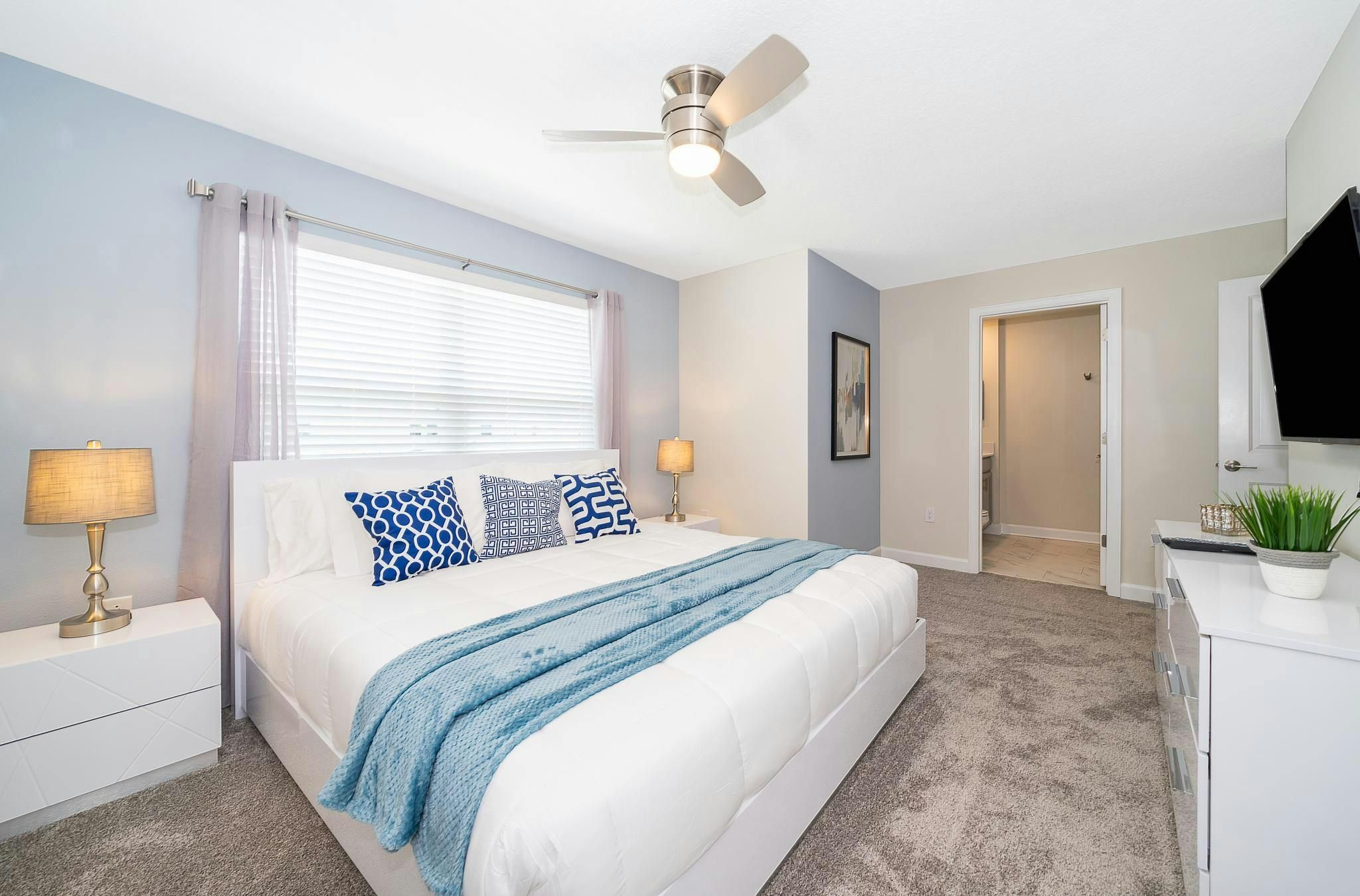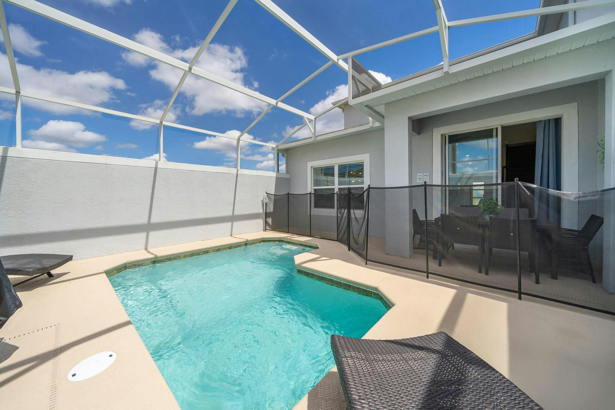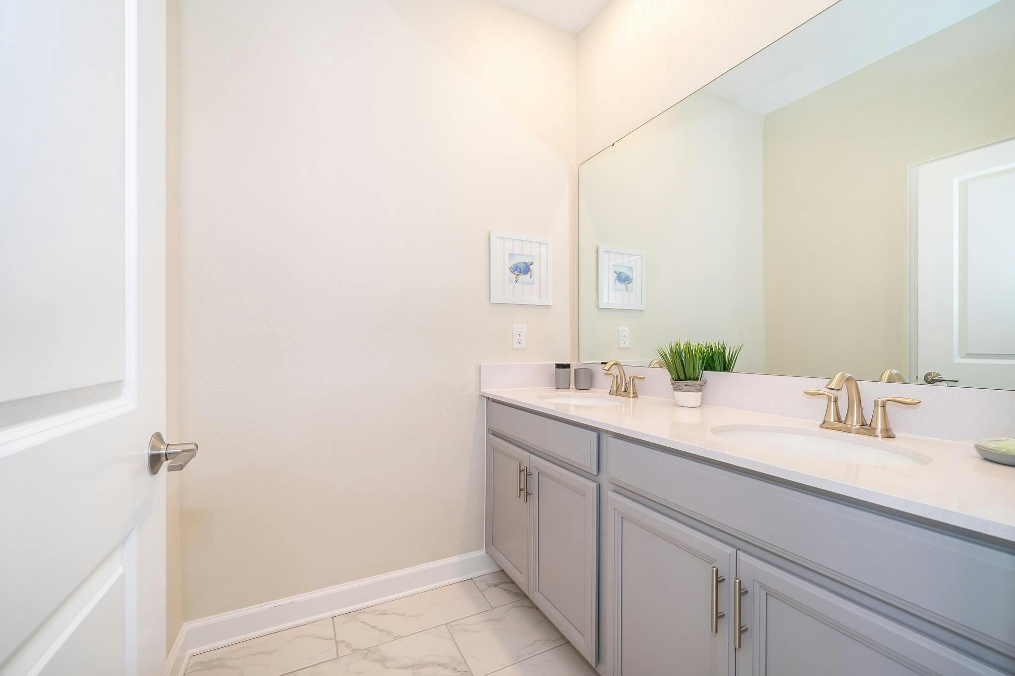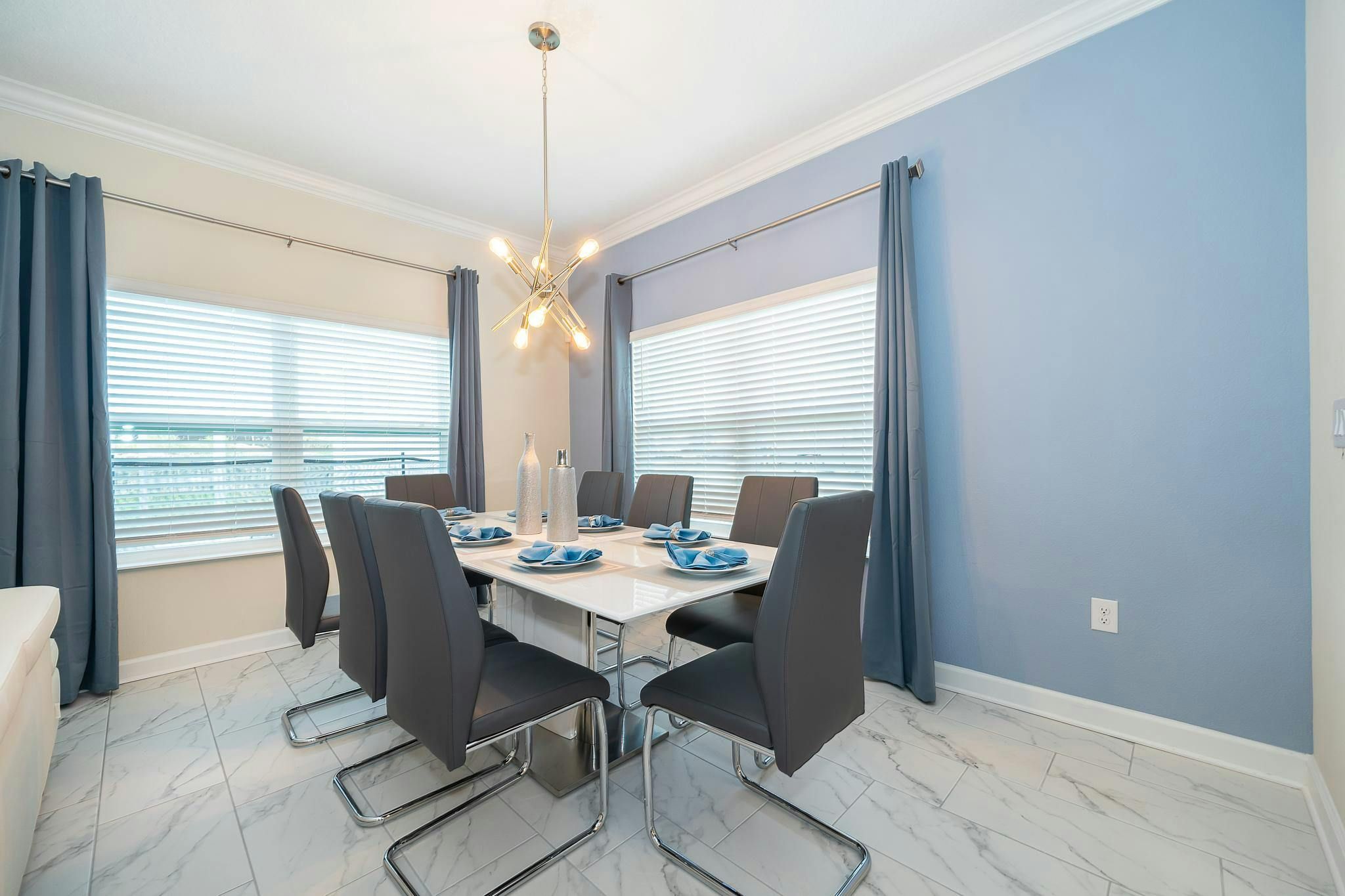 This brand new 5 bedroom, 4 bathroom vacation rental with a private pool is located in the beautiful Champions Gate Resort. The bedrooms offer comfortable sleeping arrangements with 2 located downstairs, including a queen bedroom and a bedroom with bunk beds and a twin trundle. Upstairs there are 2 king bedrooms and 1 bedroom with one full and 1 twin bed. Guests will have access to great amenities at the Clubhouse Resort including two pools, one of which features a lazy river, as well as tennis courts, a gym, business center, game room, cinema and more. The community is surrounded by golf courses making it an ideal destination for golf enthusiasts.