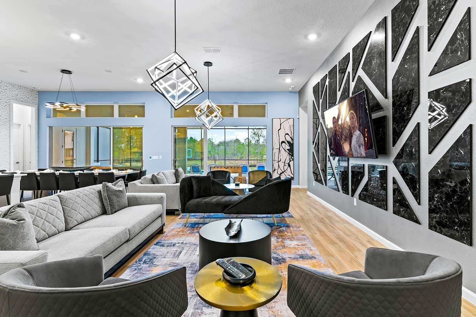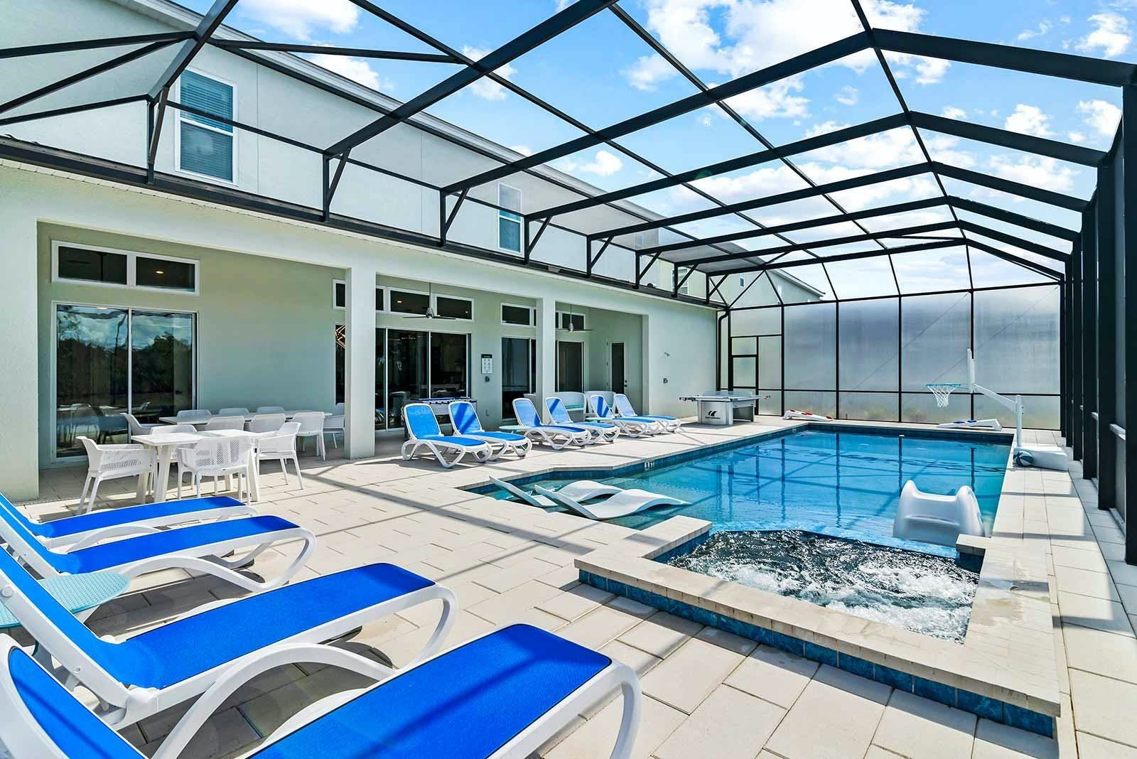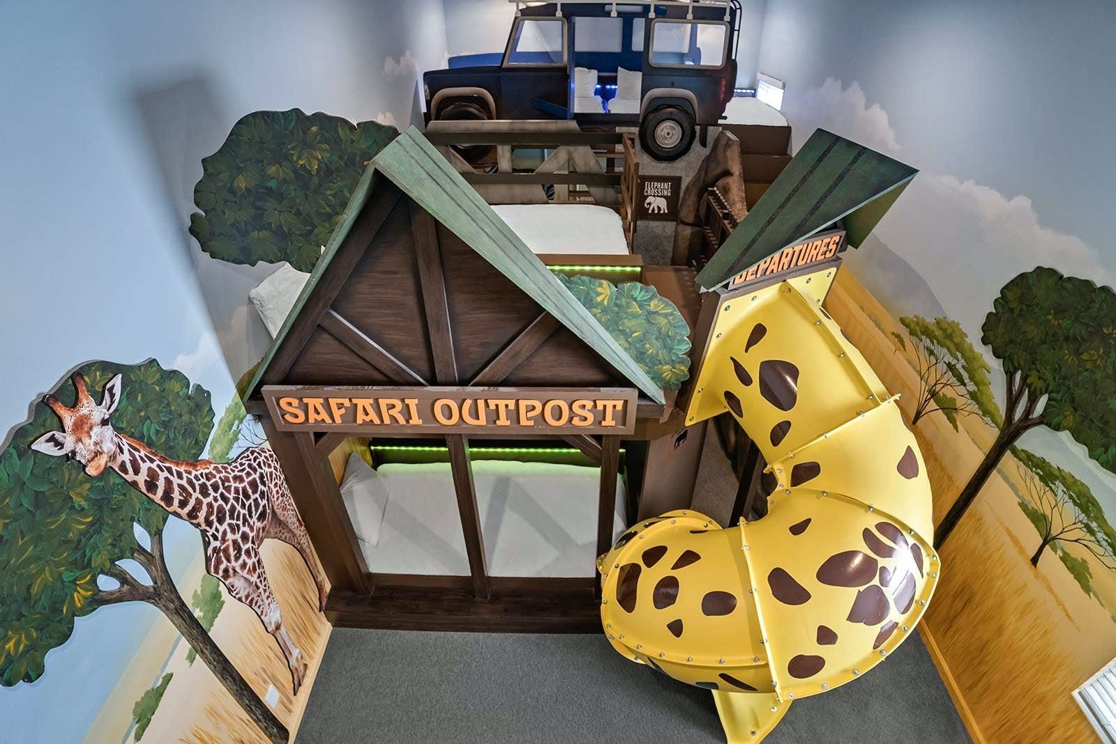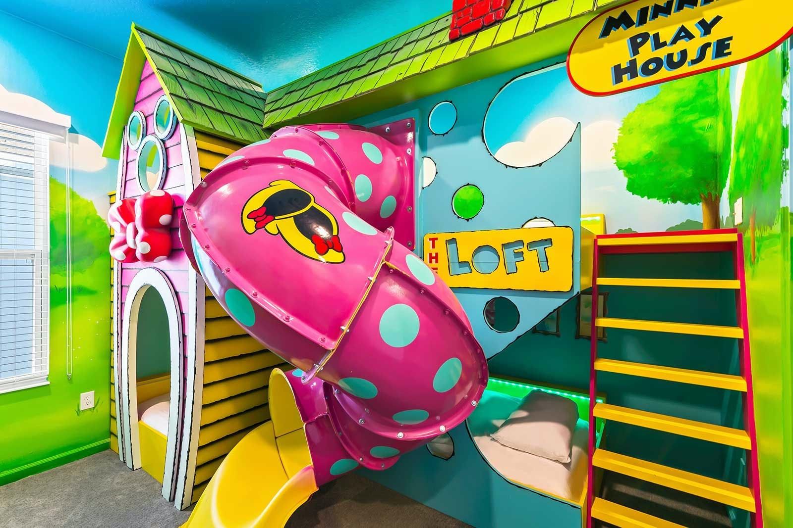 This luxurious villa is the ultimate vacation rental for guests who want to have fun with friends and family. The villa has an arcade room equipped with Pac-Man, air hockey, and racing games. It also has a rock 'n' roll room with comfortable couches, karaoke equipment, and arcade games. The game loft has a pool table, darts, ring toss, and wall Scrabble. For movie lovers, there is a home theater with an 86-inch screen, reclining chairs, and surround sound. The villa also has a fitness room with modern workout equipment to keep guests fit during their stay. The bedrooms are beautifully decorated with high-end bedding and en suite bathrooms with plush amenities. The little ones will be thrilled by the themed bedrooms that double as playrooms. The villa is located in a resort and is close to Orlando's famous attractions such as Disney Parks, Universal Parks, SeaWorld, World-Class Shopping & Dining, Groceries & Convenience Shops. Guests also have access to all the resort amenities such as tennis courts, lazy river, fitness center, covered playground and scenic grounds.