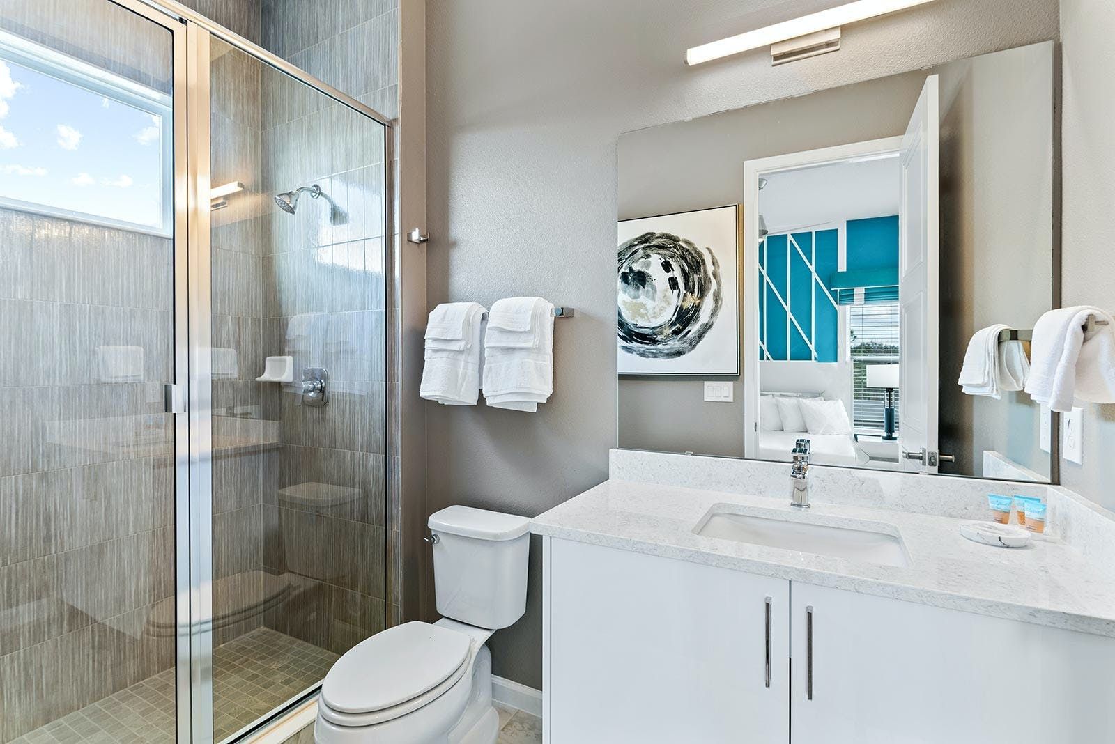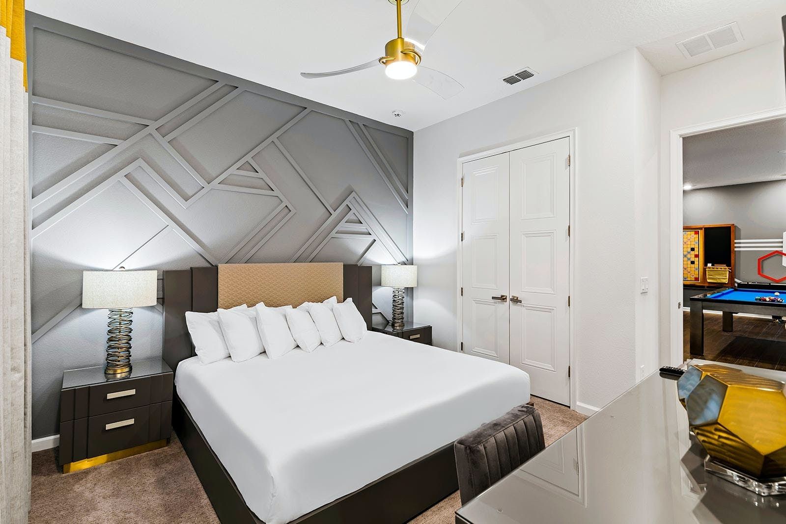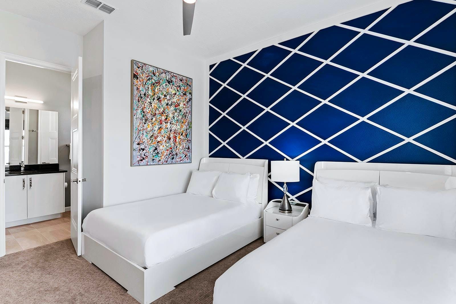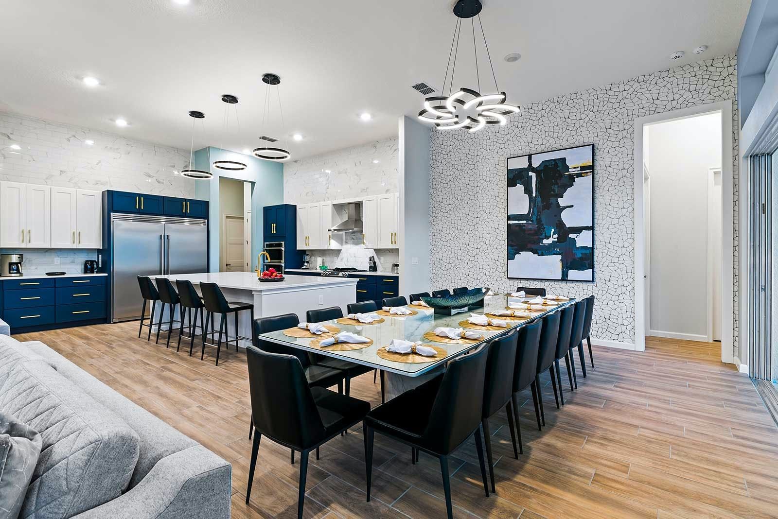 This luxurious villa is the ultimate vacation rental for guests who want to have fun with friends and family. The villa has an arcade room equipped with Pac-Man, air hockey, and racing games. It also has a rock 'n' roll room with comfortable couches, karaoke equipment, and arcade games. The game loft has a pool table, darts, ring toss, and wall Scrabble. For movie lovers, there is a home theater with an 86-inch screen, reclining chairs, and surround sound. The villa also has a fitness room with modern workout equipment to keep guests fit during their stay. The bedrooms are beautifully decorated with high-end bedding and en suite bathrooms with plush amenities. The little ones will be thrilled by the themed bedrooms that double as playrooms. The villa is located in a resort and is close to Orlando's famous attractions such as Disney Parks, Universal Parks, SeaWorld, World-Class Shopping & Dining, Groceries & Convenience Shops. Guests also have access to all the resort amenities such as tennis courts, lazy river, fitness center, covered playground and scenic grounds.