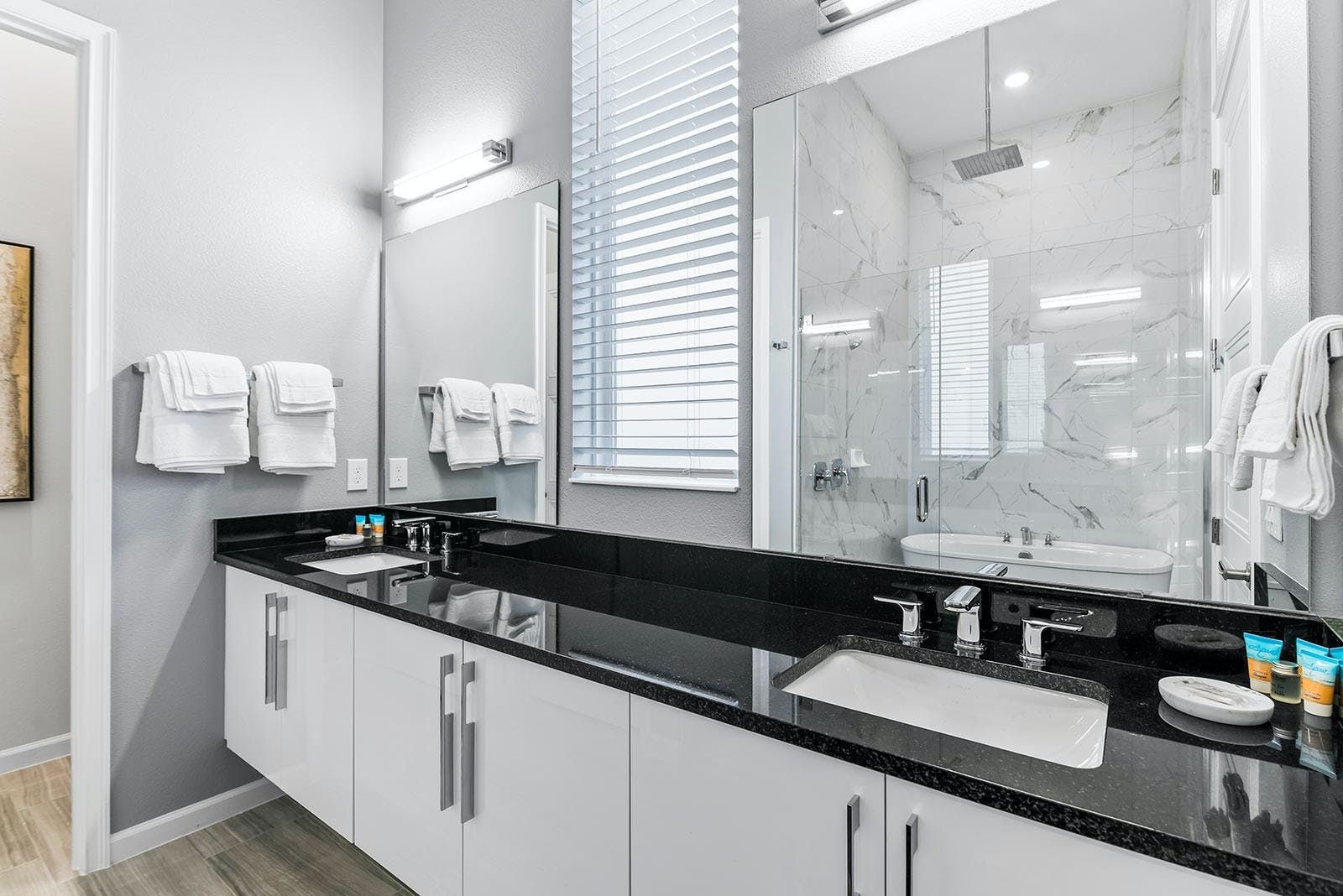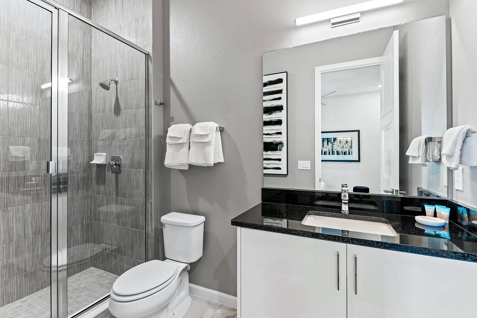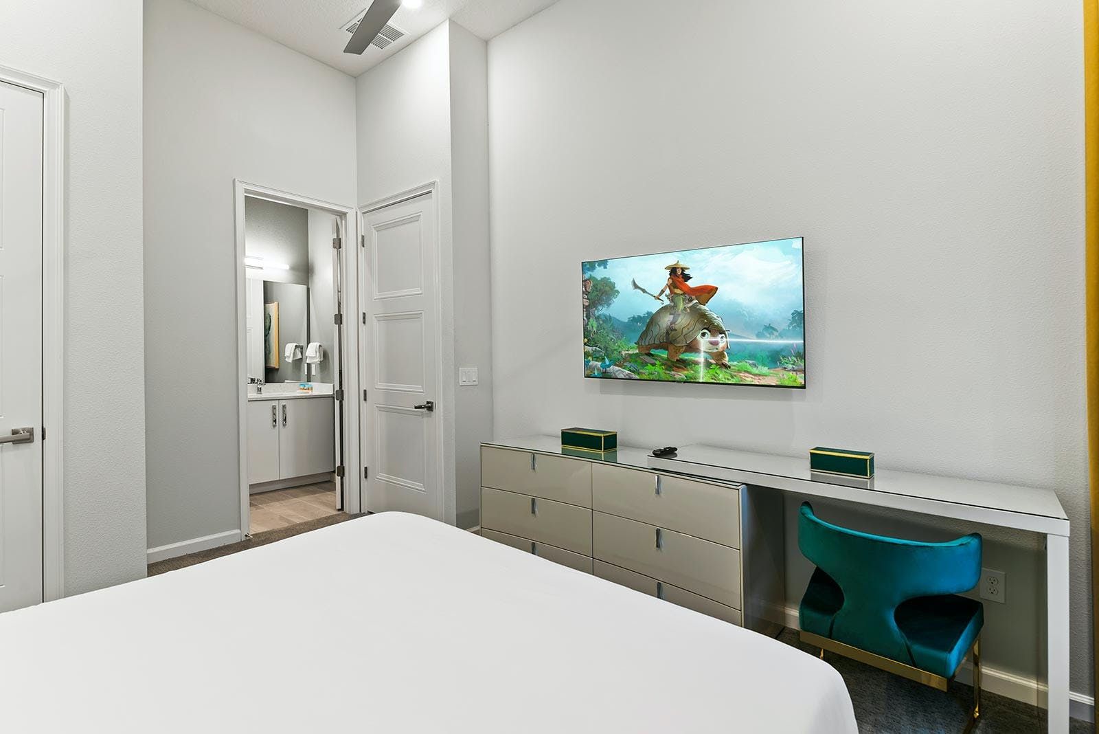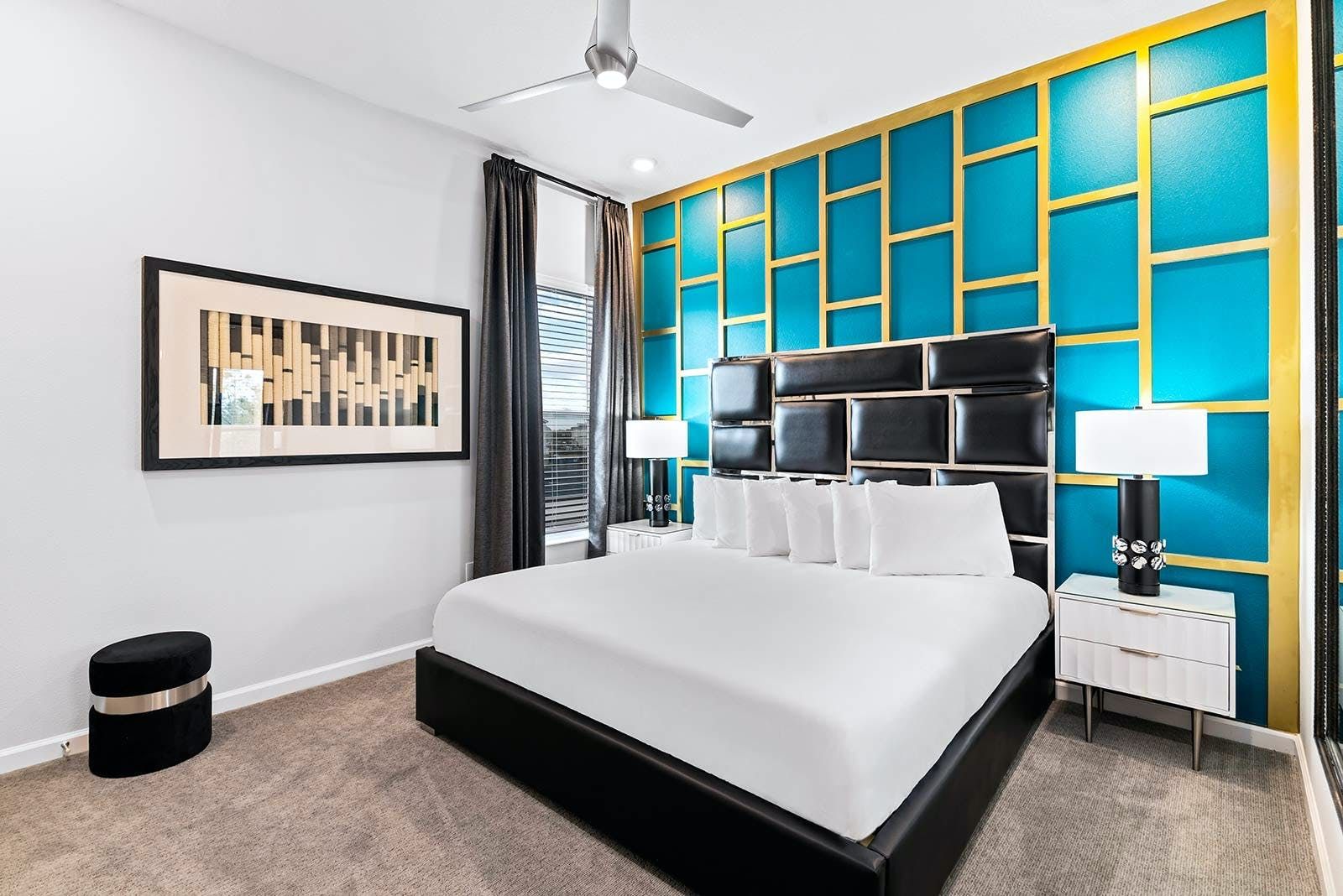 This luxurious villa is the ultimate vacation rental for guests who want to have fun with friends and family. The villa has an arcade room equipped with Pac-Man, air hockey, and racing games. It also has a rock 'n' roll room with comfortable couches, karaoke equipment, and arcade games. The game loft has a pool table, darts, ring toss, and wall Scrabble. For movie lovers, there is a home theater with an 86-inch screen, reclining chairs, and surround sound. The villa also has a fitness room with modern workout equipment to keep guests fit during their stay. The bedrooms are beautifully decorated with high-end bedding and en suite bathrooms with plush amenities. The little ones will be thrilled by the themed bedrooms that double as playrooms. The villa is located in a resort and is close to Orlando's famous attractions such as Disney Parks, Universal Parks, SeaWorld, World-Class Shopping & Dining, Groceries & Convenience Shops. Guests also have access to all the resort amenities such as tennis courts, lazy river, fitness center, covered playground and scenic grounds.