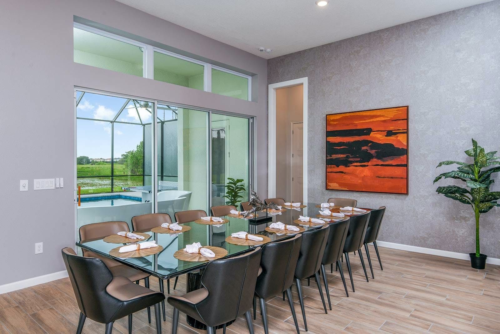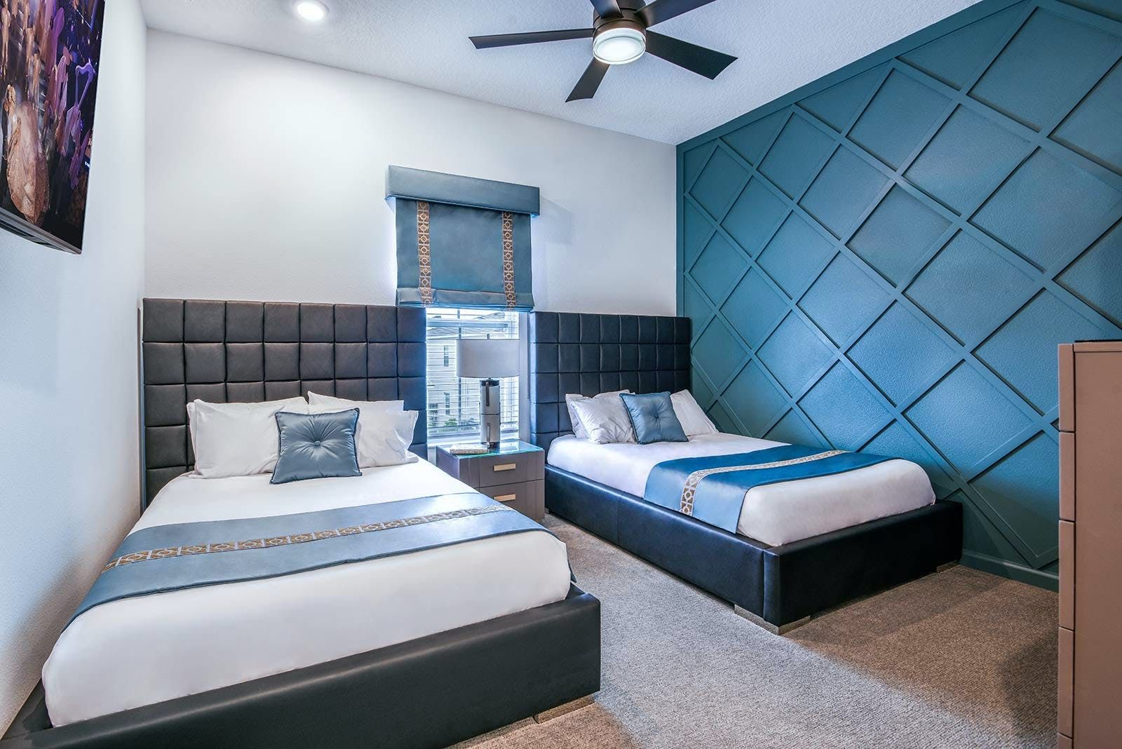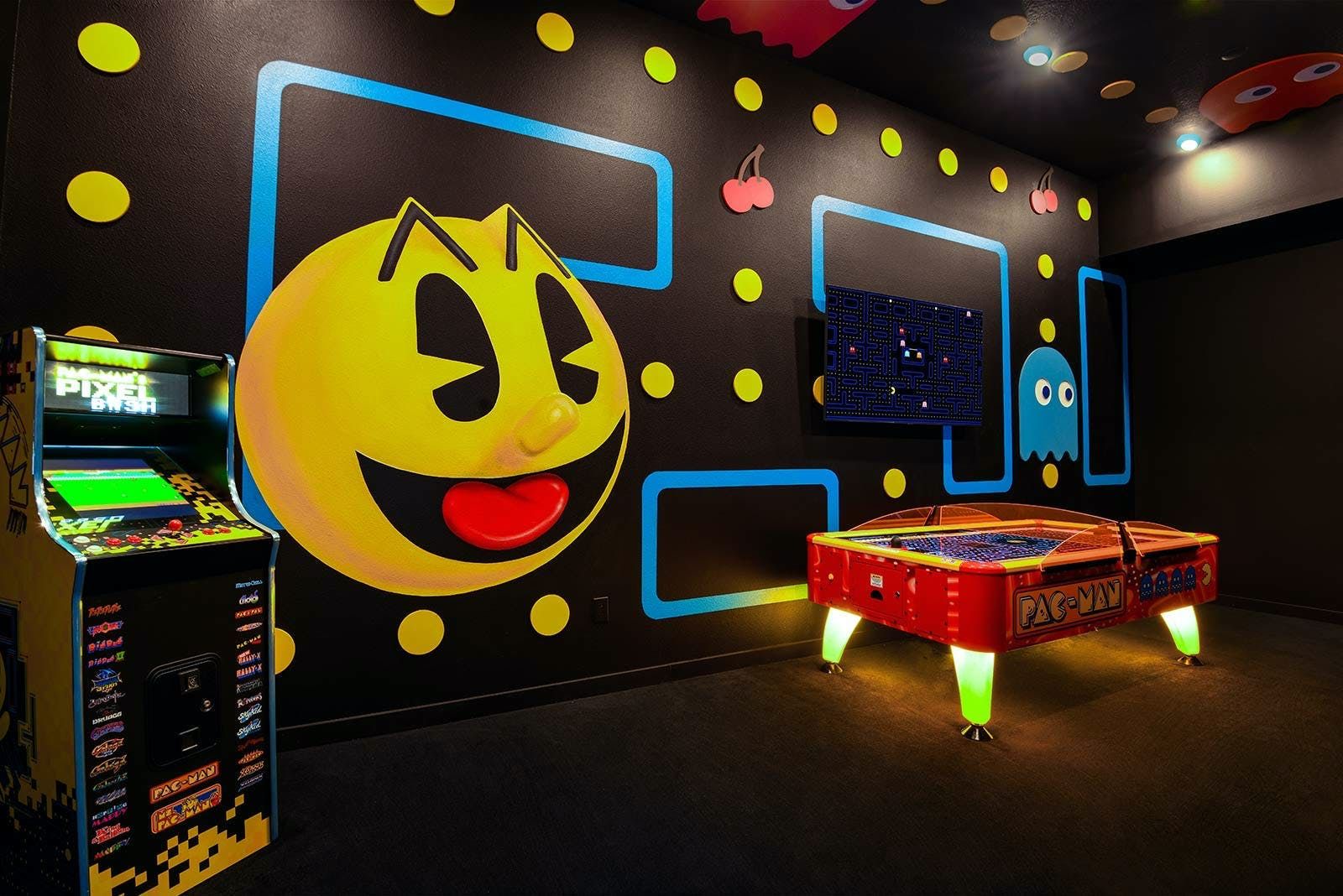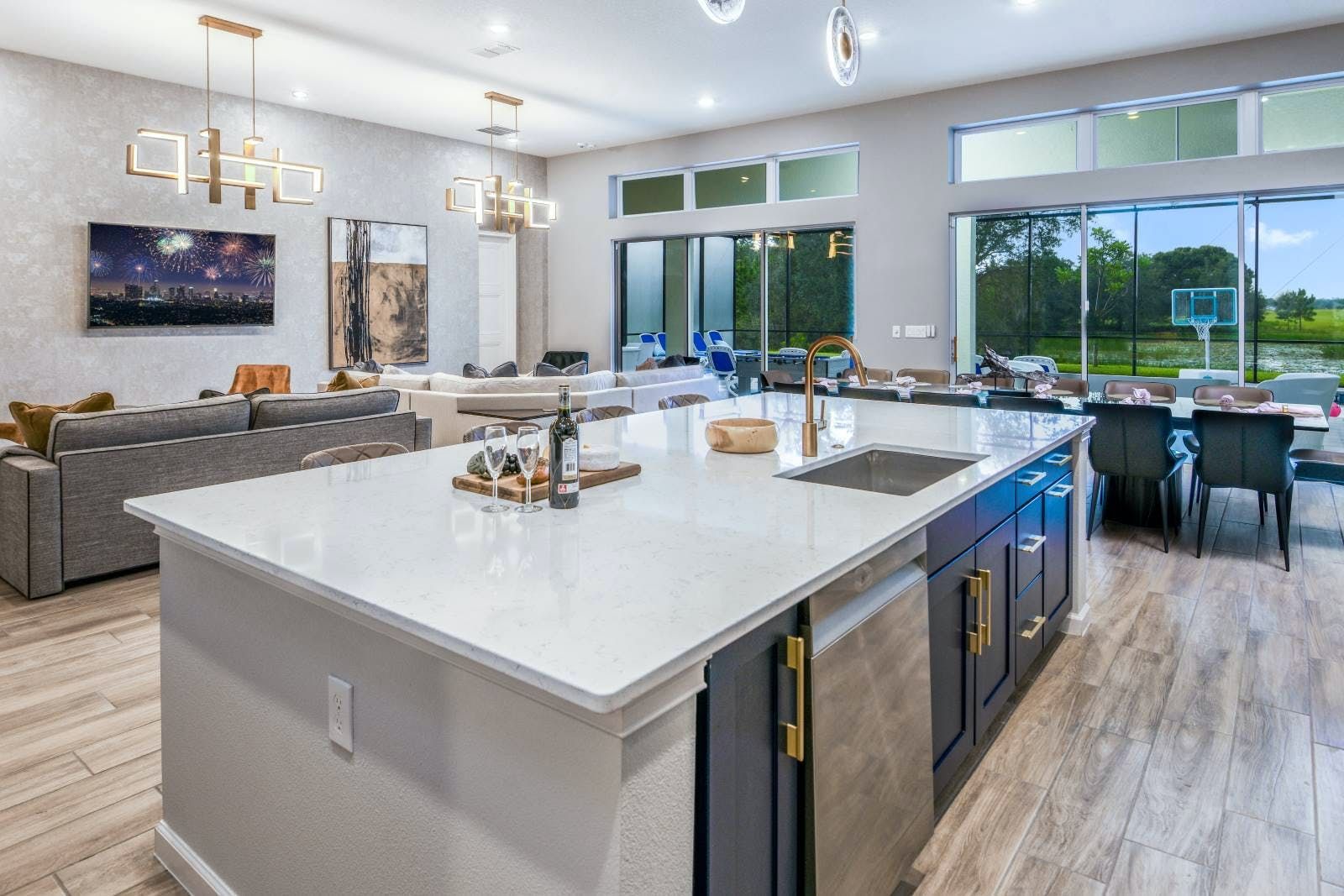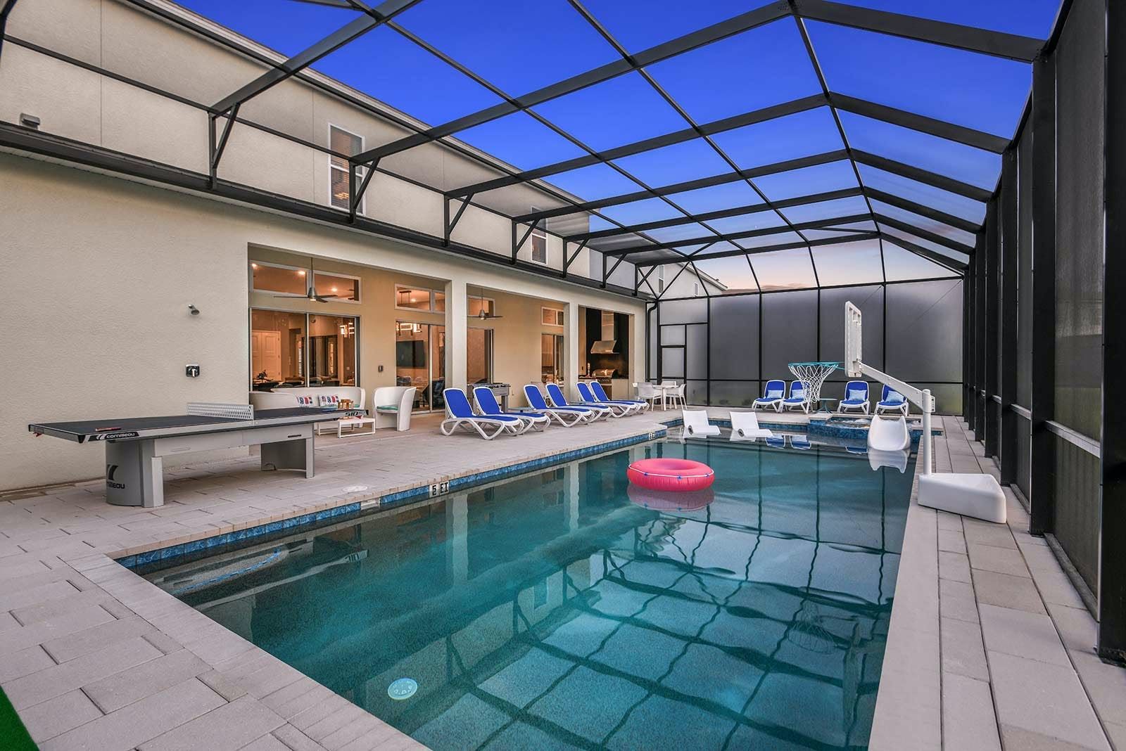 This is a luxurious 12-bedroom villa located in a resort in Orlando. The modern décor is evident throughout the house and guests can unwind in the great room, which features comfy sofas, chairs, and a big-screen TV. The fully equipped chef's kitchen has beautiful stone countertops, stainless steel appliances, custom deep-blue cabinetry, and gleaming oak floors. Sports-loving guests will be delighted to discover the garage that's been transformed into a sports simulator room and arcade room. Outside, guests can enjoy the colossal pool enclosed within fancy privacy glass, soak in the spillover spa or stretch out on a lounge chair. The house boasts a game loft with a pool table, dartboard, ring toss, and wall Scrabble. Guests can also relax in their private home theater or work out in their home gym. There are three amazing themed bedrooms for kids: Galaxy Room, Secret Planet Room and Undersea Adventure Room. Nine additional grownup bedrooms with en suite bathrooms are available on the first and second floors. The property is conveniently located near Disney Parks, Universal Parks, SeaWorld, World-Class Shopping & Dining and Groceries & Convenience Shops.