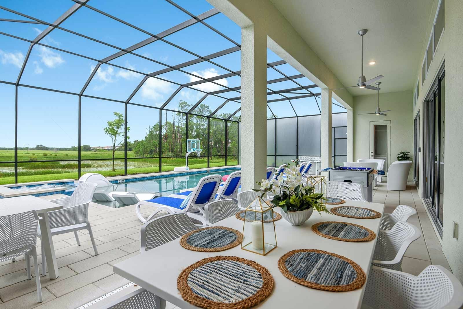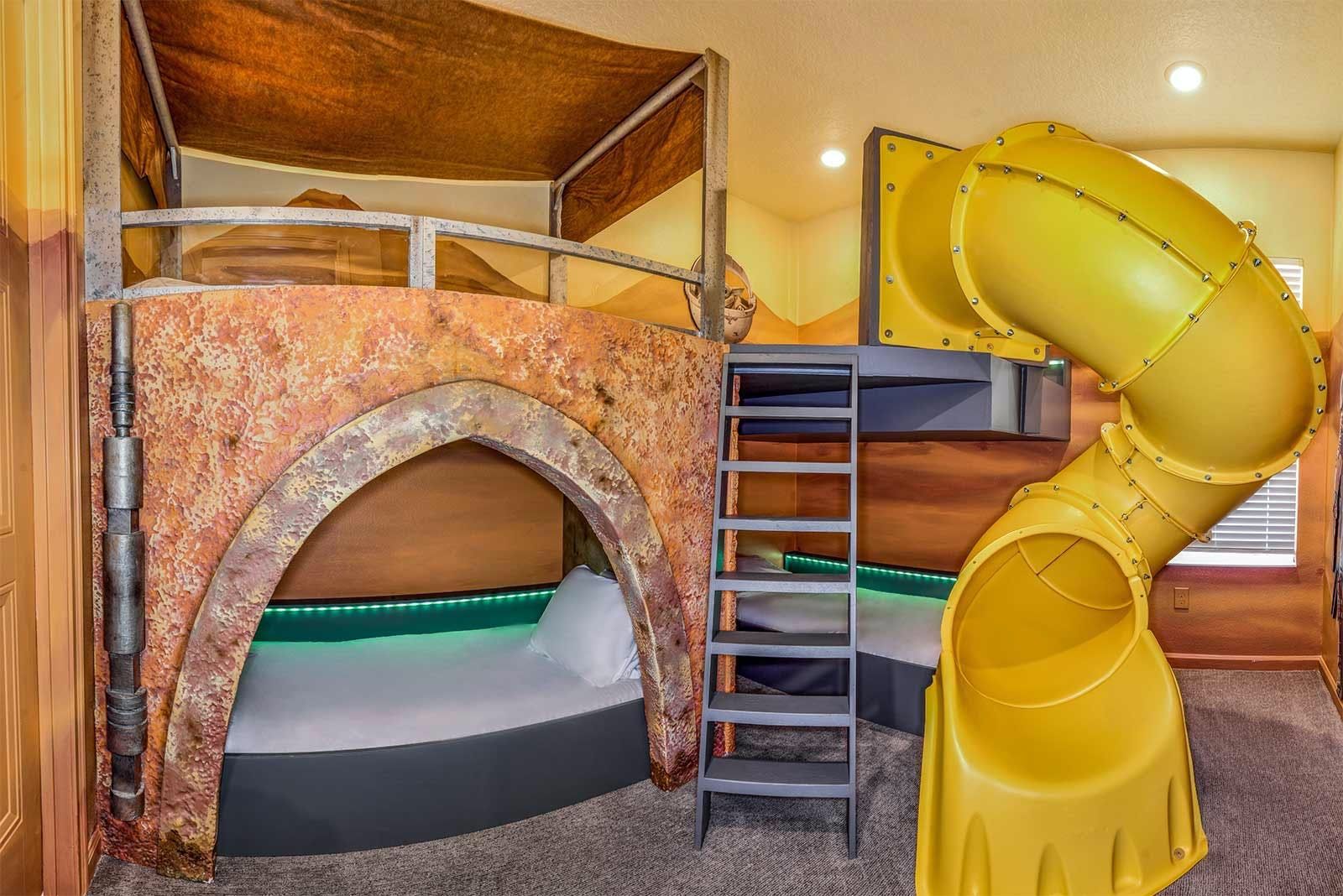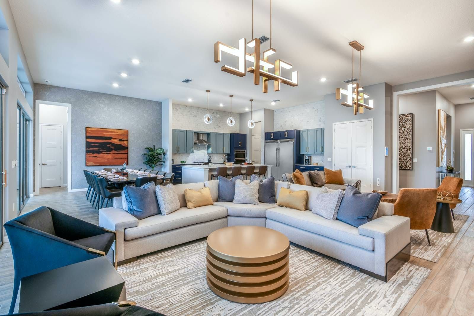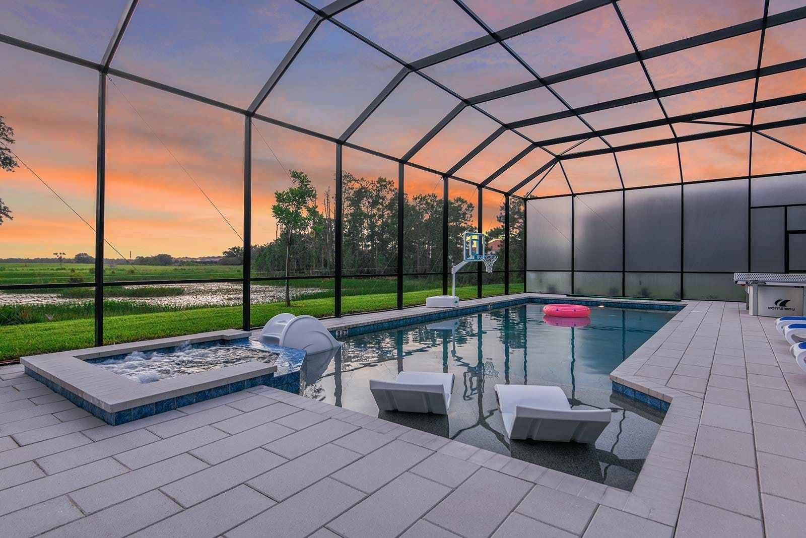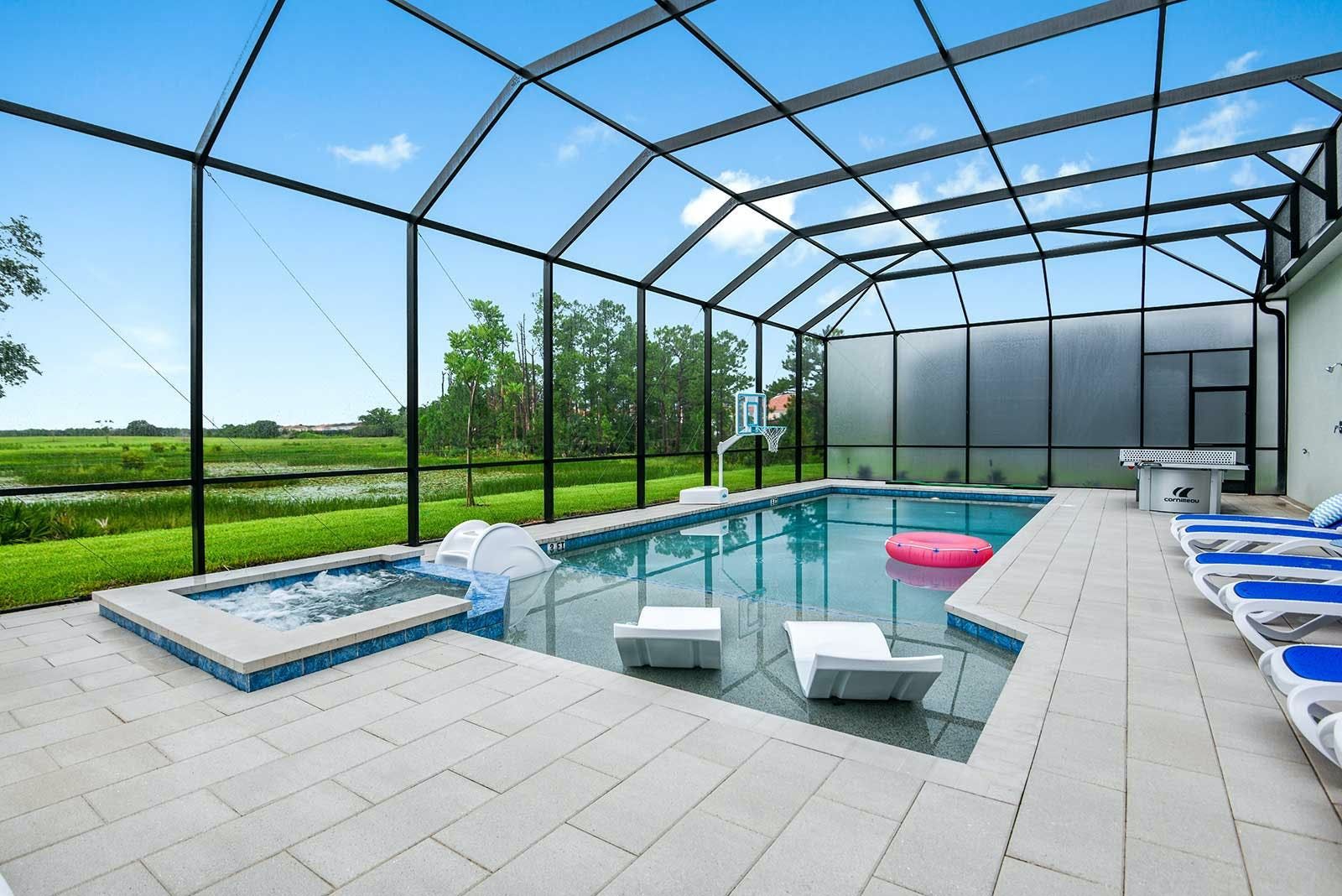 This is a luxurious 12-bedroom villa located in a resort in Orlando. The modern décor is evident throughout the house and guests can unwind in the great room, which features comfy sofas, chairs, and a big-screen TV. The fully equipped chef's kitchen has beautiful stone countertops, stainless steel appliances, custom deep-blue cabinetry, and gleaming oak floors. Sports-loving guests will be delighted to discover the garage that's been transformed into a sports simulator room and arcade room. Outside, guests can enjoy the colossal pool enclosed within fancy privacy glass, soak in the spillover spa or stretch out on a lounge chair. The house boasts a game loft with a pool table, dartboard, ring toss, and wall Scrabble. Guests can also relax in their private home theater or work out in their home gym. There are three amazing themed bedrooms for kids: Galaxy Room, Secret Planet Room and Undersea Adventure Room. Nine additional grownup bedrooms with en suite bathrooms are available on the first and second floors. The property is conveniently located near Disney Parks, Universal Parks, SeaWorld, World-Class Shopping & Dining and Groceries & Convenience Shops.