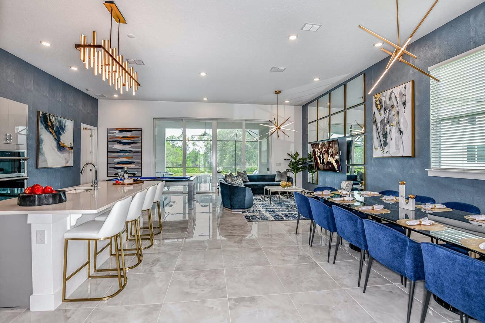 Welcome to this home, a stunning 4,000-square-foot Transitional-style villa located in a resort community. This luxury vacation home features seven bedrooms, including a jaw-dropping arctic-themed kids' room that sleeps six and a spacious master bedroom with an en suite bath, walk-in closet, double sinks, shower, and bathtub. The fully equipped open-concept chef's kitchen is perfect for creating masterpiece meals while the movie theater-turned-arcade provides excitement with classic arcade games. Outside, guests can take a dip in the private screened pool and spa or relax on a lounger in the covered outdoor kitchen area. Located just a short drive from Orlando's famous attractions and dining destinations, this villa also offers access to the resort's tennis courts, lazy river, fitness center, and more.