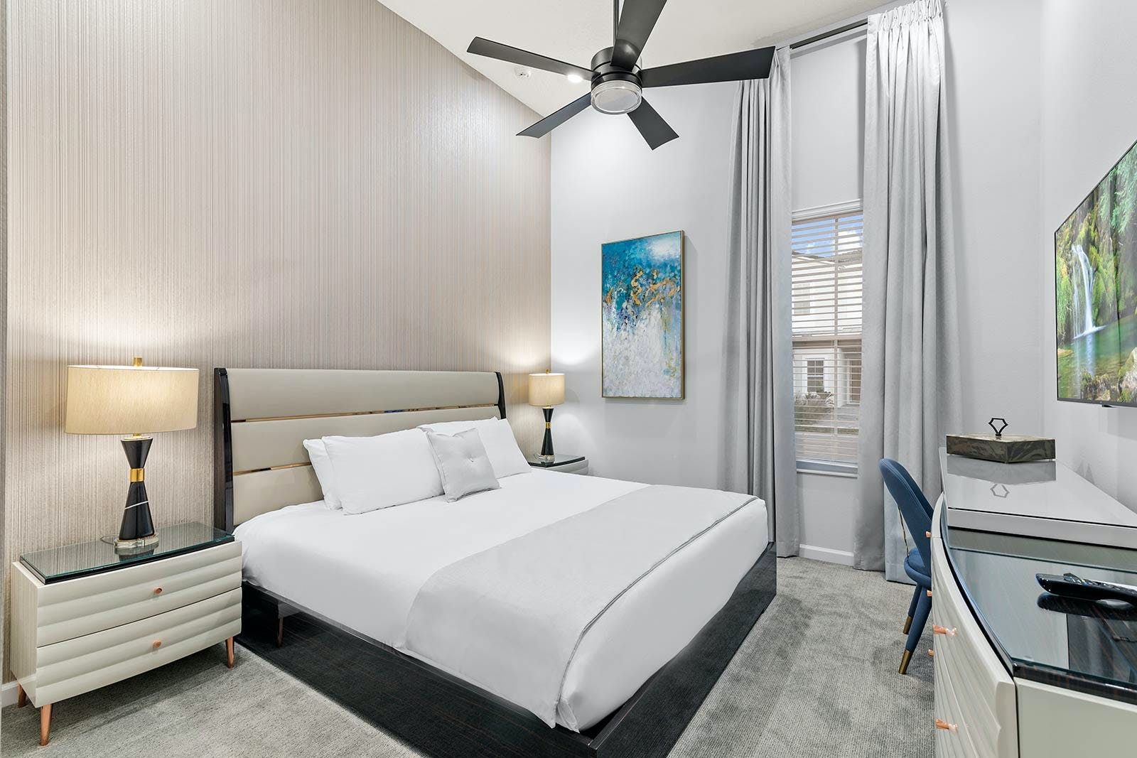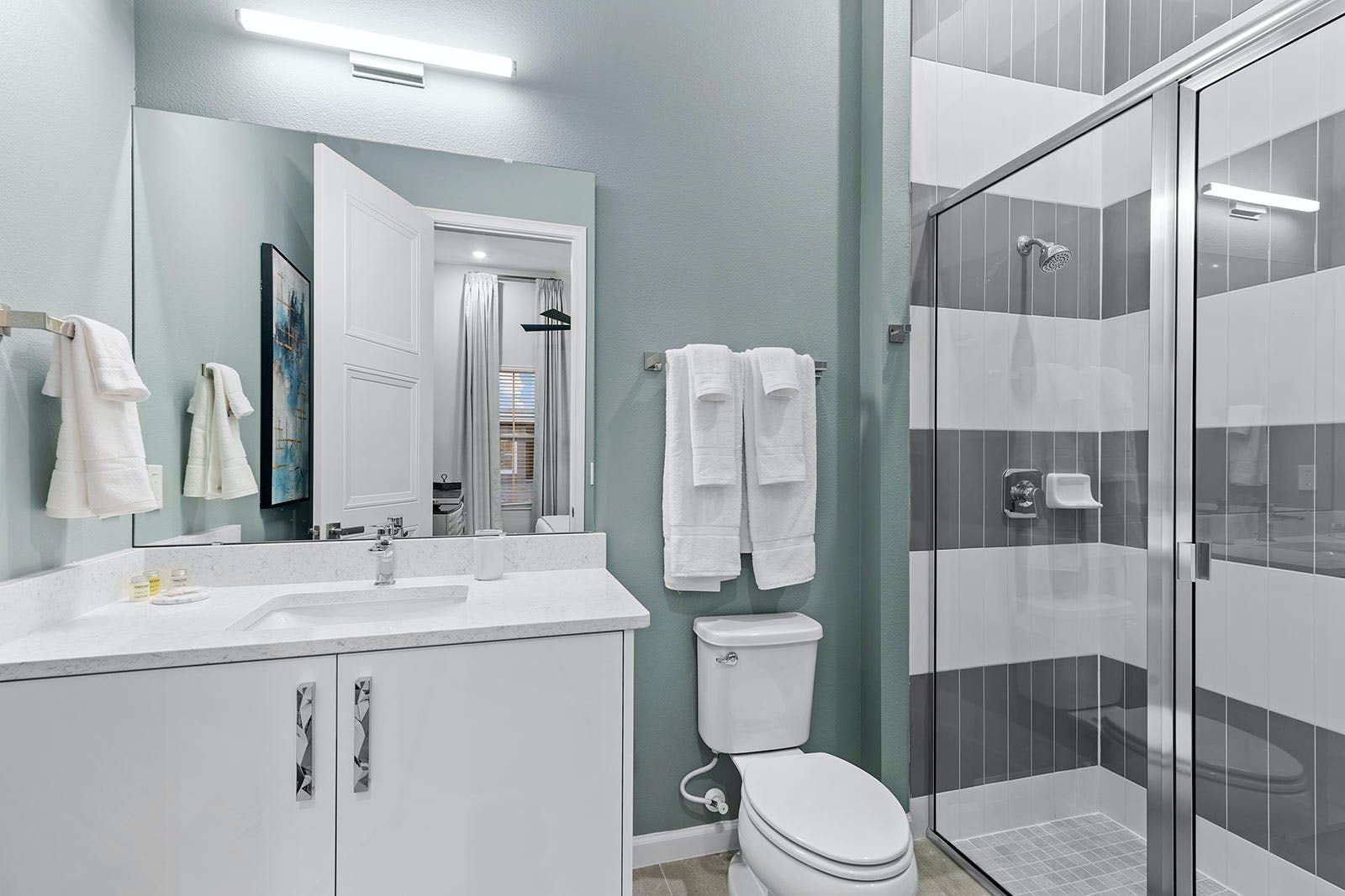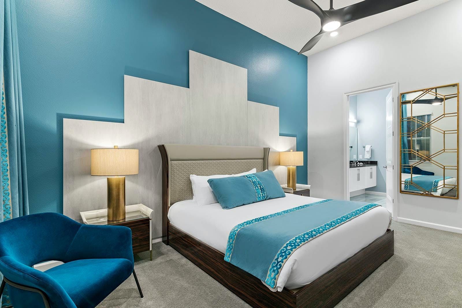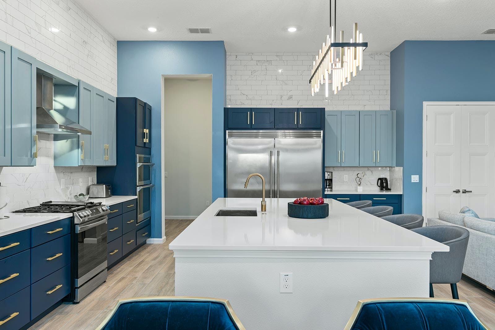 This home is part of a luxurious vacation community that offers 71 high-end homes and exclusive amenities, including a private entrance, covered playground, and scenic views. The community is currently under construction, but guests can enjoy the fabulous community sandbox and accompanying machinery. The mansion features an airy, high-ceilinged foyer leading to a gorgeously appointed great room with plush sofas and chairs, high-end fixtures, and an oversized TV exuding clean and inviting contemporary-style design. The chef's kitchen is equipped with custom cabinetry in beautiful blue tones, stainless steel appliances, brushed brass fixtures, and oak floors. The pool area boasts a massive 15-by-40-foot pool surrounded by a fancy "Florida glass" screen for maximum privacy. Guests can enjoy pool basketball, ping-pong, or foosball while enjoying alfresco meals whipped up in the fabulous summer kitchen with built-in grill and shaded lanai seating. Other amenities include an arcade room, casino room, game loft, movie theater, fitness room, three themed bedrooms/playrooms for kids, and nine beautiful Contemporary-style decorated bedrooms with upscale furnishings and private baths. Guests also have access to the resort's tennis courts, lazy river, fitness center, covered playgrounds when completed (2023-2024), among other amenities. The villa is located near Orlando's famous attractions and dining destinations.